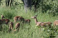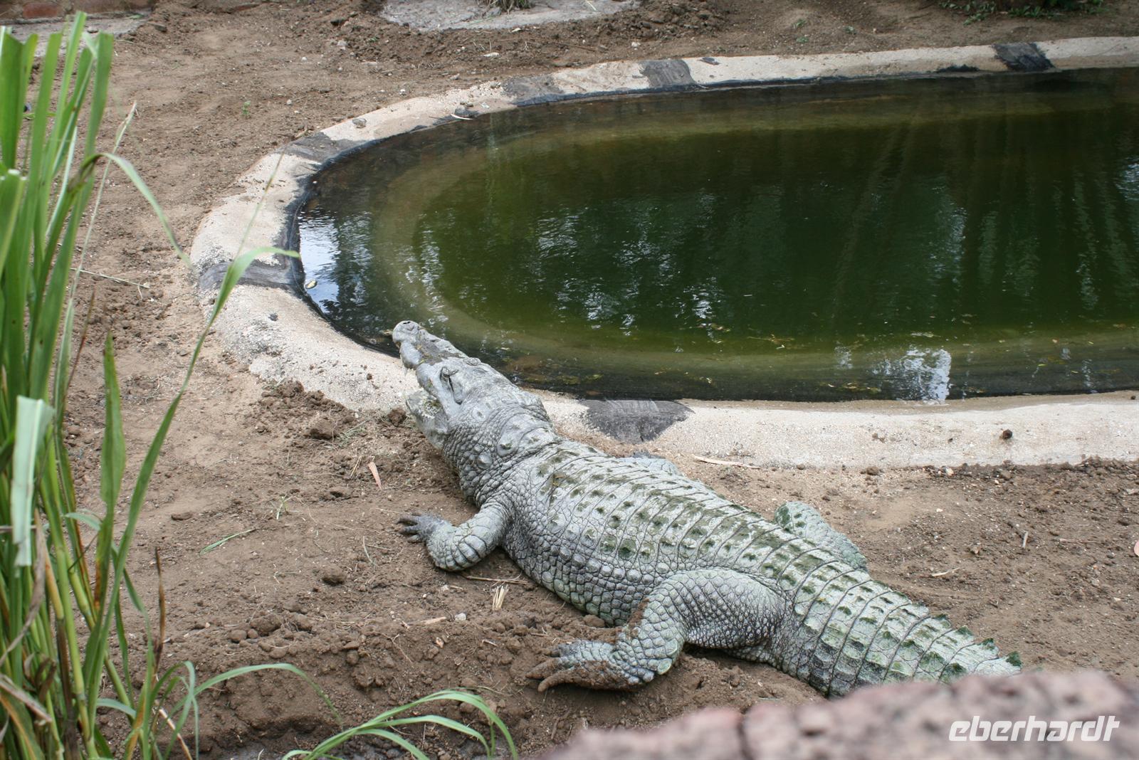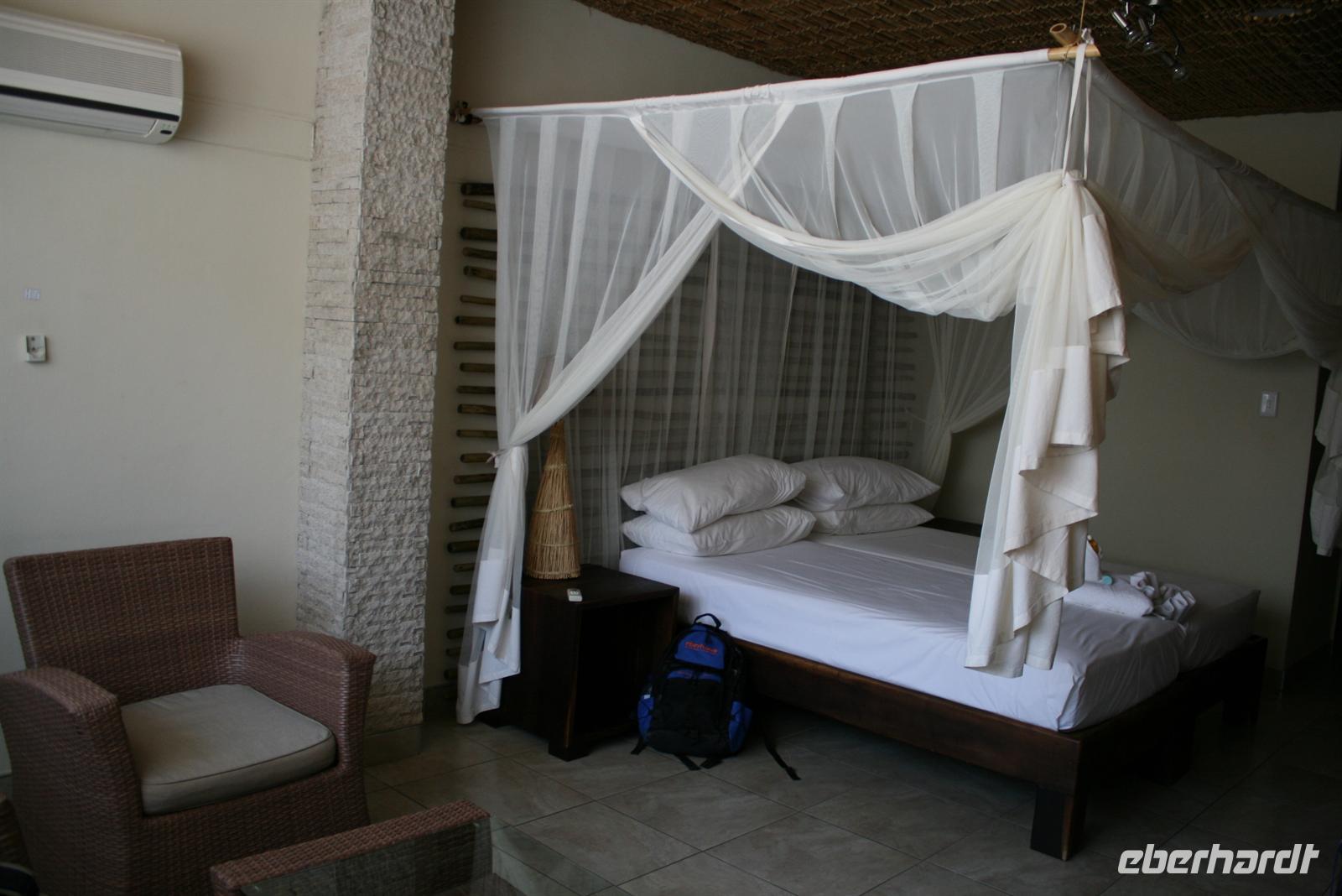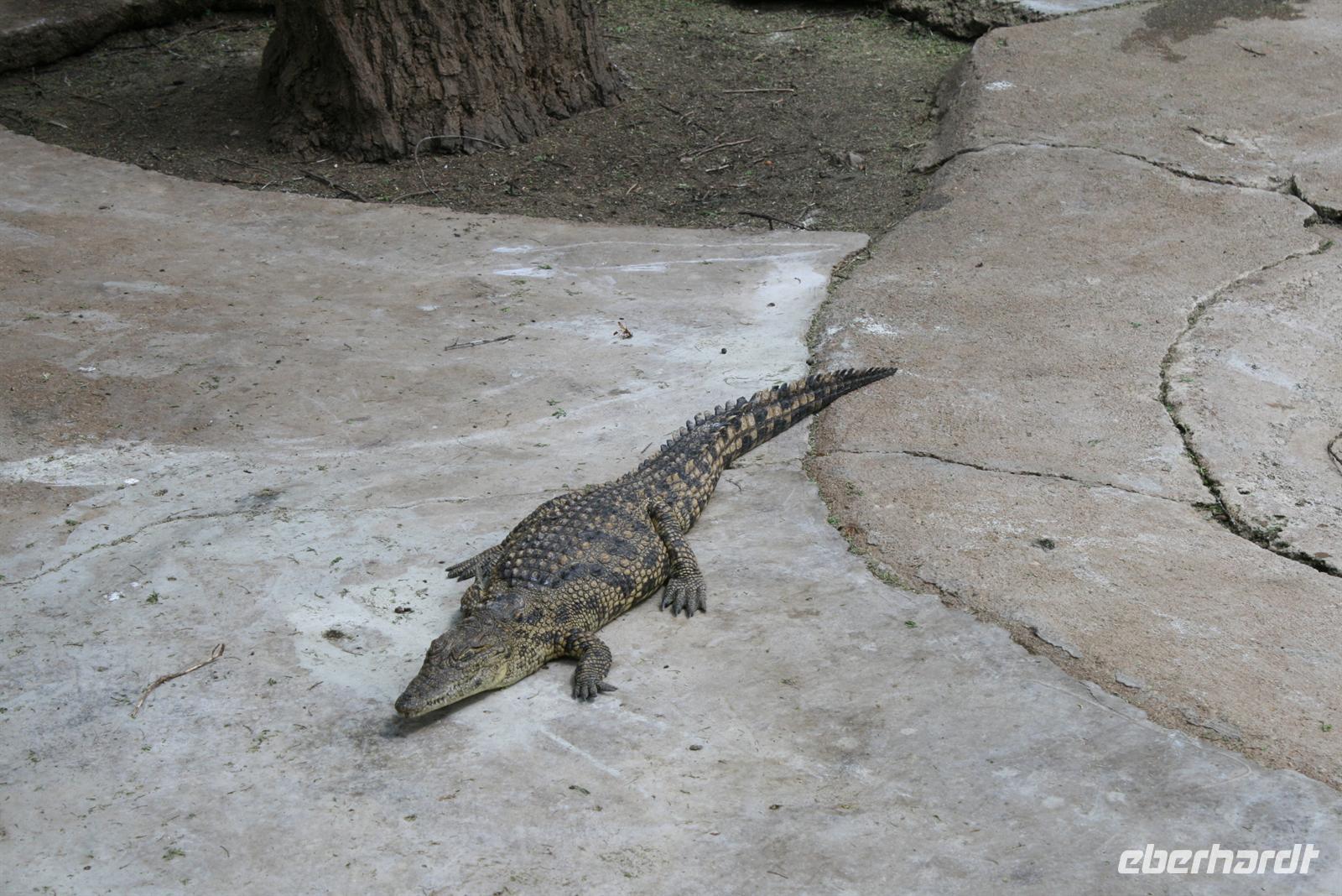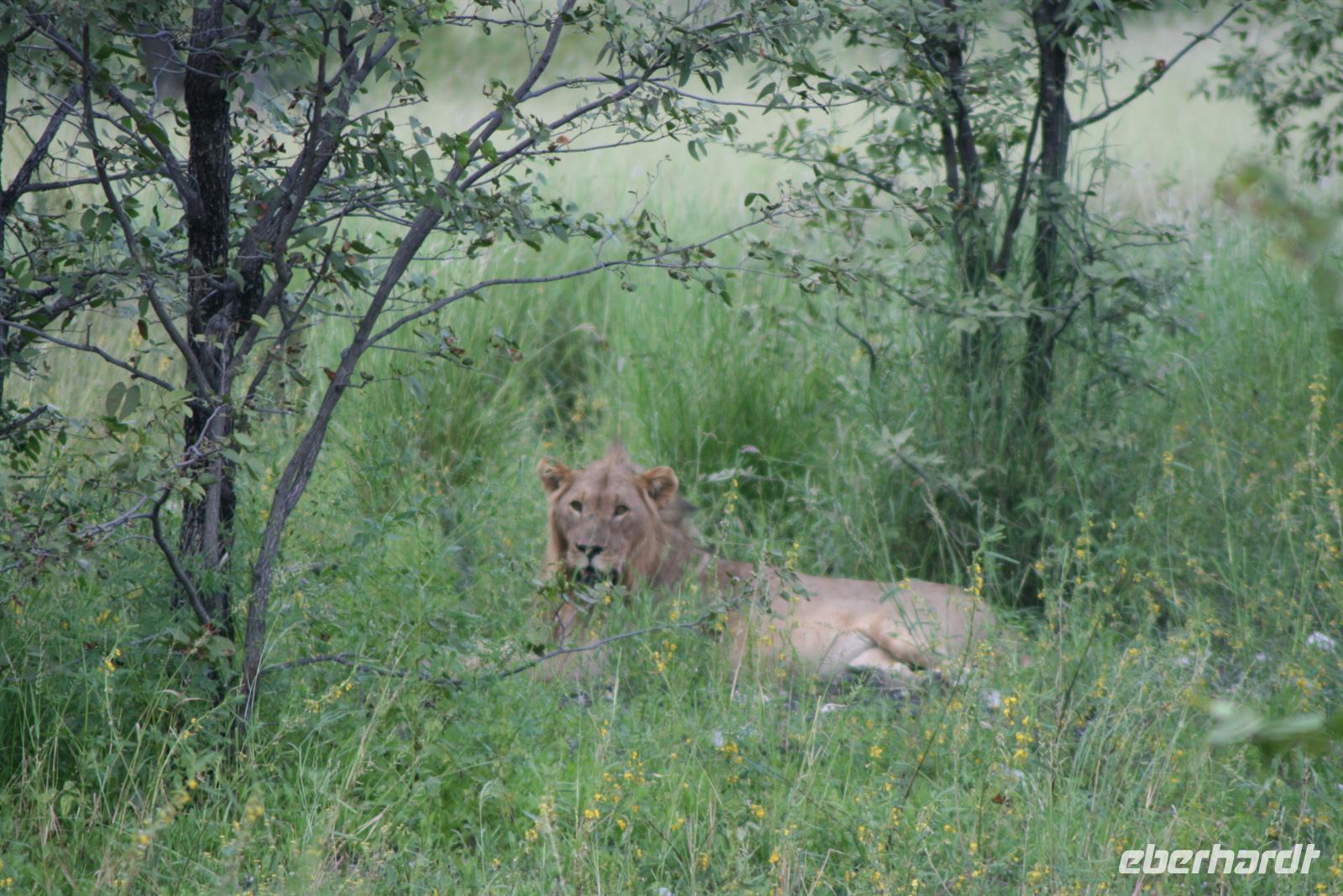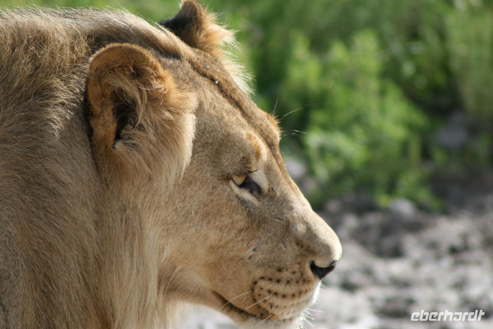 Vor Sonnenaufgang brachen wir auf um auf die Pirsch zu gehen. Der Etosha Nationalpark öffnet uns seine Pforten um sieben Uhr morgens. Schon nach wenigen Kilometern entdecken wir schöne Vögel wie Sekretäre und Oryxantilopen neben unserer Fahrbahn. Dann schrie es auf „Löwen! Das sind doch Löwen!" fünf prachtvolle Löwen stolzieren direkt auf uns zu um sich vor unserer Nase niederließen und anschließend die Straße querten. Sie streiften weiter Richtung Horizont als sie plötzlich kehrt machten um sich wieder direkt vor dem Reisebus zu platzieren. Eine kleine Schlammpfütze diente als kühle Erfrischung bei der Hitze. Ein spektakuläres Erlebnis, das bis dahin eines der Höhepunkte darbot. Es dauerte nicht allzulange als uns auch noch ein Spitzmaulnashorn über den Weg lief. Nach den aufregenden Begegnungen ruhten wir uns zur Mittagszeit in der Lodge, an die ein Wasserloch grenzt, aus. Am Wasserloch ging es quirlig her - Zebras über Zebras die sich am Wasser tummelten. Auch unsere Weiterfahrt bot einiges: Zebras, Zebras, Zebras, Zebras, Zebras, Zebras, Gnu Zebras, Zebras, Zebras, Zebras, Zebras, Zebras, Springbok, Zebras, Zebras, Zebras, Zebras, Zebras, Zebras ... Als wir am frühen Abend den Park Richtung Toshari Lodge verlassen, störten wir ein paar Giraffen beim Abendessen. Unser Abendessen fand an diesem Tag im Garten der Lodge als Grillabend statt.