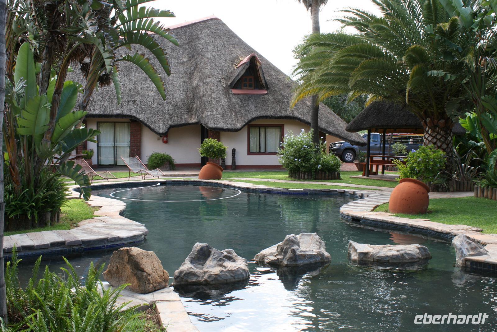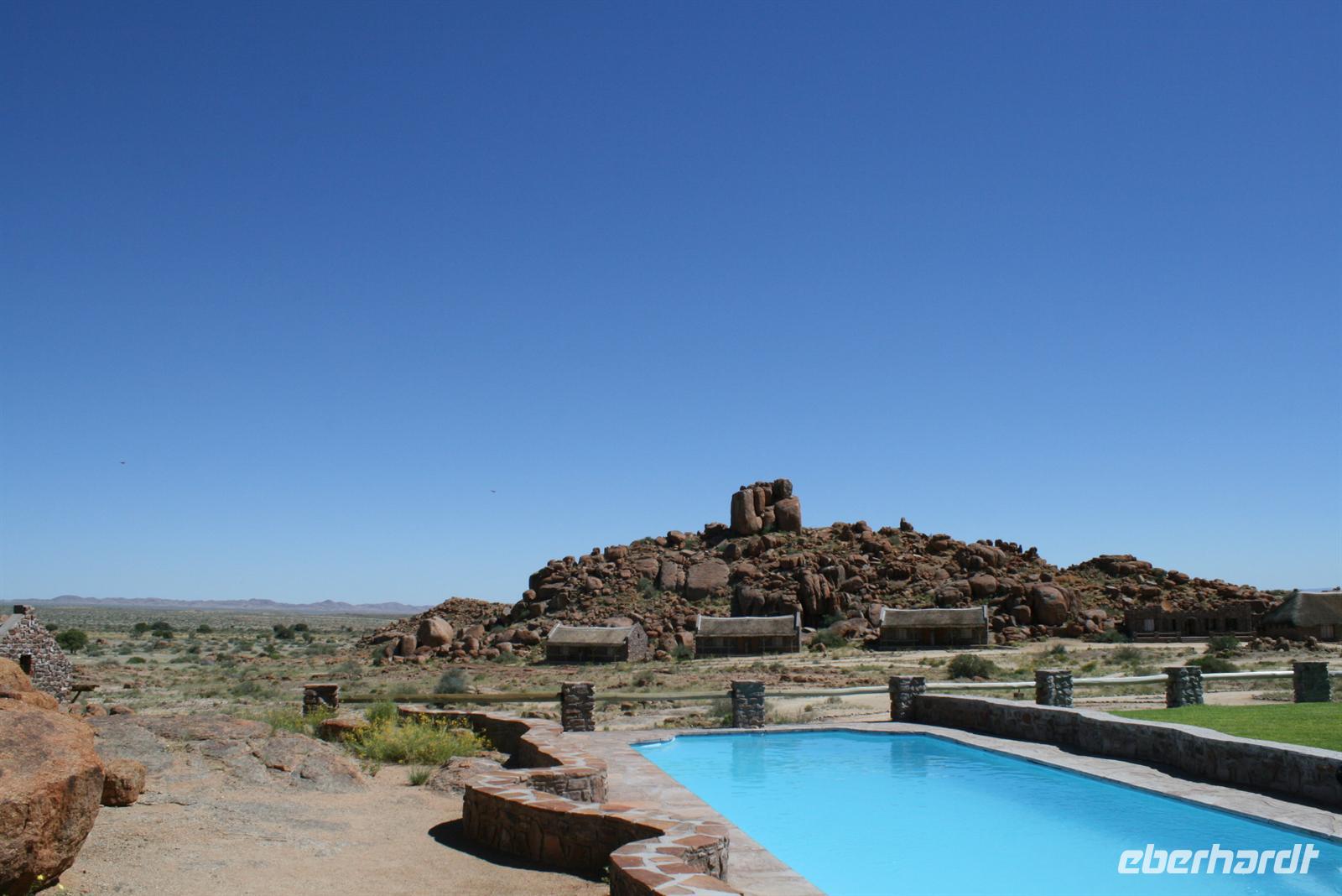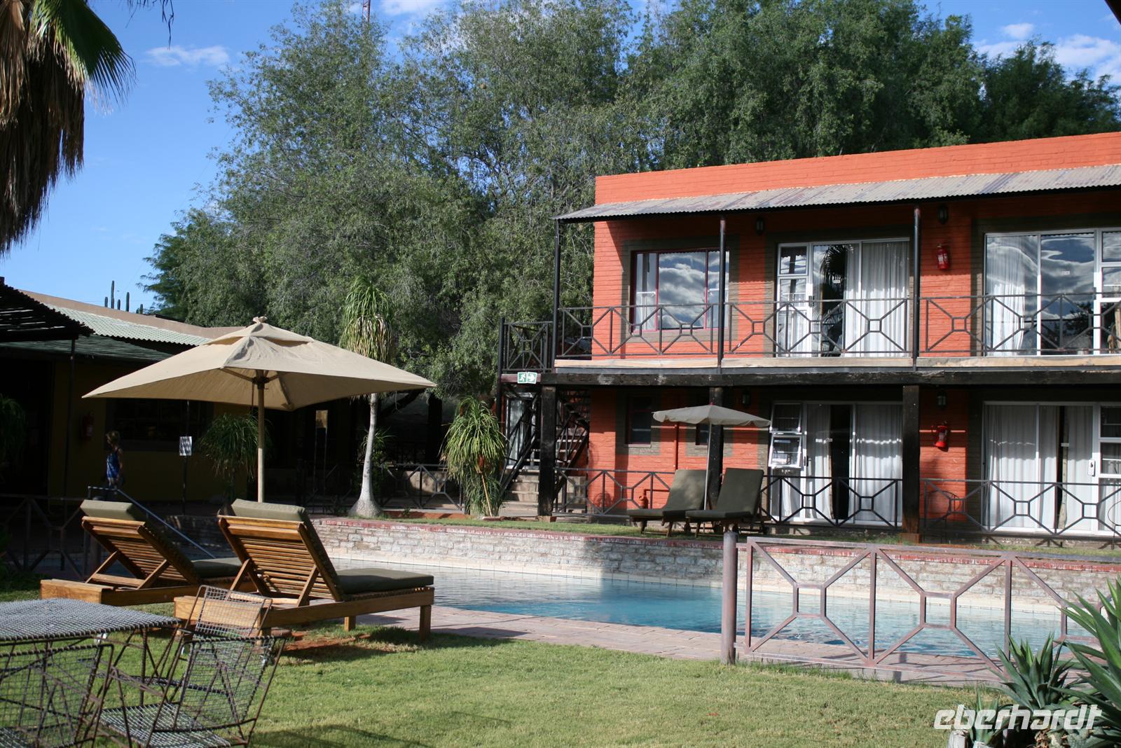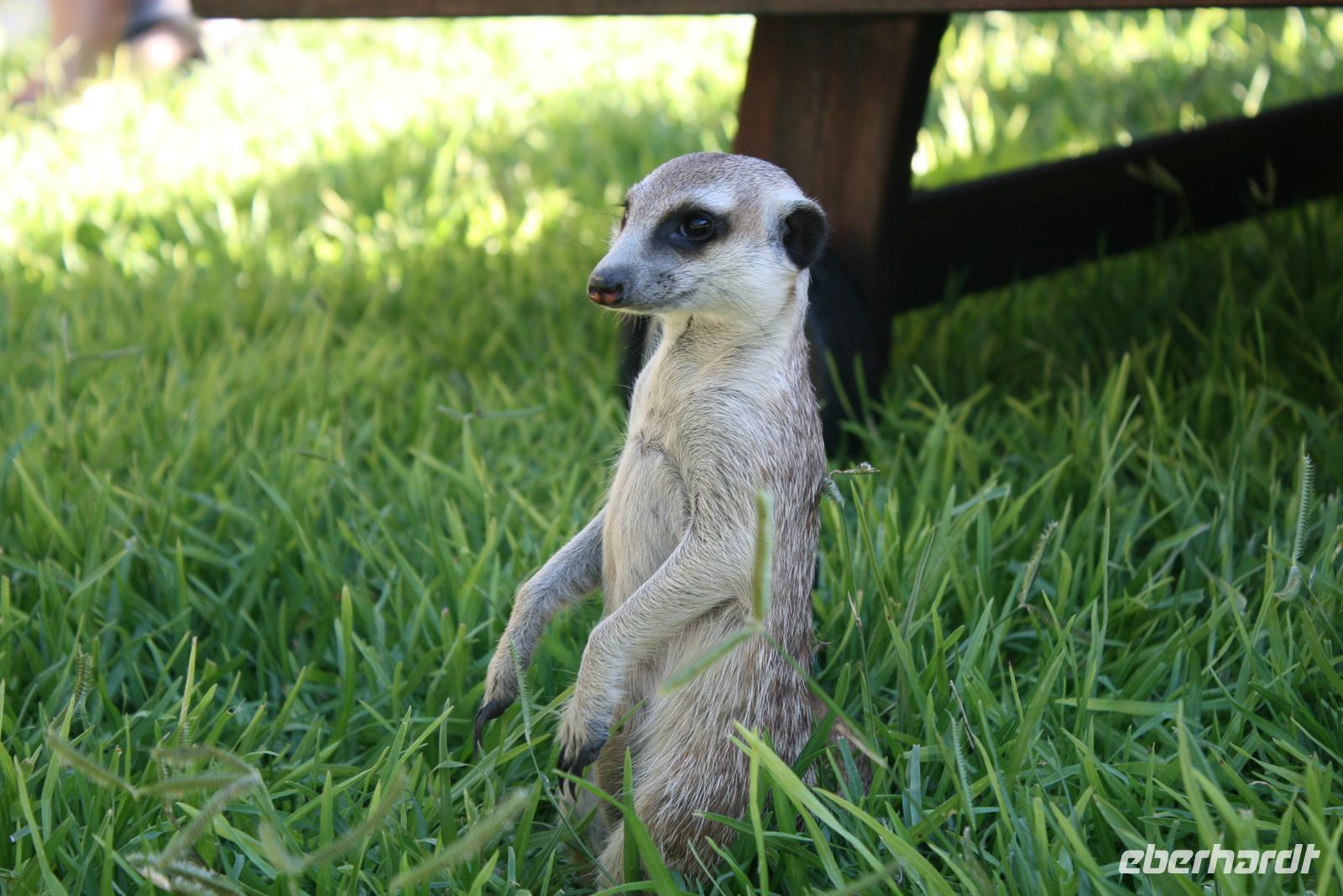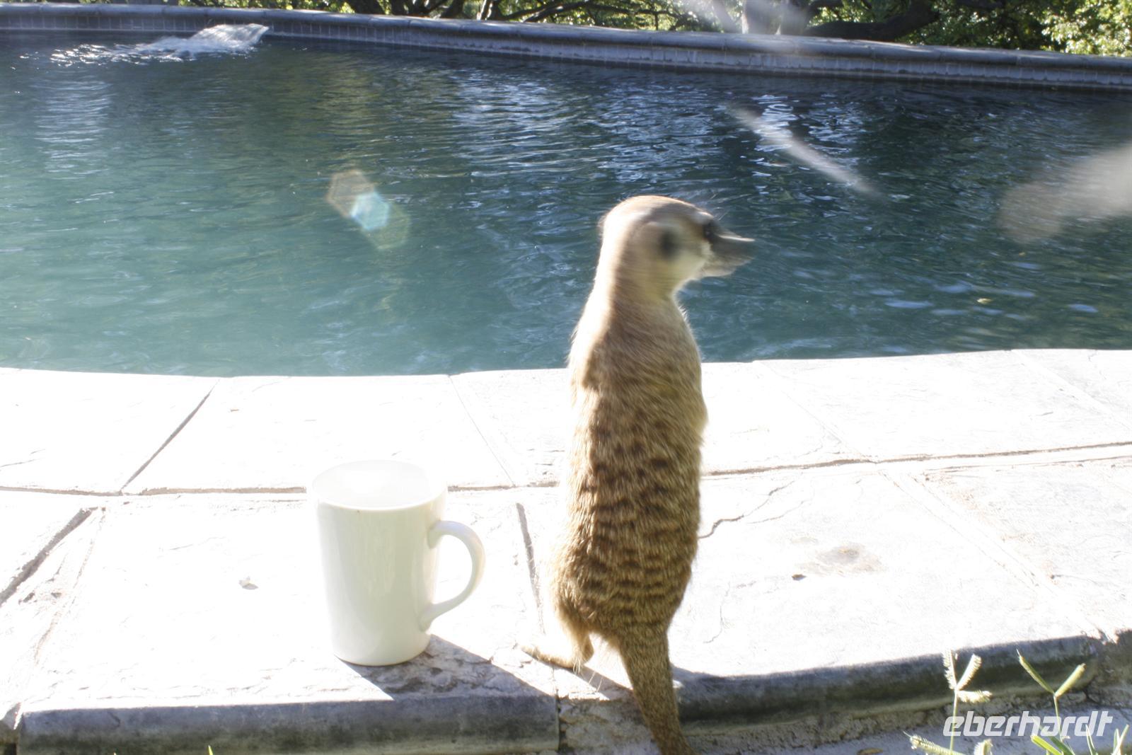 Namibias ewige Weite liegt vor uns. Von unserer Lodge in Opuwa fahren wir die uns bereits bekannte Strecke in Richtung Etosha zurück. Ganz nahe dem Etosha Nationalpark befindet sich unsere schöne Lodge, wo wir den Nachmittag wieder am Pool genießen können. Für heitere Stimmung sorgte das Hausmaskottchen - ein kleines Erdmännchen.