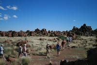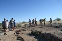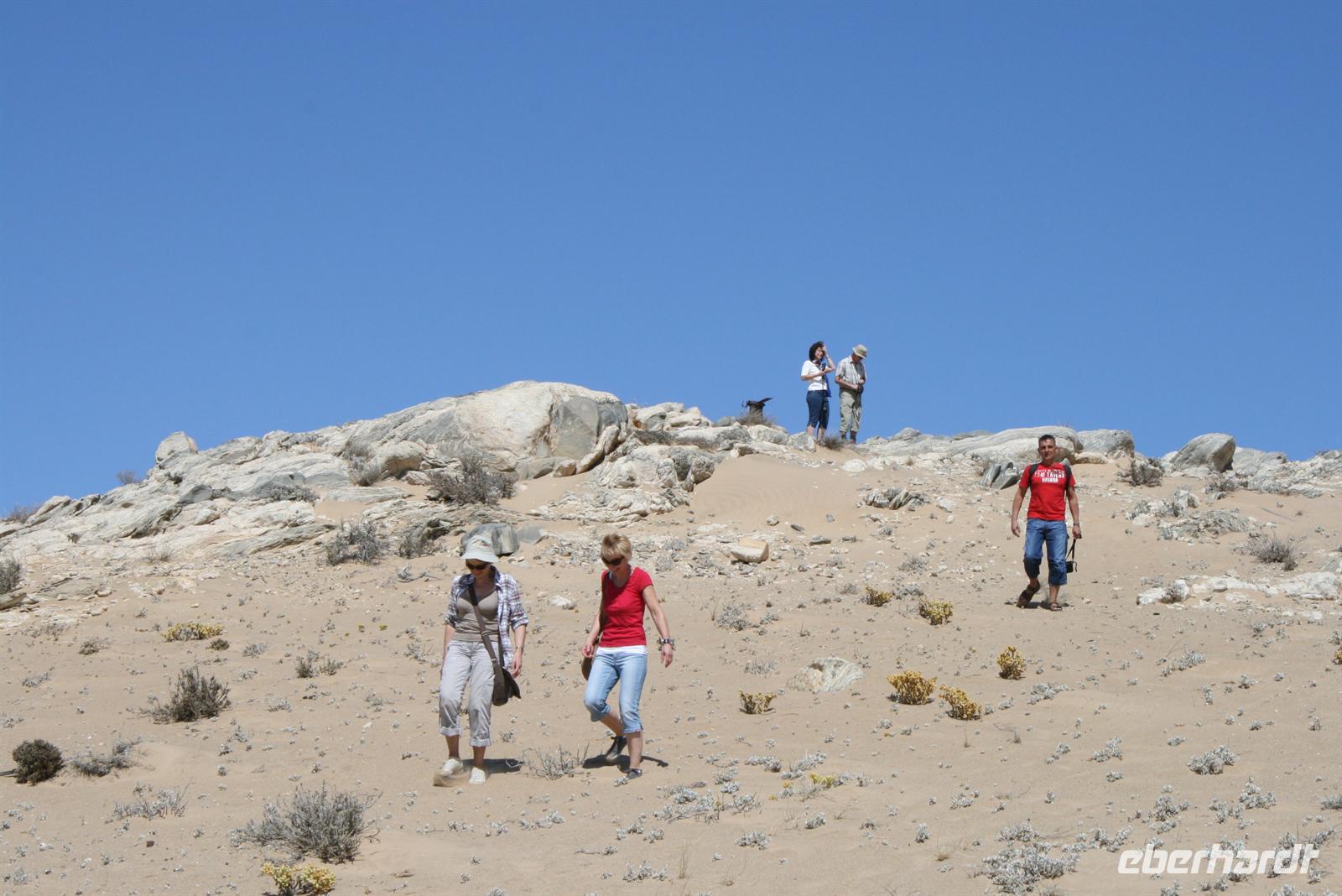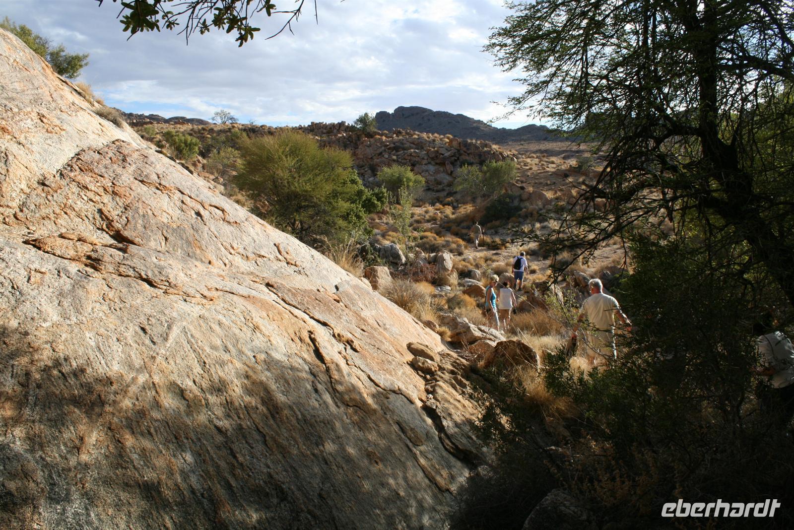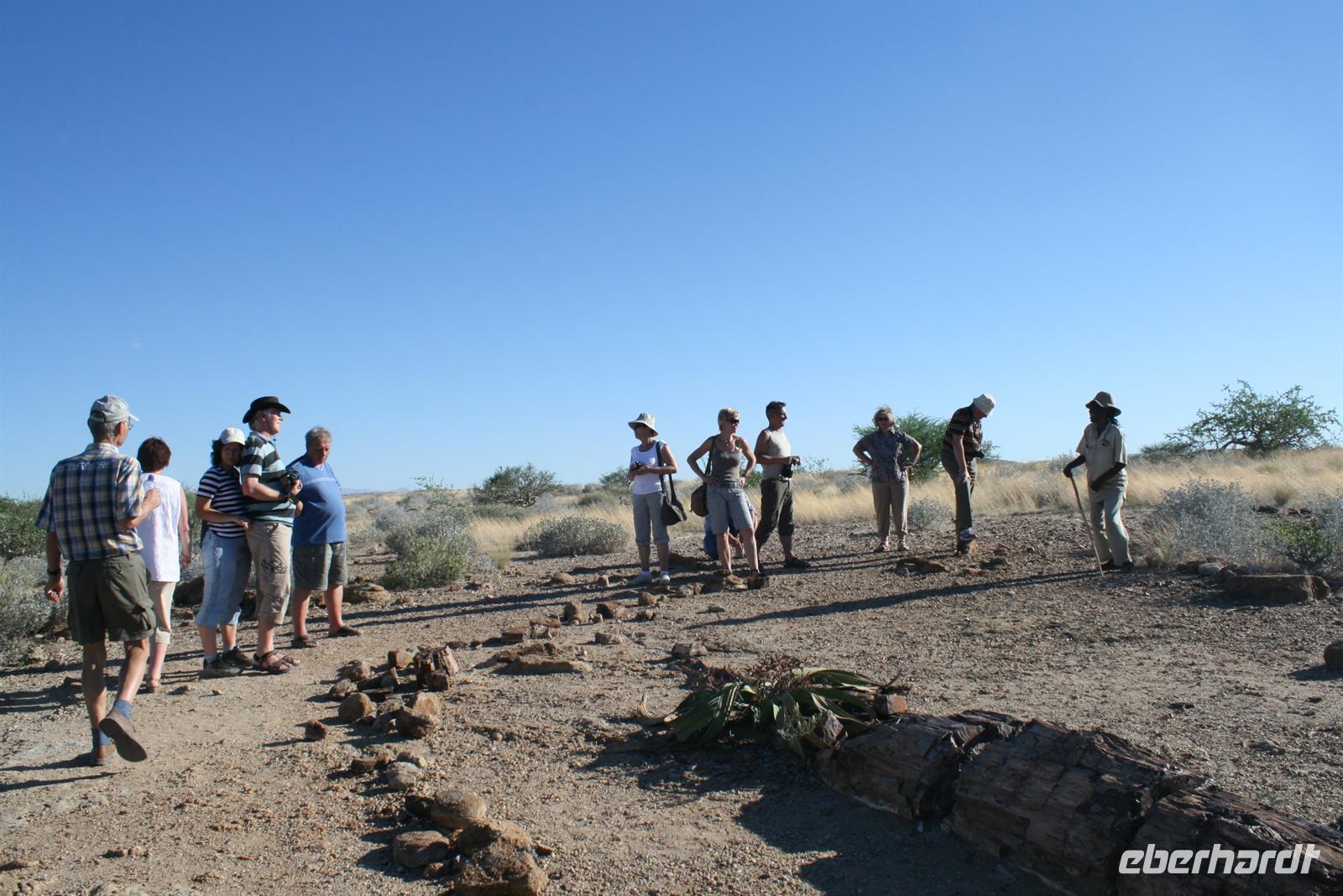 Von Swakopmund aus starteten wir am morgen entlang der Küste in Richtung Norden. Die starken Wellen des Atlantiks haben an der Küste so einige Opfer gefordert - unweit von Swakopmund betrachten wir ein Schiffswrack, von denen es in der Sceleton Küste noch unzählige Exemplare gibt. Wir kommen in das Damaraland, wo schon allmählich die Hütten und die Verkaufstände der Damara zunehmen. Aufgrund der Mienen um Uis werden hier viele Halbedelsteine am Straßenrand und in den Städten von Jungen zum Verkauf angeboten. Nach einer Mittagspause in Uis fahren wir weiter Richtung Nordosten zur „Twyfelfontein". Hier an der „Zweifelsquelle" haben schon vor tausenden von Jahren Buschmänner gelebt und ihre Spuren hinterlassen. Auf einem Rundweg zeigt uns eine örtliche Führerin die gut erhaltenen Felsgravuren der Buschmänner. Nach einem interessanten, aber doch auch kräftezehrenden Rundgang durch das Gebiet fahren wir weiter in Richtung Korixas. Der versteinerte Wald liegt noch auf unserem Weg zur Lodge. Hier erfahren wir nicht nur vieles über die Entstehung des versteinerten Holzes, wir lernen auch die Klicksprache der Damara kenne. Susanna, unsere lebensfrohe Führerin versuchte uns (weniger erfolgreich) die Klicklaute beizubringen. Auf unterhaltsam Art und Weise gab sie uns einen Einblick in die für uns unbekannte Sprache. Mit einem guten „Aaaaaa-maaaaa - rulla, Amarulla, Amarulla - rulla - rulla" beendeten wir unseren Rundgang und fuhren zur heutigen Lodge dem „Korixas Camp". Nachdem wir die einfach ausgestatteten Zimmer bezogen trafen wir uns zum Grillabend wieder.