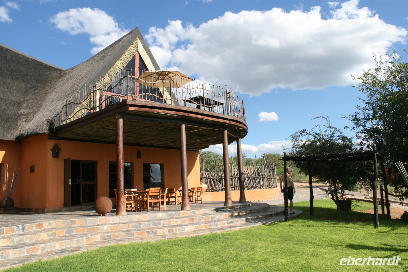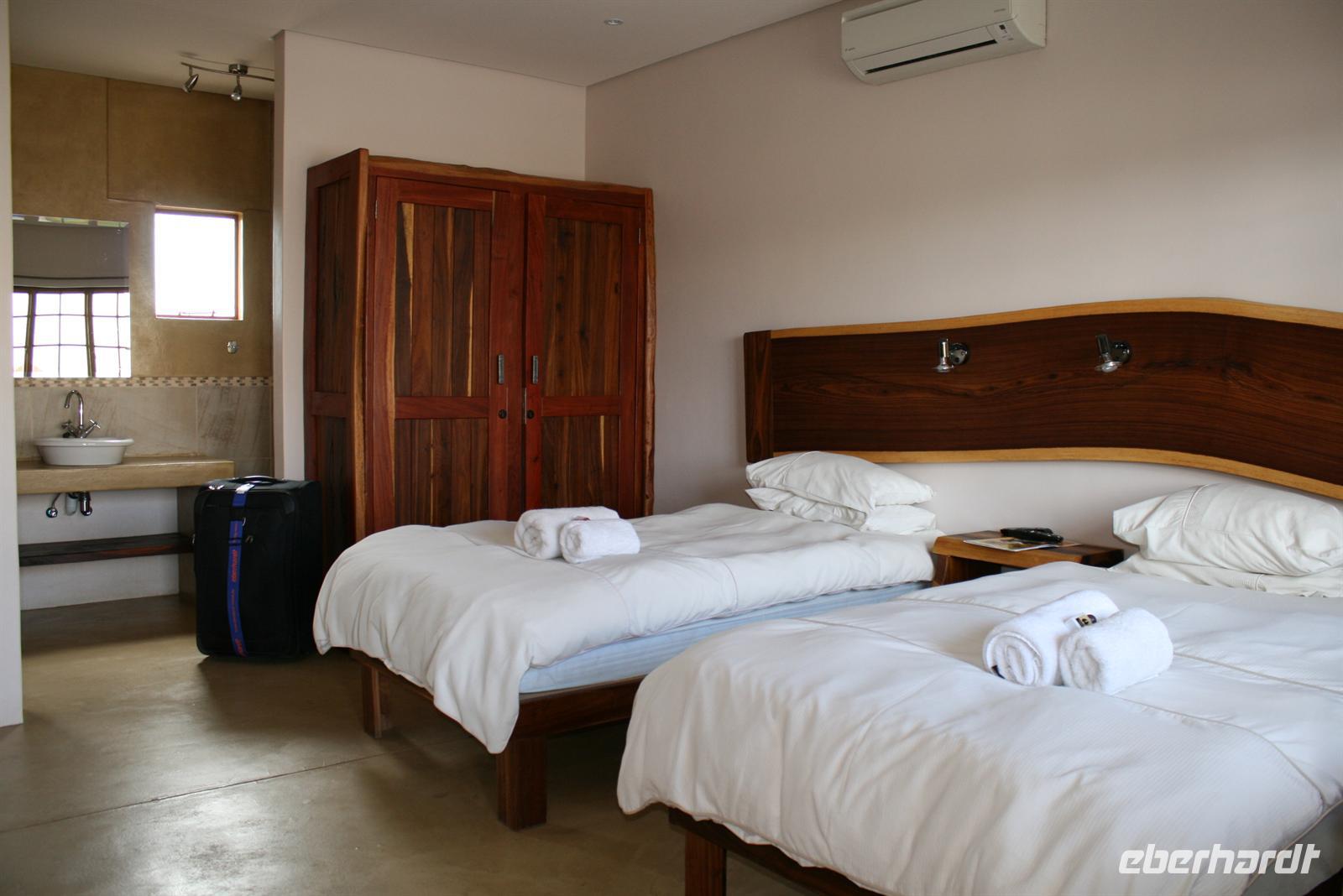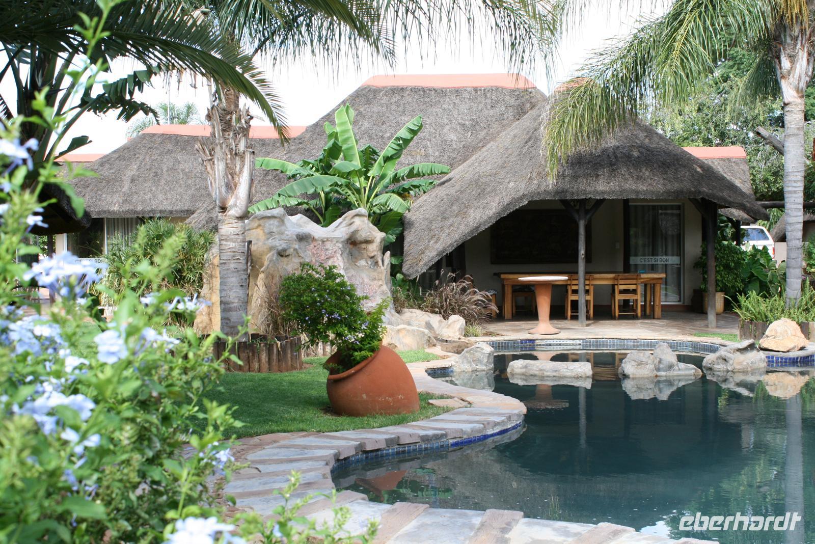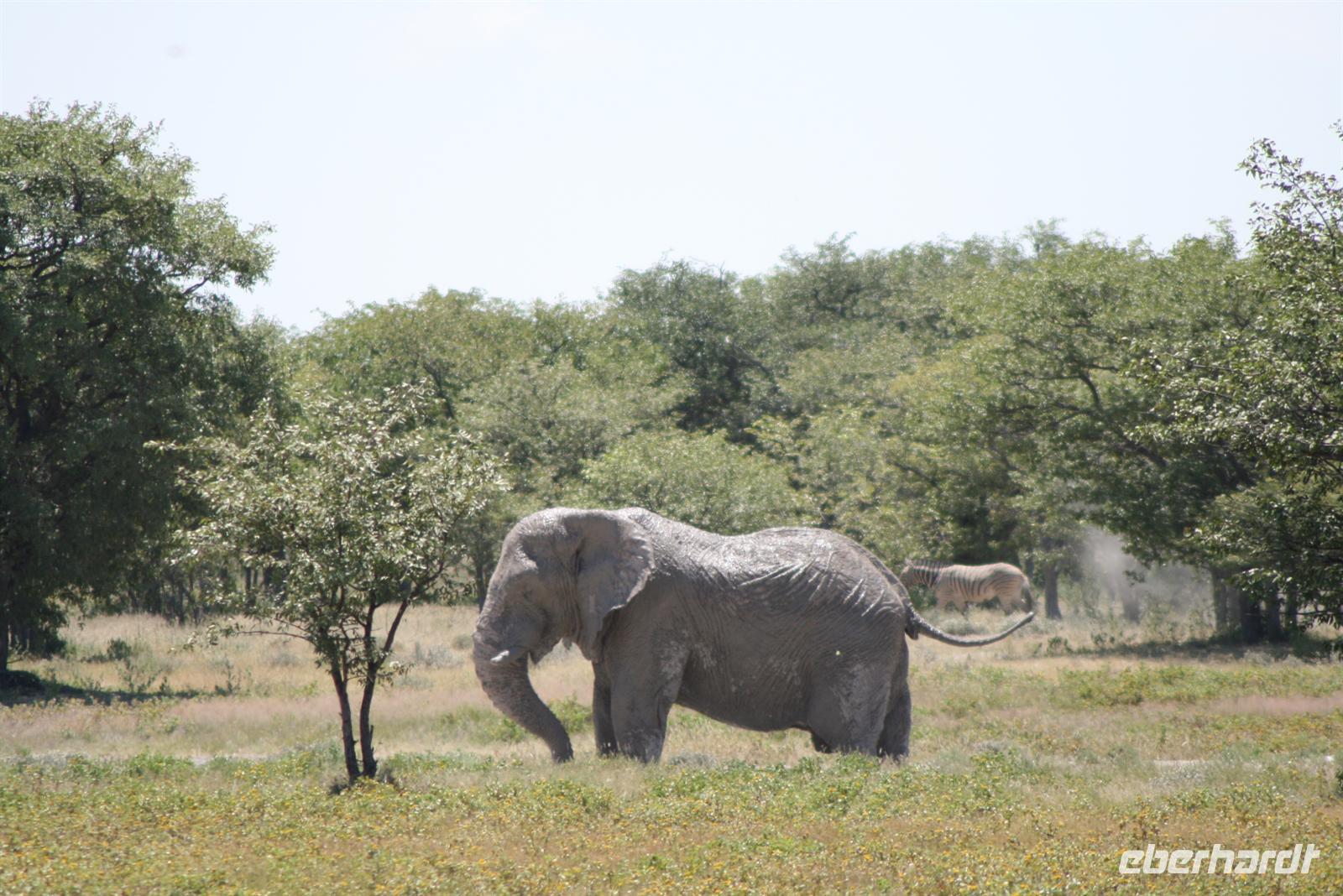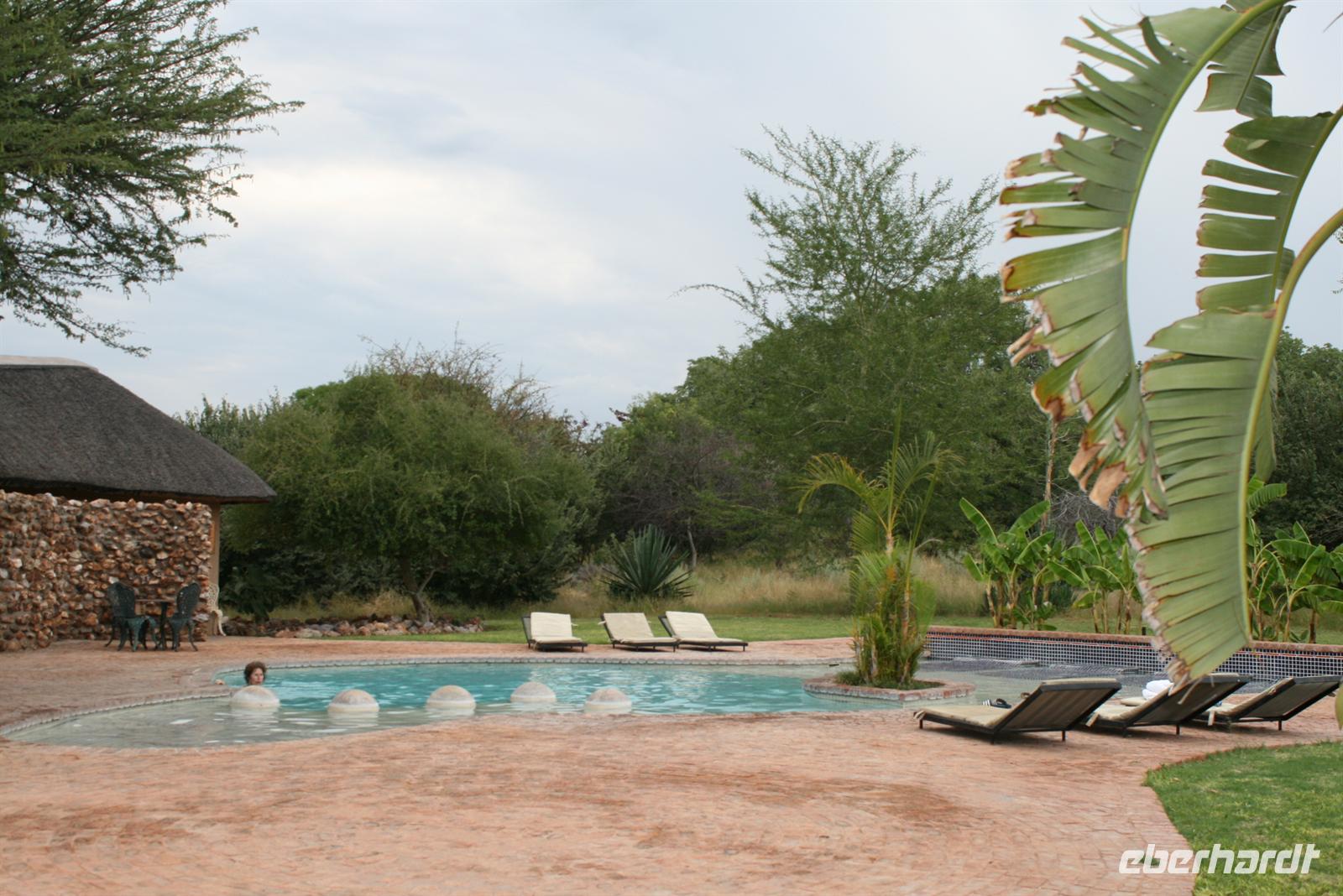Noch ein letztes Mal versuchen wir ein paar der beeindruckenden Tiere des Etosha Nationalparks zu Gesicht zu bekommen. Und wir haben auch an diesem Tag außerordentliches Glück. Schon nach wenigen Minuten Fahrt in Richtung Norden entdeckten wir Giraffen im Gebüsch. Am nächsten Wasserloch zeigte sich ein Tier, dann in voller Größe. Obwohl es hieß alle Elefanten währen gerade ausgeflogen, entdeckten unser Wildsafariexperte Nico einen frischen Elefantenfussabdruck und abgeknickten Bäume. Nun die Hoffnung stirbt zu letzt, so begegneten wir zwei jungen Bullen mitten im dichten Gebüsch links und rechts der Strasse. Beide waren aktiv dabei zu fressen und zu baden. Im Großen und Ganzen drei gelungene Tage mit vielen Eindrücken und riesigem Glück (man könnte es auch den sechsten Sinn von Nico verdanken!) so viele verschiedene und teilweise auch seltene Tiere in der freien Natur zu beobachten. Nur einige Kilometer vom Etosha Nationalpark entfernt liegt die liebevoll gestaltete „!Uris Safari Lodge", wo wir mit Paukenschlägen empfangen werden. Den Nachmittag konnten wir uns am Pool oder in der schöngestalteten Anlage vertreiben, bevor man uns zum eleganten Abendtisch bat.