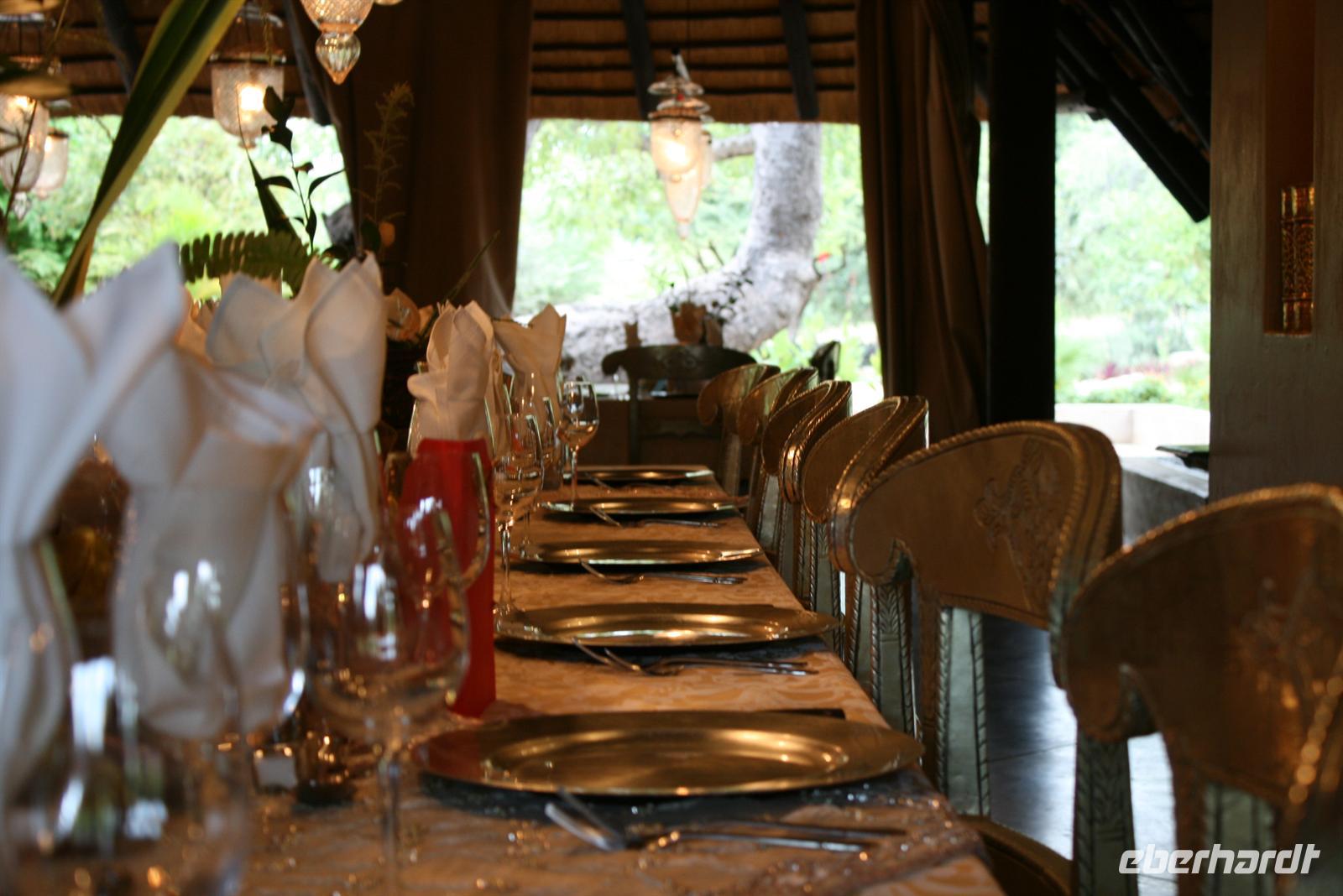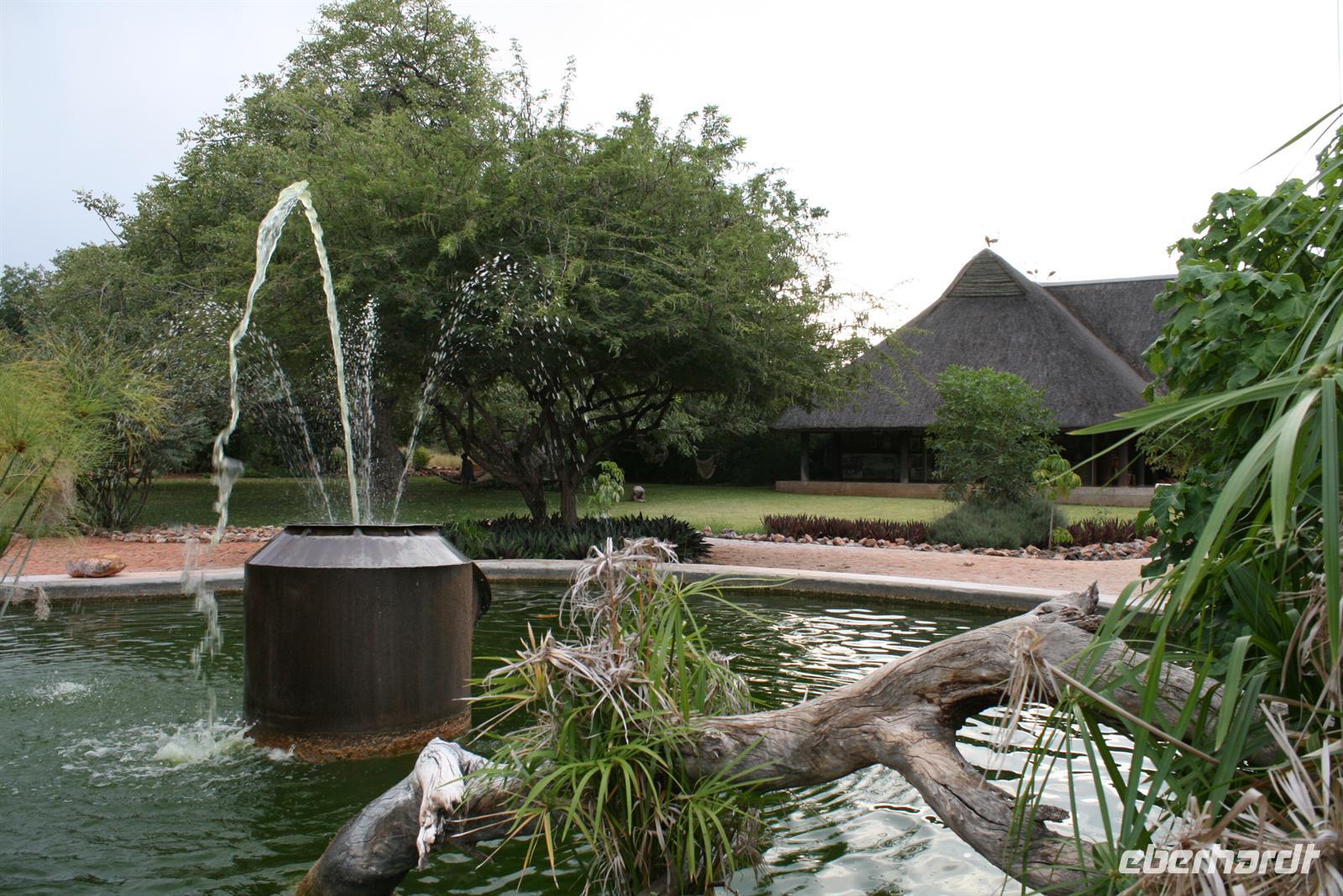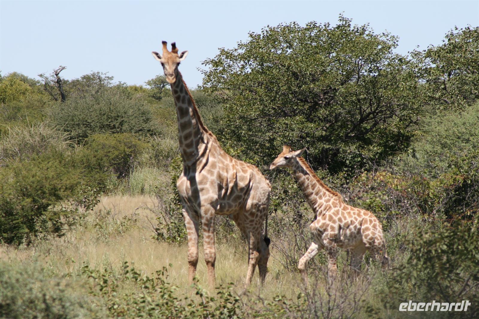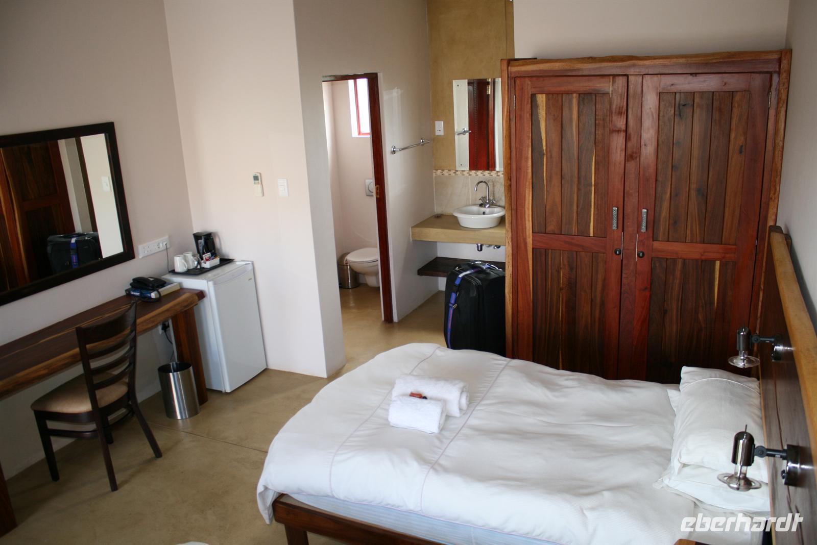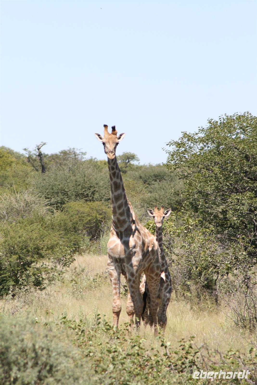 Noch ein letztes Mal versuchen wir ein paar der beeindruckenden Tiere des Etosha Nationalparks zu Gesicht zu bekommen. Und wir haben auch an diesem Tag außerordentliches Glück. Schon nach wenigen Minuten Fahrt in Richtung Norden entdeckten wir Giraffen im Gebüsch. Am nächsten Wasserloch zeigte sich ein Tier, dann in voller Größe. Obwohl es hieß alle Elefanten währen gerade ausgeflogen, entdeckten unser Wildsafariexperte Nico einen frischen Elefantenfussabdruck und abgeknickten Bäume. Nun die Hoffnung stirbt zu letzt, so begegneten wir zwei jungen Bullen mitten im dichten Gebüsch links und rechts der Strasse. Beide waren aktiv dabei zu fressen und zu baden. Im Großen und Ganzen drei gelungene Tage mit vielen Eindrücken und riesigem Glück (man könnte es auch den sechsten Sinn von Nico verdanken!) so viele verschiedene und teilweise auch seltene Tiere in der freien Natur zu beobachten. Nur einige Kilometer vom Etosha Nationalpark entfernt liegt die liebevoll gestaltete „!Uris Safari Lodge", wo wir mit Paukenschlägen empfangen werden. Den Nachmittag konnten wir uns am Pool oder in der schöngestalteten Anlage vertreiben, bevor man uns zum eleganten Abendtisch bat.