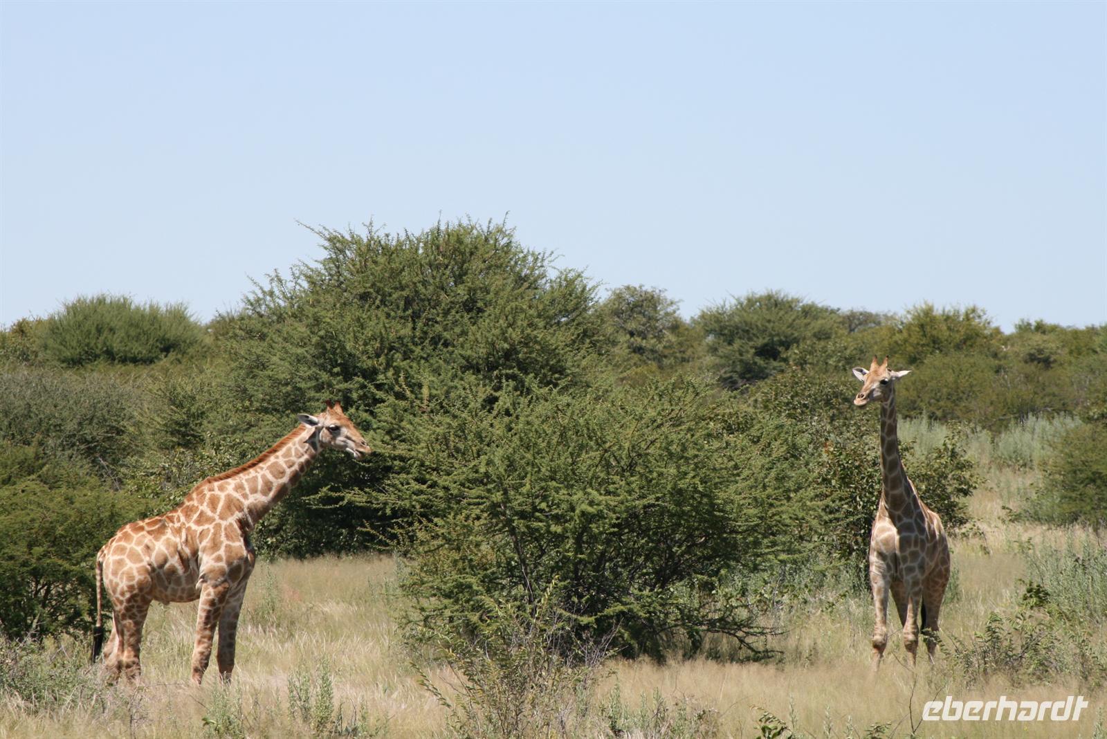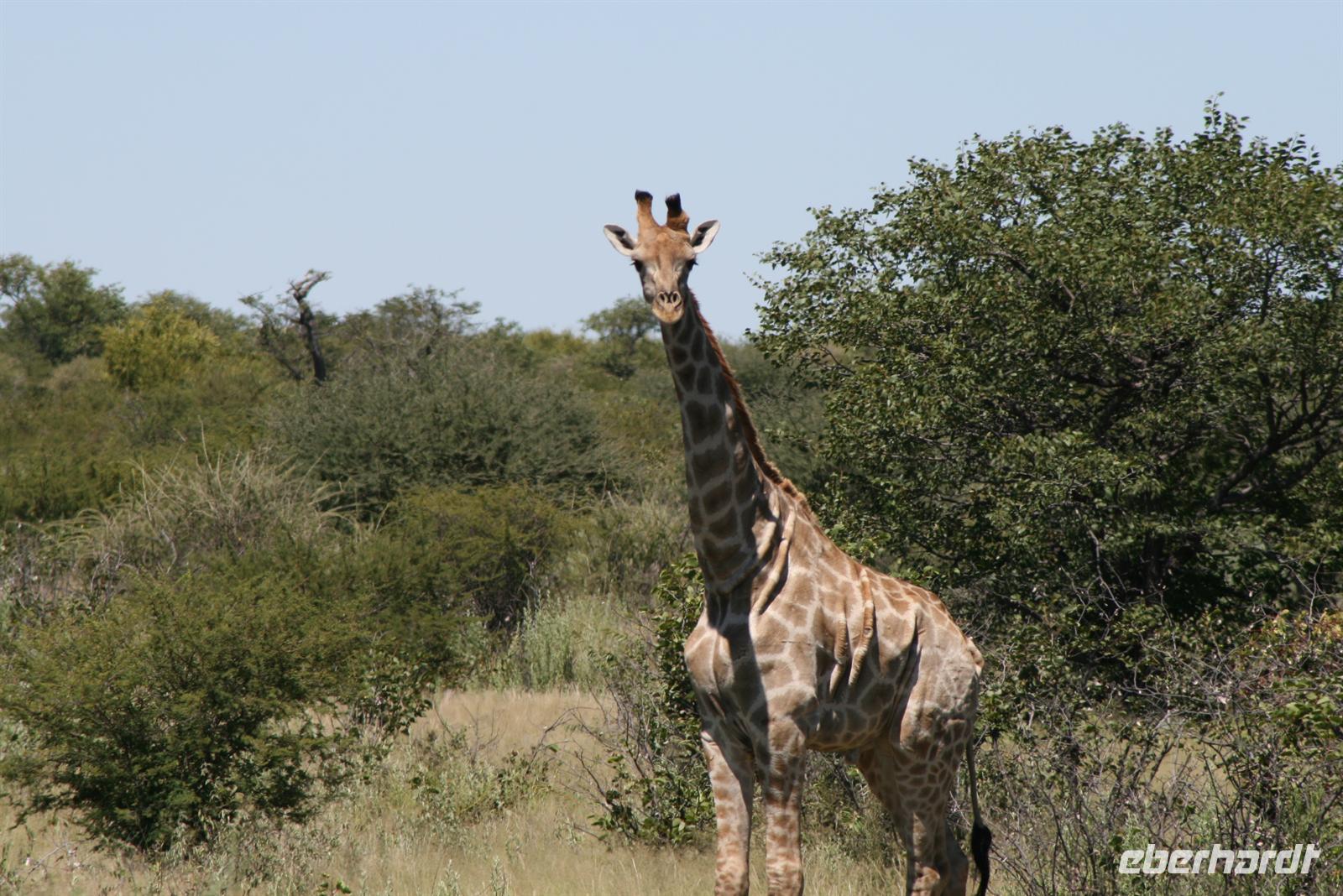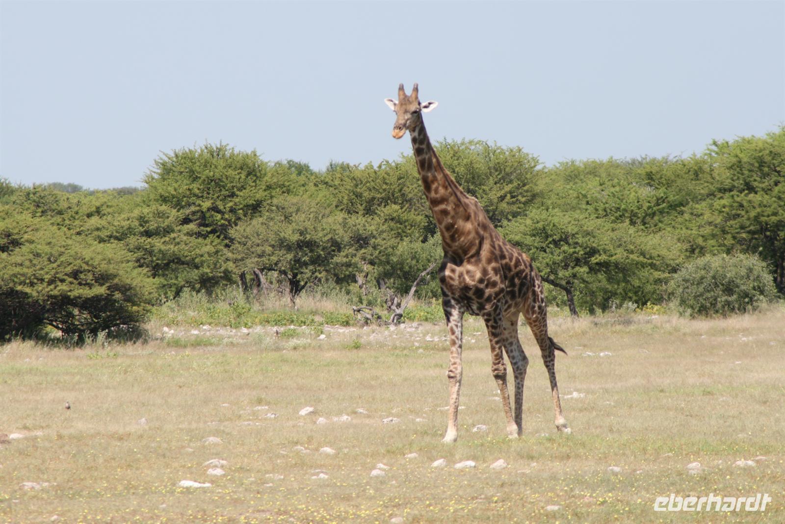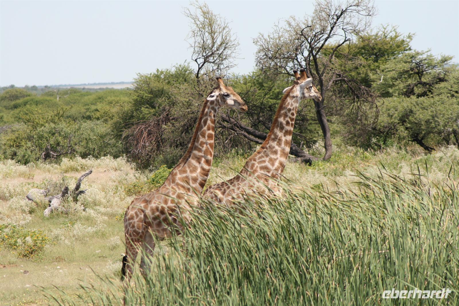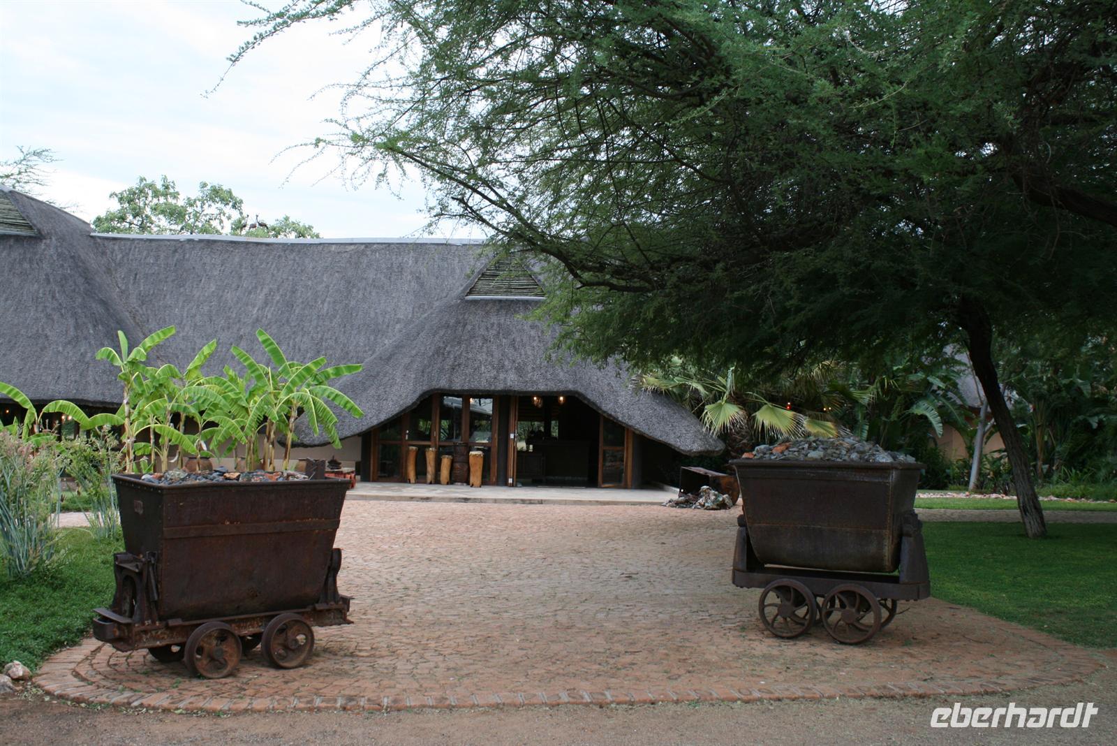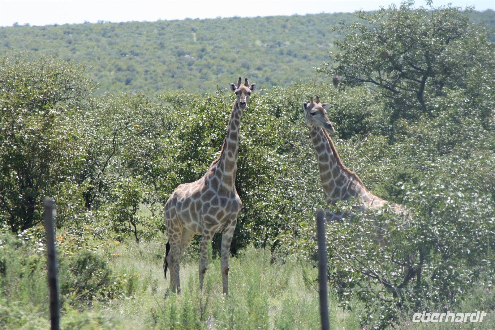 Noch ein letztes Mal versuchen wir ein paar der beeindruckenden Tiere des Etosha Nationalparks zu Gesicht zu bekommen. Und wir haben auch an diesem Tag außerordentliches Glück. Schon nach wenigen Minuten Fahrt in Richtung Norden entdeckten wir Giraffen im Gebüsch. Am nächsten Wasserloch zeigte sich ein Tier, dann in voller Größe. Obwohl es hieß alle Elefanten währen gerade ausgeflogen, entdeckten unser Wildsafariexperte Nico einen frischen Elefantenfussabdruck und abgeknickten Bäume. Nun die Hoffnung stirbt zu letzt, so begegneten wir zwei jungen Bullen mitten im dichten Gebüsch links und rechts der Strasse. Beide waren aktiv dabei zu fressen und zu baden. Im Großen und Ganzen drei gelungene Tage mit vielen Eindrücken und riesigem Glück (man könnte es auch den sechsten Sinn von Nico verdanken!) so viele verschiedene und teilweise auch seltene Tiere in der freien Natur zu beobachten. Nur einige Kilometer vom Etosha Nationalpark entfernt liegt die liebevoll gestaltete „!Uris Safari Lodge", wo wir mit Paukenschlägen empfangen werden. Den Nachmittag konnten wir uns am Pool oder in der schöngestalteten Anlage vertreiben, bevor man uns zum eleganten Abendtisch bat.
