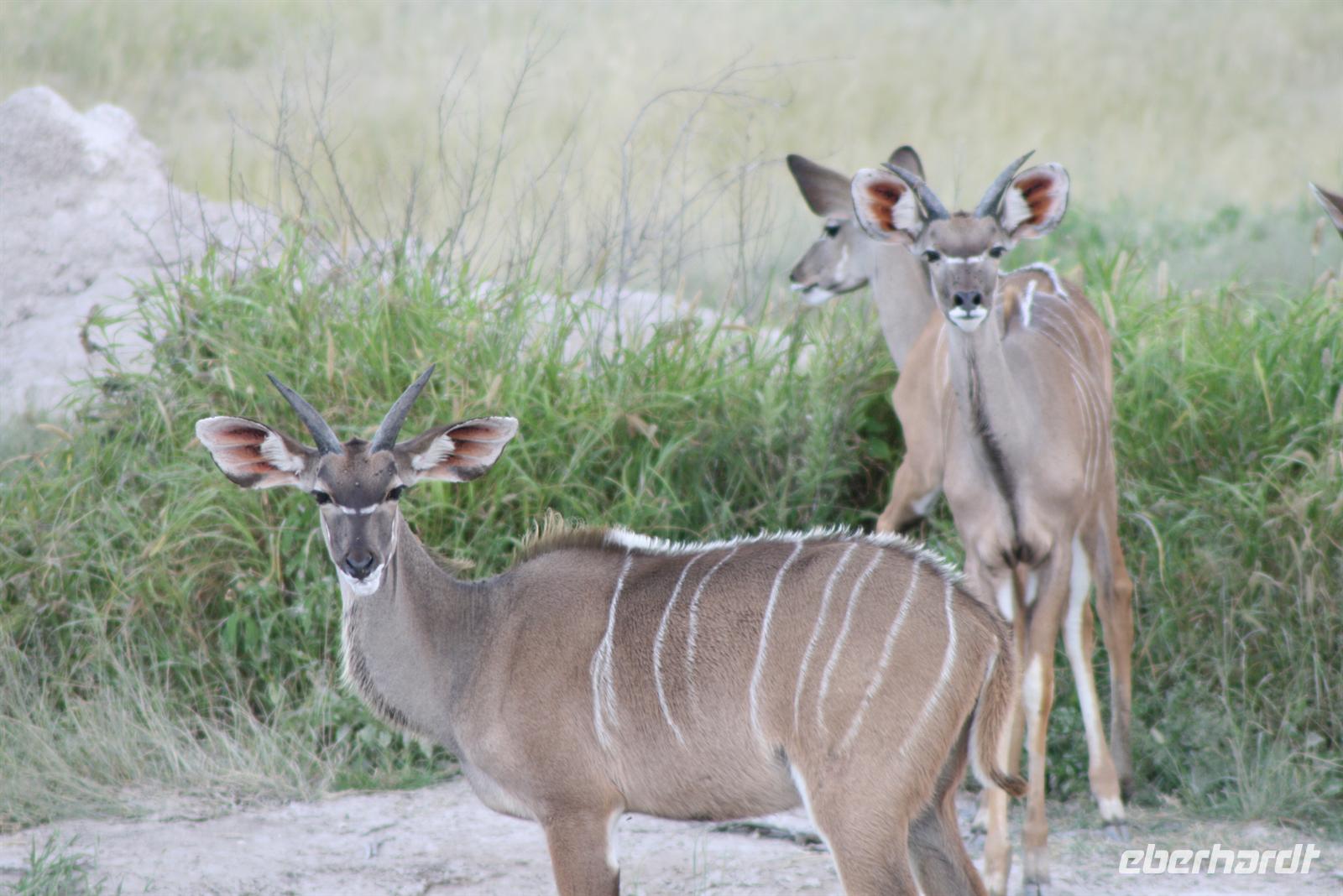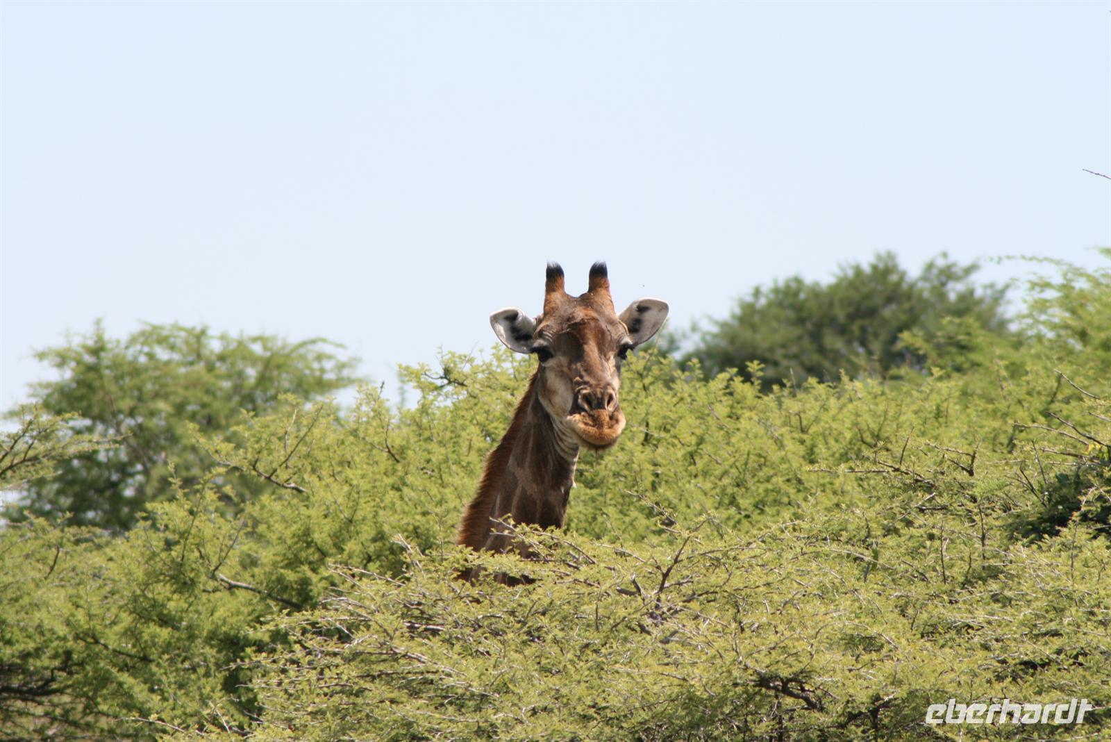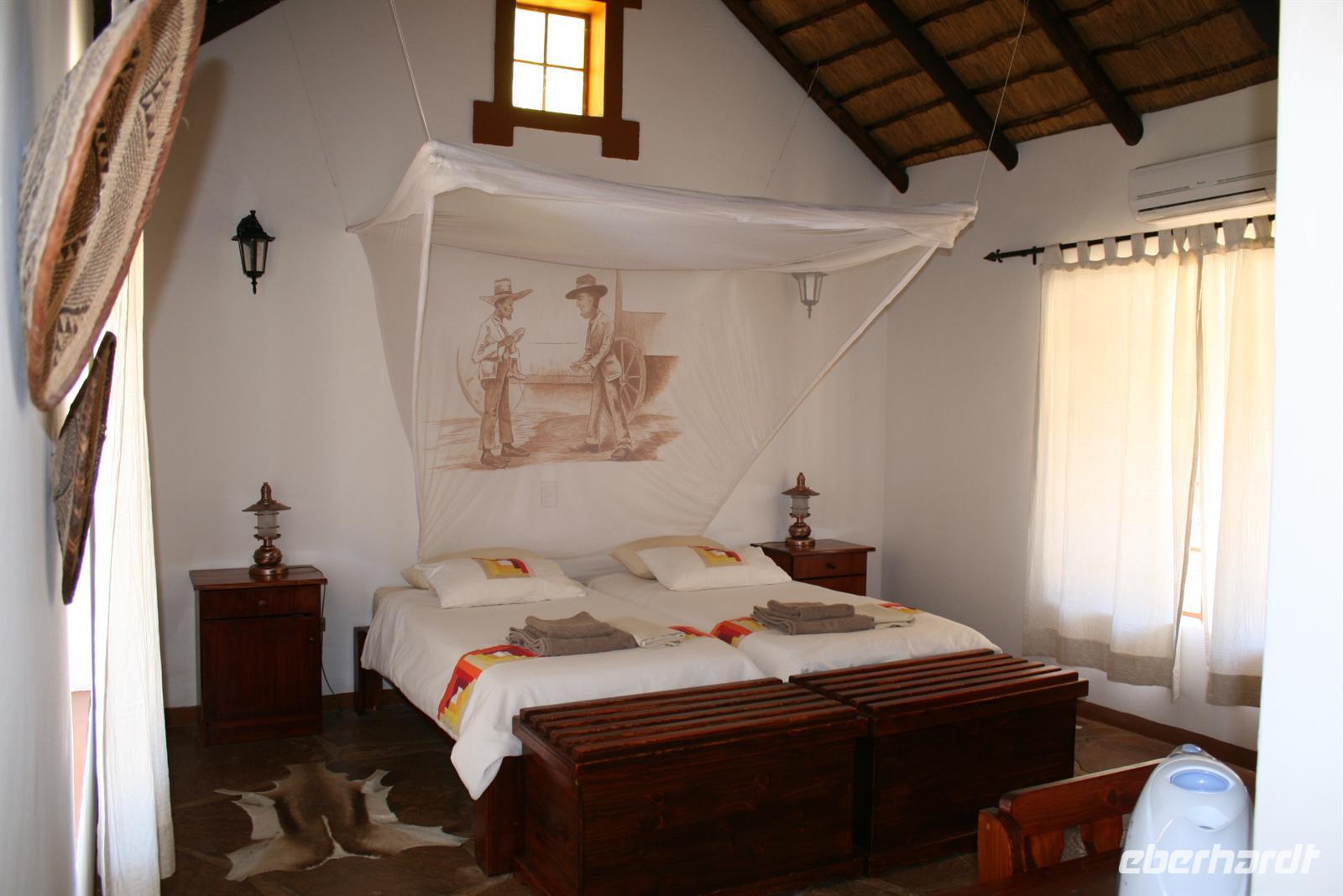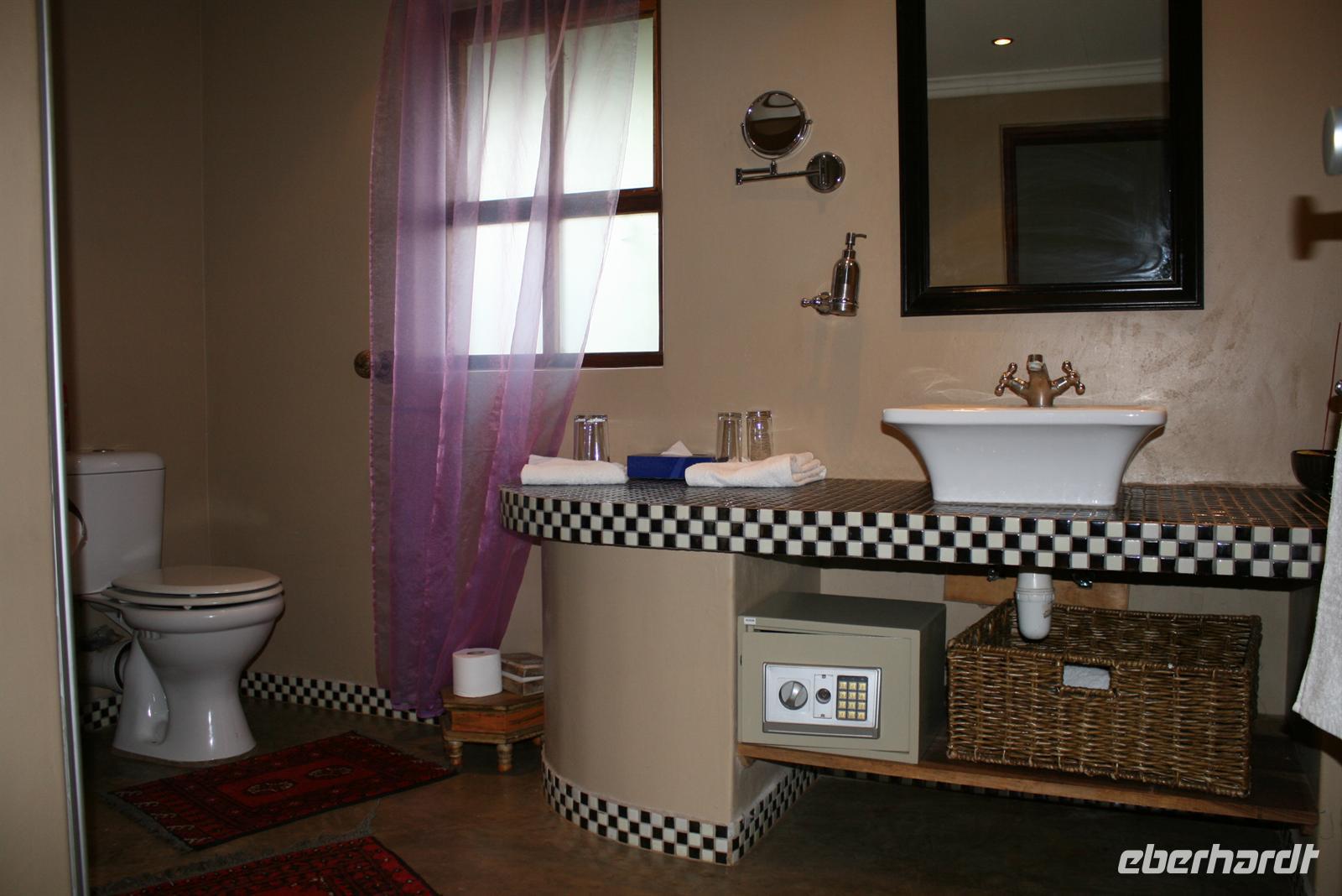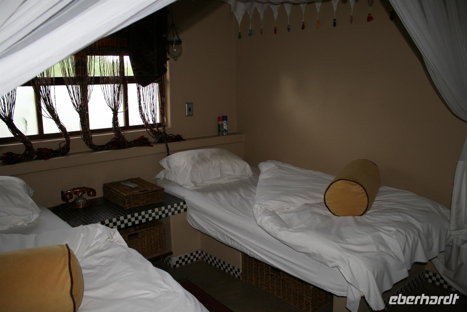 Noch ein letztes Mal versuchen wir ein paar der beeindruckenden Tiere des Etosha Nationalparks zu Gesicht zu bekommen. Und wir haben auch an diesem Tag außerordentliches Glück. Schon nach wenigen Minuten Fahrt in Richtung Norden entdeckten wir Giraffen im Gebüsch. Am nächsten Wasserloch zeigte sich ein Tier, dann in voller Größe. Obwohl es hieß alle Elefanten währen gerade ausgeflogen, entdeckten unser Wildsafariexperte Nico einen frischen Elefantenfussabdruck und abgeknickten Bäume. Nun die Hoffnung stirbt zu letzt, so begegneten wir zwei jungen Bullen mitten im dichten Gebüsch links und rechts der Strasse. Beide waren aktiv dabei zu fressen und zu baden. Im Großen und Ganzen drei gelungene Tage mit vielen Eindrücken und riesigem Glück (man könnte es auch den sechsten Sinn von Nico verdanken!) so viele verschiedene und teilweise auch seltene Tiere in der freien Natur zu beobachten. Nur einige Kilometer vom Etosha Nationalpark entfernt liegt die liebevoll gestaltete „!Uris Safari Lodge", wo wir mit Paukenschlägen empfangen werden. Den Nachmittag konnten wir uns am Pool oder in der schöngestalteten Anlage vertreiben, bevor man uns zum eleganten Abendtisch bat.
