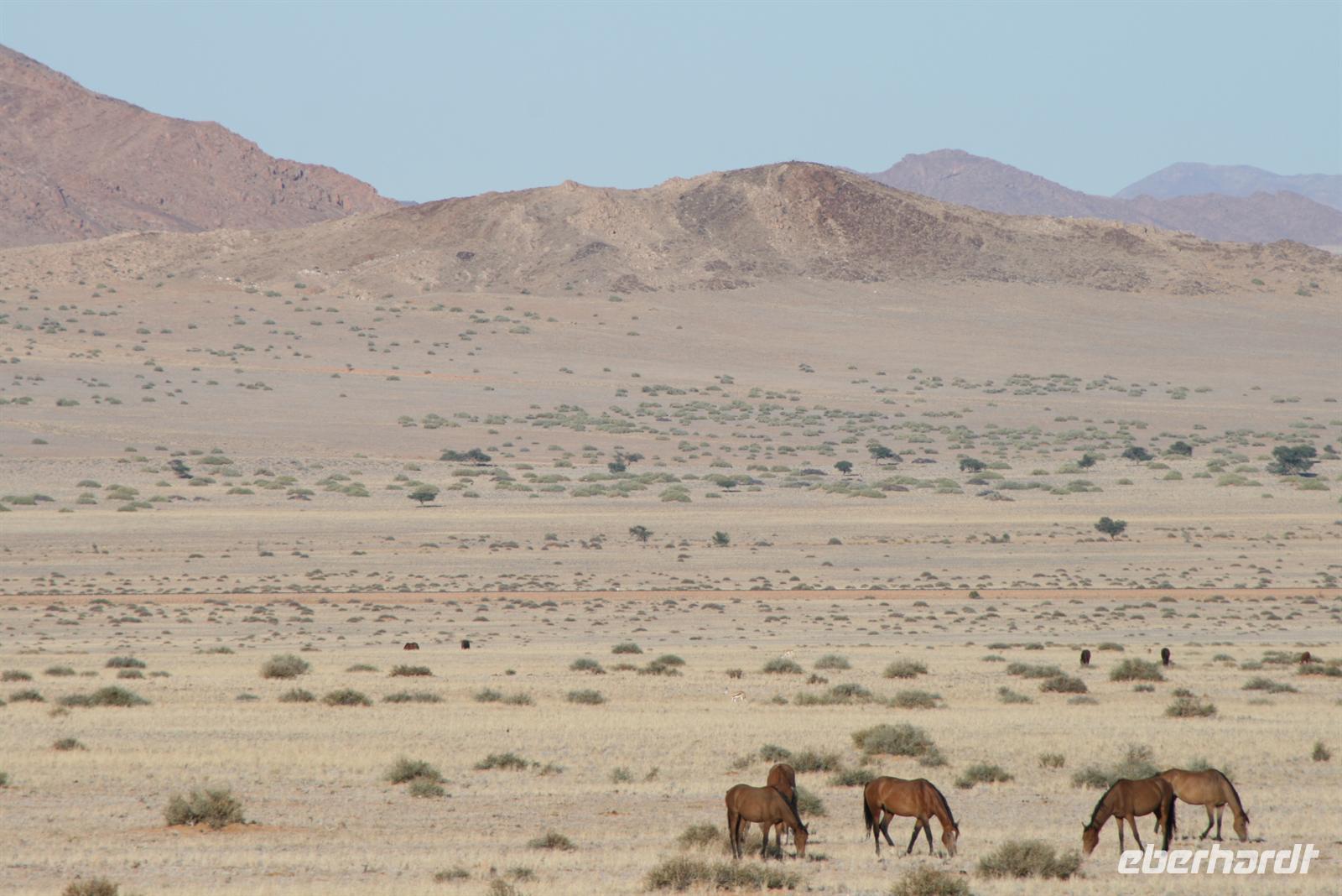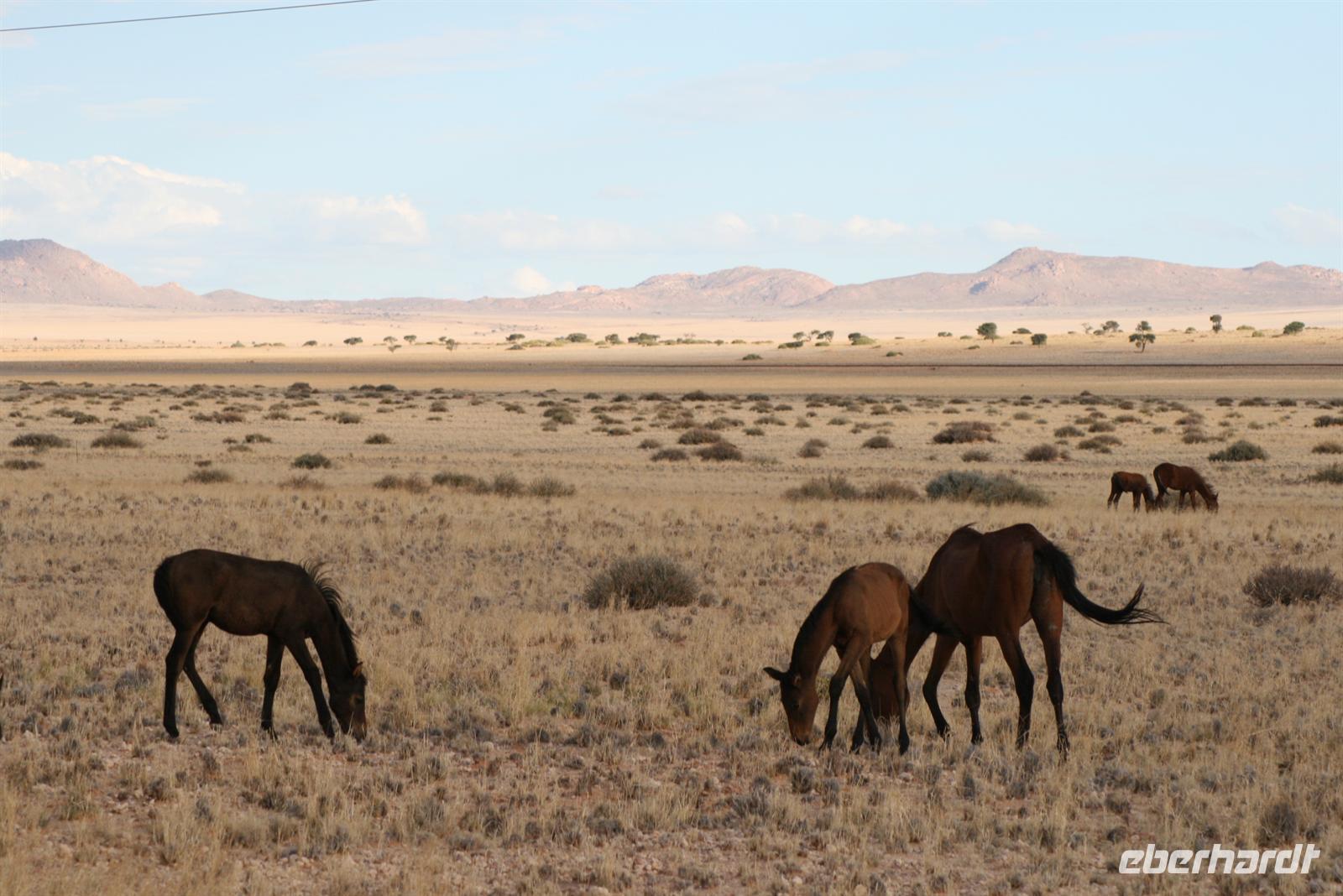 Nur wenige Minuten fahren wir an diesem morgen als sich schon der zweitgrößte Canon der Welt vor uns auftut. Zerklüftet vom Fish River erstreckt sich dieser kilometerweit durch den Boden. Wir genießen den Weitblick über den Canon, durch den sogar etwas Wasser fließt, was durch die Hitze nicht sehr oft vorkommt. Bevor wir weiter fahren, spazierten wir entlang des Abgrundes bis zum nächsten Aussichtspunkt. Durch die abwechslungsreiche Landschaft fahren wir bis zu einer Brücke über den Fischfluss, wo wir eine Rast einlegen. Von Nicos Geburtstag war noch für jeden ein Schluck eisgekühlter Amarula übrig - so ging es frisch gestärkt auf zu einem Fussmarsch über die Brücke. Am Nachmittag treffen wir dann in Aus ein. Das beschauliche Örtchen liegt inmitten der Ausberge und ist der kälteste Ort Namibias - hier kann man an „harten Wintertagen" auch schon mal Schnee sehen. Unsere Lodge liegt etwas außerhalb von Aus - in „Klein Aus" - und deutet schon in unzähligen Bildern und Dekoartikeln die Besonderheit der Region an, die wir am nächsten Tag hoffentlich sehen werden. Doch es gibt auch eine andere Besonderheit: ganz in der Nähe haben sich Deutsche Soldaten verschanzt, um sich 1914 gegen das Eindringen der Engländer zu wehren. Nun machten wir uns auf den Weg, um die steinernen Zeitzeugen zu entdecken. Über Stock und über Stein, durch die Felder und unter Ästen entlang, hoch auf die Felsen und steil wieder ab - doch von den Schanzen war weit und breit nichts zu sehen. Was nun? Umdrehen? Nein, wir bleiben optimistisch! Nach über einer Stunde (der Rundweg sollte nur eine Stunde gesamt gehen...) entdeckten wir, dann die ersten Mauerreste. Die untergehende Sonne ließ die Felsen auf unserem Rückweg glühen und am Ende war es eine schöne Wanderung die den Appetit auf das gute Abendessen anregte.