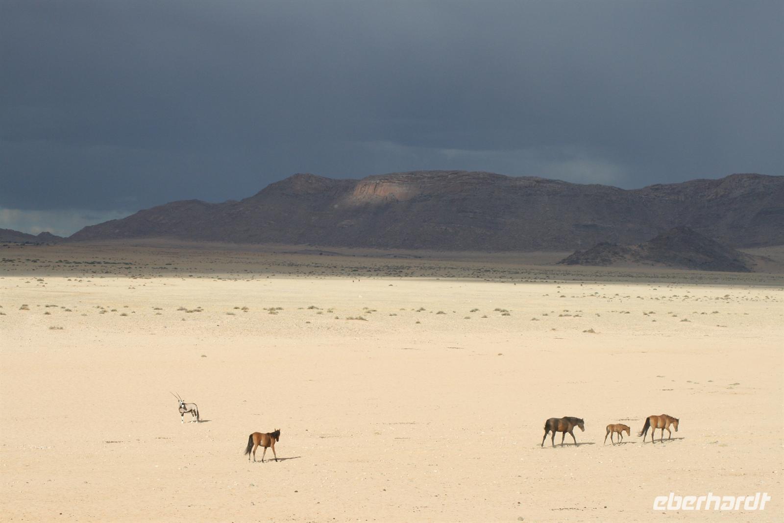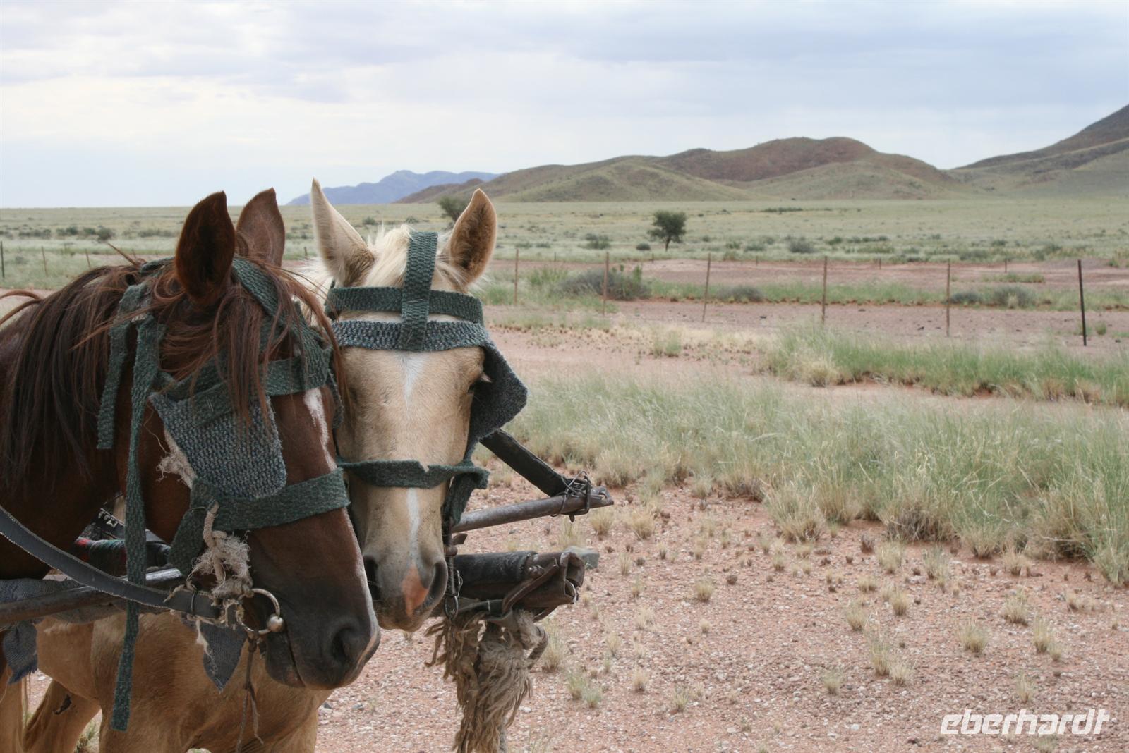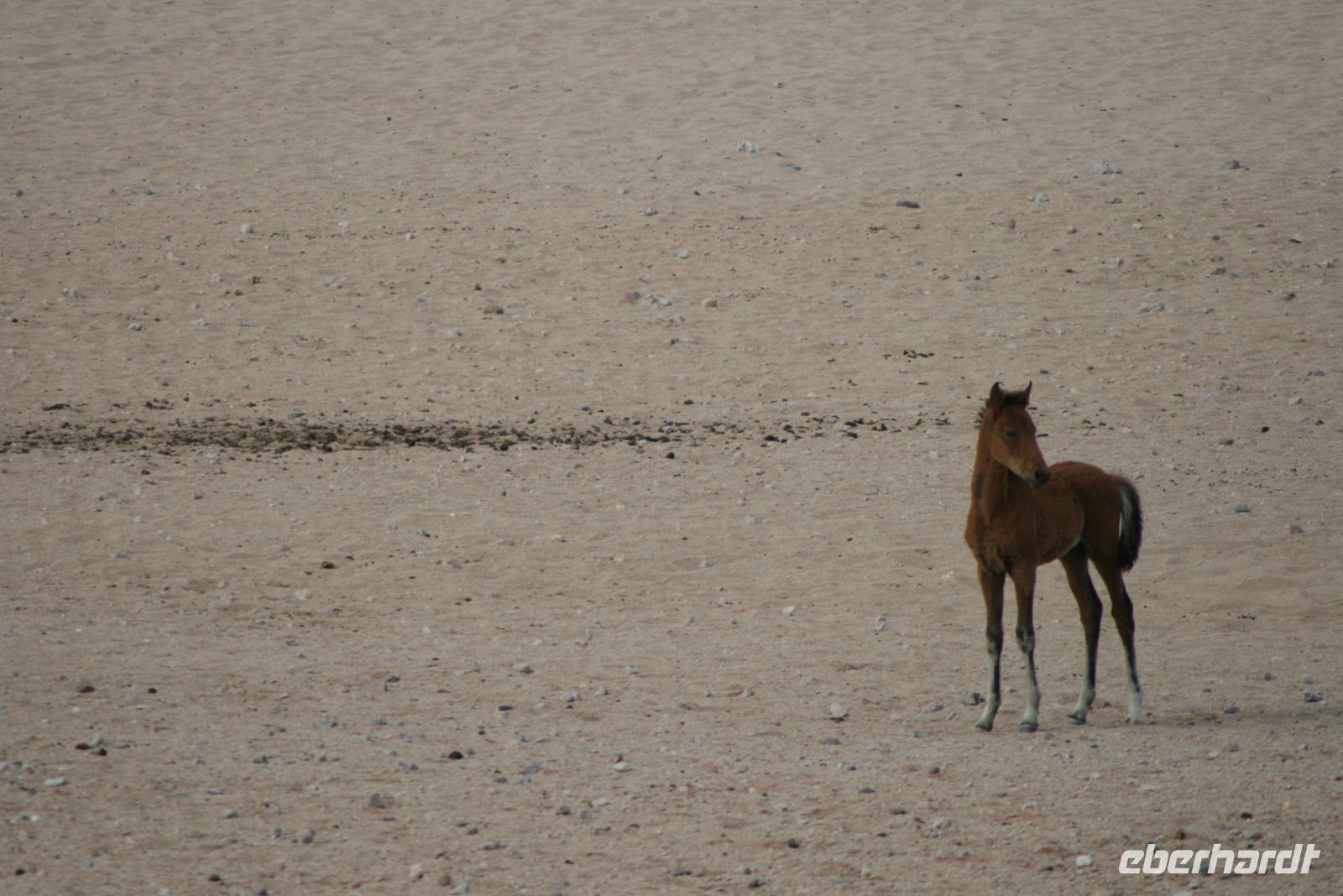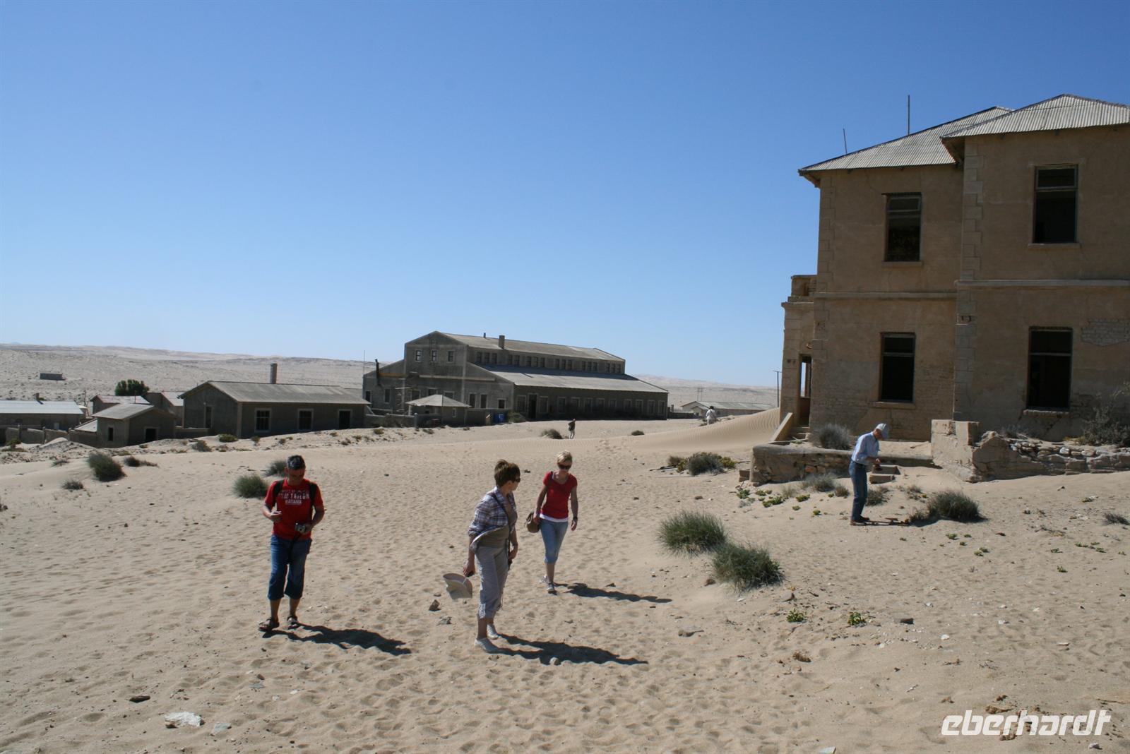 „Diamonds are a girls best friend" und es waren auch die allerbesten Freunde derer die um Koolmanskoop tonnenweise Diamanten fanden. Heute ist die Stadt eine pittoreske Geisterstadt in der man sich auf Abenteuersuche begeben kann. Mit dem „zahnlosen Joe" machten wir uns auf Entdeckungstour durch die verlassenen Häuser - das Hauser der Verkäuferin, die Eisfabrik, die Schlachterei, die Kegelbahn und der Gemeindesaal sind zeugen der prunkvollen Jahren inmitten der Diamanten im Sand. Auf eigene Faust irrten wir im Anschluss an die Führung durch das Haus des Buchhalters und des Minenbesitzers. In die alten Häuser dringt durch jede Ritze, durch jede Tür und jedes Fenster Sand, Sand, Sand. Auch das Krankenhaus und die Schule kann man besichtigen. Nur ein paar Kilometer von Koolmanskop entfernt, liegt die Hafenstadt Lüderitz. Nico zeigte uns bei einer Rundfahrt die wichtigsten Bauten der Stadt, wie die Felsenkirche auf dem Diamentenberg und das Goerkehaus. Gemeinsam spazierten wir noch durch die mit bunten Häusern gesäumte „Bergstraße", den Kirchweg und die „Bismarkstraße" bis zur Waterfront. Mit Blick auf das Meer genossen wir eine Tasse Kaffee oder eine Kleinigkeit zu essen, bevor wir Lüderitz wieder verließen. Auf dem Weg zum Diaz Kreuz fuhren wir auf die Halbinsel „Sharkisland", wo Tafeln an die deutschen Soldaten und Alfred Lüderitz gedenken. Er war es der Bismarck überzeugen konnte sich am Rennen um die Kolonialherrschaften Afrikas zu beteiligen und so Namibia unter deutscher Flagge zu führen. Entlang der Küste fahren wir zum Diaz Kreuz. Hier landete das erste Schiff in Namibia, woran mit einem steinernen Kreuz auf einem Felsen gedacht wird. Bei gefühlten 120 Km/h Windgeschwindigkeit haben wir den Fels erklommen. Auf dem Rückweg zu unserer Lodge hielten wir an einem Wasserloch, wo sich fantastisches abspielte. Es gibt in dieser Region einige wenige Wildpferde, die Einzigen in ganz Namibia und wir hatten das Glück die Tiere zu beobachten. Am Wasserloch tummelten sich Straußen, Wildpferde mit ihren Fohlen und auch Oryxantilopen versuchten an das Wasser zu gelangen. Für die Fohlen war ein Bad im kühlen Nass ein rießen Spaß und für uns erst Recht.