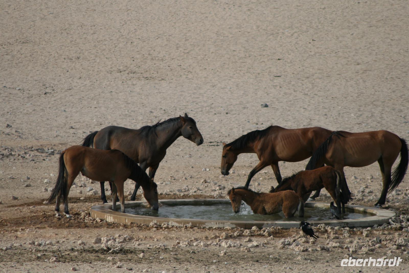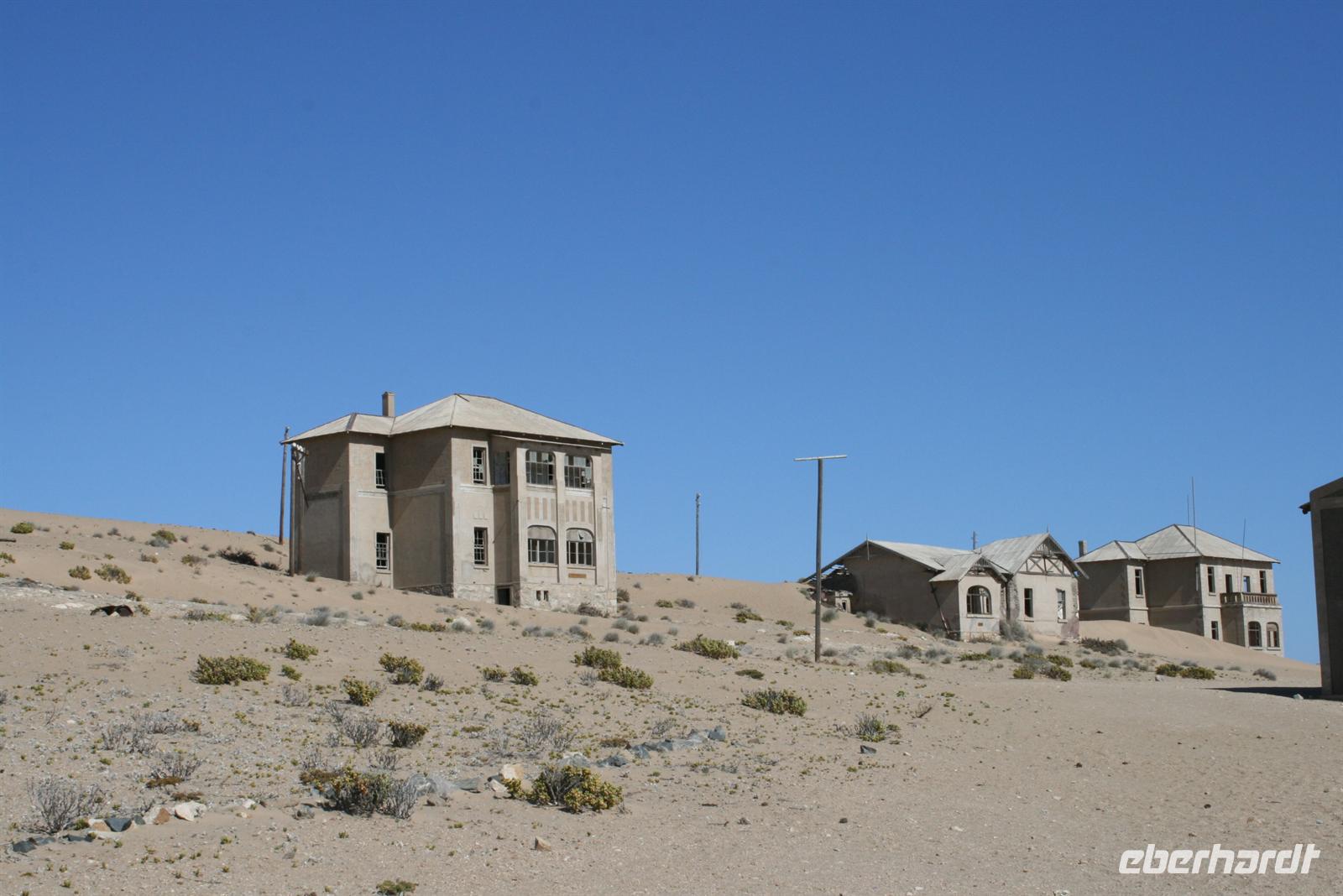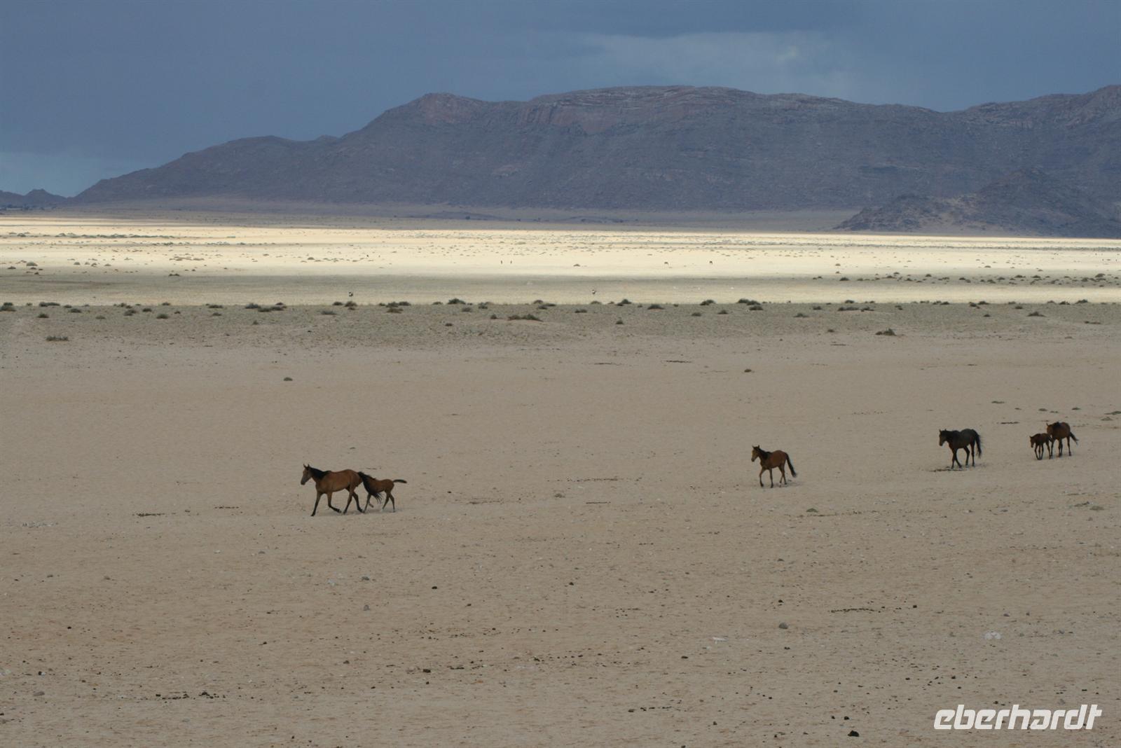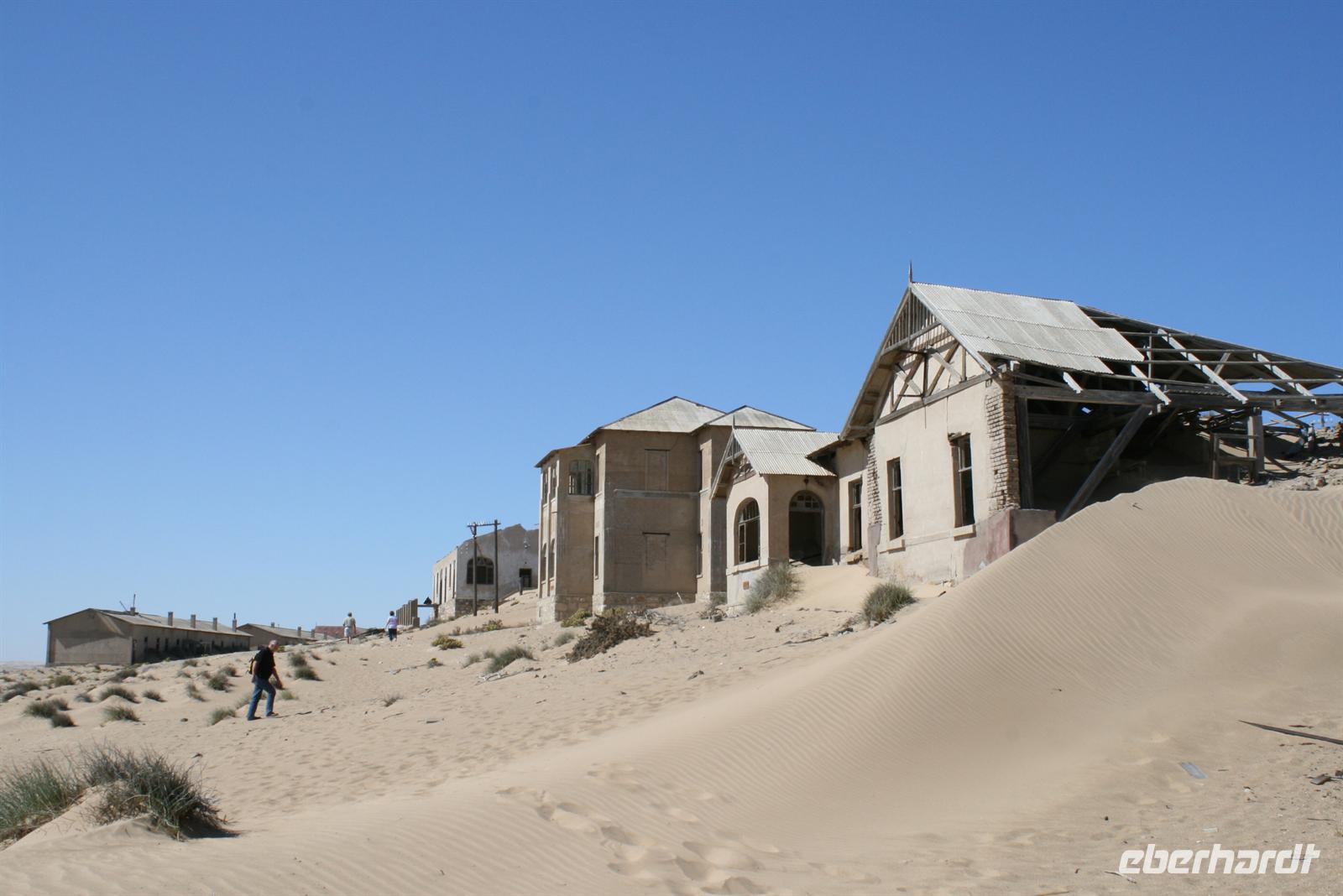„Diamonds are a girls best friend" und es waren auch die allerbesten Freunde derer die um Koolmanskoop tonnenweise Diamanten fanden. Heute ist die Stadt eine pittoreske Geisterstadt in der man sich auf Abenteuersuche begeben kann. Mit dem „zahnlosen Joe" machten wir uns auf Entdeckungstour durch die verlassenen Häuser - das Hauser der Verkäuferin, die Eisfabrik, die Schlachterei, die Kegelbahn und der Gemeindesaal sind zeugen der prunkvollen Jahren inmitten der Diamanten im Sand. Auf eigene Faust irrten wir im Anschluss an die Führung durch das Haus des Buchhalters und des Minenbesitzers. In die alten Häuser dringt durch jede Ritze, durch jede Tür und jedes Fenster Sand, Sand, Sand. Auch das Krankenhaus und die Schule kann man besichtigen. Nur ein paar Kilometer von Koolmanskop entfernt, liegt die Hafenstadt Lüderitz. Nico zeigte uns bei einer Rundfahrt die wichtigsten Bauten der Stadt, wie die Felsenkirche auf dem Diamentenberg und das Goerkehaus. Gemeinsam spazierten wir noch durch die mit bunten Häusern gesäumte „Bergstraße", den Kirchweg und die „Bismarkstraße" bis zur Waterfront. Mit Blick auf das Meer genossen wir eine Tasse Kaffee oder eine Kleinigkeit zu essen, bevor wir Lüderitz wieder verließen. Auf dem Weg zum Diaz Kreuz fuhren wir auf die Halbinsel „Sharkisland", wo Tafeln an die deutschen Soldaten und Alfred Lüderitz gedenken. Er war es der Bismarck überzeugen konnte sich am Rennen um die Kolonialherrschaften Afrikas zu beteiligen und so Namibia unter deutscher Flagge zu führen. Entlang der Küste fahren wir zum Diaz Kreuz. Hier landete das erste Schiff in Namibia, woran mit einem steinernen Kreuz auf einem Felsen gedacht wird. Bei gefühlten 120 Km/h Windgeschwindigkeit haben wir den Fels erklommen. Auf dem Rückweg zu unserer Lodge hielten wir an einem Wasserloch, wo sich fantastisches abspielte. Es gibt in dieser Region einige wenige Wildpferde, die Einzigen in ganz Namibia und wir hatten das Glück die Tiere zu beobachten. Am Wasserloch tummelten sich Straußen, Wildpferde mit ihren Fohlen und auch Oryxantilopen versuchten an das Wasser zu gelangen. Für die Fohlen war ein Bad im kühlen Nass ein rießen Spaß und für uns erst Recht.