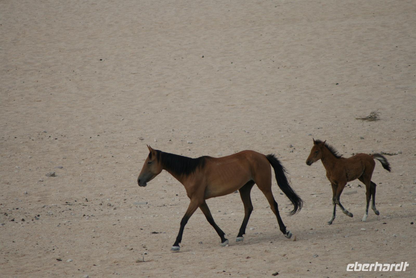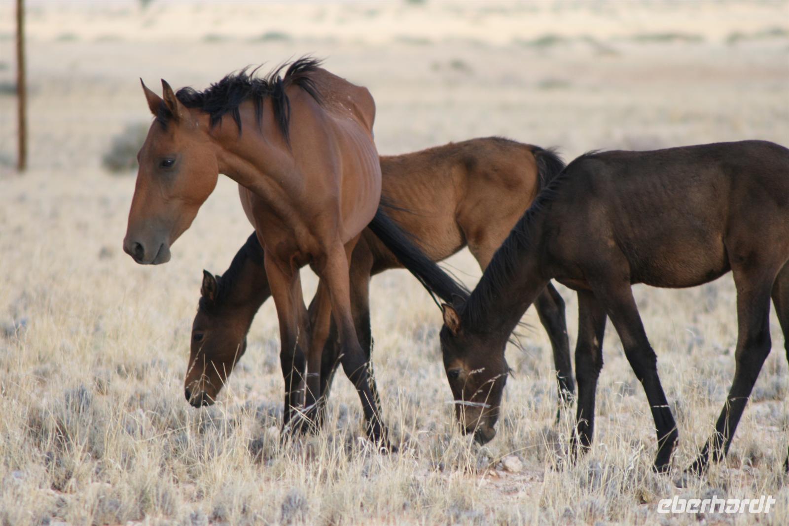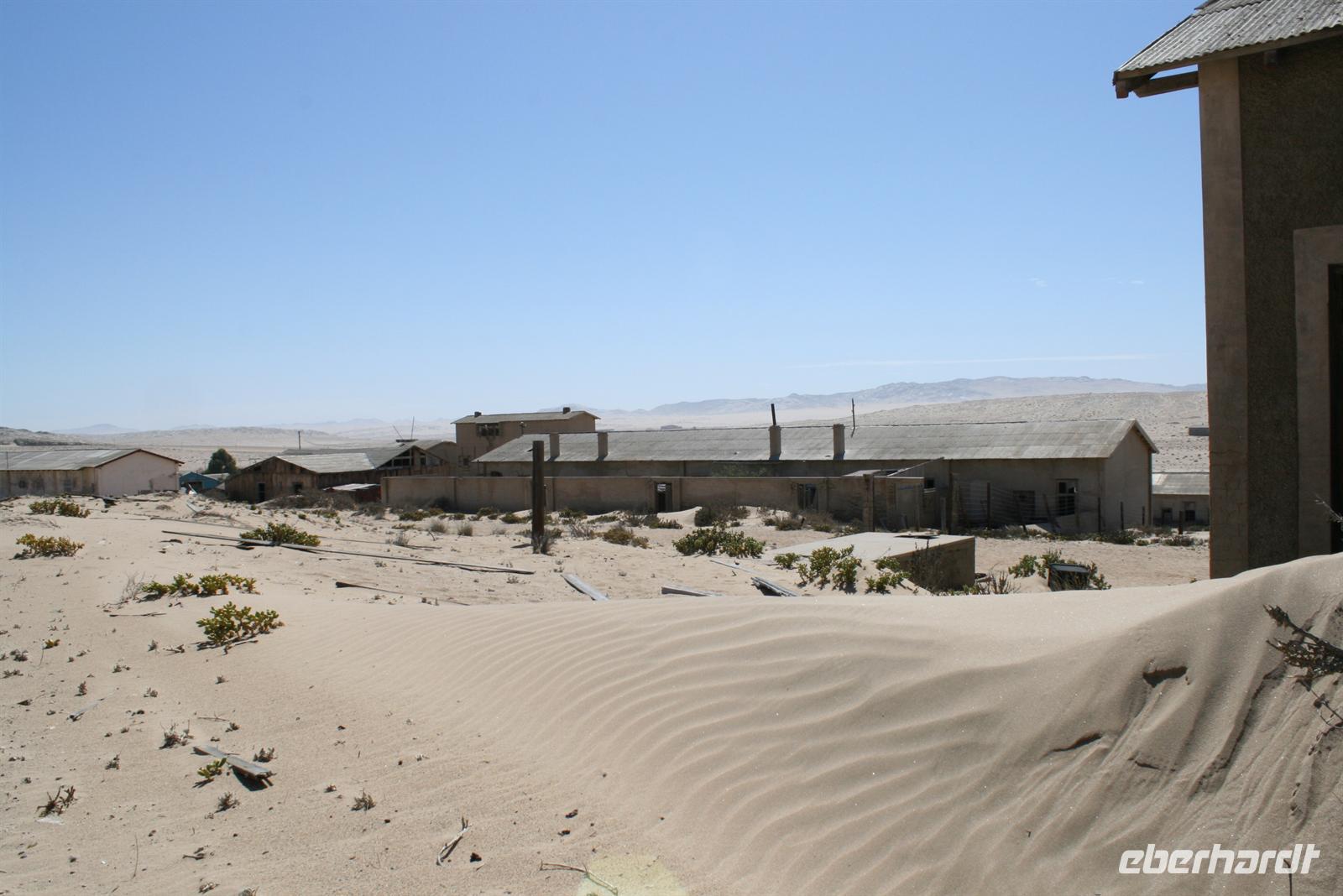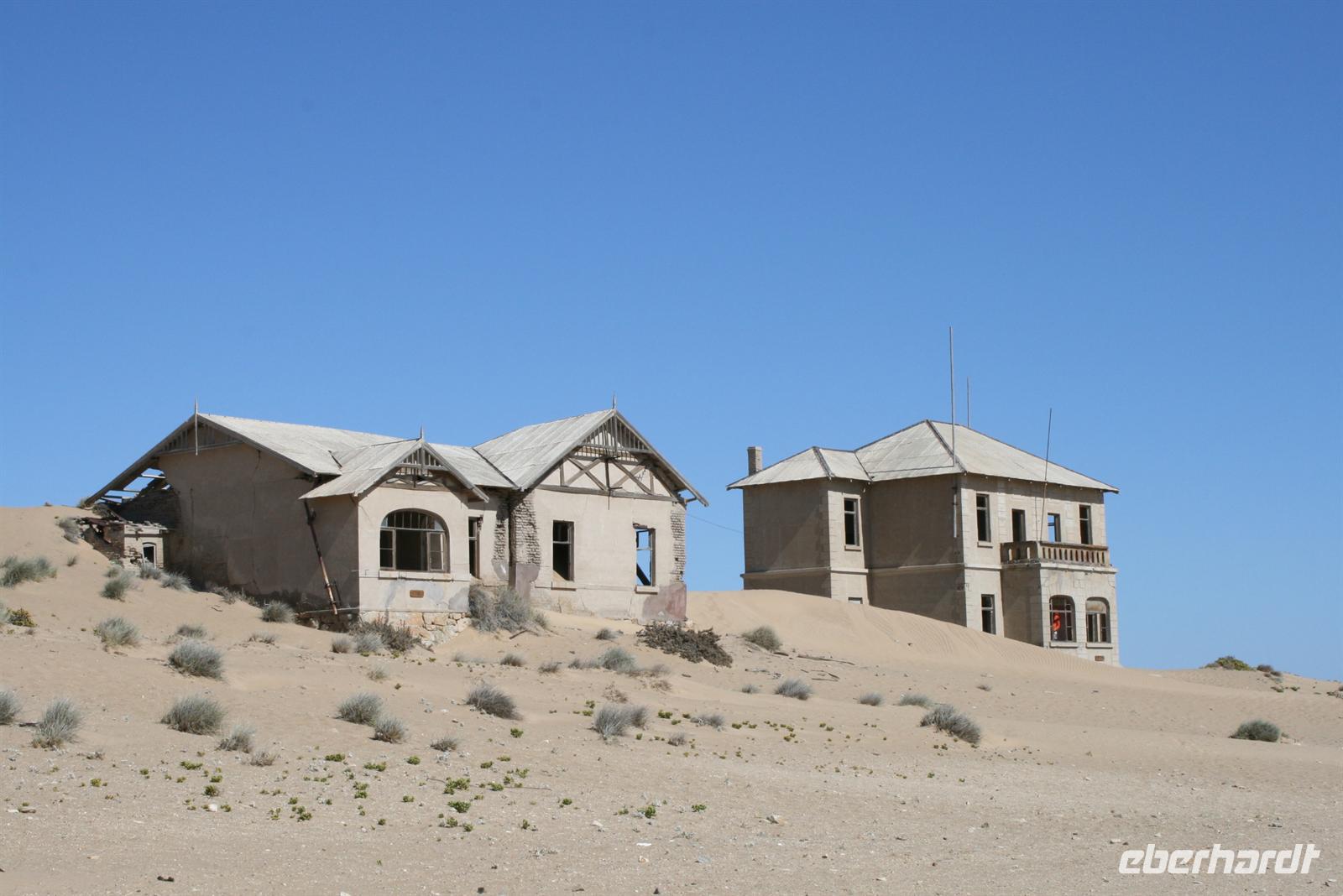 „Diamonds are a girls best friend" und es waren auch die allerbesten Freunde derer die um Koolmanskoop tonnenweise Diamanten fanden. Heute ist die Stadt eine pittoreske Geisterstadt in der man sich auf Abenteuersuche begeben kann. Mit dem „zahnlosen Joe" machten wir uns auf Entdeckungstour durch die verlassenen Häuser - das Hauser der Verkäuferin, die Eisfabrik, die Schlachterei, die Kegelbahn und der Gemeindesaal sind zeugen der prunkvollen Jahren inmitten der Diamanten im Sand. Auf eigene Faust irrten wir im Anschluss an die Führung durch das Haus des Buchhalters und des Minenbesitzers. In die alten Häuser dringt durch jede Ritze, durch jede Tür und jedes Fenster Sand, Sand, Sand. Auch das Krankenhaus und die Schule kann man besichtigen. Nur ein paar Kilometer von Koolmanskop entfernt, liegt die Hafenstadt Lüderitz. Nico zeigte uns bei einer Rundfahrt die wichtigsten Bauten der Stadt, wie die Felsenkirche auf dem Diamentenberg und das Goerkehaus. Gemeinsam spazierten wir noch durch die mit bunten Häusern gesäumte „Bergstraße", den Kirchweg und die „Bismarkstraße" bis zur Waterfront. Mit Blick auf das Meer genossen wir eine Tasse Kaffee oder eine Kleinigkeit zu essen, bevor wir Lüderitz wieder verließen. Auf dem Weg zum Diaz Kreuz fuhren wir auf die Halbinsel „Sharkisland", wo Tafeln an die deutschen Soldaten und Alfred Lüderitz gedenken. Er war es der Bismarck überzeugen konnte sich am Rennen um die Kolonialherrschaften Afrikas zu beteiligen und so Namibia unter deutscher Flagge zu führen. Entlang der Küste fahren wir zum Diaz Kreuz. Hier landete das erste Schiff in Namibia, woran mit einem steinernen Kreuz auf einem Felsen gedacht wird. Bei gefühlten 120 Km/h Windgeschwindigkeit haben wir den Fels erklommen. Auf dem Rückweg zu unserer Lodge hielten wir an einem Wasserloch, wo sich fantastisches abspielte. Es gibt in dieser Region einige wenige Wildpferde, die Einzigen in ganz Namibia und wir hatten das Glück die Tiere zu beobachten. Am Wasserloch tummelten sich Straußen, Wildpferde mit ihren Fohlen und auch Oryxantilopen versuchten an das Wasser zu gelangen. Für die Fohlen war ein Bad im kühlen Nass ein rießen Spaß und für uns erst Recht.