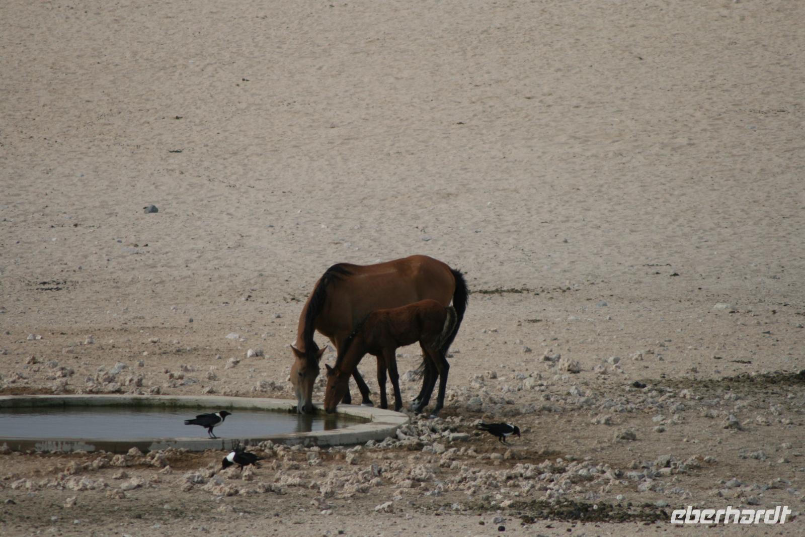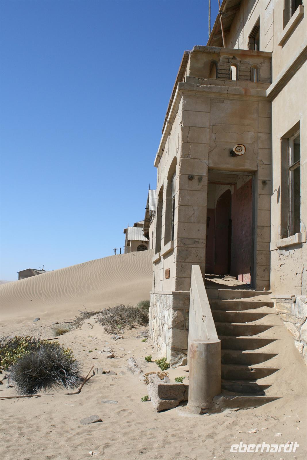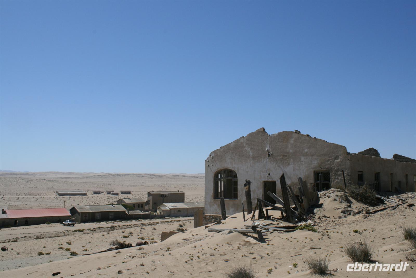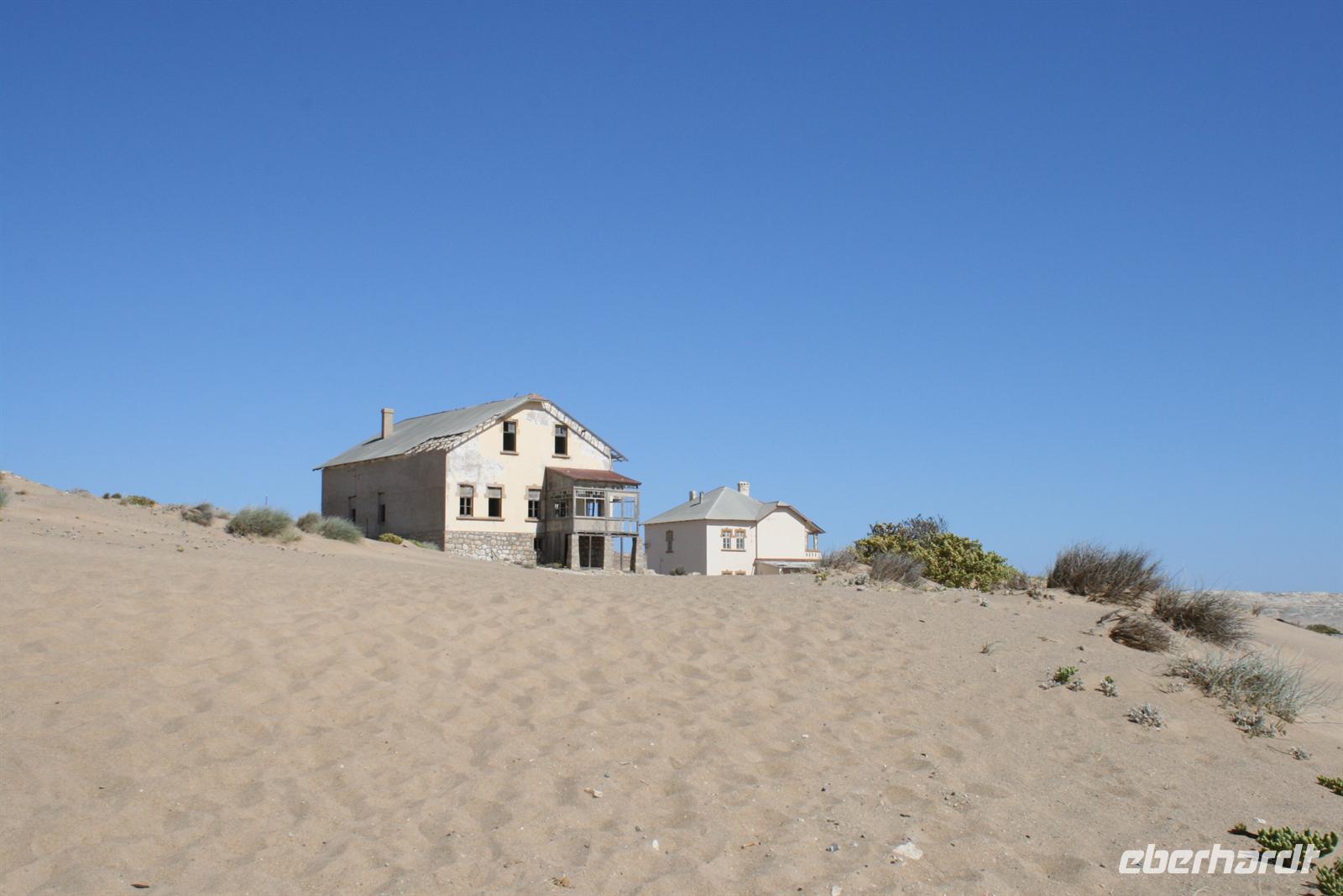 „Diamonds are a girls best friend" und es waren auch die allerbesten Freunde derer die um Koolmanskoop tonnenweise Diamanten fanden. Heute ist die Stadt eine pittoreske Geisterstadt in der man sich auf Abenteuersuche begeben kann. Mit dem „zahnlosen Joe" machten wir uns auf Entdeckungstour durch die verlassenen Häuser - das Hauser der Verkäuferin, die Eisfabrik, die Schlachterei, die Kegelbahn und der Gemeindesaal sind zeugen der prunkvollen Jahren inmitten der Diamanten im Sand. Auf eigene Faust irrten wir im Anschluss an die Führung durch das Haus des Buchhalters und des Minenbesitzers. In die alten Häuser dringt durch jede Ritze, durch jede Tür und jedes Fenster Sand, Sand, Sand. Auch das Krankenhaus und die Schule kann man besichtigen. Nur ein paar Kilometer von Koolmanskop entfernt, liegt die Hafenstadt Lüderitz. Nico zeigte uns bei einer Rundfahrt die wichtigsten Bauten der Stadt, wie die Felsenkirche auf dem Diamentenberg und das Goerkehaus. Gemeinsam spazierten wir noch durch die mit bunten Häusern gesäumte „Bergstraße", den Kirchweg und die „Bismarkstraße" bis zur Waterfront. Mit Blick auf das Meer genossen wir eine Tasse Kaffee oder eine Kleinigkeit zu essen, bevor wir Lüderitz wieder verließen. Auf dem Weg zum Diaz Kreuz fuhren wir auf die Halbinsel „Sharkisland", wo Tafeln an die deutschen Soldaten und Alfred Lüderitz gedenken. Er war es der Bismarck überzeugen konnte sich am Rennen um die Kolonialherrschaften Afrikas zu beteiligen und so Namibia unter deutscher Flagge zu führen. Entlang der Küste fahren wir zum Diaz Kreuz. Hier landete das erste Schiff in Namibia, woran mit einem steinernen Kreuz auf einem Felsen gedacht wird. Bei gefühlten 120 Km/h Windgeschwindigkeit haben wir den Fels erklommen. Auf dem Rückweg zu unserer Lodge hielten wir an einem Wasserloch, wo sich fantastisches abspielte. Es gibt in dieser Region einige wenige Wildpferde, die Einzigen in ganz Namibia und wir hatten das Glück die Tiere zu beobachten. Am Wasserloch tummelten sich Straußen, Wildpferde mit ihren Fohlen und auch Oryxantilopen versuchten an das Wasser zu gelangen. Für die Fohlen war ein Bad im kühlen Nass ein rießen Spaß und für uns erst Recht.
