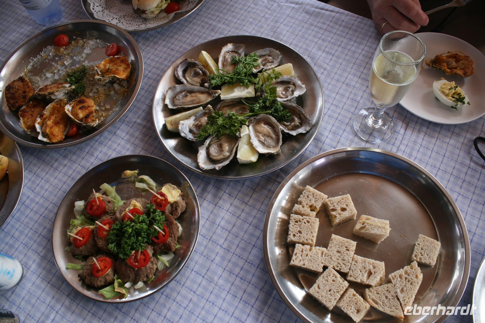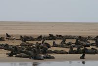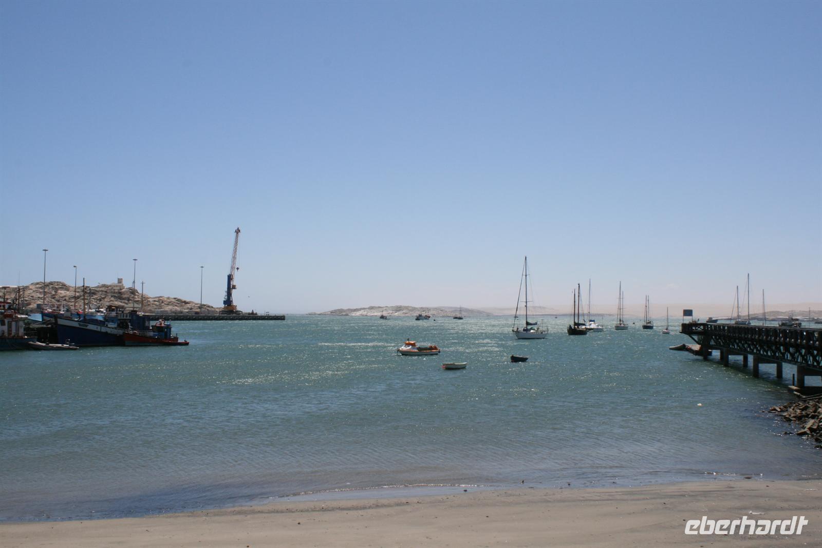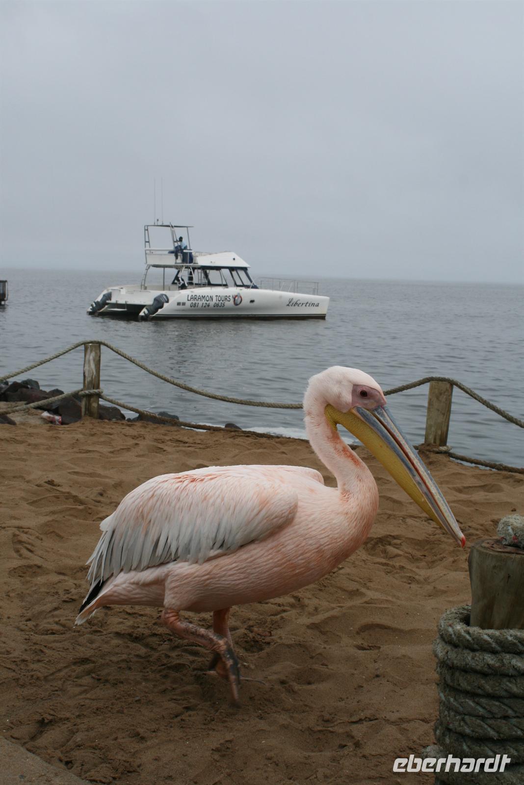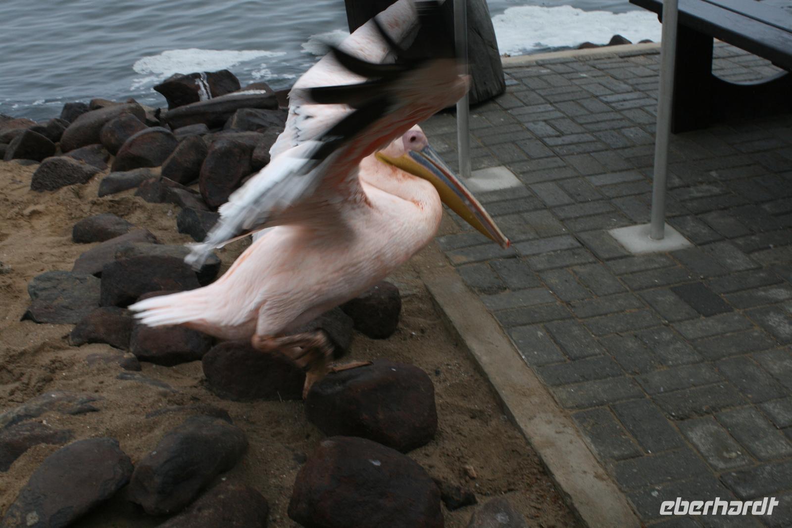 Nach dem Frühstück fuhren wir an der Küste entlang zur Walfischbucht. Dir Bucht wurde von den Engländern besetzt und wurde erst 2004 Namibia zugesprochen. Hier begrüßten uns schon interessierte Pelikane am Hafen der Bucht. Mit einem Katamaran legten wir von der Bucht in Richtung Pelikanisland los, als auch schon die erste Robbe das Schiff enterte. Die junge Robbe eroberte unser Herz im Sturm. Mit Fischen durfte man ihn füttern und allerlei Wissenswertes wurde uns vom Kapitän des Schiffes erzählt. Nach einigen Minuten erreichten wir die Spitze der Pelikanhalbinsel, wo hunderte von Robben an der Küste umher tollten. Nachdem wir die Tiere dabei beobachteten fuhren wir weiter an eine Stelle wo sich die Delfine tummelten. Eigentlich heißen diese Benguela Delfine, aber an diesem Tag hießen sie Da Da Da Delfine - „da ist einer..., da... und da" Während wir versuchen die Delfine vor die Kameralinse zu bekommen, wurde im hinteren Teil des Katamarans schon fleißig aufgetischt. Ein üppiges Buffet mit frischen und gebackenen Austern, Häppchen aus Fisch, Frikadellen, belegten Brötchen und vielem mehr wurde für uns hergerichtet. Etwas zaghaft und nur mit antrieb des Kapitäns probierten einige von uns die eiweisreiche Delikatesse „Austern". Bei einem Gläschen Sekt genossen wir die verbleibenden Minuten auf See. Am Nachmittag gab es dann genügend Zeit uns in Swakopmund umzusehen, das berühmte Café Anton zu besuchen, Souvenirs zu kaufen oder einfach durch die Straßen zu schlendern.
