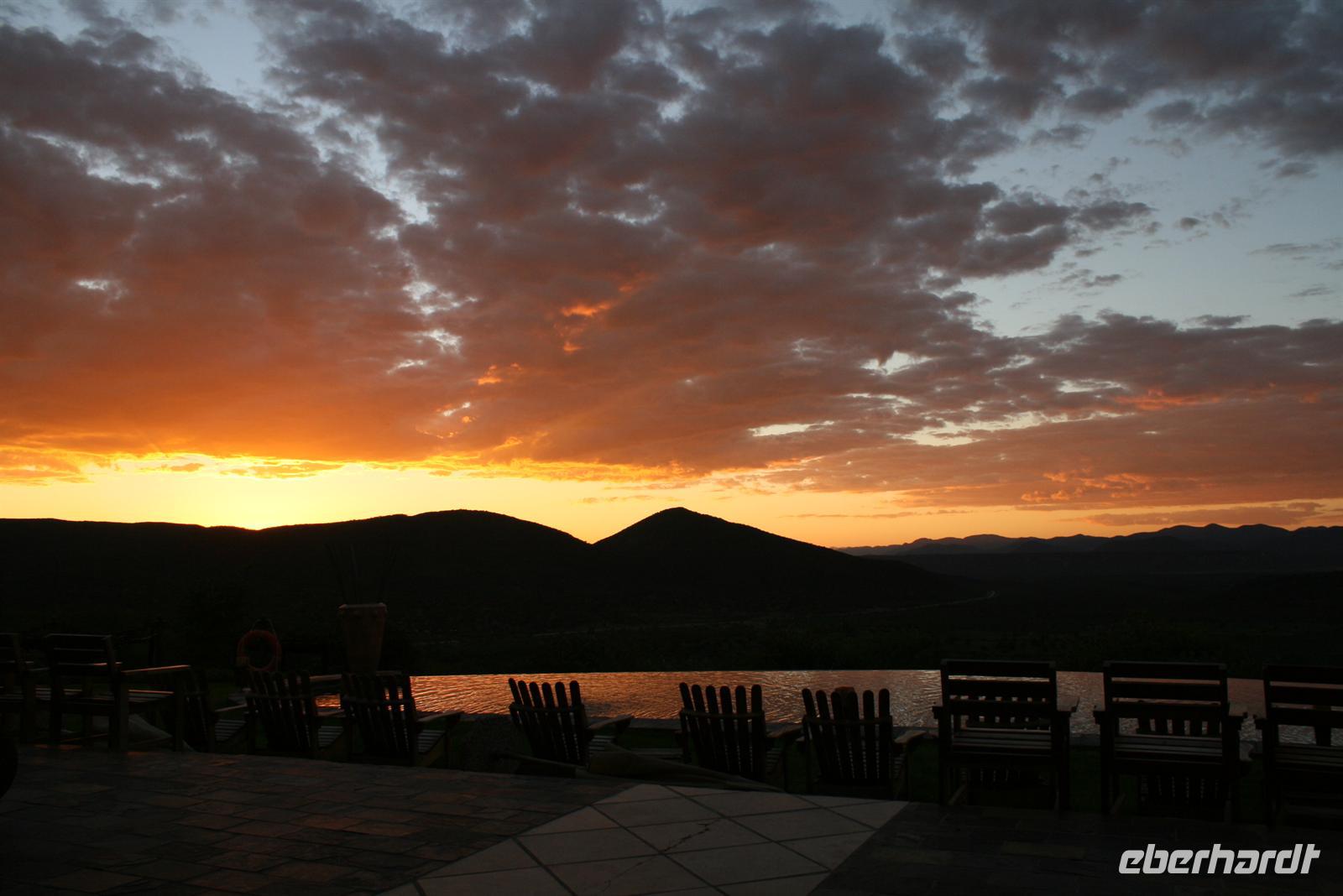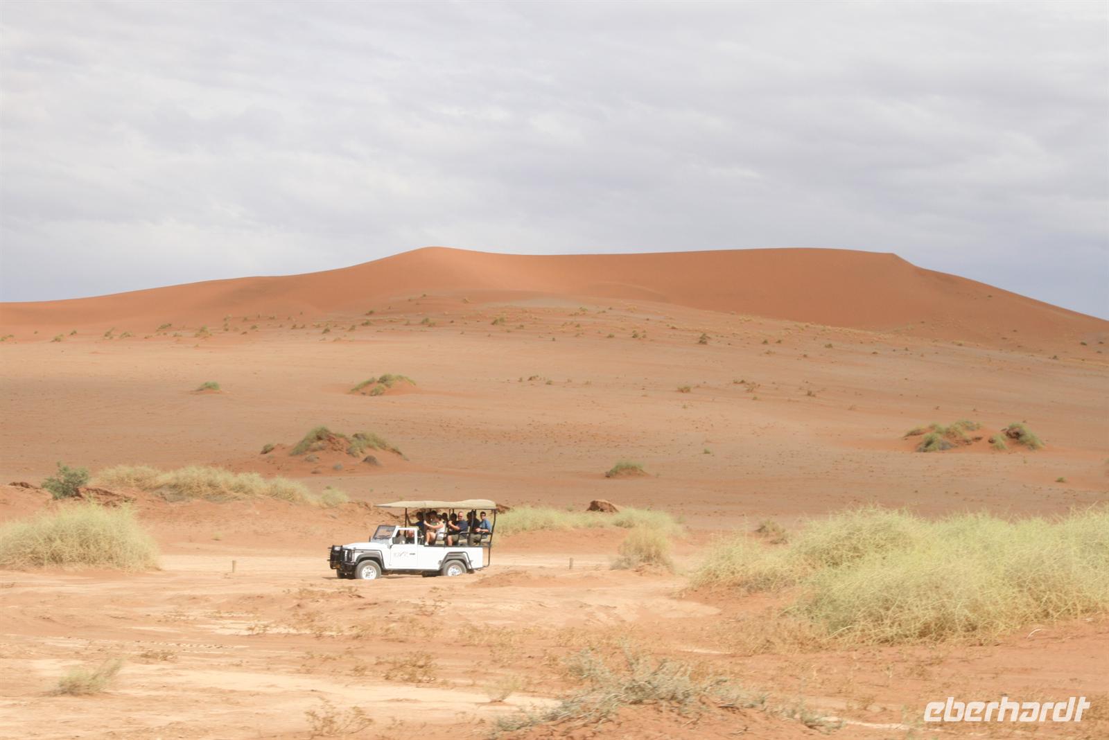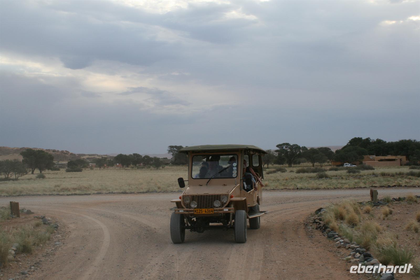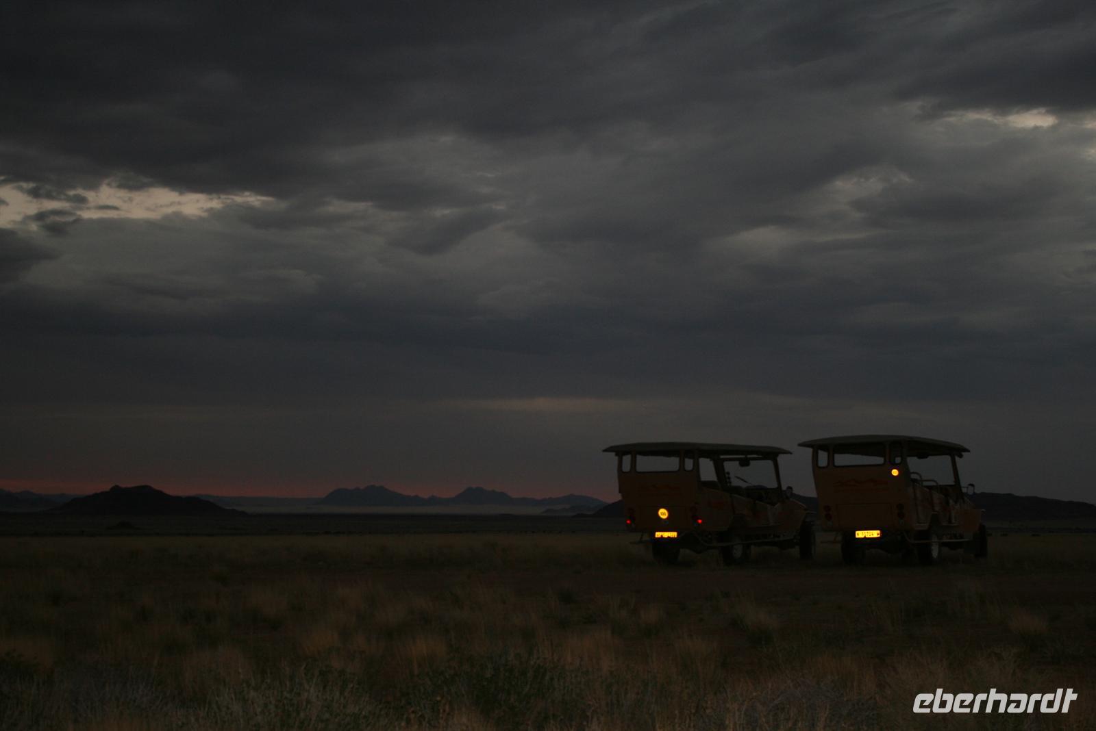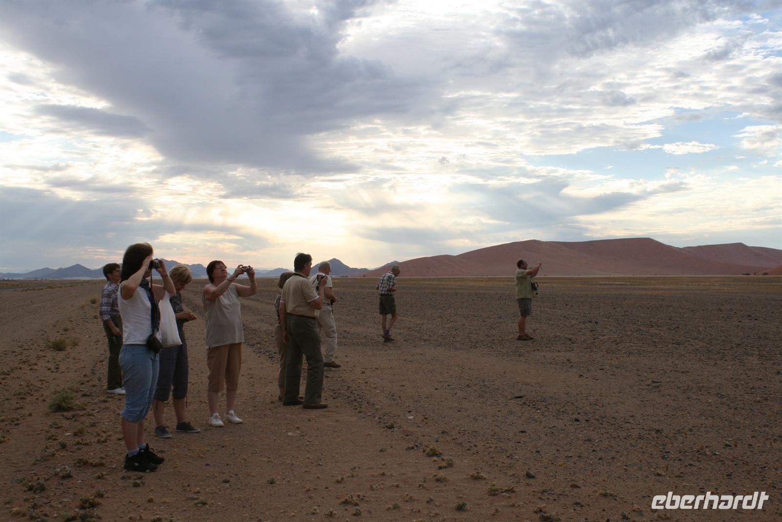Heute haben wir wieder eine weite Strecke vor uns, doch durch die fesselnde Weite, einige Wildtiere die unseren Weg streifen und genügend Kaffeepausen ist auch dieses Strecke gar nicht so lang wie es scheint. Unseren ersten Stopp legten wir inmitten des nichts ein. Naja nichts ist nicht ganz richtig - ein Deutscher liess sich hier ein kleines beschauliches Schlösschen, das man heute noch besuchen kann, errichten. Der Anblick ist schon skurril - so ein Schlösschen inmitten der unendlichen Weite. Ein paar Kilometer machten wir Mittagsrast an einer kleinen Tankstelle, bevor wir weiter durch einen privaten Naturpark fuhren. Nach einigen Kilometern fahrt erblickten wir eine Herde Tiere. Es waren Bergzebras die uns in Aufregung versetzten, stolz und mit besonders schöner Zeichnung. Am Nachmittag erreichten wir dann die „Sossusvlei Lodge", unseren Ausgangspunkt für die Sonnenuntergangsfahrt. Voller Hoffnung, dass sich die Wolken am Himmel doch noch verflüchtigen, fuhren wir in zwei offenen Jeeps in das Hinterland in Richtung Berge. Auf der Fahrt erspähten wir Erdhörnchen im gelben Wüstengras. Unsere Fahrer brachten uns an einen Felsen mit Felsmalerei der Buschmänner. Vor tausenden von Jahren zeichneten hier die Buschmänner Tiere an die Felsen, schliefen unter Steinen und sammelten Pflanzen in der Umgebung. Anschließend überraschte man uns mit Sekt und kleinen Häppchen während des Sonnenunterganges bzw. während es dunkel wurde - dem Sonnenuntergang kamen uns ein paar Wolken in den Weg. Am Abend erreichten wir die Namib Desert Lodge.