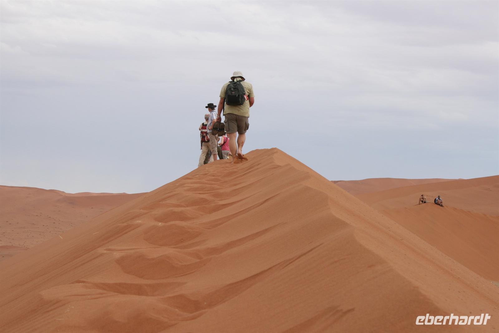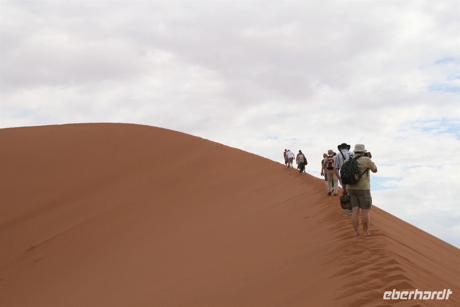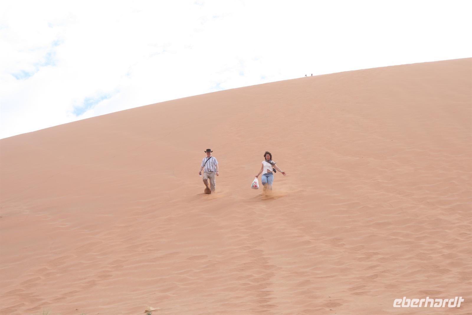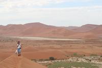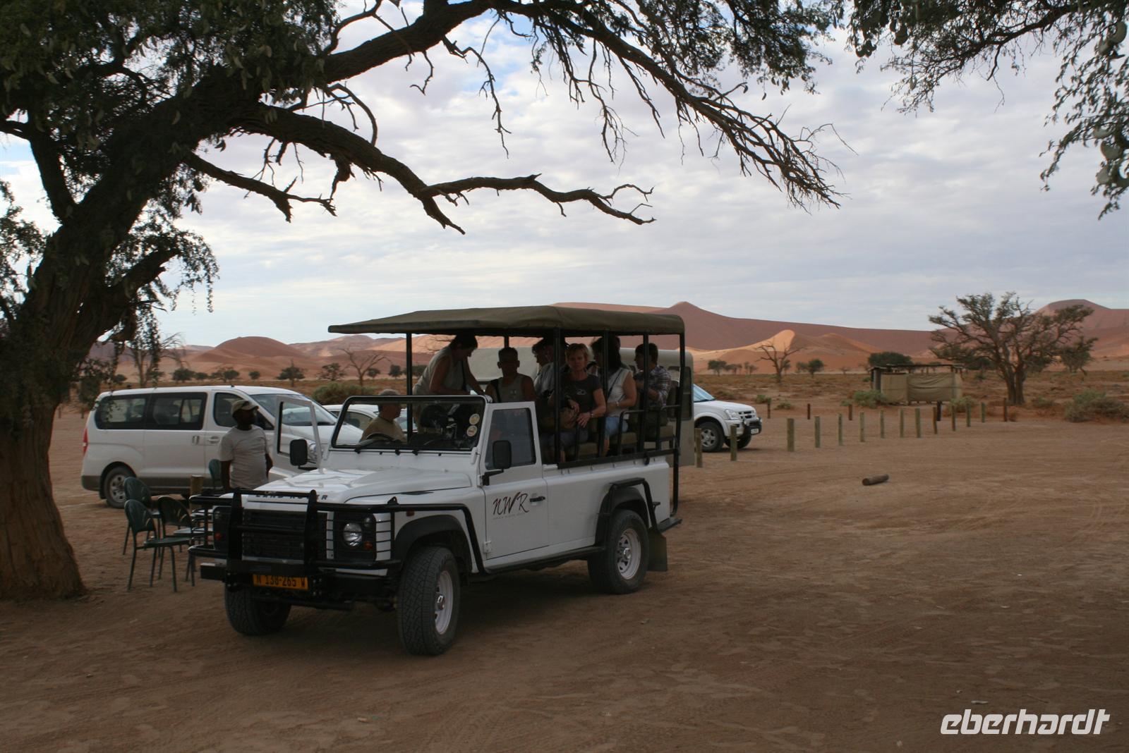 Um nicht in der prallen Mittagssonne zu schmoren ging es heute schon zeitig los. Bei Sonnenaufgang sind wir nach knapp einer Dreiviertelstunde Fahrt am Eingang zum Sossusvlei angekommen. Vom Eingang aus fahren wir noch ein paar Kilometer durch die hübsche Dünenlandschaft bis zum Parkplatz der Allradfahrzeuge. Ab hier ist der Weg sandig und beschwerlich zu fahren, „Rumpel die Pumpel" geht es durch den Sand. Mitten im Sossusvlei halten wir an, um unter Bäumen unser Lunchpaket auszupacken - Yoghurt, Sandwiches, Obst und Saft - an alles wurde gedacht. Gut gestärkt ging der Aufstieg los, einige Meter im Gänsemarsch hoch auf die Dünen. Der Weg war zuerst beschwerlich, zwei Schritte vor, einen zurück, mit ein bisschen Übung ging es dann aber leichter Schritt um Schritt düneauf. Oben angekommen ließ der schöne Rundumblick über die Dünenlandschaft die Anstrengung vergessen. Im Sauseschritt rannten wir himmelhochjauchtzend die Düne hinab. Der rote Sand zwischen unseren Füssen fühlte sich herrlich an. Anschließend fuhren wir zum Canon um diesen hinabzusteigen. Am Nachmittag erfreuten sich fast alle an der herrlichen Poolanlage des Lodge. Einige von uns gingen noch auf Erkundungstour zu den versteinerten Dünen, an denen die „Namib Desert Lodge" lag. Nach der kurzen Wanderung entlang des Lehrpfades bzw. nach der freien Zeit kamen wir wieder zum Abendessen zusammen. Typische Gerichte wie Bogote und Butternuss wurden am Buffet für uns bereit gestellt.
