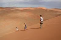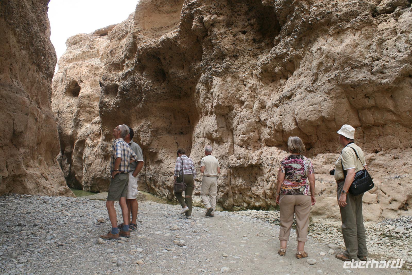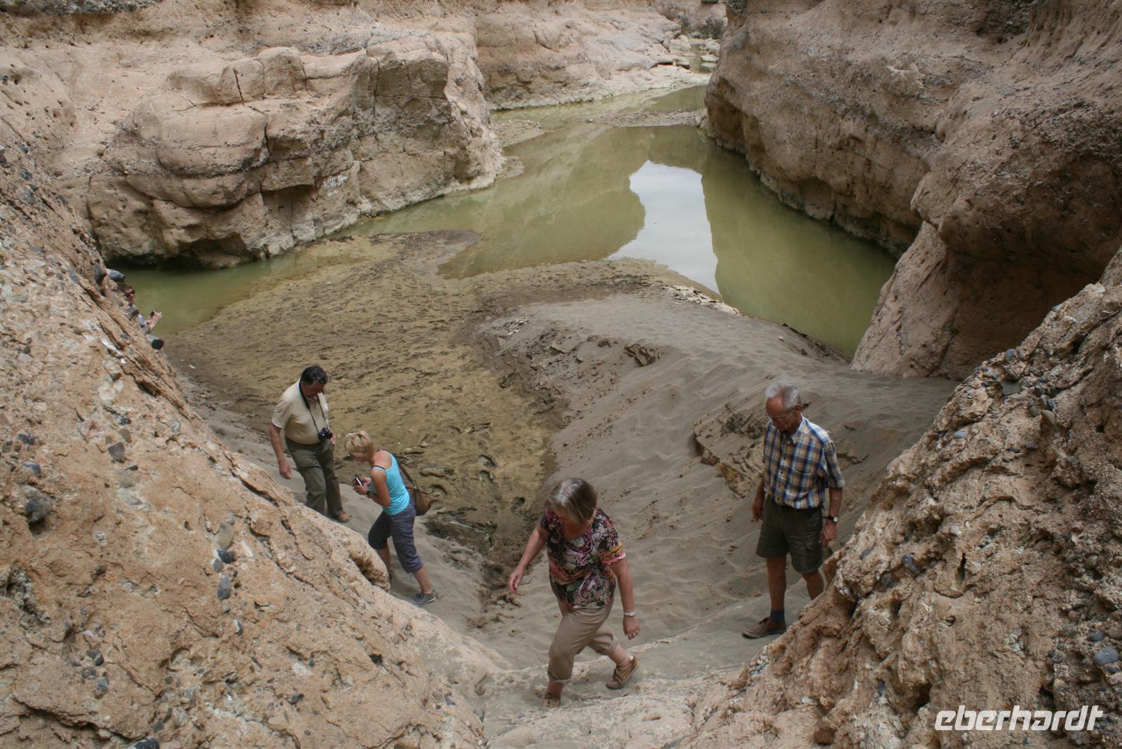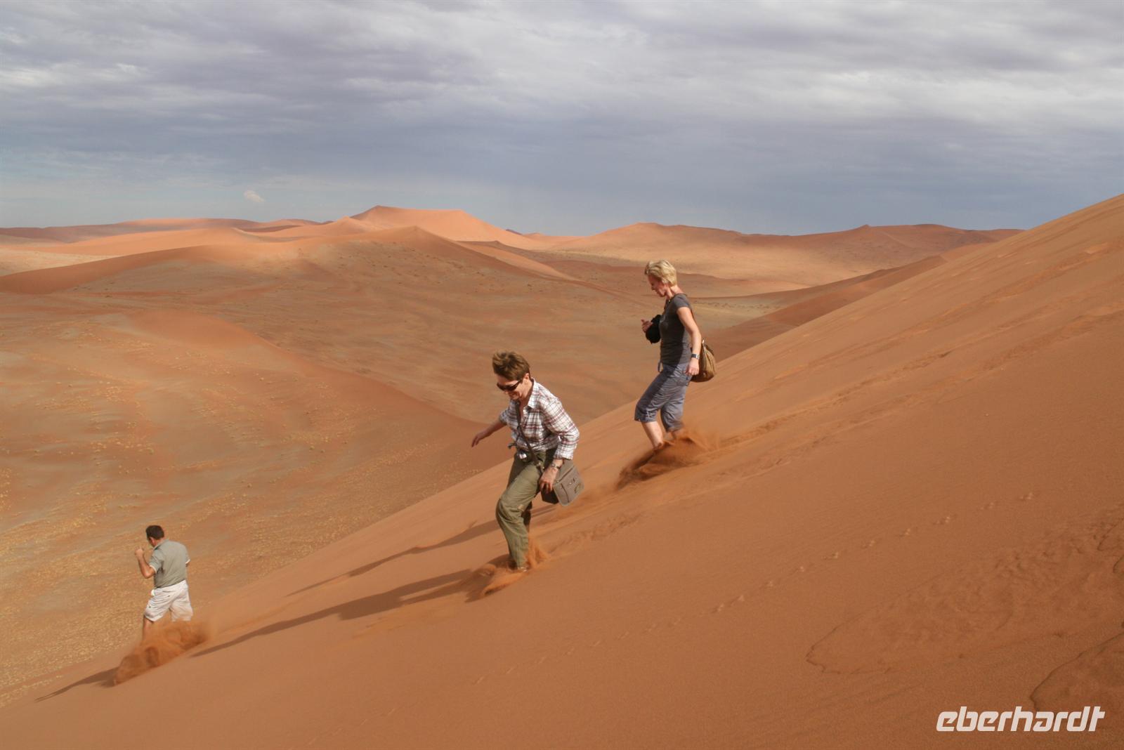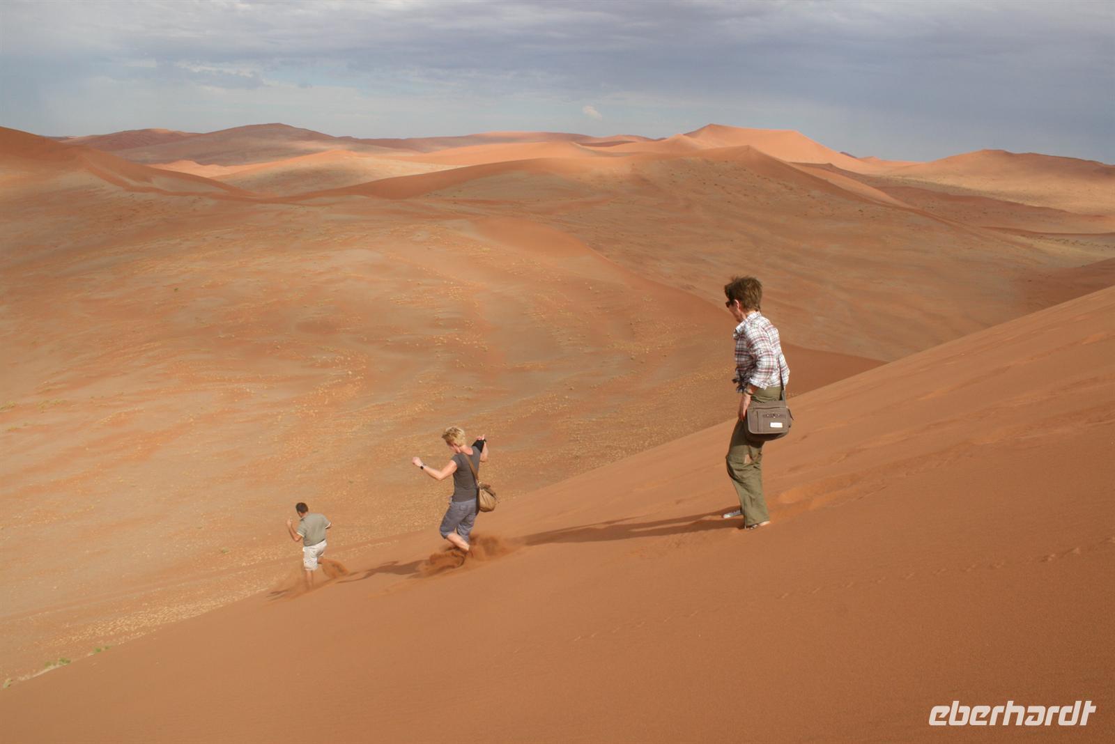 Um nicht in der prallen Mittagssonne zu schmoren ging es heute schon zeitig los. Bei Sonnenaufgang sind wir nach knapp einer Dreiviertelstunde Fahrt am Eingang zum Sossusvlei angekommen. Vom Eingang aus fahren wir noch ein paar Kilometer durch die hübsche Dünenlandschaft bis zum Parkplatz der Allradfahrzeuge. Ab hier ist der Weg sandig und beschwerlich zu fahren, „Rumpel die Pumpel" geht es durch den Sand. Mitten im Sossusvlei halten wir an, um unter Bäumen unser Lunchpaket auszupacken - Yoghurt, Sandwiches, Obst und Saft - an alles wurde gedacht. Gut gestärkt ging der Aufstieg los, einige Meter im Gänsemarsch hoch auf die Dünen. Der Weg war zuerst beschwerlich, zwei Schritte vor, einen zurück, mit ein bisschen Übung ging es dann aber leichter Schritt um Schritt düneauf. Oben angekommen ließ der schöne Rundumblick über die Dünenlandschaft die Anstrengung vergessen. Im Sauseschritt rannten wir himmelhochjauchtzend die Düne hinab. Der rote Sand zwischen unseren Füssen fühlte sich herrlich an. Anschließend fuhren wir zum Canon um diesen hinabzusteigen. Am Nachmittag erfreuten sich fast alle an der herrlichen Poolanlage des Lodge. Einige von uns gingen noch auf Erkundungstour zu den versteinerten Dünen, an denen die „Namib Desert Lodge" lag. Nach der kurzen Wanderung entlang des Lehrpfades bzw. nach der freien Zeit kamen wir wieder zum Abendessen zusammen. Typische Gerichte wie Bogote und Butternuss wurden am Buffet für uns bereit gestellt.
