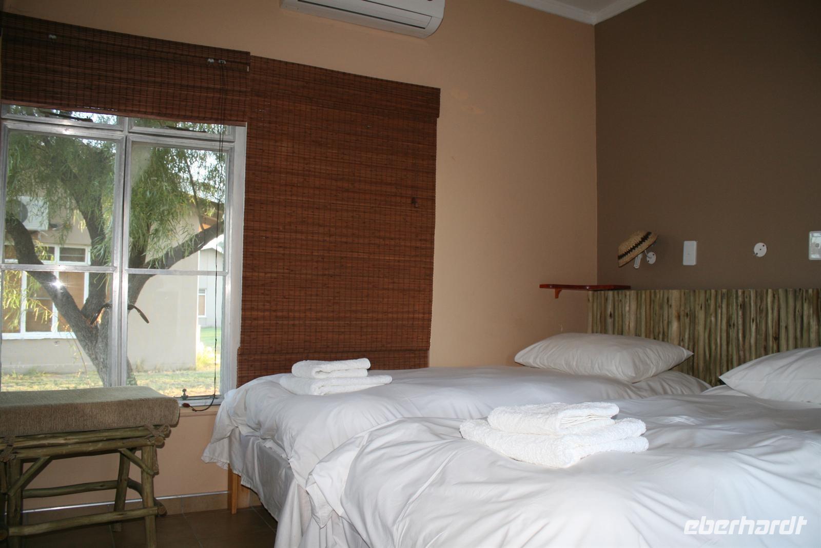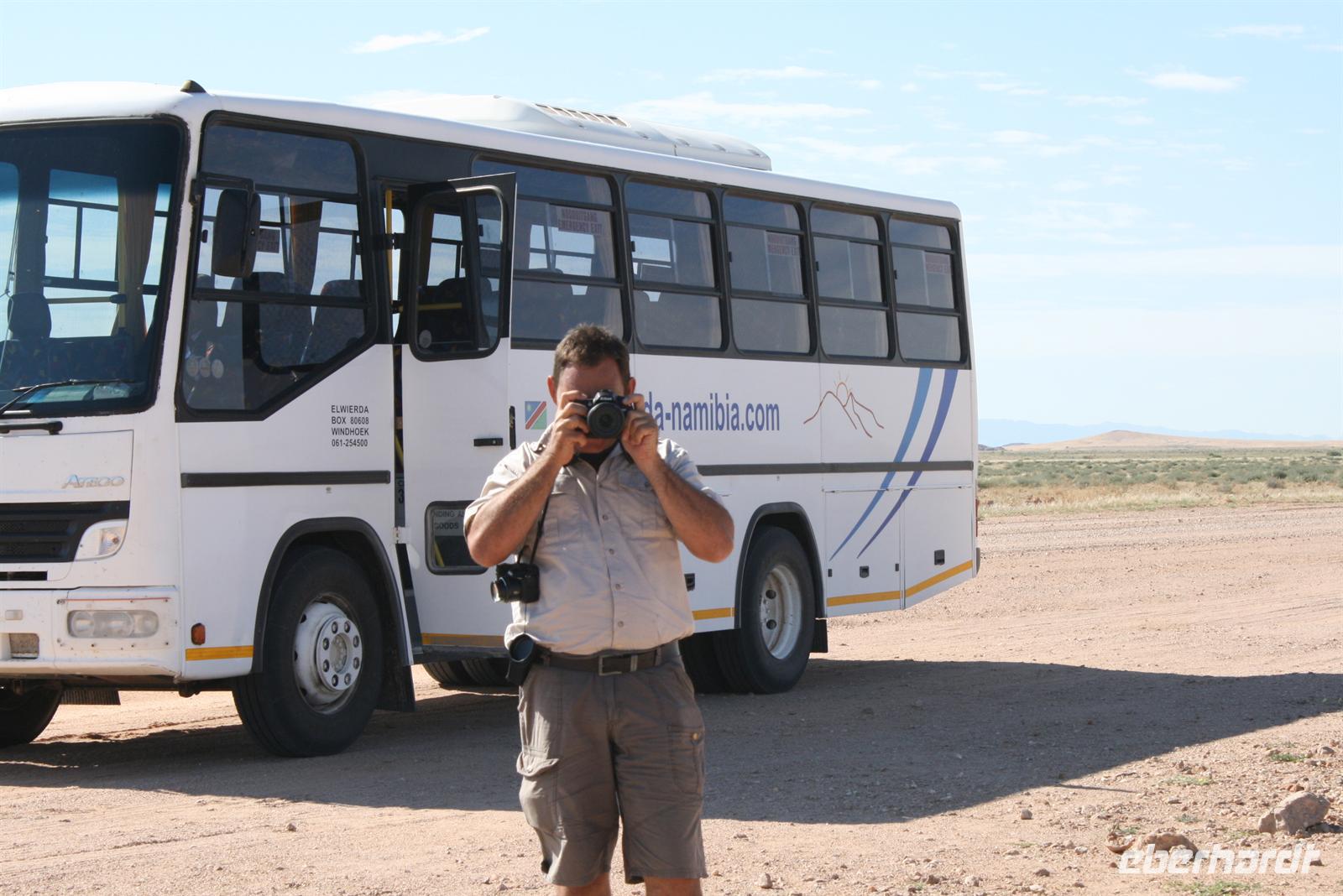 Am Morgen landeten wir in Südafrika und ohne eine Minute zu vergeuden, ging es an das nächste Abfluggate. Der Hinweis „Gate closed" und zwei aufgeregte Südafrikanerinnen haben zwar erst ein wenig innerliche Unruhe ausgelöst, als wir dann aber im Flugzeug saßen nahmen wir die Sache nicht mehr so Ernst. In nur zwei Stunden Entfernung liegt das Land der ewigen Weiten, alles andere war da Nebensache. In Windhoek angekommen mussten wir uns schon etwas über den winzigen Flughafen der Landeshauptstadt wundern - nur die afrikanische Lässigkeit bei der Sicherheitskontrolle wunderte uns jedoch nicht mehr. Nachdem wir alle Koffer („glücklicherweise") vom Band geholt hatten empfing uns Nico - unser Guide für die nächsten 19 Tage. Nico ist ein Allrounder - Reiseleiter und Busfahrer in einem. Nun ging es ab in die ewigen Weiten Namibias - 450 Kilometer lagen vor uns. Auf der Landstrasse ging es Richtung Rehobot, der Stadt indem die vor 100 Jahren aus Südafrika geflohenen Mischlinge aus Europäern und Afrikanern heute noch leben. Bunte Häuser, die im ganzen Land bekannt sind, zieren die Strasse der Kleinstadt. Die nächsten 90 Kilometer war dann ersteinmal Savanne und ewige Weite, bis am rechten Straßenrand eine kleine Siedlung auftauchte. Hier holten wir uns neue Kraft und beobachteten bereits die ersten Tiere. Nach Mariental, einer Kleinstadt deren Hauptsehenswürdigkeiten ein Café und eine Tankstelle sind, ging es Richtung Osten, wo auch bald die asphaltierte Straße in einen Schotterweg überging. An Schotterwege müssen wir uns gewöhnen, denn 80% unserer Route führt uns auf diesen durch das Land, glücklicherweise sind die aber meist besser in Schuss als so manche deutsche Nebenstraße. Nachdem die Sonne untergegangen war erreichten wir die „Auob Lodge" am Rande der Kalahari, wo wir unsere geräumigen Zimmer beziehen konnten. Am Abend servierte man uns landestypisches: Springbockgulasch und andere Leckereien. Die Kindertanzgruppe aus einem benachbarten Dorf gab auch dem letzten Reisegast mit Gesang und Tanz das Gefühl in Afrika angekommen zu sein.