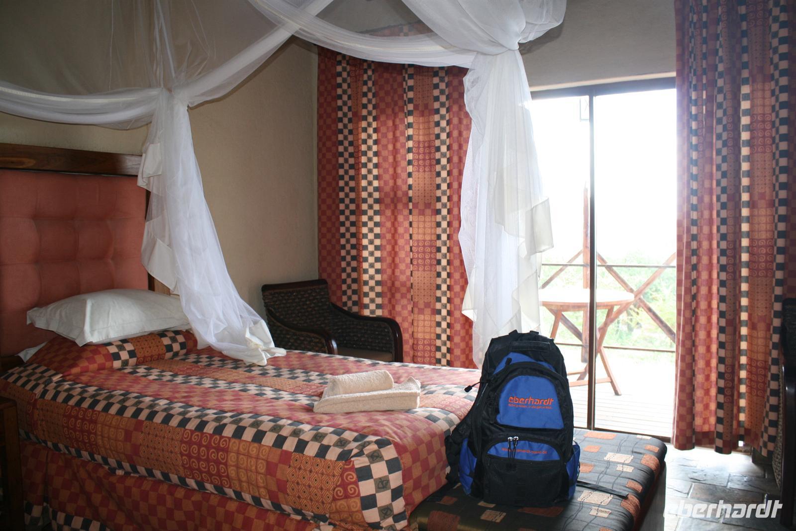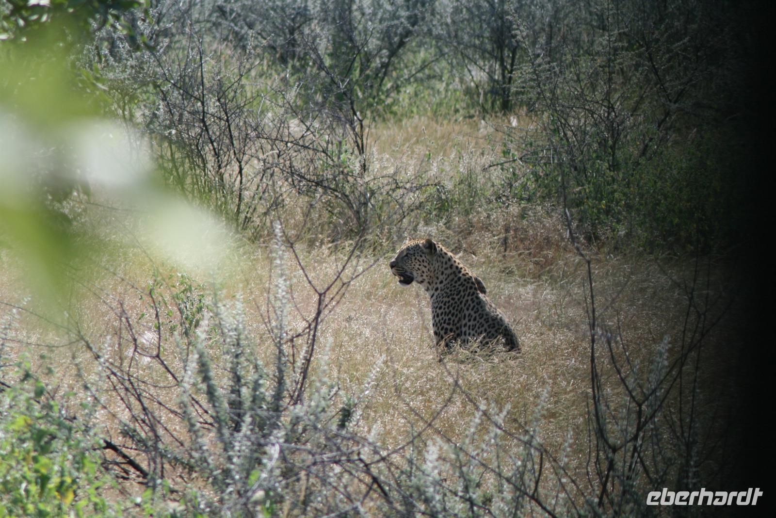 Nach dem Frühstück fuhren wir wieder in den Etosha Nationalpark um erneut auf Tierbeobachtung zu gehen. Bereits am morgen entdeckten wir allerhand Tiere. Wider erwartens hatten wir das große Glück einem Leoparden auf der Lauer zu beobachten. Doch als er die Chance ergreifen konnte, versteckte er sich lieber, anscheinend war er schon gesättigt oder von der Großzahl der Zebras eingeschüchtert. Kurz bevor wir unsere Lodge erreichten stolperten wir in das Badezimmer eines Elefantenbullen. Direkt neben der Straße kühlte sich der Dickhäuter in einem Schlammloch ab. Er und auch wir hatten dabei viel Freude! Um die Mittagszeit bezogen wir unsere Zimmer direkt in der staatlichen Lodge inmitten des Etosha Nationalparks. Auf in die zweite Runde, hieß es dann am frühen Nachmittag. Wir fuhren in östliche Richtung zu weiteren Wasserlöchern. Nachdem es schien als ob dieser Teil des Etoshas völlig tierlos sei, trafen wir auf Bekannte vom Vortag. Das Löwenrudel machte es sich unter ein paar schattenspendenden Bäumen gemütlich. Auch eines der seltenen Spitzmaulnashörner haben wir aufgespürt. Afrikanische Klänge und Damaratänze eines örtlichen Schulchores unterhielten uns während des Abendessens. In der Okaukuejo Lodge und Camp Anlage befindet sich ein Wasserloch mit Hochsitz, von dem man nachts die Tiere beim Trinken beobachten kann. Da es die letzten Tage jedoch in einigen Regionen viel Regen gab, haben wir an diesem Abend nicht viel zu sehen - aber viel zu lachen.