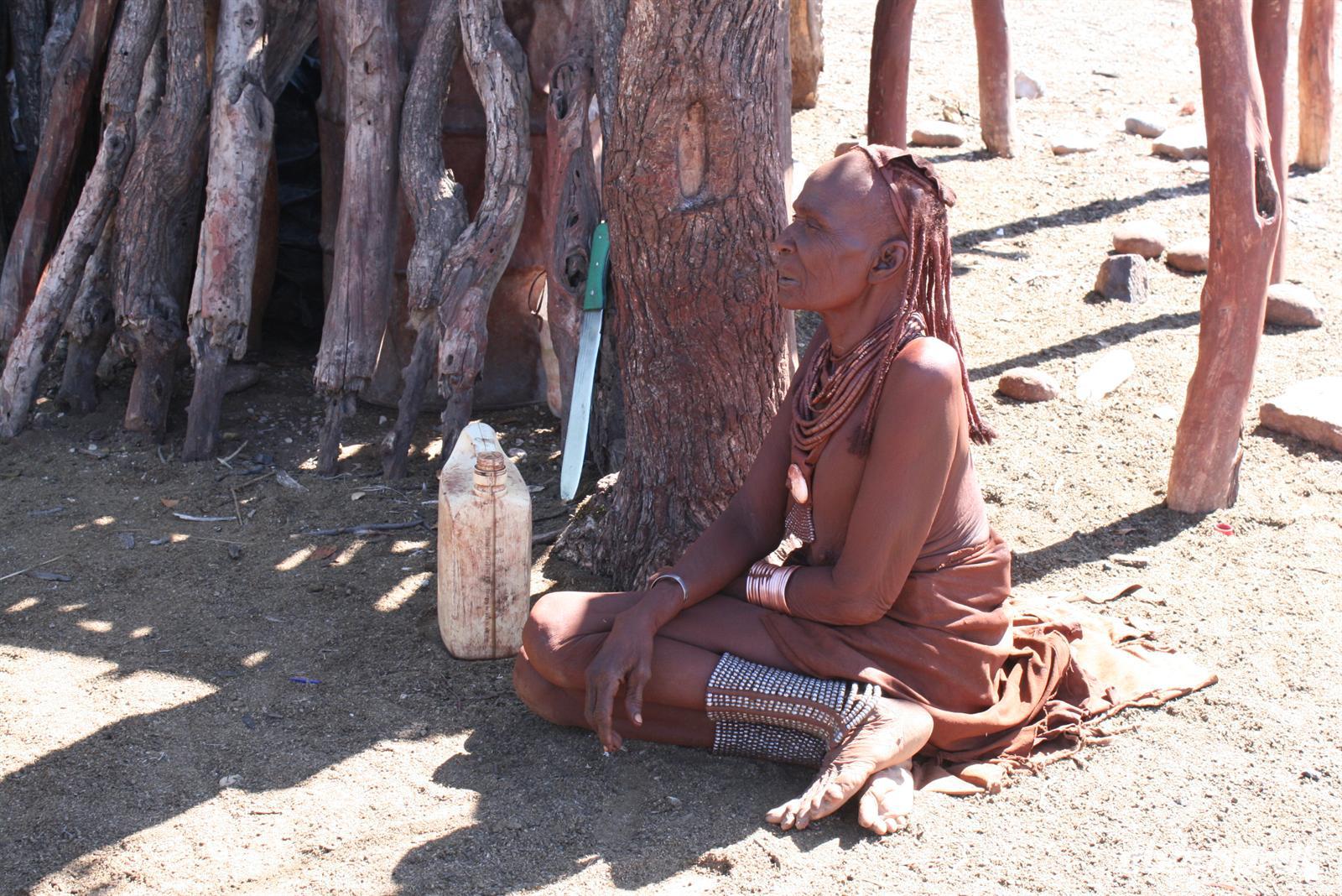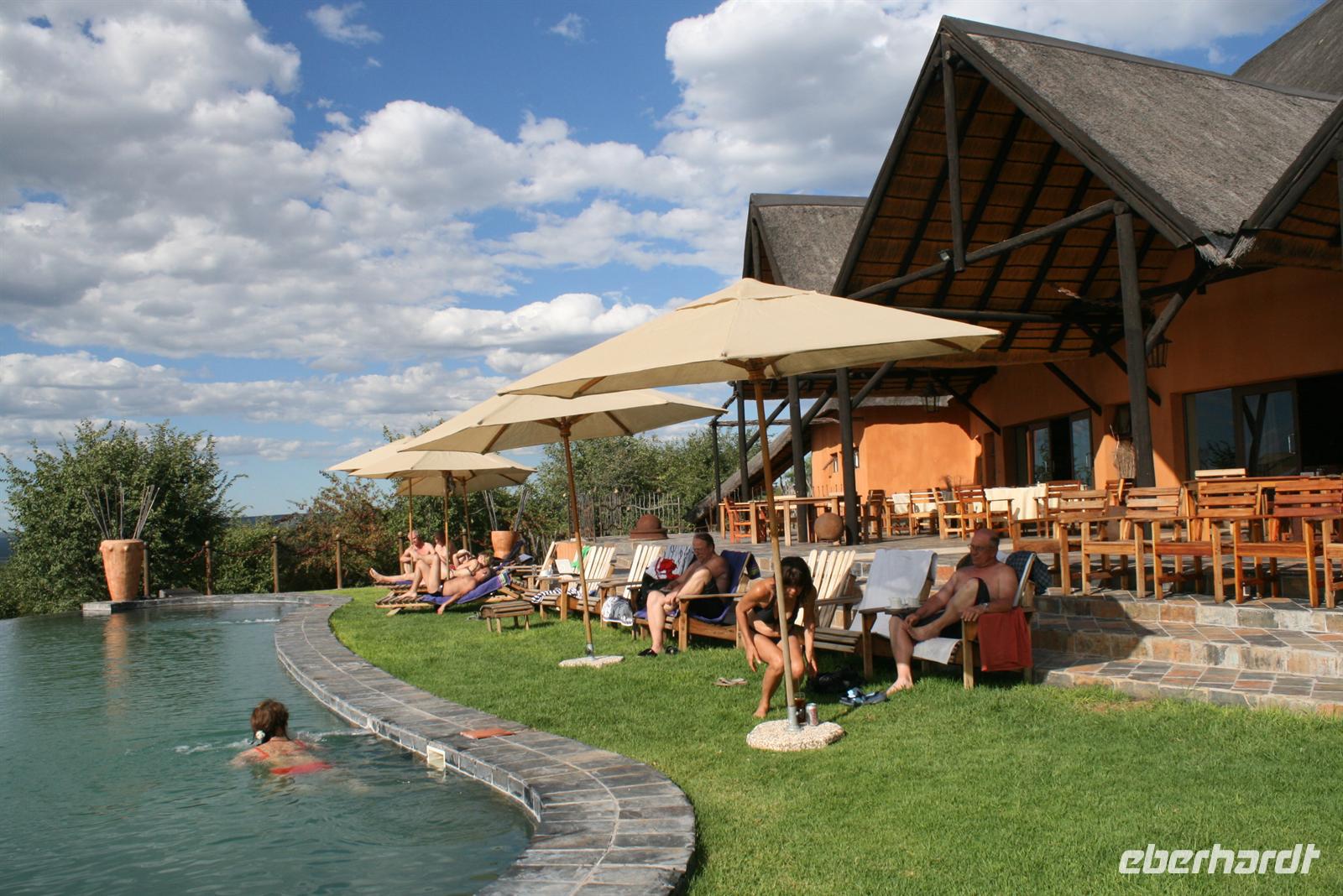 Nach einem etwas chaotischen Frühstück verlassen wir Korixas in Richtung Norden. Wir fahren entlang des Etosha Nationalparkes und erspähen schon die ersten Giraffen. Als wir in Opuwo ankamen erstaunte uns ein bunter Mix der Kulturen. Auf den Straßen treffen wir auf Hererofrauen mit ihren opulenten Kleidern, Himbafrauen, traditionell „oben ohne" und westliche gekleideten Jugendliche. Unsere Lodge liegt über Opuwo inmitten der Hügellandschaft. Hier werden wir freundlich in Empfang genommen und können den Nachmittag am Pool mit fantastischem Ausblick auf die umliegenden Berge genießen.