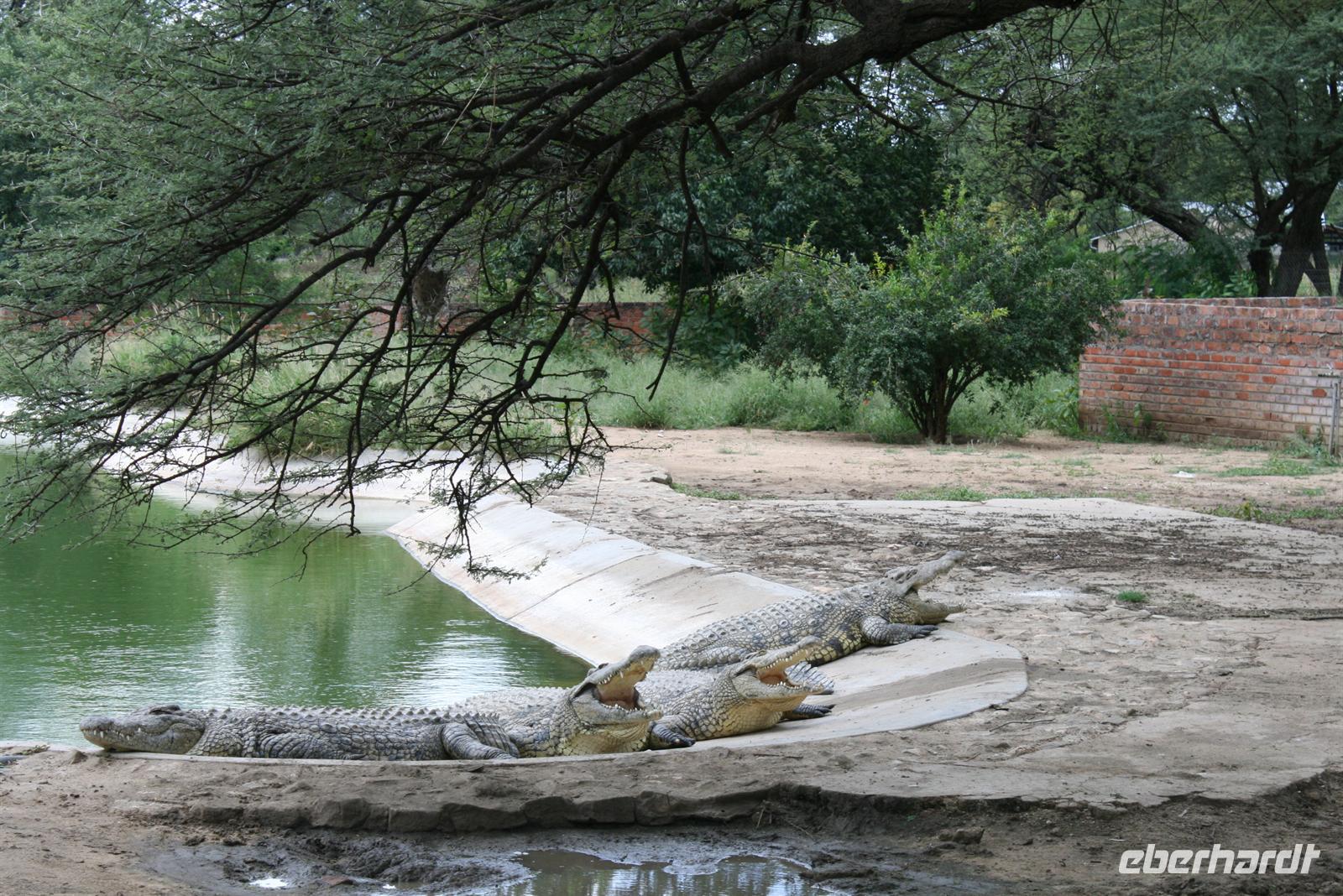 So wie wir empfangen wurden, wurden wir auch verabschiedet - herzlich mit Trommeln und Gesang. Wir fahren weiter nach Okahanja, einer kleinen Stadt mit großer Geschichte. Hier liegen viele deutsche Soldaten, die während des Krieges gefallen sind. Auch die Anführer der Himbas liegen hier begraben und locken jährlich im August mehrere Hundert Himbas in den Ort. Wir besuchen die Gräber und im Anschluss den Holzmarkt mit einem großen Angebot aus Holzfiguren von 1 cm bis über einem Meter groß. Anschließend fahren wir nach Otjiwarongo, um unsere Lodge zu beziehen.