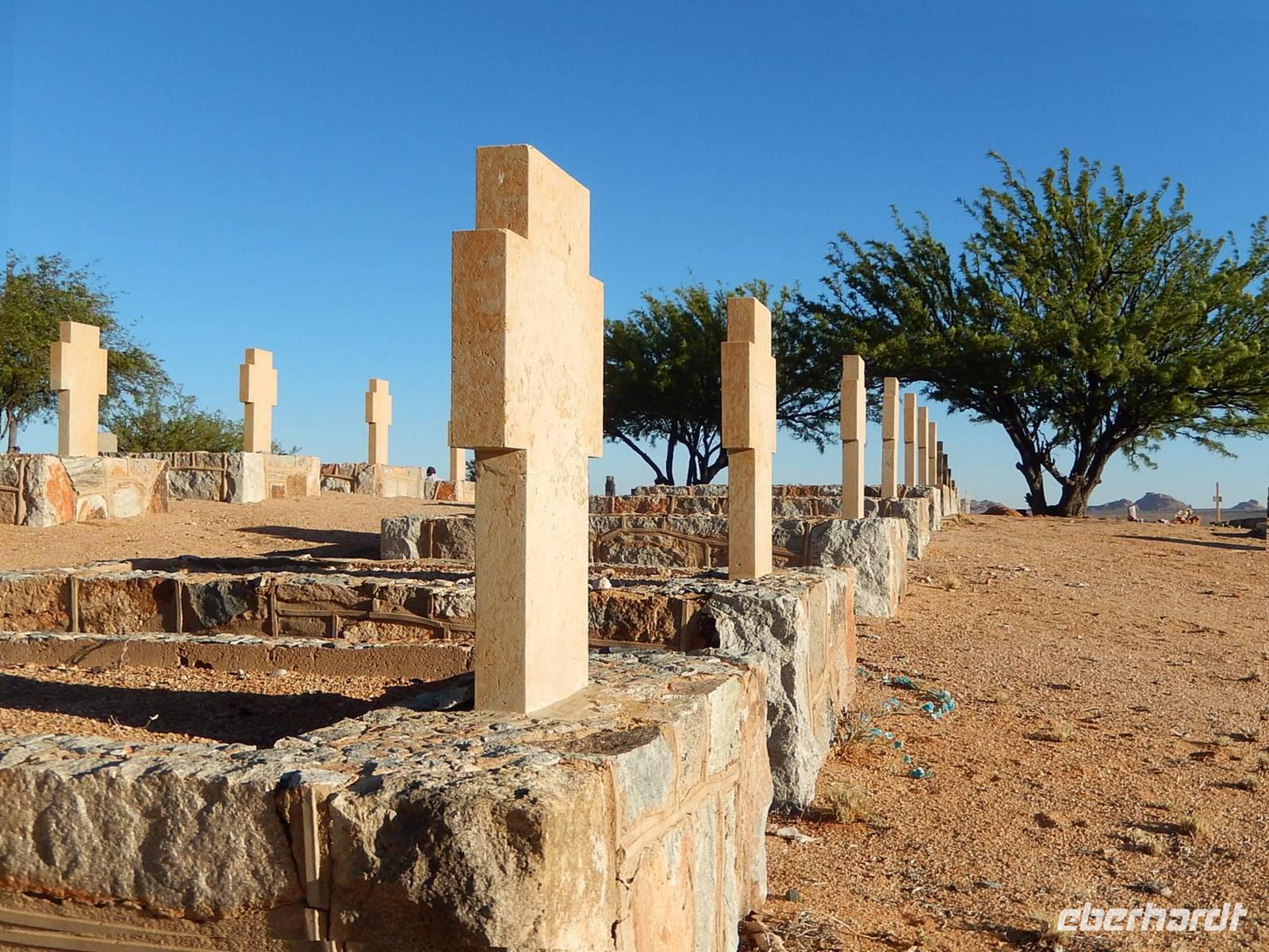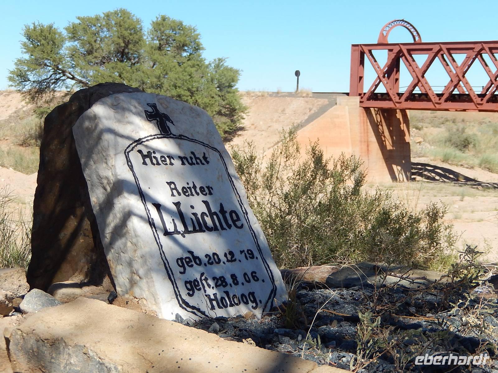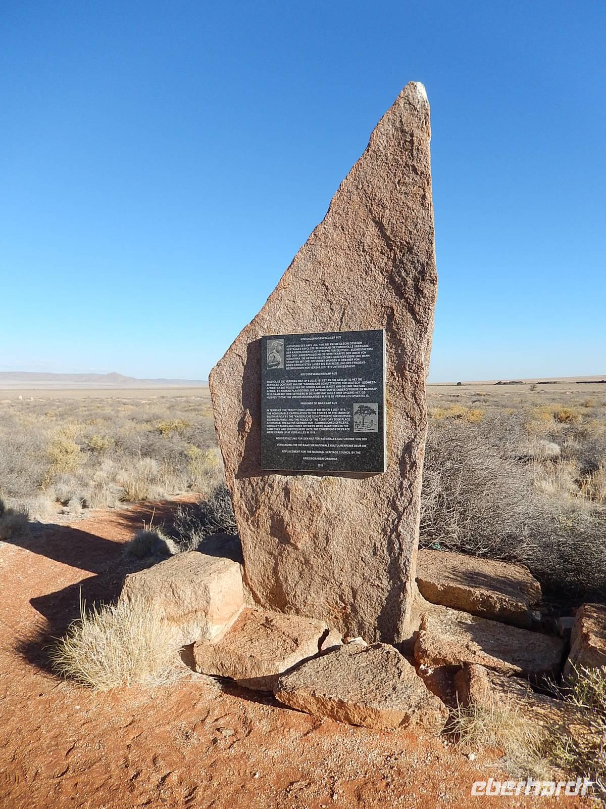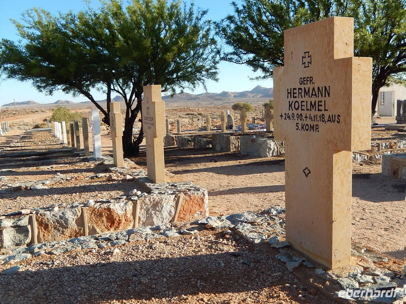 Auch das Frühstück im Canyon Village lässt keine Wünsche offen, so fällt es uns schwer, die zauberhafte Lodge schon zu verlassen... doch heute erwarten uns - und auch unseren Reiseleiter Klaus - ganz neue Wege und Eindrücke. Unser erstes Highlight am Wegesrand ist ein prächtiges Exemplar einer Schwarzen Kobra - ab jetzt gehen wir nur noch besonders achtsam durch die Büsche! Wir fahren durch eine trockene Landschaft aus verschieden farbigen Felsen und Sand, wo ein alter, verrosteter Chevrolet ein schönes Fotomotiv gibt. In Aussenkehr erreichen wir den südlichsten Punkt unserer Reise. Wir befinden uns am Oranje-Fluss, der die Grenze nach Südafrika bildet. Der Fluss zieht sich wie ein grünes Band durch die sonst so trockene Landschaft. Ab jetzt geht es weiter nordwärts, am Rande des ehemaligen Diamanten-Sperrgebietes entlang bis nach Aus. Heute ist in Namibia Nationalfeiertag, große Feierlichkeiten sehen wir jedoch nicht. Am Nachmittag checken wir in der Klein Aus Vista Lodge ein. Vor dem Abendessen machen wir noch einen kurzen Ausflug zum POW-Camp (Prisoner-of-war Camp) und dem Friedhof. An das Kriegsgefangenenlager Aus, wo die Kaiserliche Schutztruppe für Deutsch-Südwestafrika 1915-1919 untergebracht war, erinnert heute nur noch ein Gedenkstein.