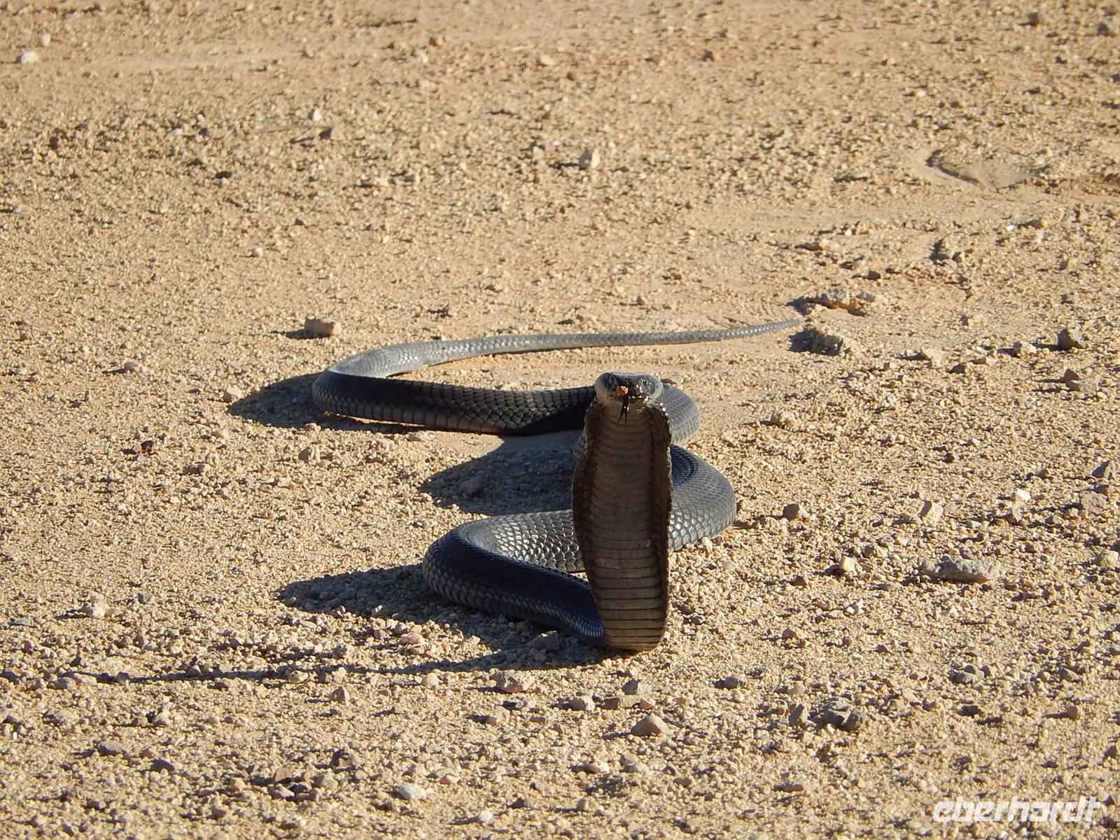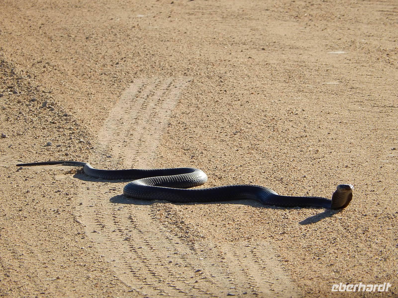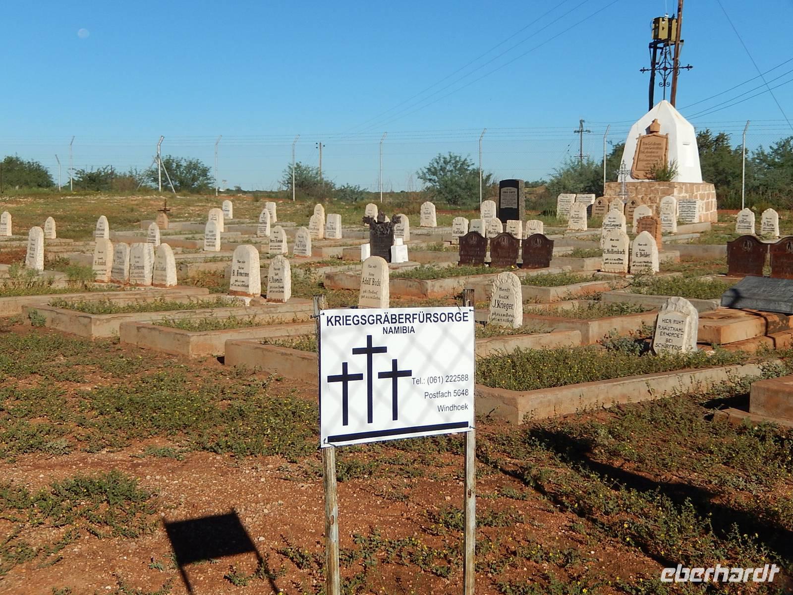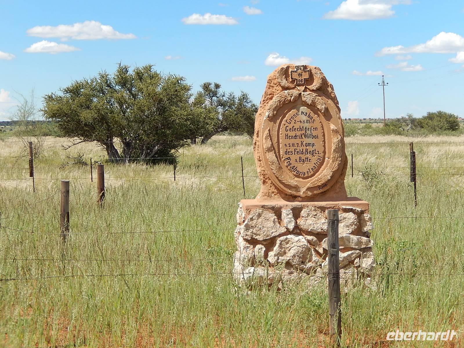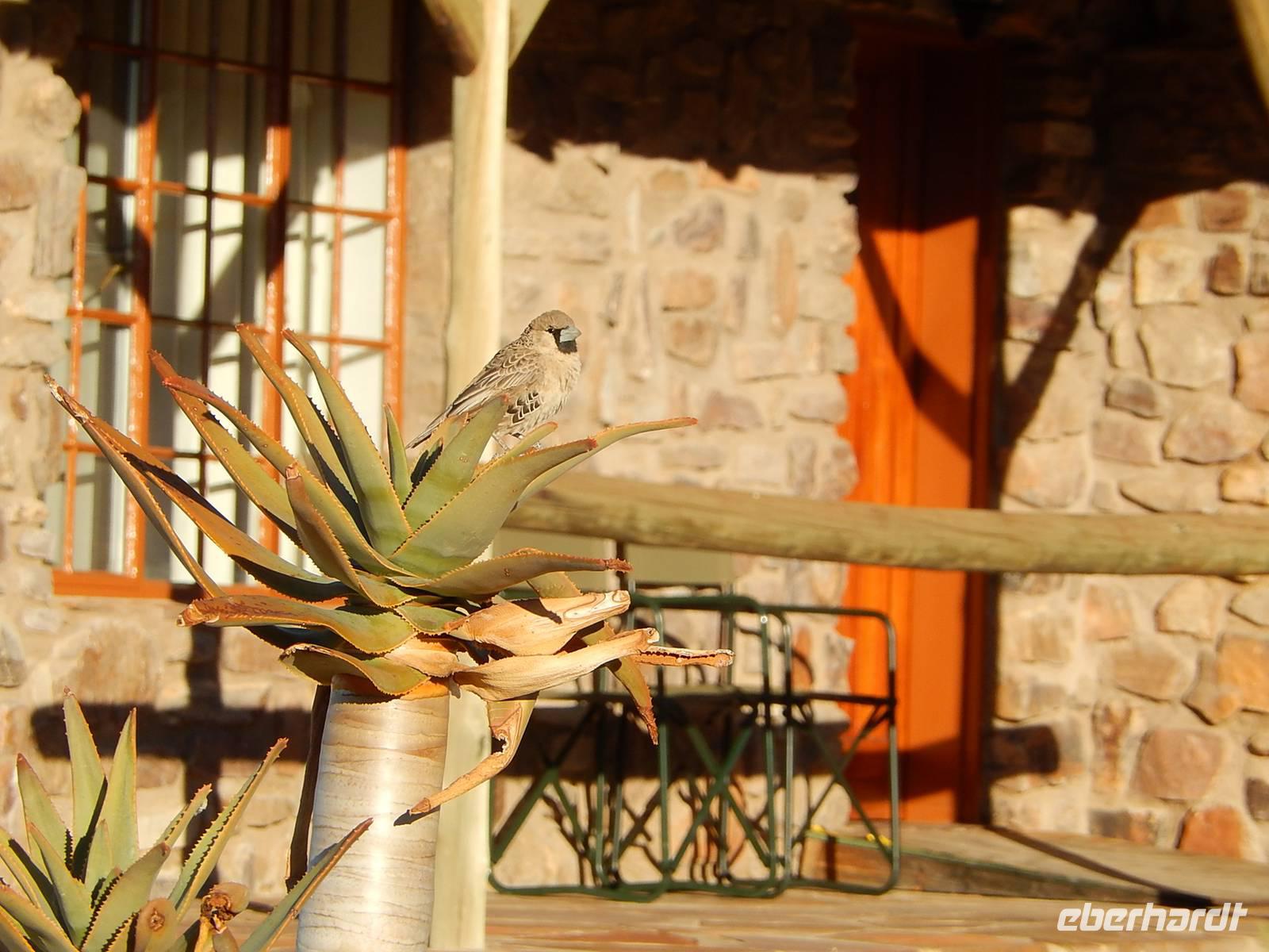 Auch das Frühstück im Canyon Village lässt keine Wünsche offen, so fällt es uns schwer, die zauberhafte Lodge schon zu verlassen... doch heute erwarten uns - und auch unseren Reiseleiter Klaus - ganz neue Wege und Eindrücke. Unser erstes Highlight am Wegesrand ist ein prächtiges Exemplar einer Schwarzen Kobra - ab jetzt gehen wir nur noch besonders achtsam durch die Büsche! Wir fahren durch eine trockene Landschaft aus verschieden farbigen Felsen und Sand, wo ein alter, verrosteter Chevrolet ein schönes Fotomotiv gibt. In Aussenkehr erreichen wir den südlichsten Punkt unserer Reise. Wir befinden uns am Oranje-Fluss, der die Grenze nach Südafrika bildet. Der Fluss zieht sich wie ein grünes Band durch die sonst so trockene Landschaft. Ab jetzt geht es weiter nordwärts, am Rande des ehemaligen Diamanten-Sperrgebietes entlang bis nach Aus. Heute ist in Namibia Nationalfeiertag, große Feierlichkeiten sehen wir jedoch nicht. Am Nachmittag checken wir in der Klein Aus Vista Lodge ein. Vor dem Abendessen machen wir noch einen kurzen Ausflug zum POW-Camp (Prisoner-of-war Camp) und dem Friedhof. An das Kriegsgefangenenlager Aus, wo die Kaiserliche Schutztruppe für Deutsch-Südwestafrika 1915-1919 untergebracht war, erinnert heute nur noch ein Gedenkstein.