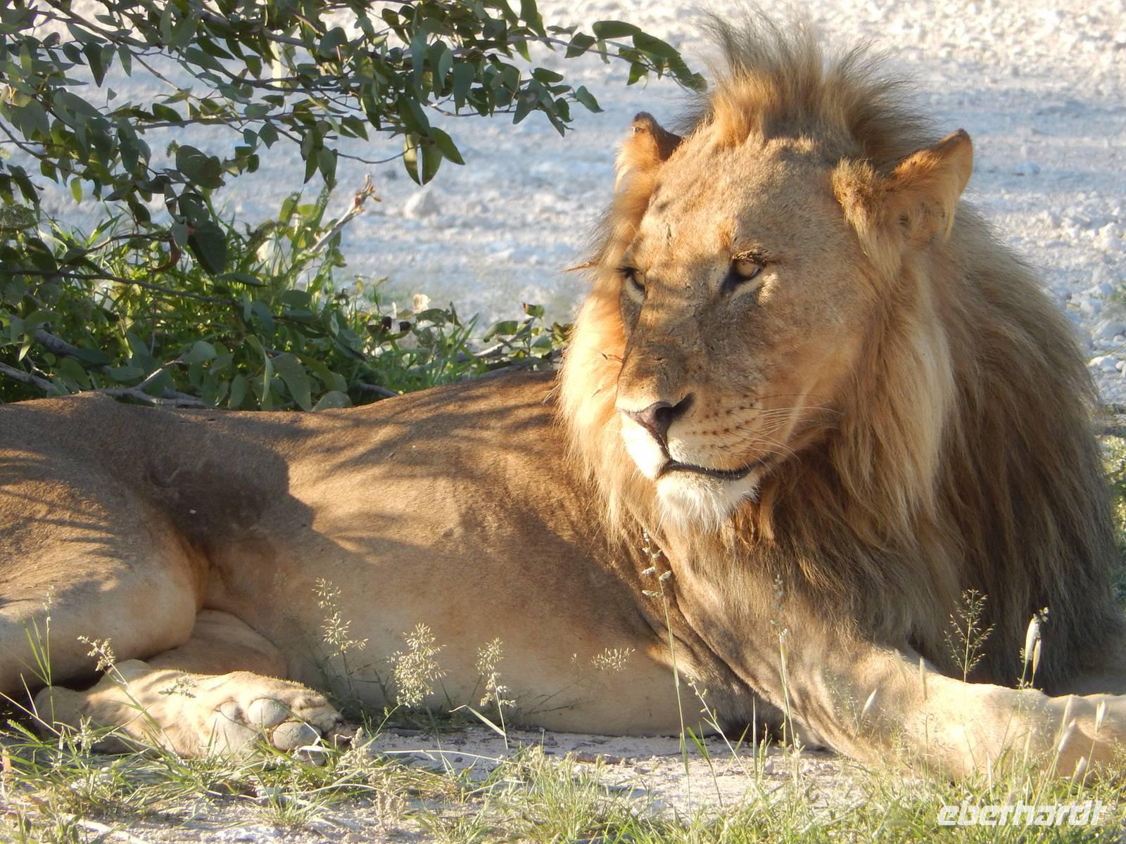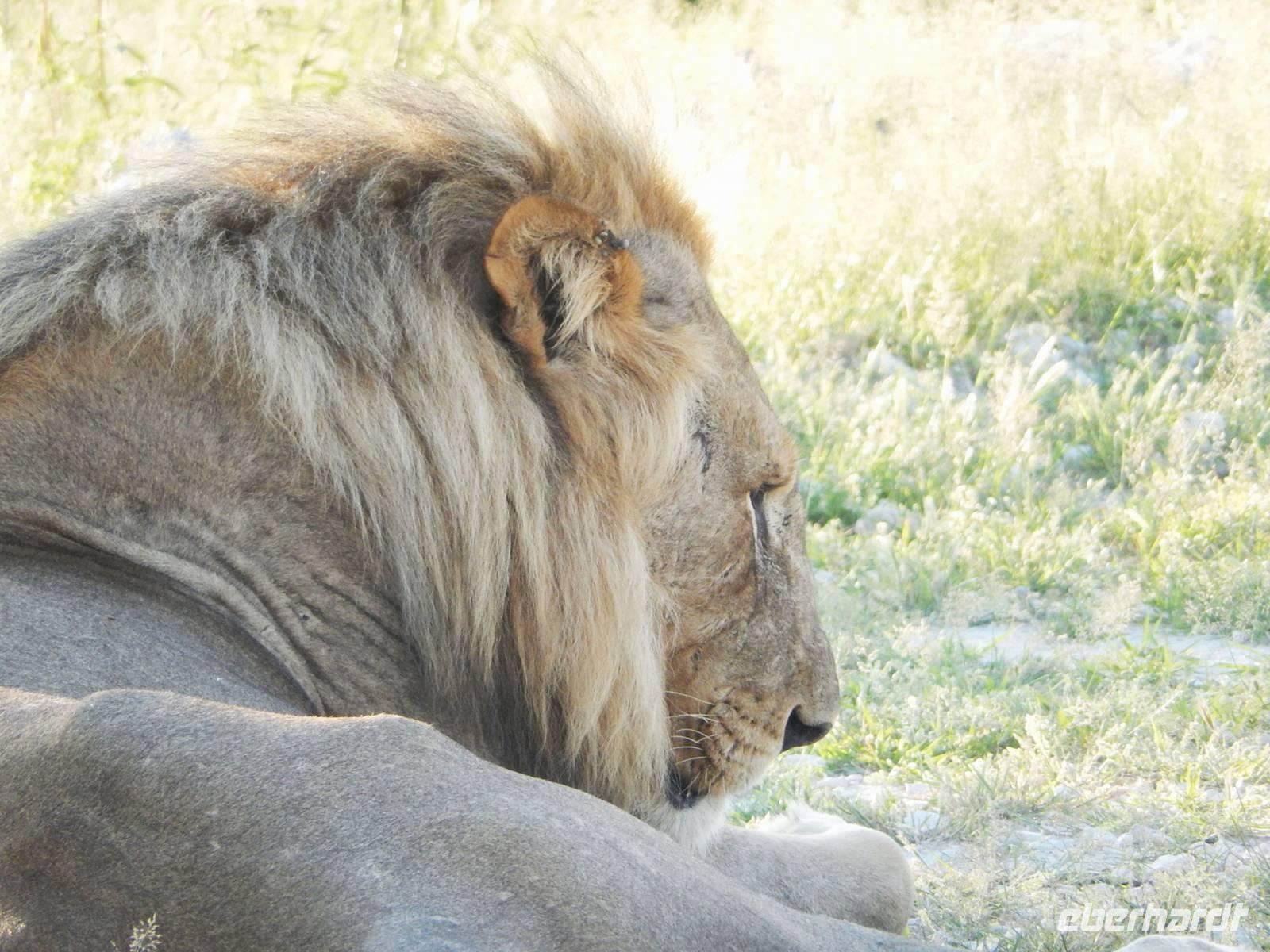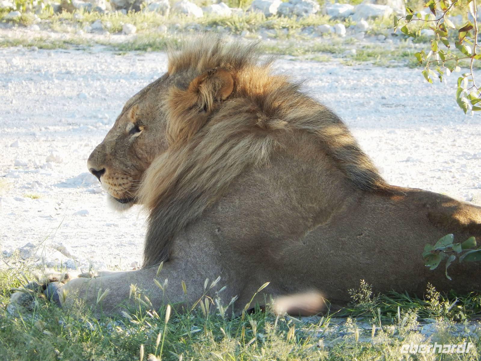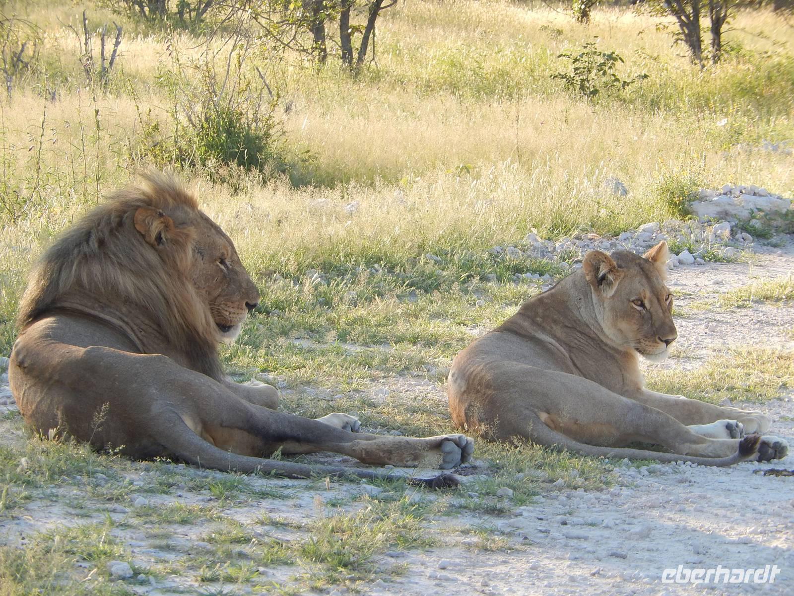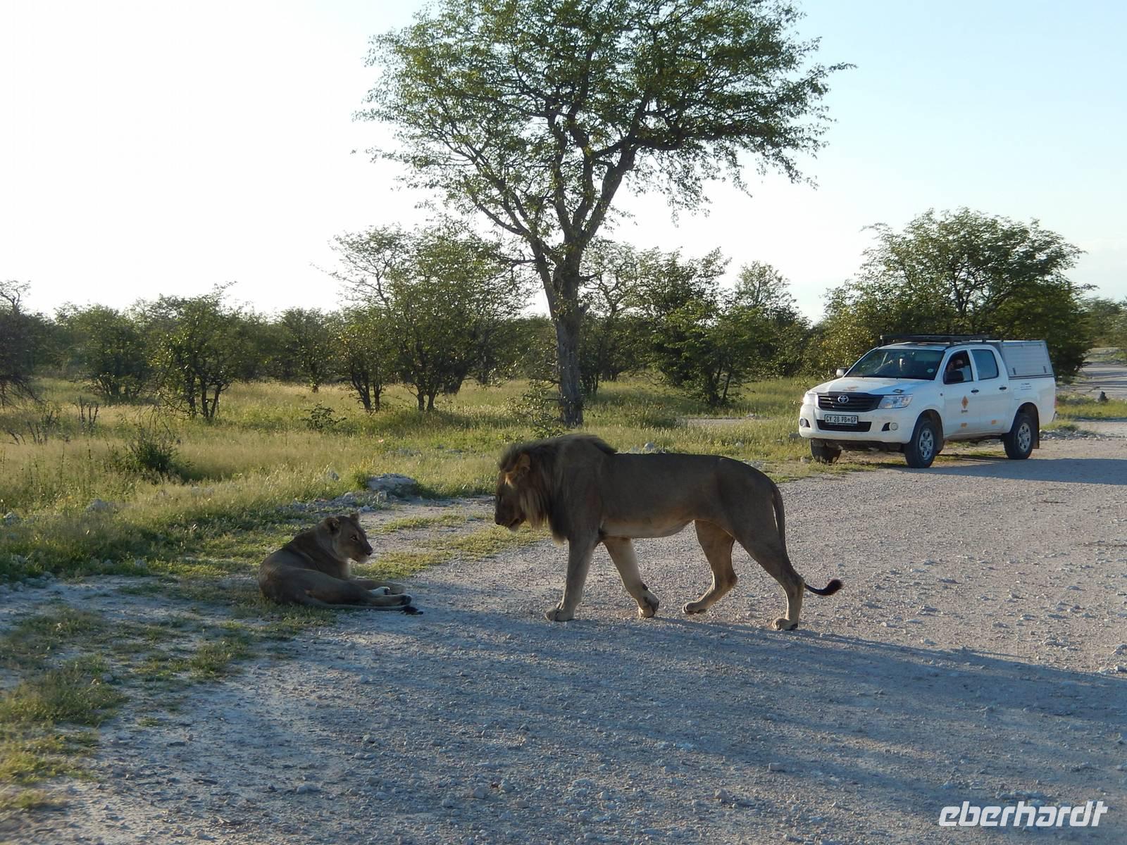 Nach den Erfolgserlebnissen des gestrigen Tages, starten wir heute erwartungsvoll auf unsere morgendliche Safari im offenen Jeep. Pünktlich zum Sonnenaufgang erreichen wir das Gate zum Park und halten die Augen offen. Leider haben wir nur „magere Beute" und sehen nicht einen Vertreter der berühmten Big Five. Richtig fette Beute haben dagegen die Weißrückengeier gemacht, die die sich an einem gerissenen Zebra zu schaffen machen. Dennoch erfreuen wir uns an der Schönheit der Springböcke, Zebras und Strauße. Die hübsche Gabelracke und die Bienenfresser stehen ebenfalls für uns Porträt. Kurz vor der Ausfahrt des Parks sehen wir noch die zweitkleinste Antilope Namibias, den Steinbock, und ein Warzenschwein, das schnell im Gebüsch verschwindet. Nach einer Mittagspause im Camp probieren wir noch einmal unser Glück. Wir bekommen eine Riesentrappe, die Leopardenschildkröte, Erdmännchen, Kudus und eine Herde Gnus vor die Linse. Und dann bekommen wir einen wahrhaft heißen Tipp - am Wasserloch Olifantsbad sollen drei Löwen zu sehen sein. Wir können unseren Augen kaum trauen - aus nächster Nähe können wir die majestätischen Katzen in Ruhe und sogar bei der Paarung beobachten! Was haben wir für ein Glück! Auf dem Rückweg sehen wir noch einen Elefanten und eine Herde Impalas.