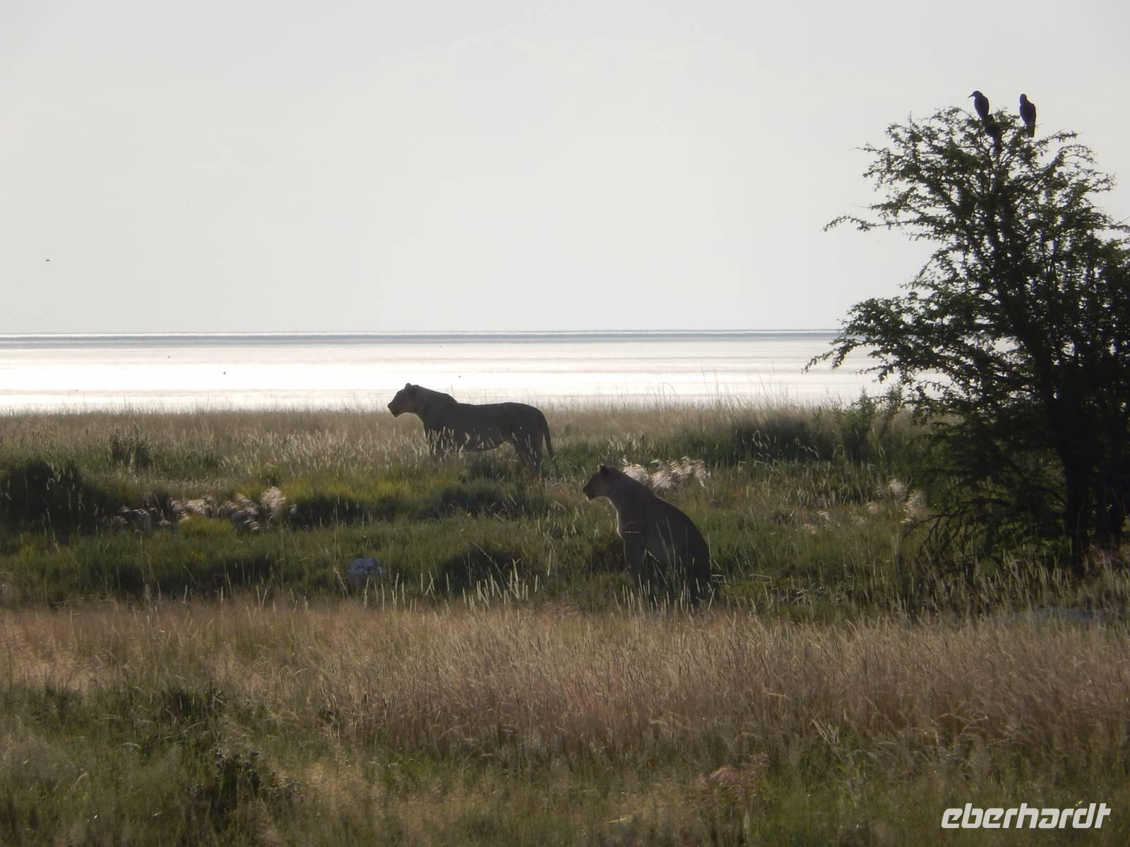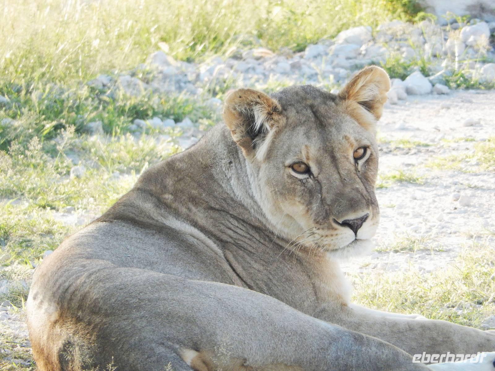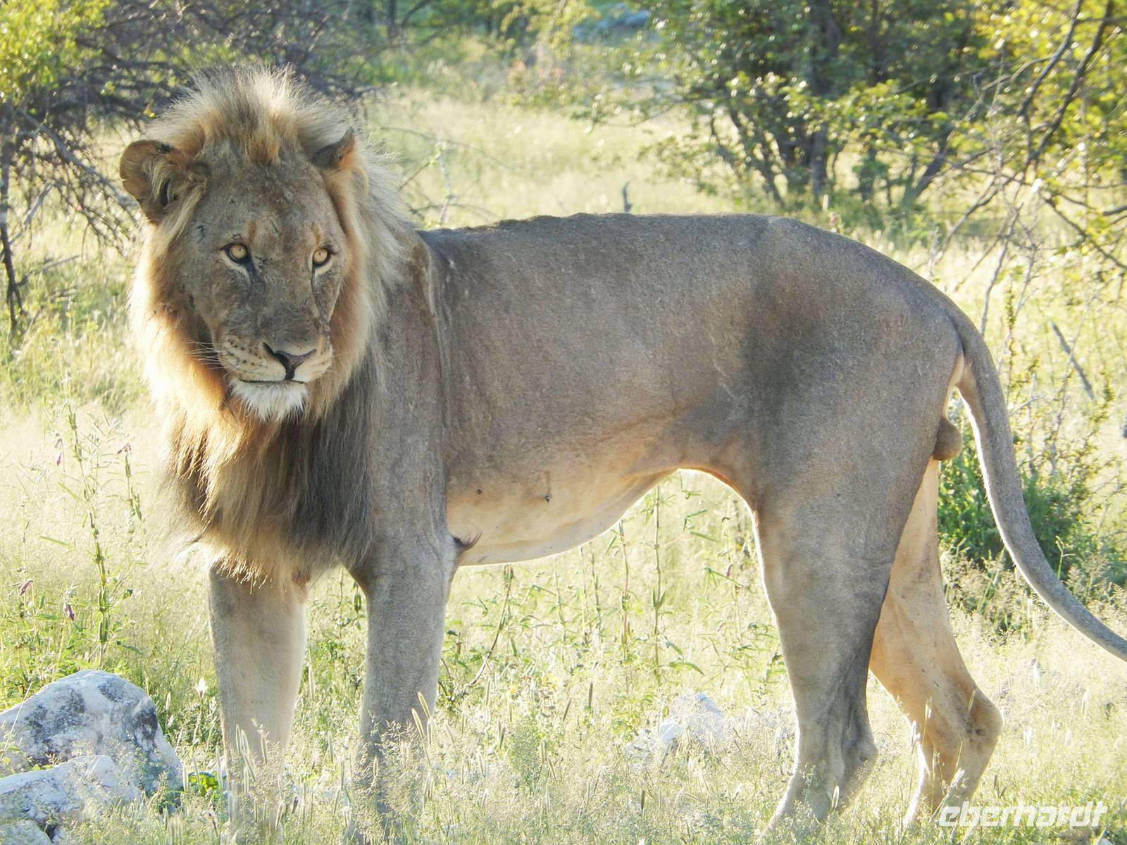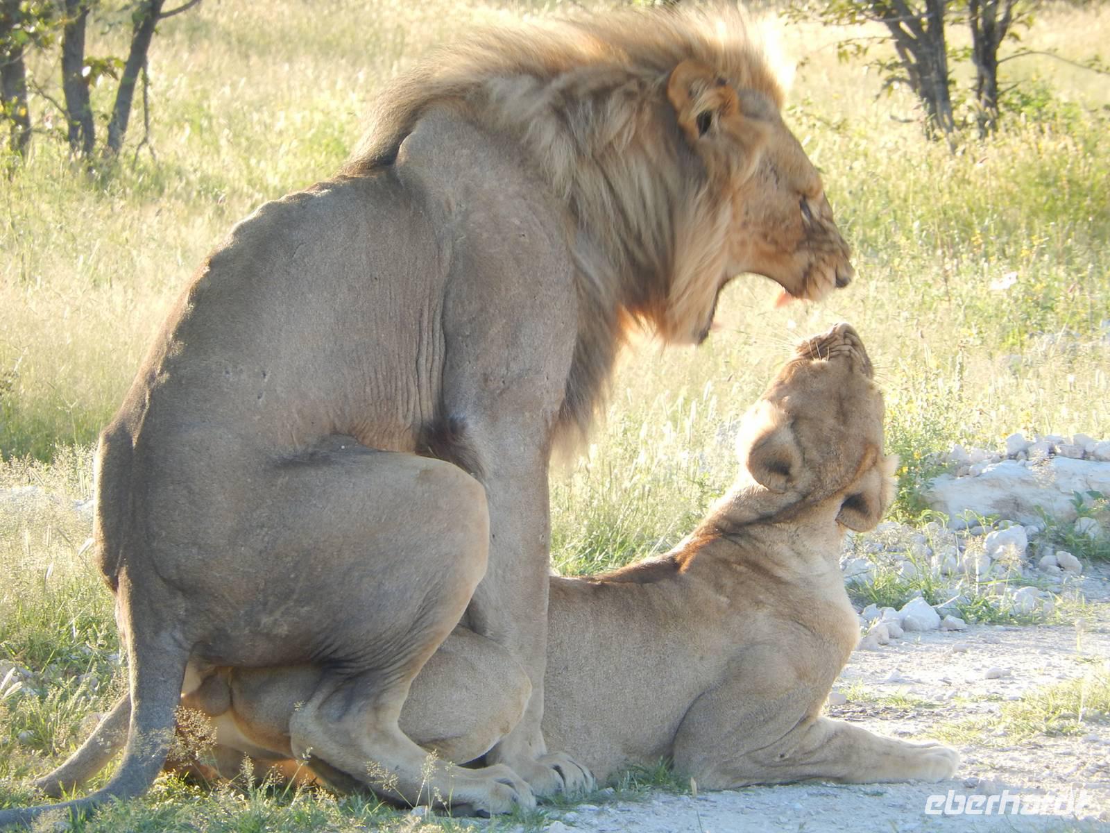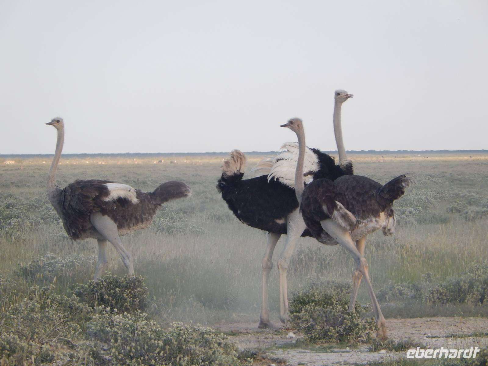 Nach den Erfolgserlebnissen des gestrigen Tages, starten wir heute erwartungsvoll auf unsere morgendliche Safari im offenen Jeep. Pünktlich zum Sonnenaufgang erreichen wir das Gate zum Park und halten die Augen offen. Leider haben wir nur „magere Beute" und sehen nicht einen Vertreter der berühmten Big Five. Richtig fette Beute haben dagegen die Weißrückengeier gemacht, die die sich an einem gerissenen Zebra zu schaffen machen. Dennoch erfreuen wir uns an der Schönheit der Springböcke, Zebras und Strauße. Die hübsche Gabelracke und die Bienenfresser stehen ebenfalls für uns Porträt. Kurz vor der Ausfahrt des Parks sehen wir noch die zweitkleinste Antilope Namibias, den Steinbock, und ein Warzenschwein, das schnell im Gebüsch verschwindet. Nach einer Mittagspause im Camp probieren wir noch einmal unser Glück. Wir bekommen eine Riesentrappe, die Leopardenschildkröte, Erdmännchen, Kudus und eine Herde Gnus vor die Linse. Und dann bekommen wir einen wahrhaft heißen Tipp - am Wasserloch Olifantsbad sollen drei Löwen zu sehen sein. Wir können unseren Augen kaum trauen - aus nächster Nähe können wir die majestätischen Katzen in Ruhe und sogar bei der Paarung beobachten! Was haben wir für ein Glück! Auf dem Rückweg sehen wir noch einen Elefanten und eine Herde Impalas.