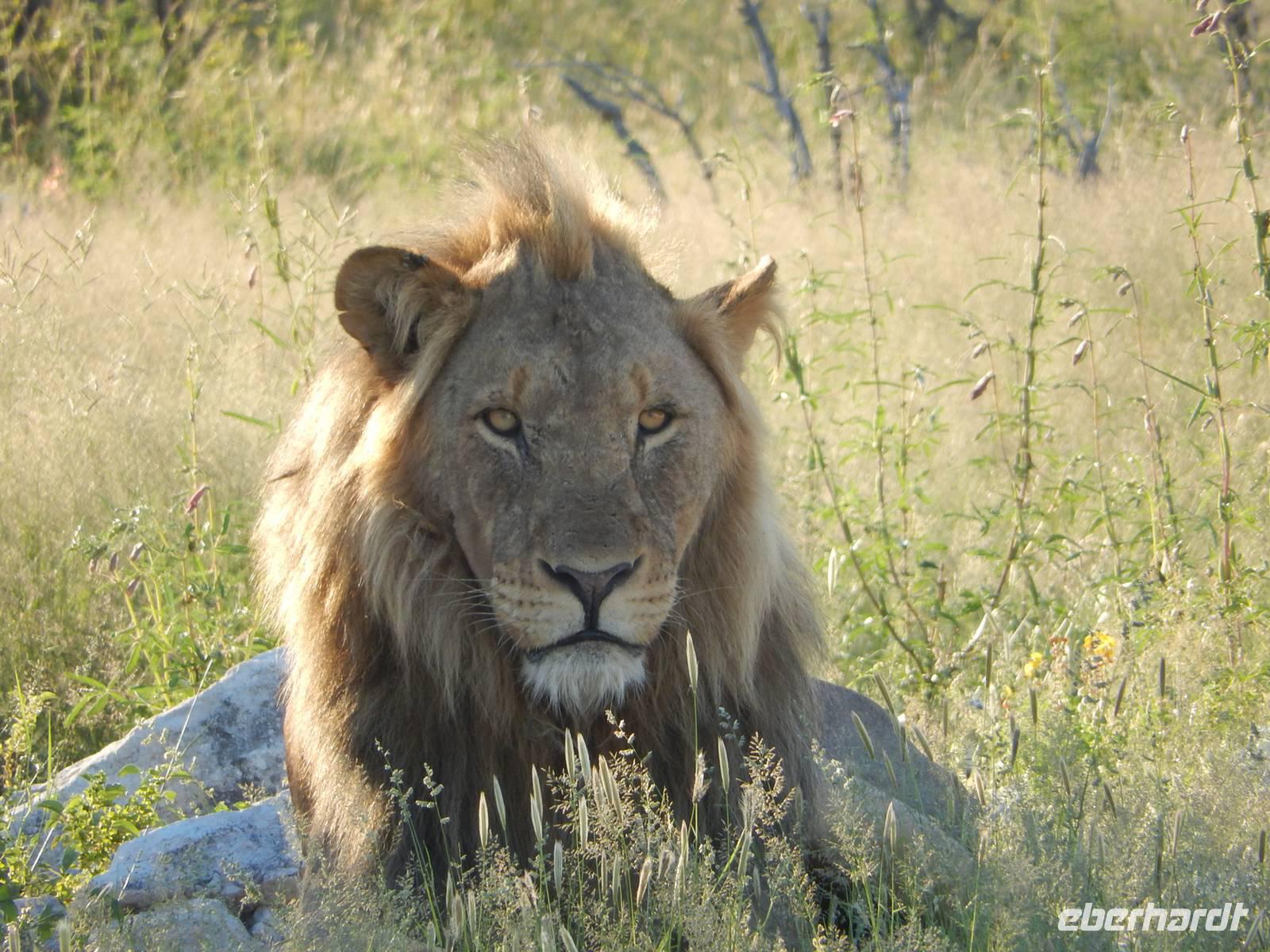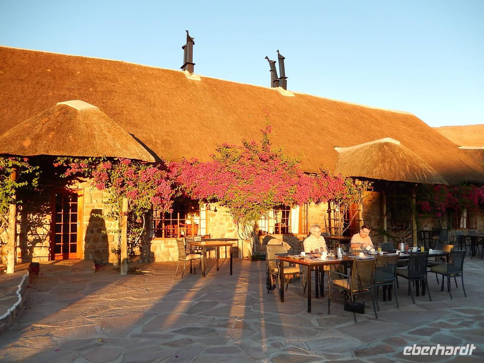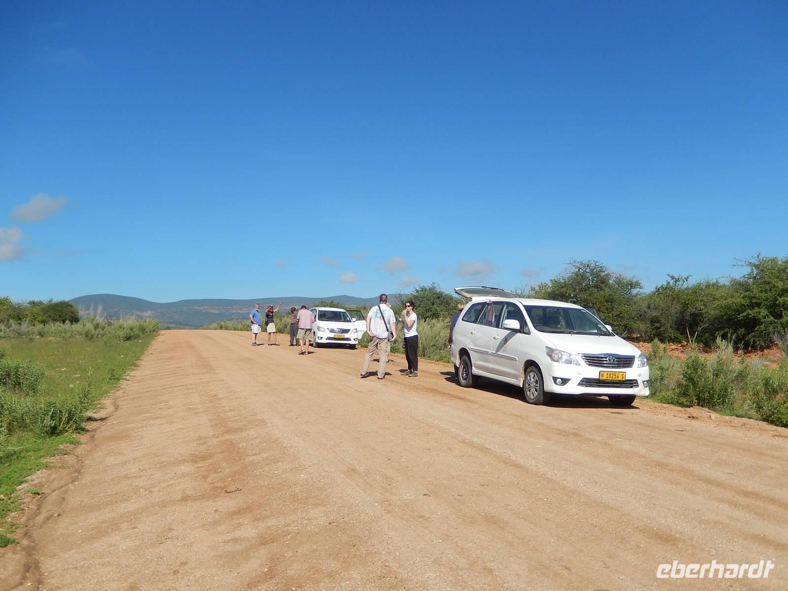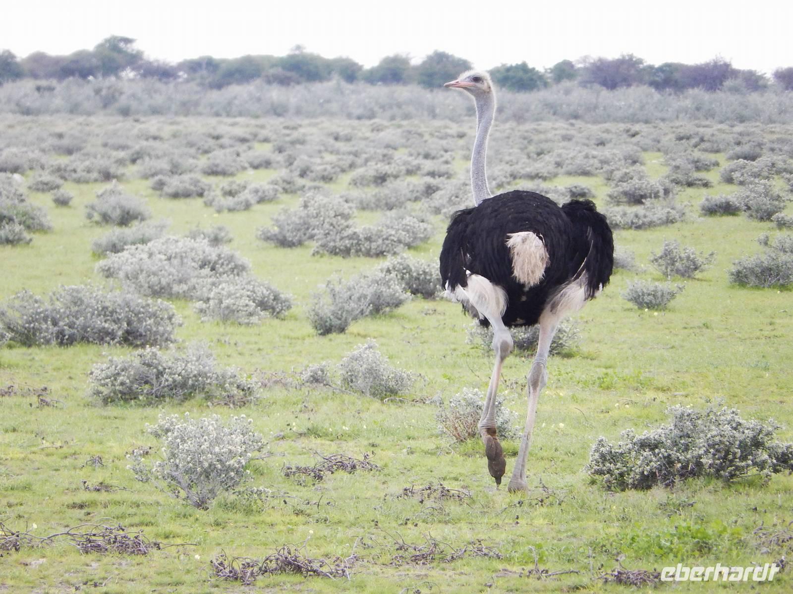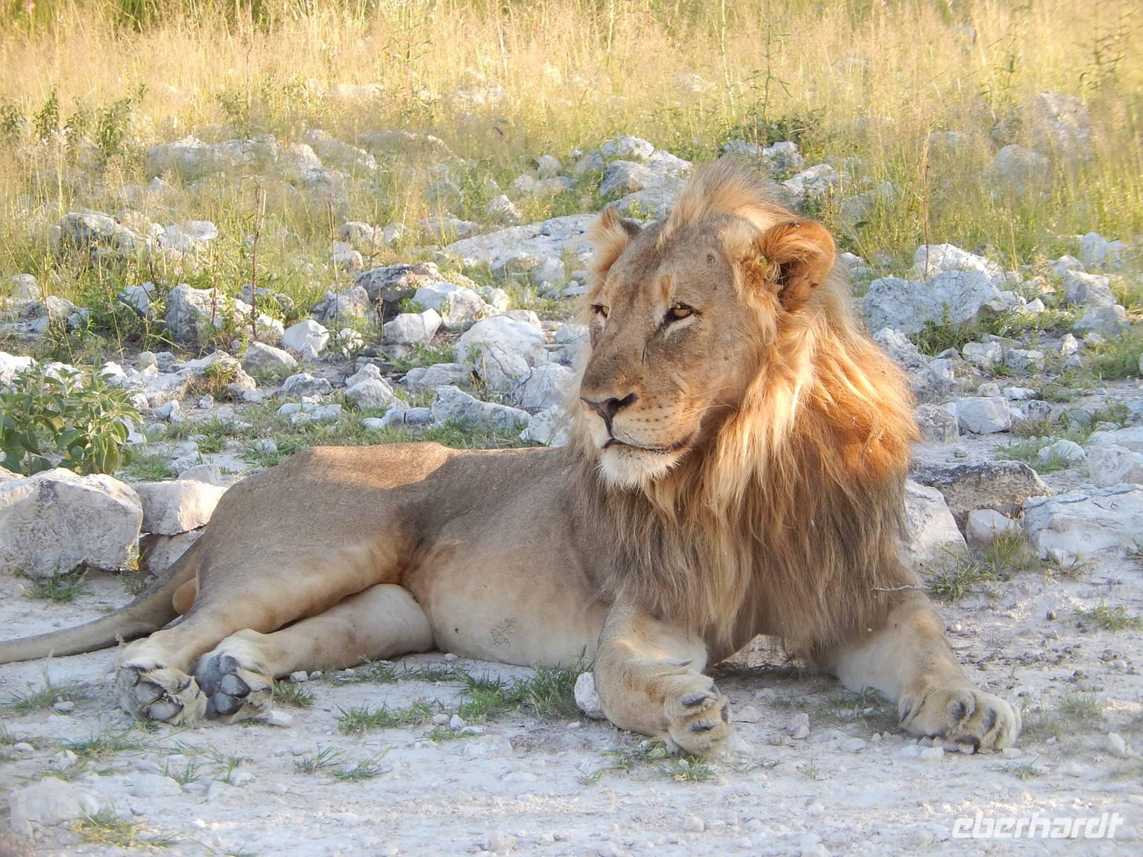 Nach den Erfolgserlebnissen des gestrigen Tages, starten wir heute erwartungsvoll auf unsere morgendliche Safari im offenen Jeep. Pünktlich zum Sonnenaufgang erreichen wir das Gate zum Park und halten die Augen offen. Leider haben wir nur „magere Beute" und sehen nicht einen Vertreter der berühmten Big Five. Richtig fette Beute haben dagegen die Weißrückengeier gemacht, die die sich an einem gerissenen Zebra zu schaffen machen. Dennoch erfreuen wir uns an der Schönheit der Springböcke, Zebras und Strauße. Die hübsche Gabelracke und die Bienenfresser stehen ebenfalls für uns Porträt. Kurz vor der Ausfahrt des Parks sehen wir noch die zweitkleinste Antilope Namibias, den Steinbock, und ein Warzenschwein, das schnell im Gebüsch verschwindet. Nach einer Mittagspause im Camp probieren wir noch einmal unser Glück. Wir bekommen eine Riesentrappe, die Leopardenschildkröte, Erdmännchen, Kudus und eine Herde Gnus vor die Linse. Und dann bekommen wir einen wahrhaft heißen Tipp - am Wasserloch Olifantsbad sollen drei Löwen zu sehen sein. Wir können unseren Augen kaum trauen - aus nächster Nähe können wir die majestätischen Katzen in Ruhe und sogar bei der Paarung beobachten! Was haben wir für ein Glück! Auf dem Rückweg sehen wir noch einen Elefanten und eine Herde Impalas.