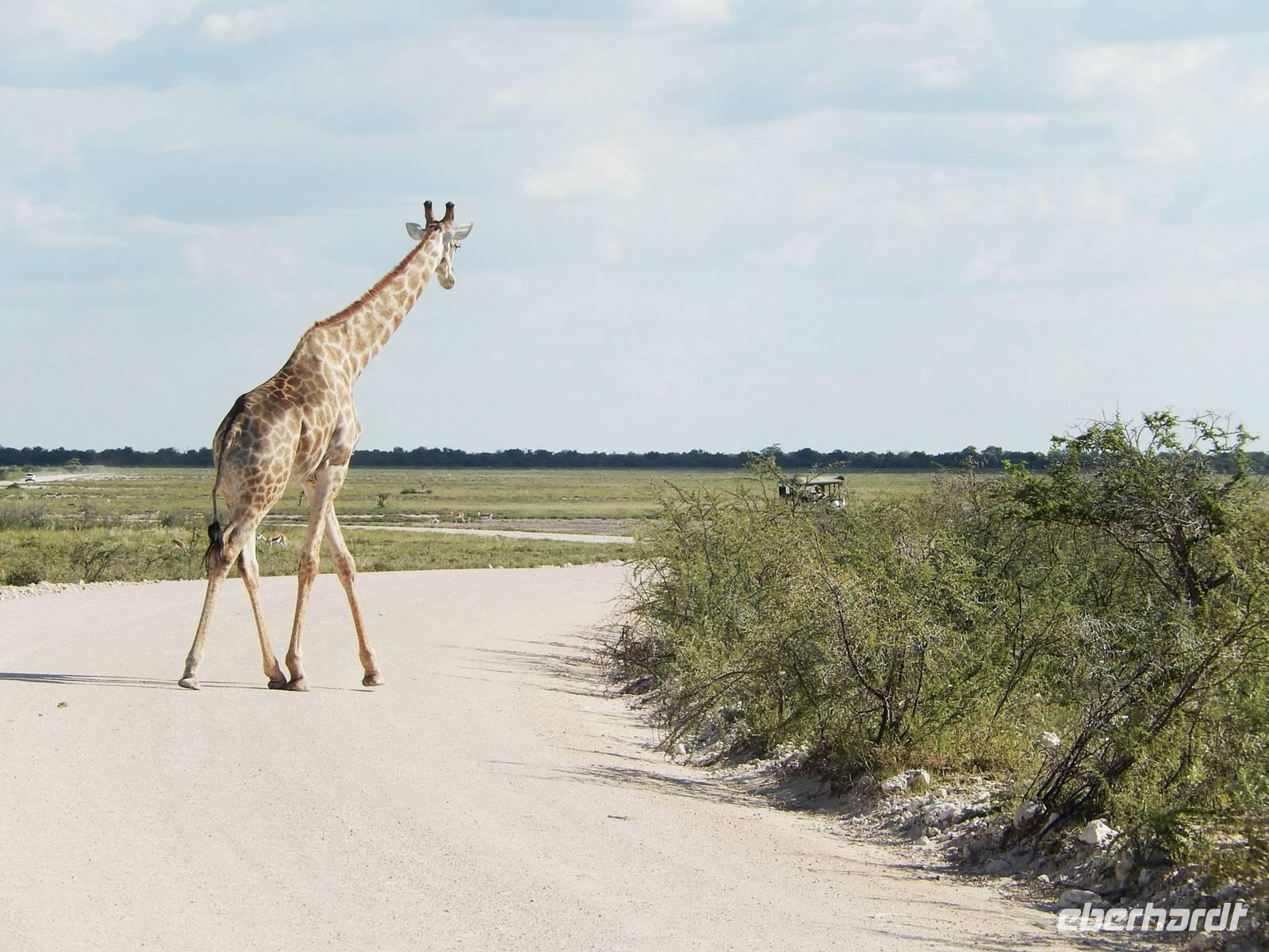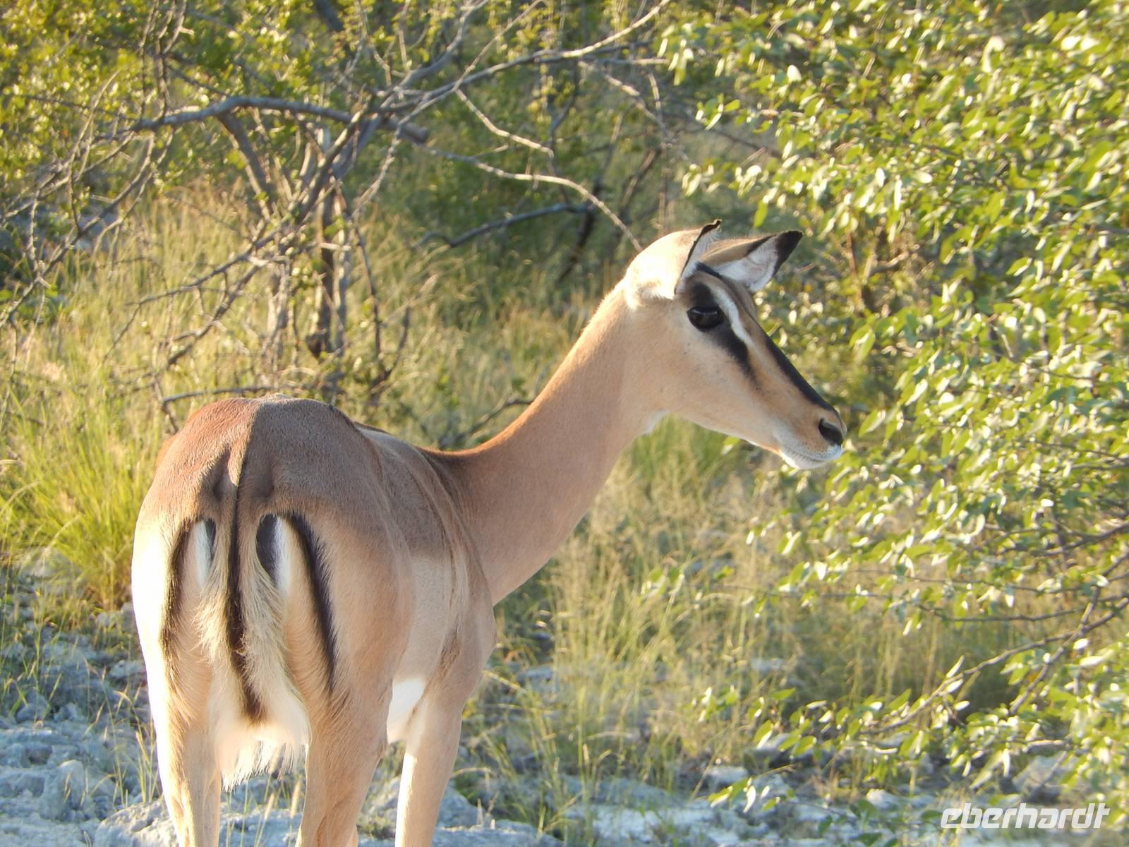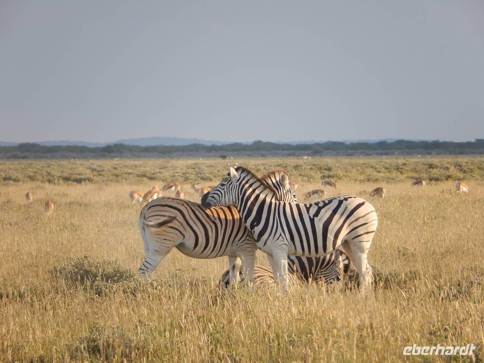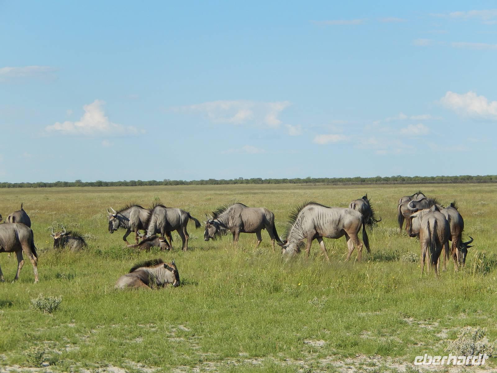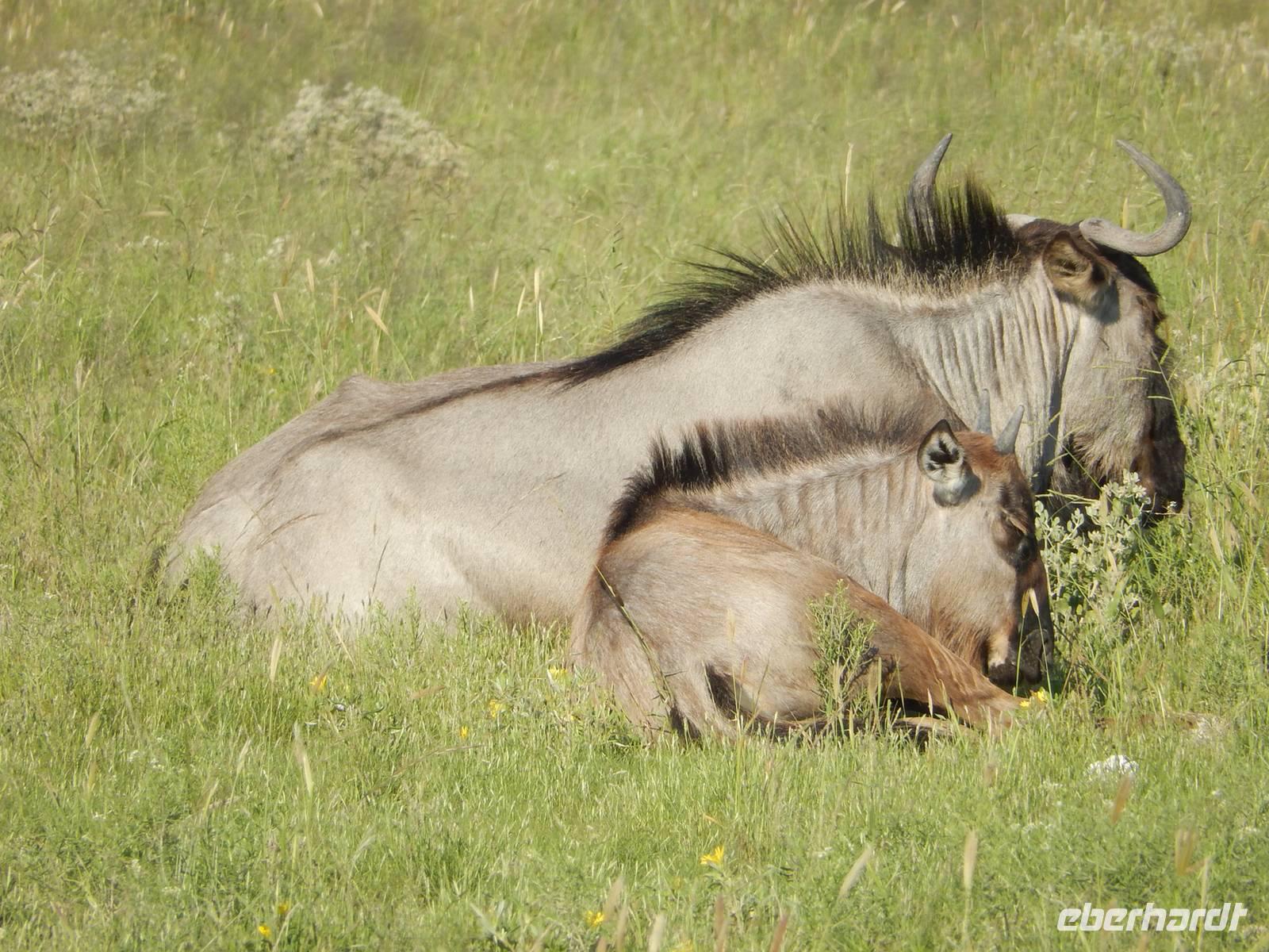 Nach den Erfolgserlebnissen des gestrigen Tages, starten wir heute erwartungsvoll auf unsere morgendliche Safari im offenen Jeep. Pünktlich zum Sonnenaufgang erreichen wir das Gate zum Park und halten die Augen offen. Leider haben wir nur „magere Beute" und sehen nicht einen Vertreter der berühmten Big Five. Richtig fette Beute haben dagegen die Weißrückengeier gemacht, die die sich an einem gerissenen Zebra zu schaffen machen. Dennoch erfreuen wir uns an der Schönheit der Springböcke, Zebras und Strauße. Die hübsche Gabelracke und die Bienenfresser stehen ebenfalls für uns Porträt. Kurz vor der Ausfahrt des Parks sehen wir noch die zweitkleinste Antilope Namibias, den Steinbock, und ein Warzenschwein, das schnell im Gebüsch verschwindet. Nach einer Mittagspause im Camp probieren wir noch einmal unser Glück. Wir bekommen eine Riesentrappe, die Leopardenschildkröte, Erdmännchen, Kudus und eine Herde Gnus vor die Linse. Und dann bekommen wir einen wahrhaft heißen Tipp - am Wasserloch Olifantsbad sollen drei Löwen zu sehen sein. Wir können unseren Augen kaum trauen - aus nächster Nähe können wir die majestätischen Katzen in Ruhe und sogar bei der Paarung beobachten! Was haben wir für ein Glück! Auf dem Rückweg sehen wir noch einen Elefanten und eine Herde Impalas.