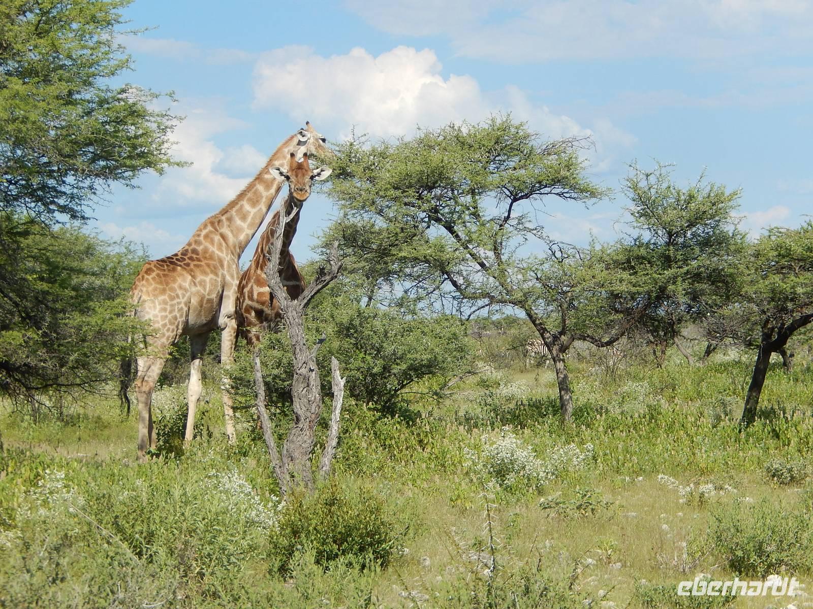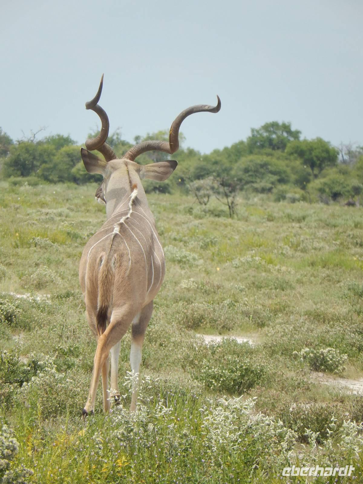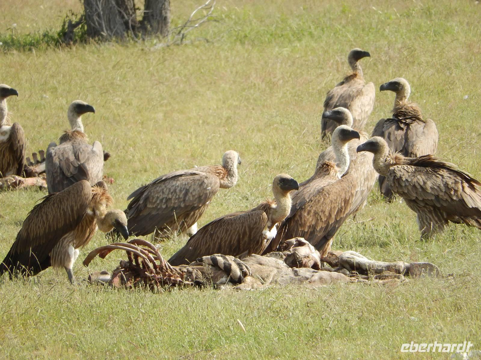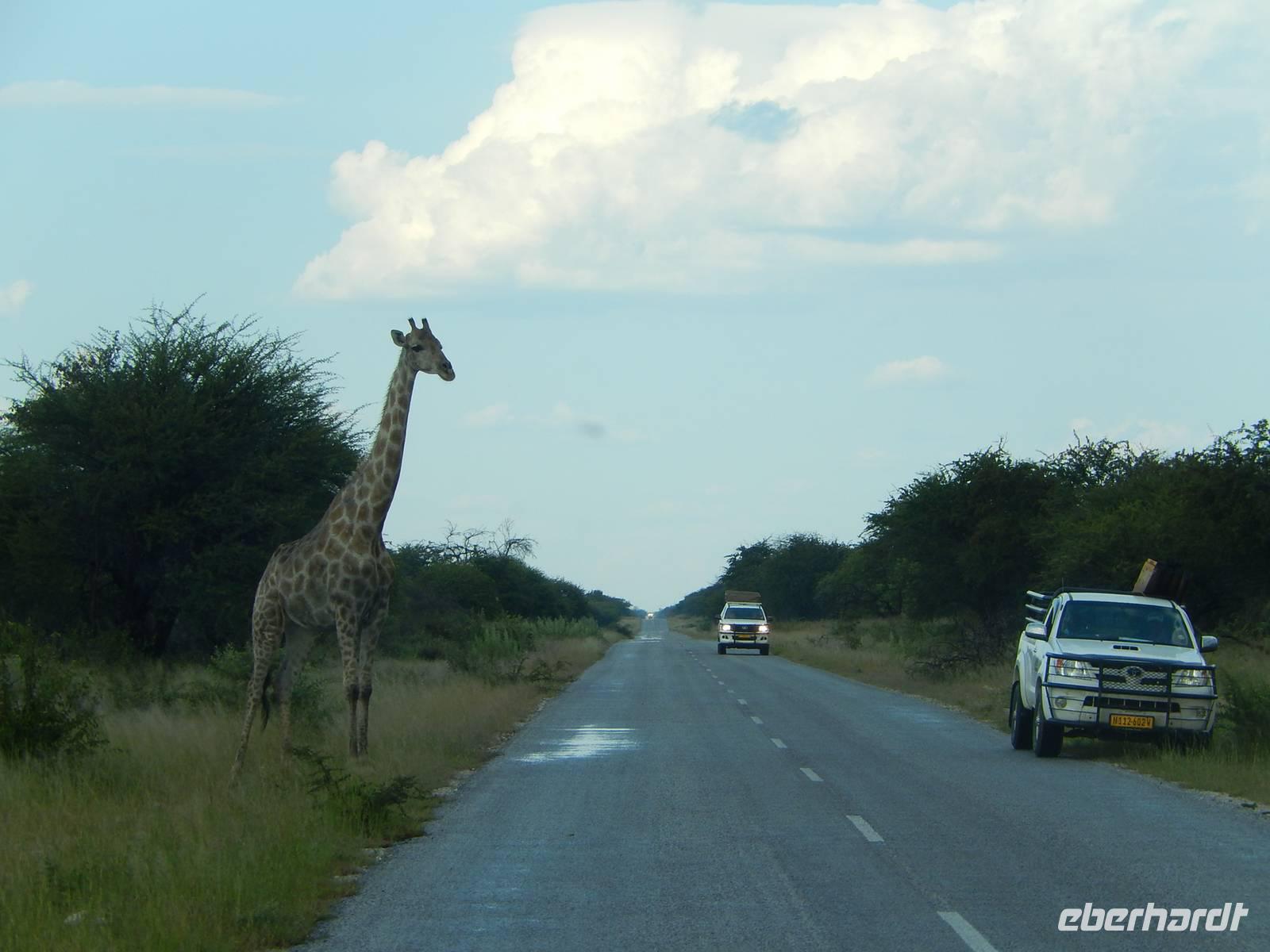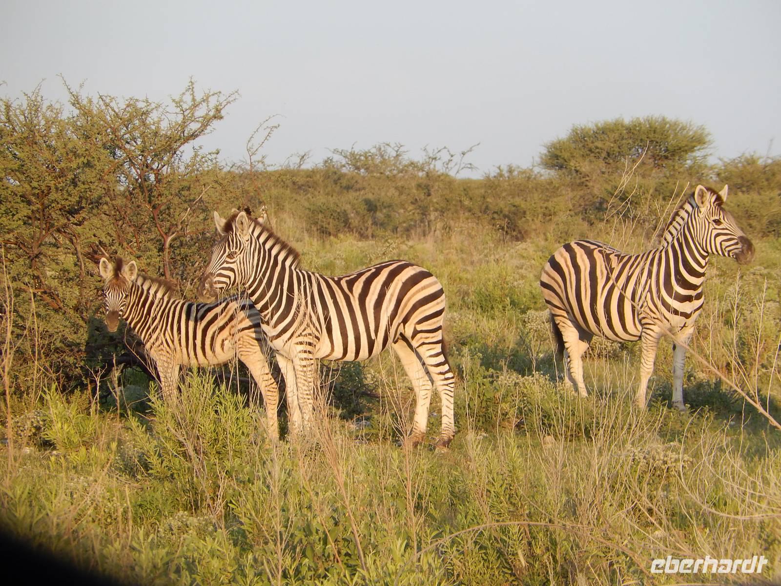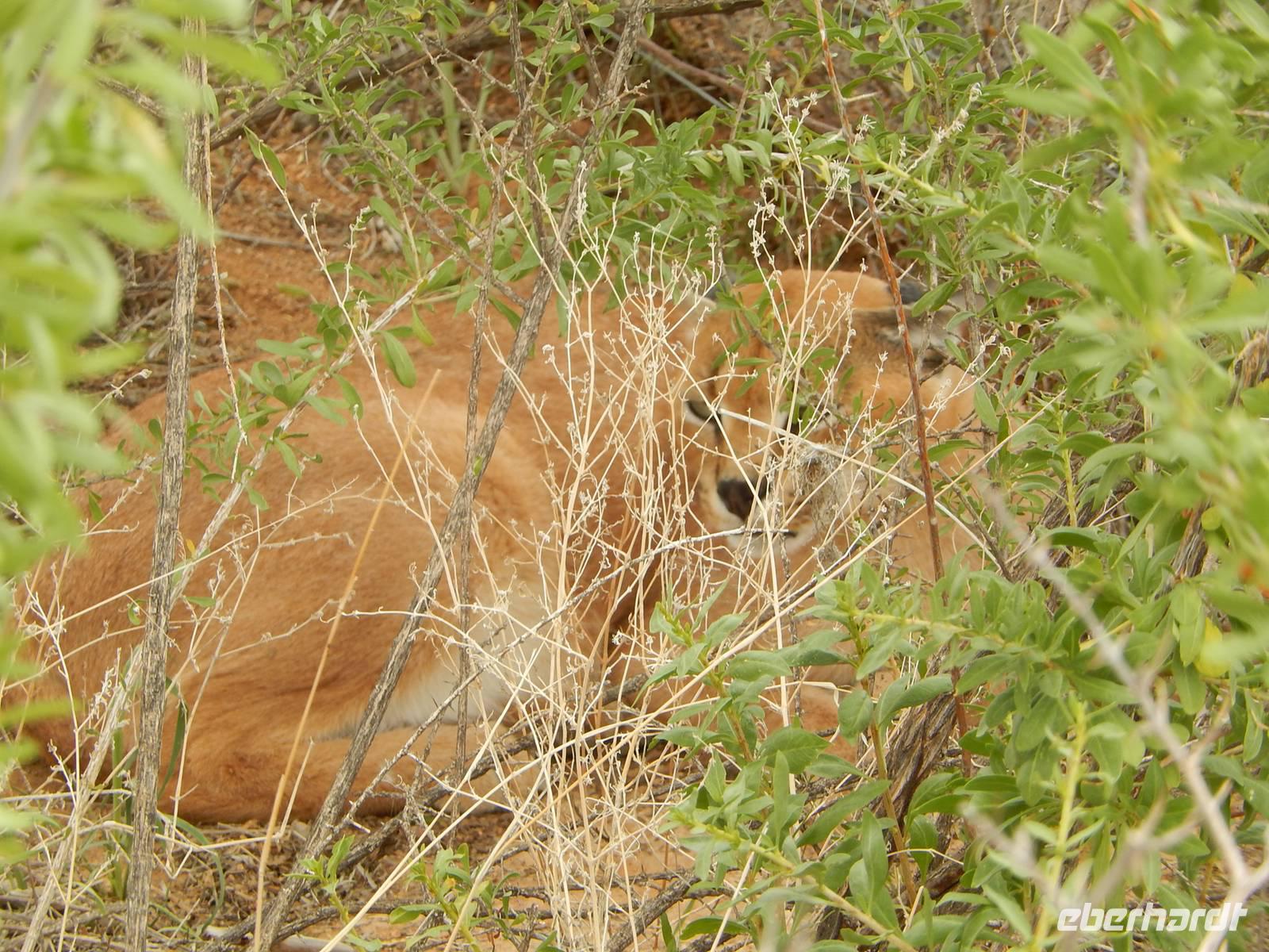 Nach den Erfolgserlebnissen des gestrigen Tages, starten wir heute erwartungsvoll auf unsere morgendliche Safari im offenen Jeep. Pünktlich zum Sonnenaufgang erreichen wir das Gate zum Park und halten die Augen offen. Leider haben wir nur „magere Beute" und sehen nicht einen Vertreter der berühmten Big Five. Richtig fette Beute haben dagegen die Weißrückengeier gemacht, die die sich an einem gerissenen Zebra zu schaffen machen. Dennoch erfreuen wir uns an der Schönheit der Springböcke, Zebras und Strauße. Die hübsche Gabelracke und die Bienenfresser stehen ebenfalls für uns Porträt. Kurz vor der Ausfahrt des Parks sehen wir noch die zweitkleinste Antilope Namibias, den Steinbock, und ein Warzenschwein, das schnell im Gebüsch verschwindet. Nach einer Mittagspause im Camp probieren wir noch einmal unser Glück. Wir bekommen eine Riesentrappe, die Leopardenschildkröte, Erdmännchen, Kudus und eine Herde Gnus vor die Linse. Und dann bekommen wir einen wahrhaft heißen Tipp - am Wasserloch Olifantsbad sollen drei Löwen zu sehen sein. Wir können unseren Augen kaum trauen - aus nächster Nähe können wir die majestätischen Katzen in Ruhe und sogar bei der Paarung beobachten! Was haben wir für ein Glück! Auf dem Rückweg sehen wir noch einen Elefanten und eine Herde Impalas.