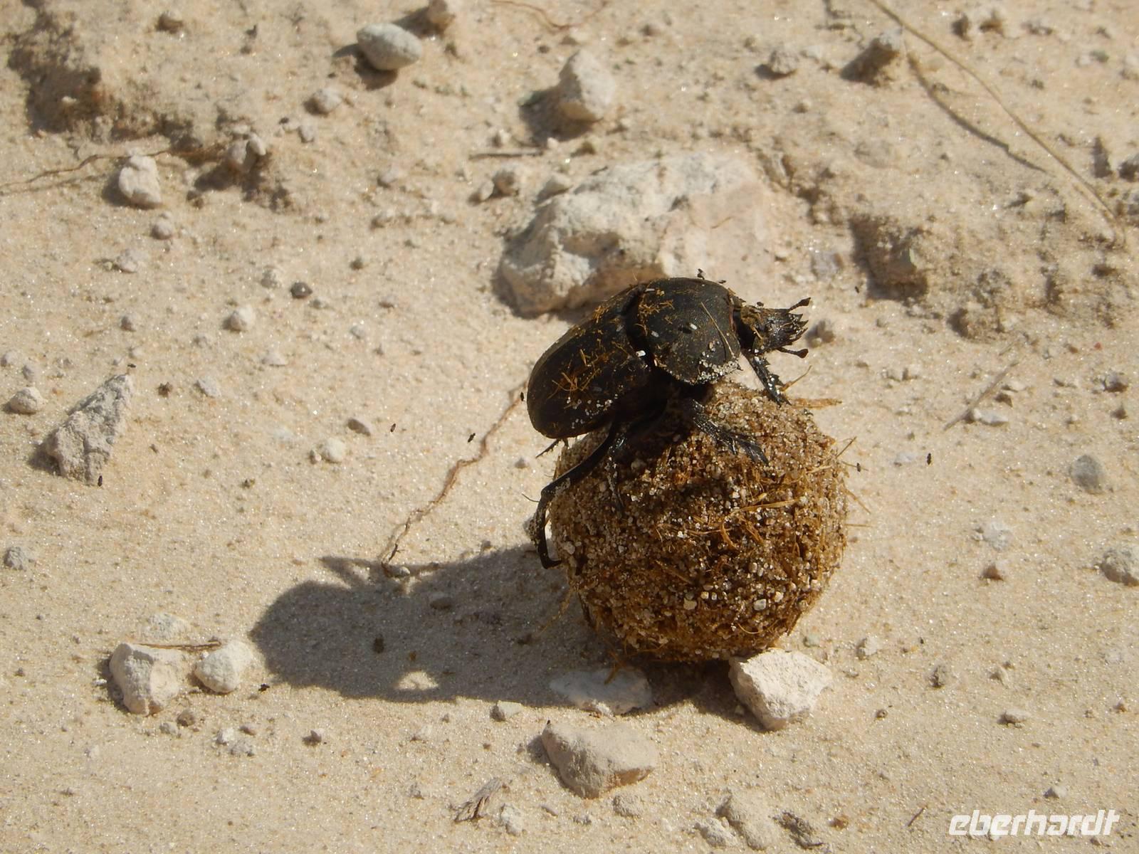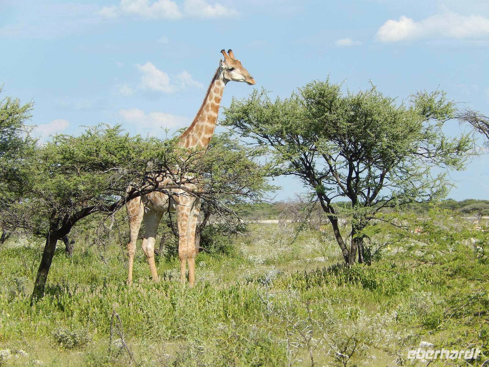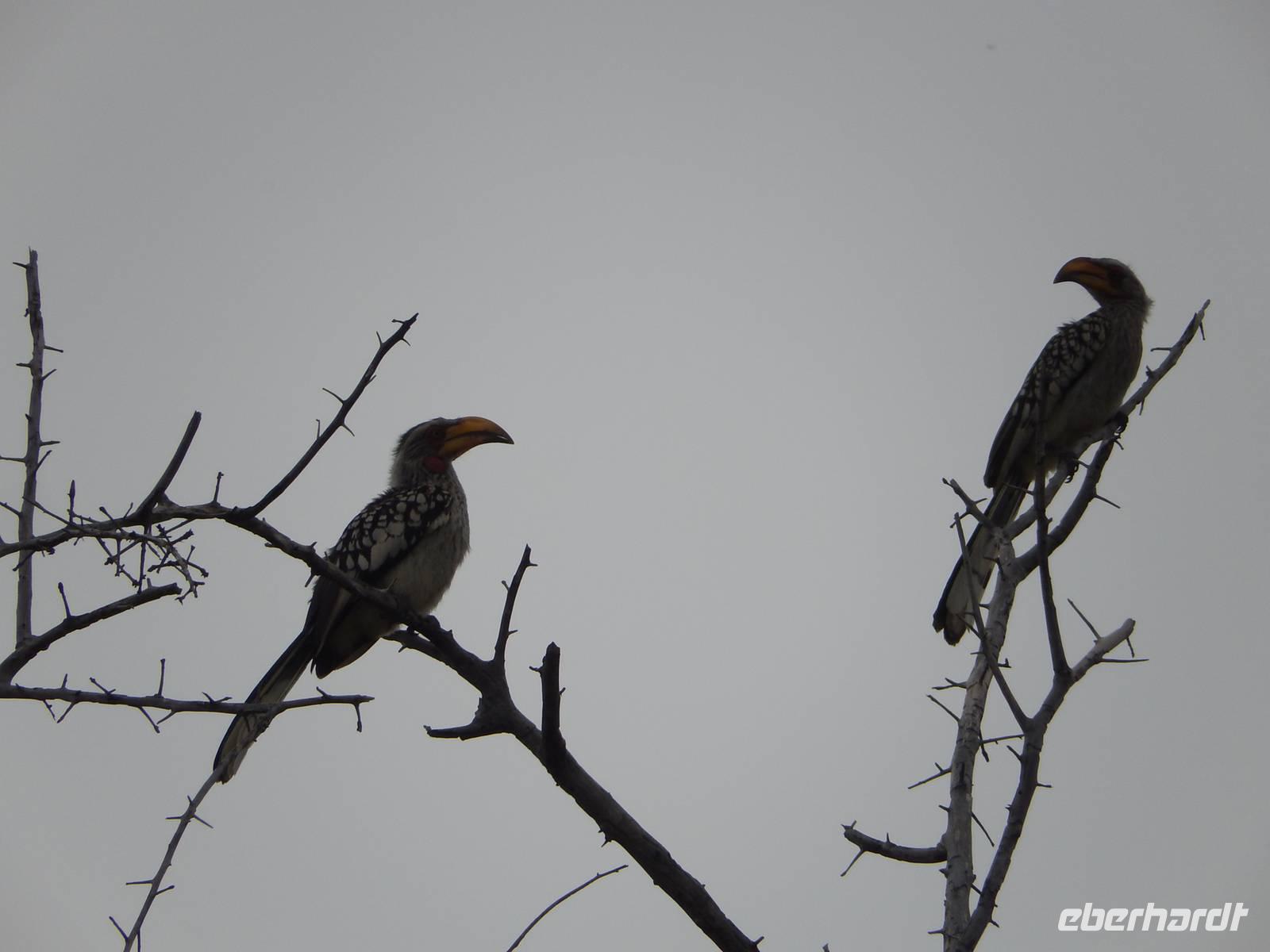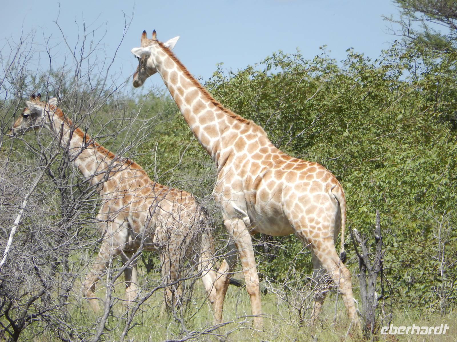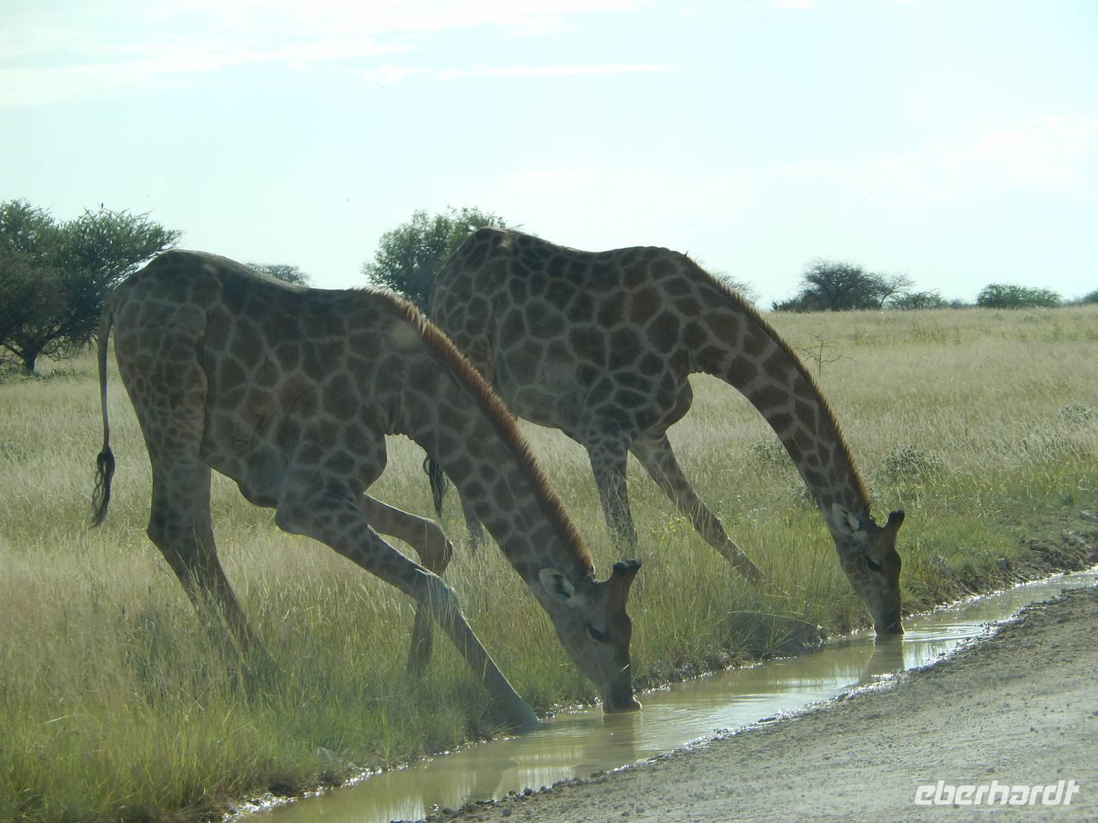 Nach den Erfolgserlebnissen des gestrigen Tages, starten wir heute erwartungsvoll auf unsere morgendliche Safari im offenen Jeep. Pünktlich zum Sonnenaufgang erreichen wir das Gate zum Park und halten die Augen offen. Leider haben wir nur „magere Beute" und sehen nicht einen Vertreter der berühmten Big Five. Richtig fette Beute haben dagegen die Weißrückengeier gemacht, die die sich an einem gerissenen Zebra zu schaffen machen. Dennoch erfreuen wir uns an der Schönheit der Springböcke, Zebras und Strauße. Die hübsche Gabelracke und die Bienenfresser stehen ebenfalls für uns Porträt. Kurz vor der Ausfahrt des Parks sehen wir noch die zweitkleinste Antilope Namibias, den Steinbock, und ein Warzenschwein, das schnell im Gebüsch verschwindet. Nach einer Mittagspause im Camp probieren wir noch einmal unser Glück. Wir bekommen eine Riesentrappe, die Leopardenschildkröte, Erdmännchen, Kudus und eine Herde Gnus vor die Linse. Und dann bekommen wir einen wahrhaft heißen Tipp - am Wasserloch Olifantsbad sollen drei Löwen zu sehen sein. Wir können unseren Augen kaum trauen - aus nächster Nähe können wir die majestätischen Katzen in Ruhe und sogar bei der Paarung beobachten! Was haben wir für ein Glück! Auf dem Rückweg sehen wir noch einen Elefanten und eine Herde Impalas.