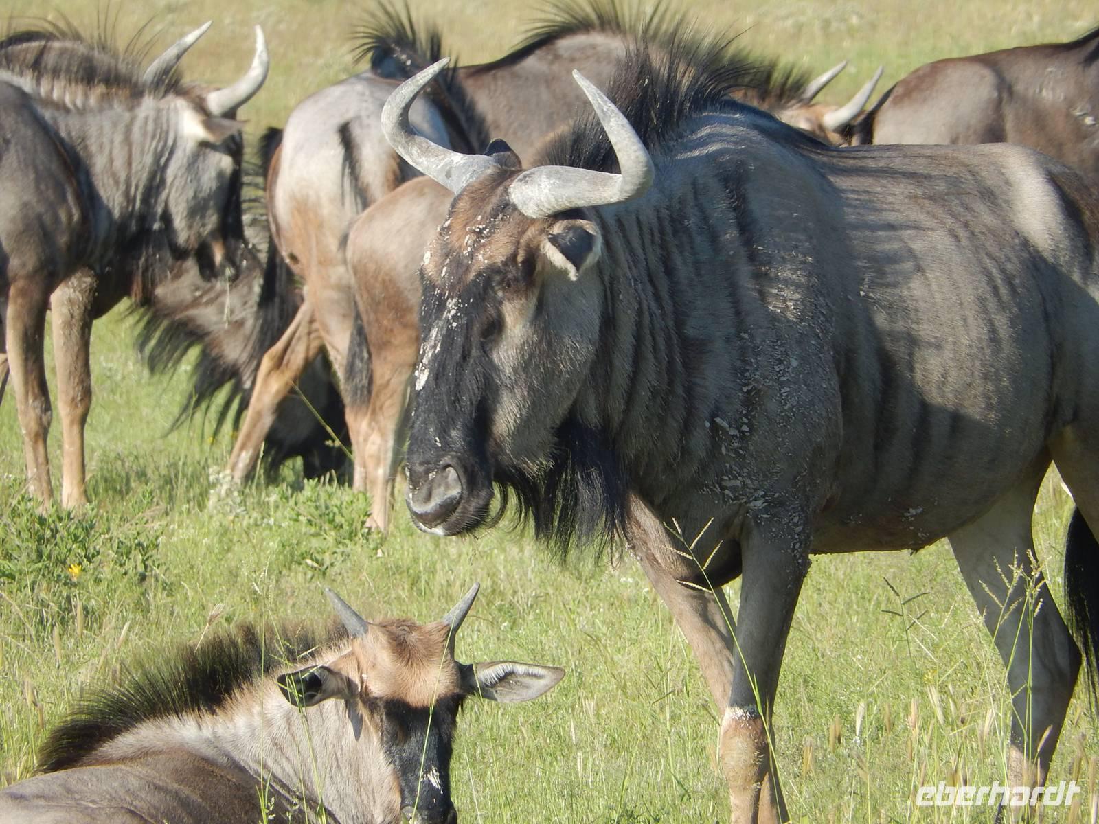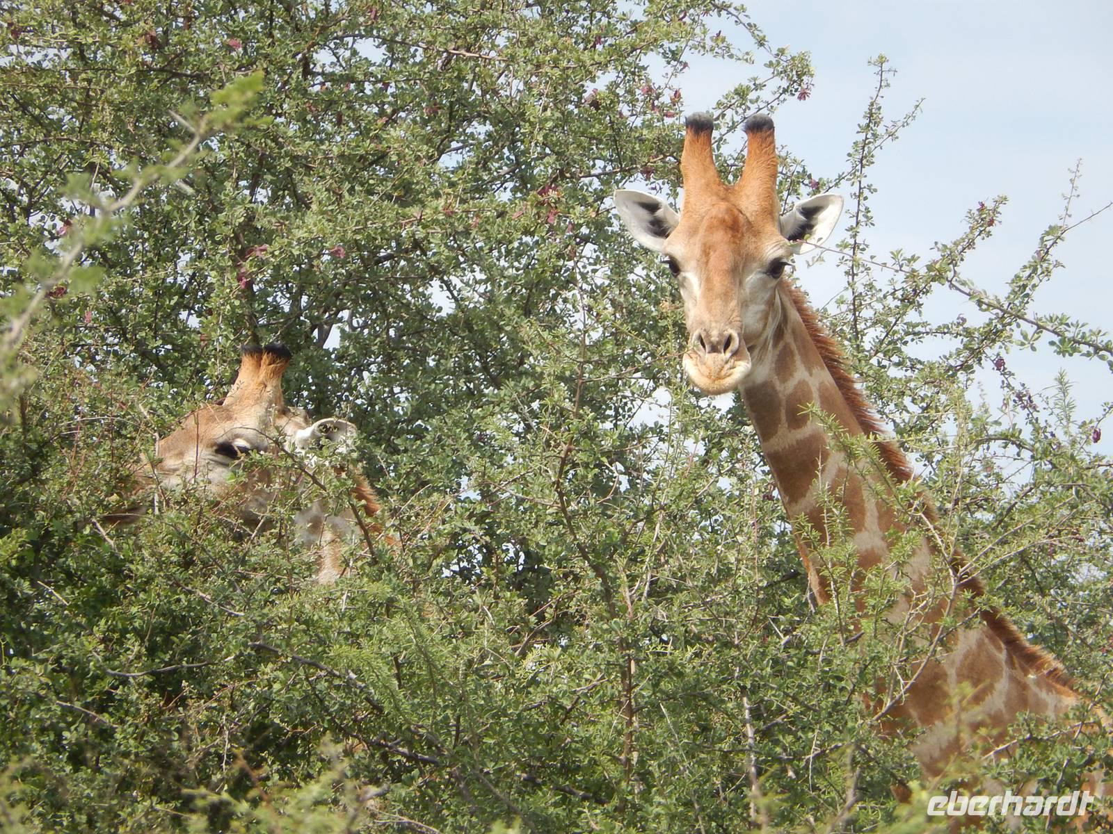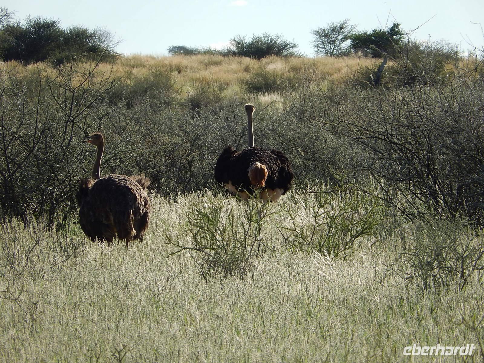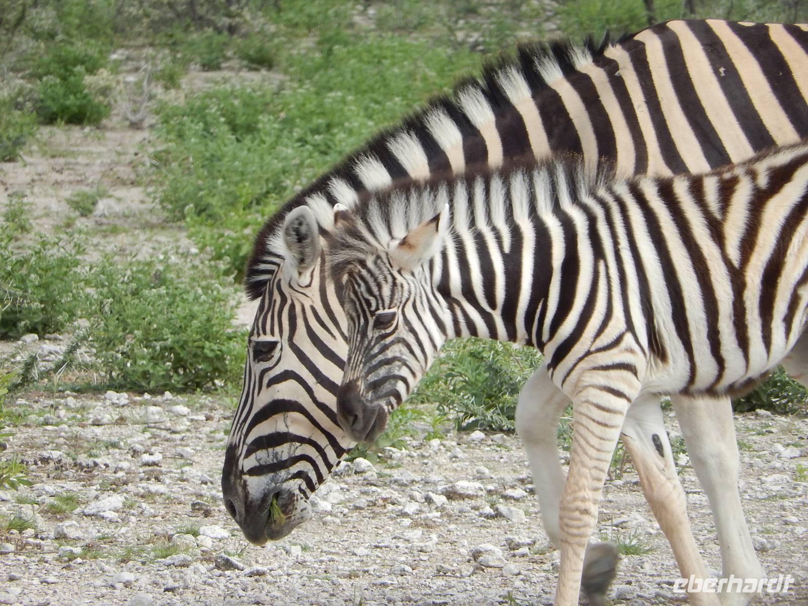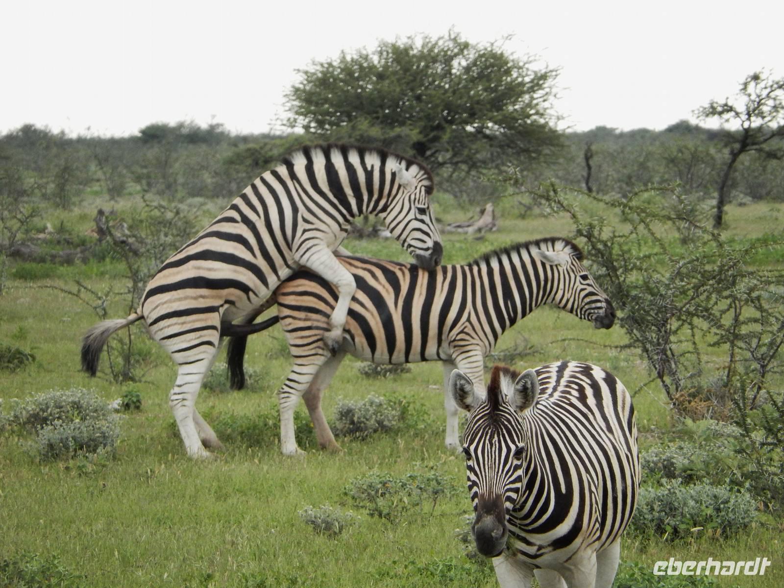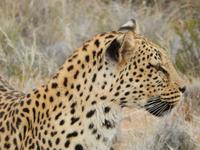 Nach den Erfolgserlebnissen des gestrigen Tages, starten wir heute erwartungsvoll auf unsere morgendliche Safari im offenen Jeep. Pünktlich zum Sonnenaufgang erreichen wir das Gate zum Park und halten die Augen offen. Leider haben wir nur „magere Beute" und sehen nicht einen Vertreter der berühmten Big Five. Richtig fette Beute haben dagegen die Weißrückengeier gemacht, die die sich an einem gerissenen Zebra zu schaffen machen. Dennoch erfreuen wir uns an der Schönheit der Springböcke, Zebras und Strauße. Die hübsche Gabelracke und die Bienenfresser stehen ebenfalls für uns Porträt. Kurz vor der Ausfahrt des Parks sehen wir noch die zweitkleinste Antilope Namibias, den Steinbock, und ein Warzenschwein, das schnell im Gebüsch verschwindet. Nach einer Mittagspause im Camp probieren wir noch einmal unser Glück. Wir bekommen eine Riesentrappe, die Leopardenschildkröte, Erdmännchen, Kudus und eine Herde Gnus vor die Linse. Und dann bekommen wir einen wahrhaft heißen Tipp - am Wasserloch Olifantsbad sollen drei Löwen zu sehen sein. Wir können unseren Augen kaum trauen - aus nächster Nähe können wir die majestätischen Katzen in Ruhe und sogar bei der Paarung beobachten! Was haben wir für ein Glück! Auf dem Rückweg sehen wir noch einen Elefanten und eine Herde Impalas.