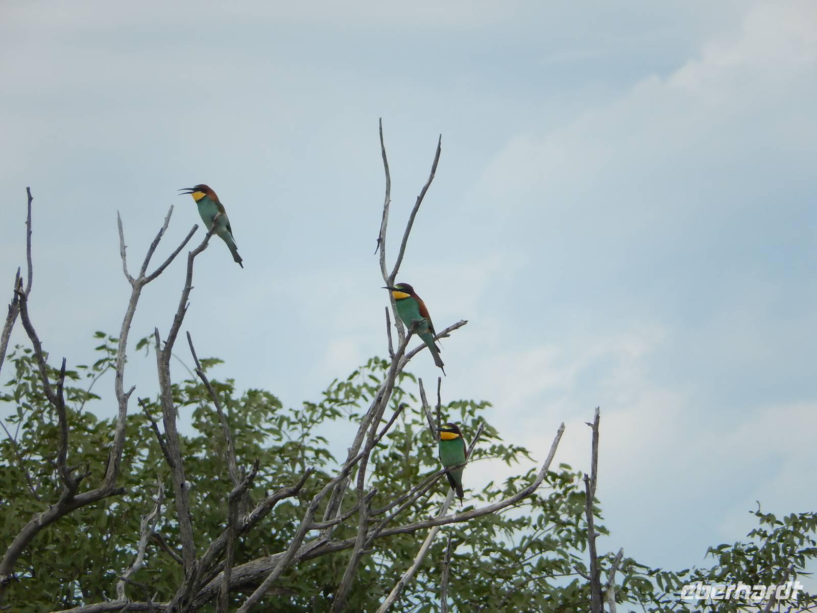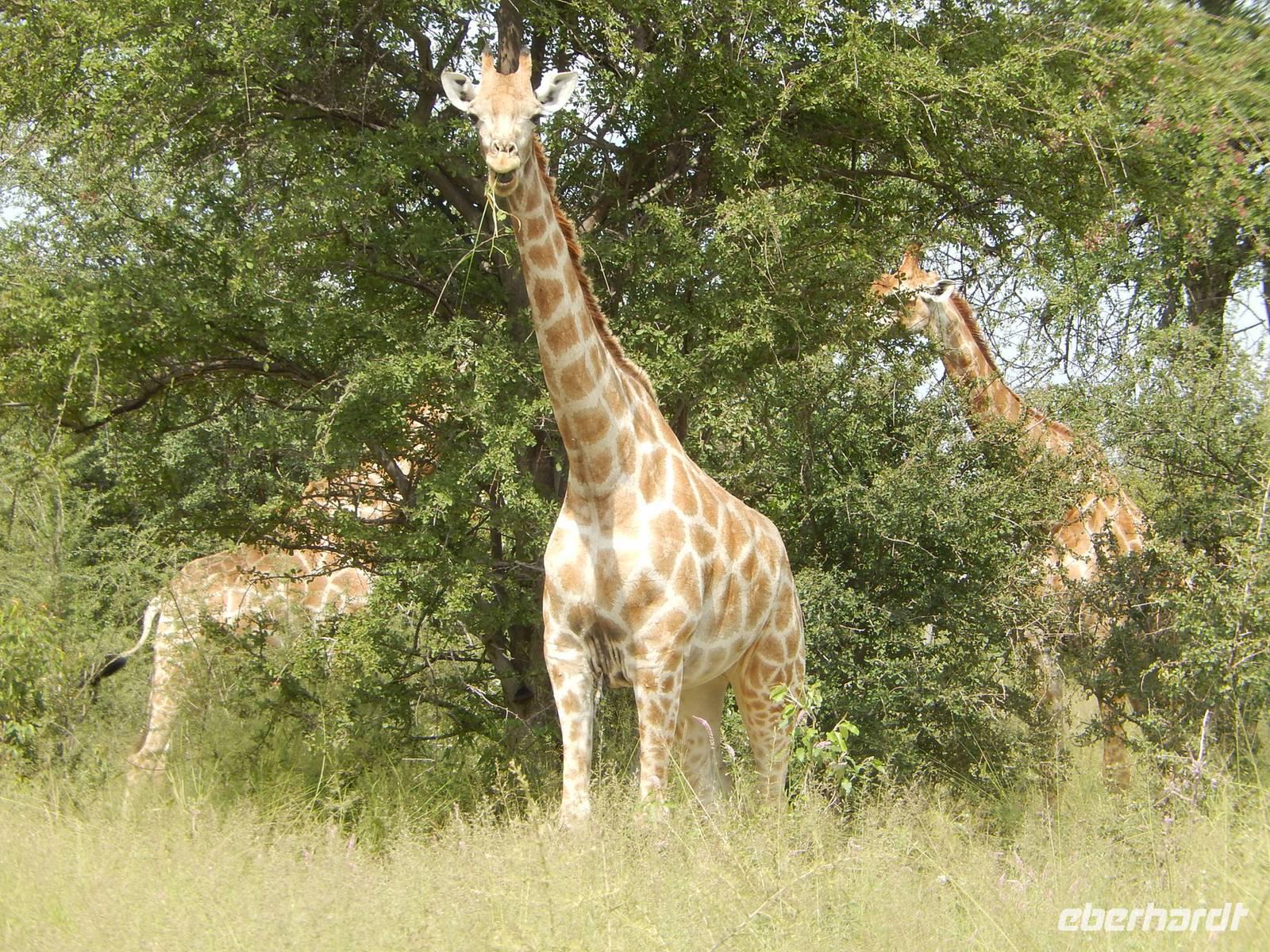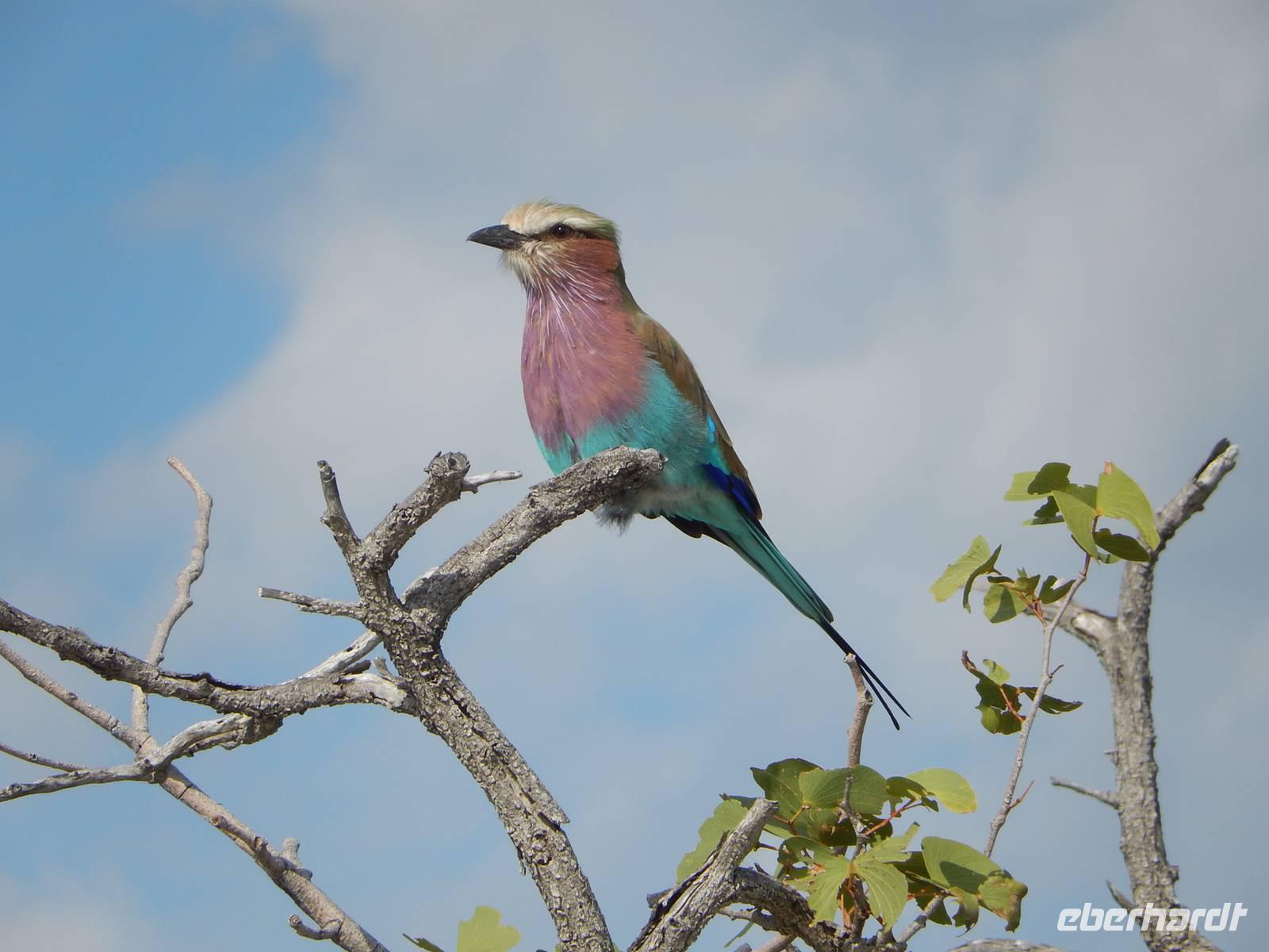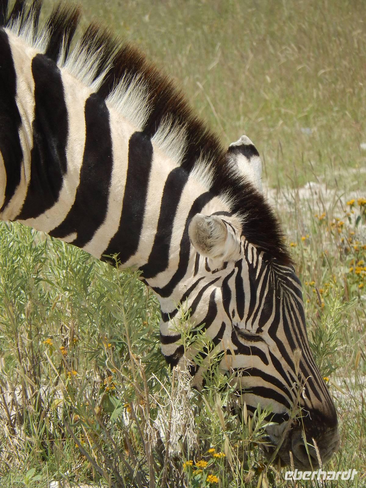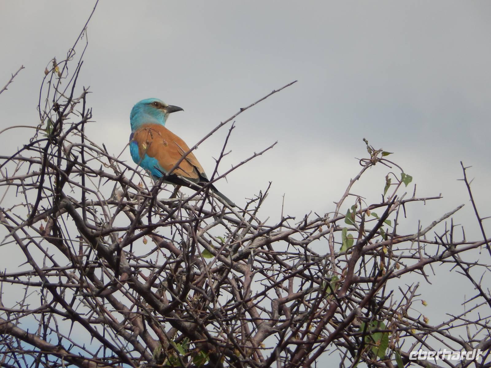 Nach den Erfolgserlebnissen des gestrigen Tages, starten wir heute erwartungsvoll auf unsere morgendliche Safari im offenen Jeep. Pünktlich zum Sonnenaufgang erreichen wir das Gate zum Park und halten die Augen offen. Leider haben wir nur „magere Beute" und sehen nicht einen Vertreter der berühmten Big Five. Richtig fette Beute haben dagegen die Weißrückengeier gemacht, die die sich an einem gerissenen Zebra zu schaffen machen. Dennoch erfreuen wir uns an der Schönheit der Springböcke, Zebras und Strauße. Die hübsche Gabelracke und die Bienenfresser stehen ebenfalls für uns Porträt. Kurz vor der Ausfahrt des Parks sehen wir noch die zweitkleinste Antilope Namibias, den Steinbock, und ein Warzenschwein, das schnell im Gebüsch verschwindet. Nach einer Mittagspause im Camp probieren wir noch einmal unser Glück. Wir bekommen eine Riesentrappe, die Leopardenschildkröte, Erdmännchen, Kudus und eine Herde Gnus vor die Linse. Und dann bekommen wir einen wahrhaft heißen Tipp - am Wasserloch Olifantsbad sollen drei Löwen zu sehen sein. Wir können unseren Augen kaum trauen - aus nächster Nähe können wir die majestätischen Katzen in Ruhe und sogar bei der Paarung beobachten! Was haben wir für ein Glück! Auf dem Rückweg sehen wir noch einen Elefanten und eine Herde Impalas.