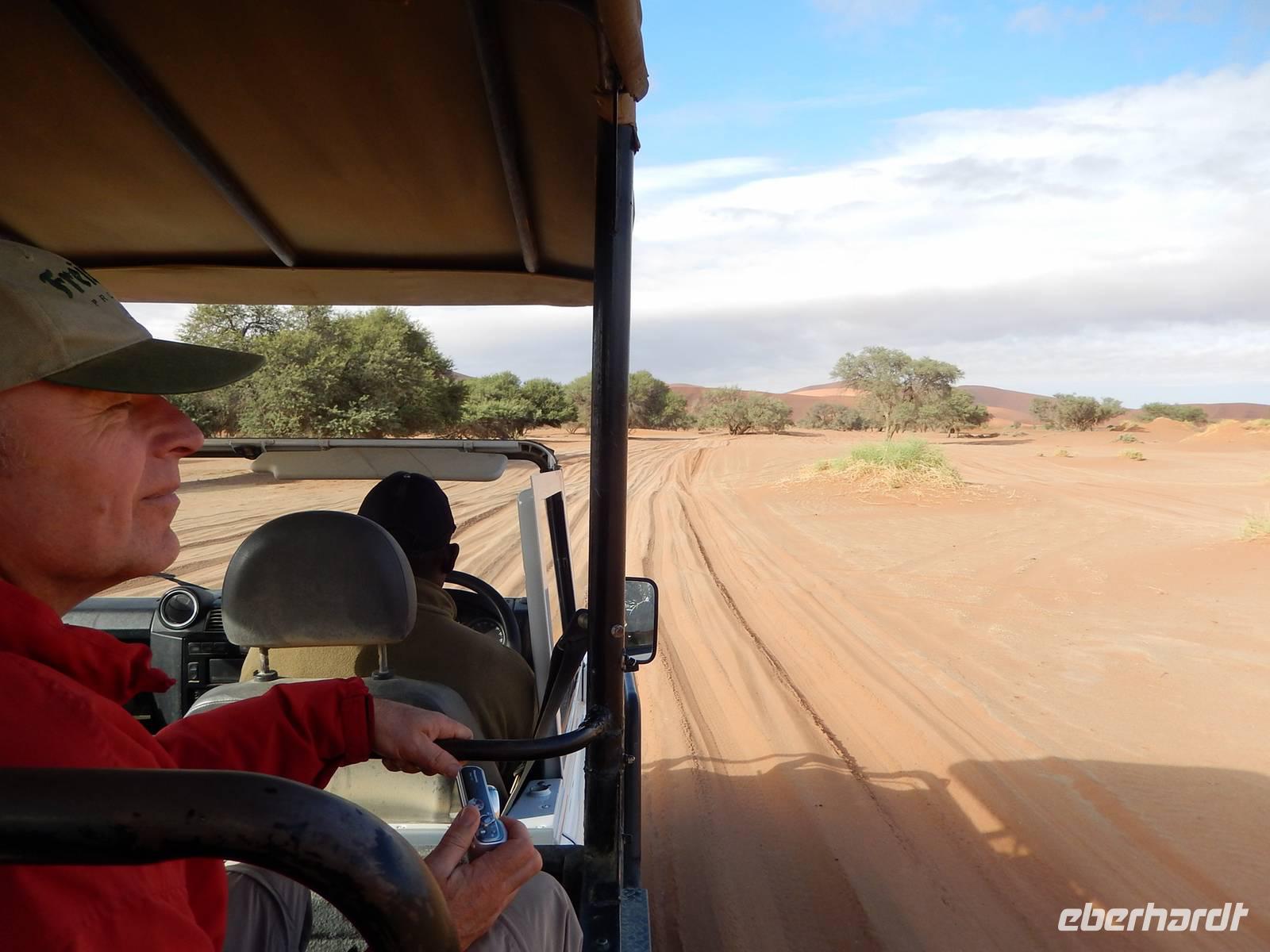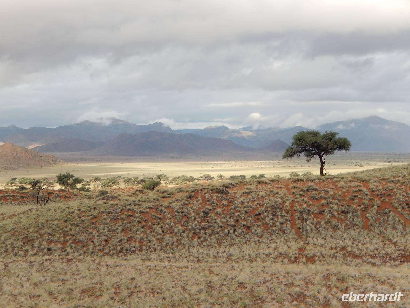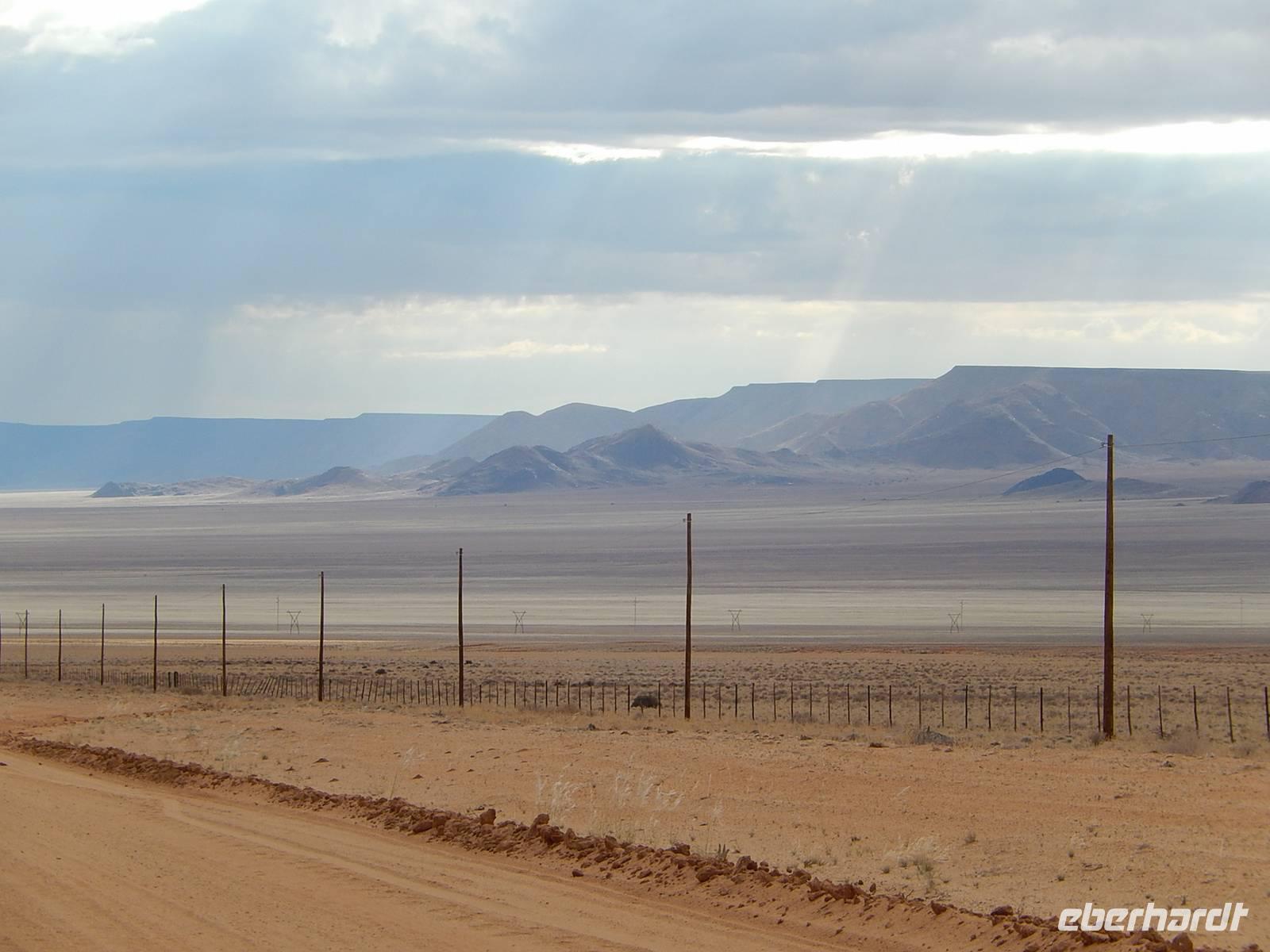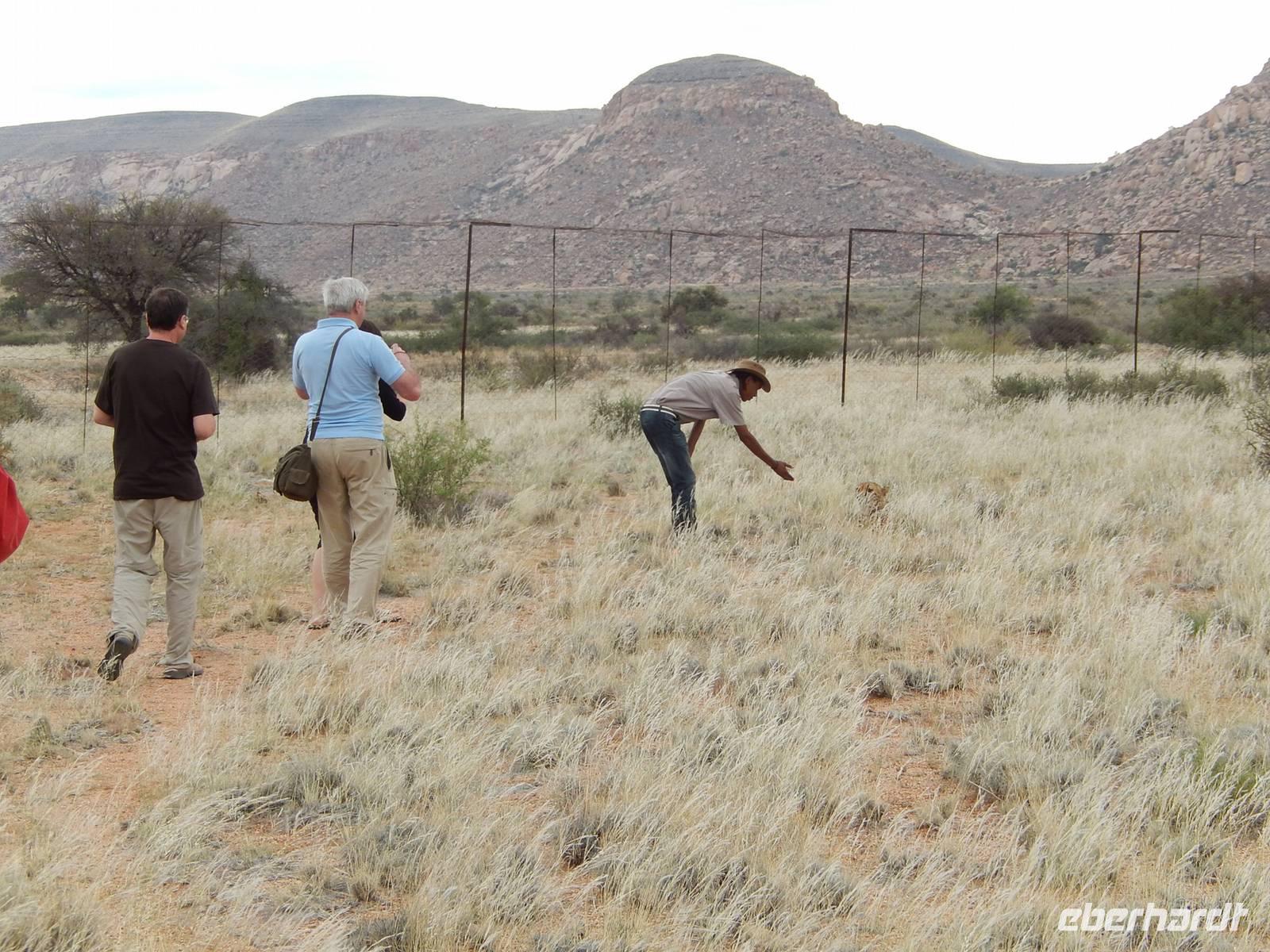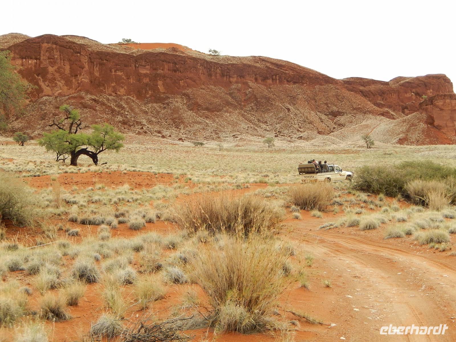 Über Helmeringhausen führt uns die Route weiter nach Norden. Wieder zeigt sich, wie dünn das Land besiedelt ist. Nur vereinzelt passieren wir einsame Farmhöfe. Die sandige Piste wird zusehends abenteuerlich, denn der Regen hat Passagen mit Wasser gefüllt, die wir durchfahren müssen. Glücklicherweise kommen wir trockenen Fußes voran und über überqueren später den 1.650 Meter hohen Tsaris-Pass. Gegen Mittag erreichen wir die Hammerstein Lodge, wo wir im wahrsten Sinne des Wortes einen „Catwalk" machen können. In 3 großen Gehegen werden verwaiste Cracals, eine Leoparden-Dame und ein Geparden-Pärchen gehalten. Zugegeben, mit einem leicht mulmigen Gefühl betreten wir die Gehege. Die beiden Geparden posieren für unsere Kameras und wir können fast auf Tuchfühlung gehen. Die Eleganz und Anmut der Großkatzen hat uns sehr beeindruckt. Danach hat Klaus wohl eine „Autowäsche" bestellt, denn es gießt wie aus Eimern. Die Landschaft ist mit einem zart-grünen Grasteppich überzogen - Wüste bei Sonnenschein kann ja jeder haben. Unser Ziel ist die Namib Desert Lodge, die zur Zeit mehr von grünem Gras als von Wüste umgeben ist. Wir befinden uns am Rande des Namib Naukluft Parks, dem größten Naturschutzgebiet Namibias in der ältesten Wüste der Welt.