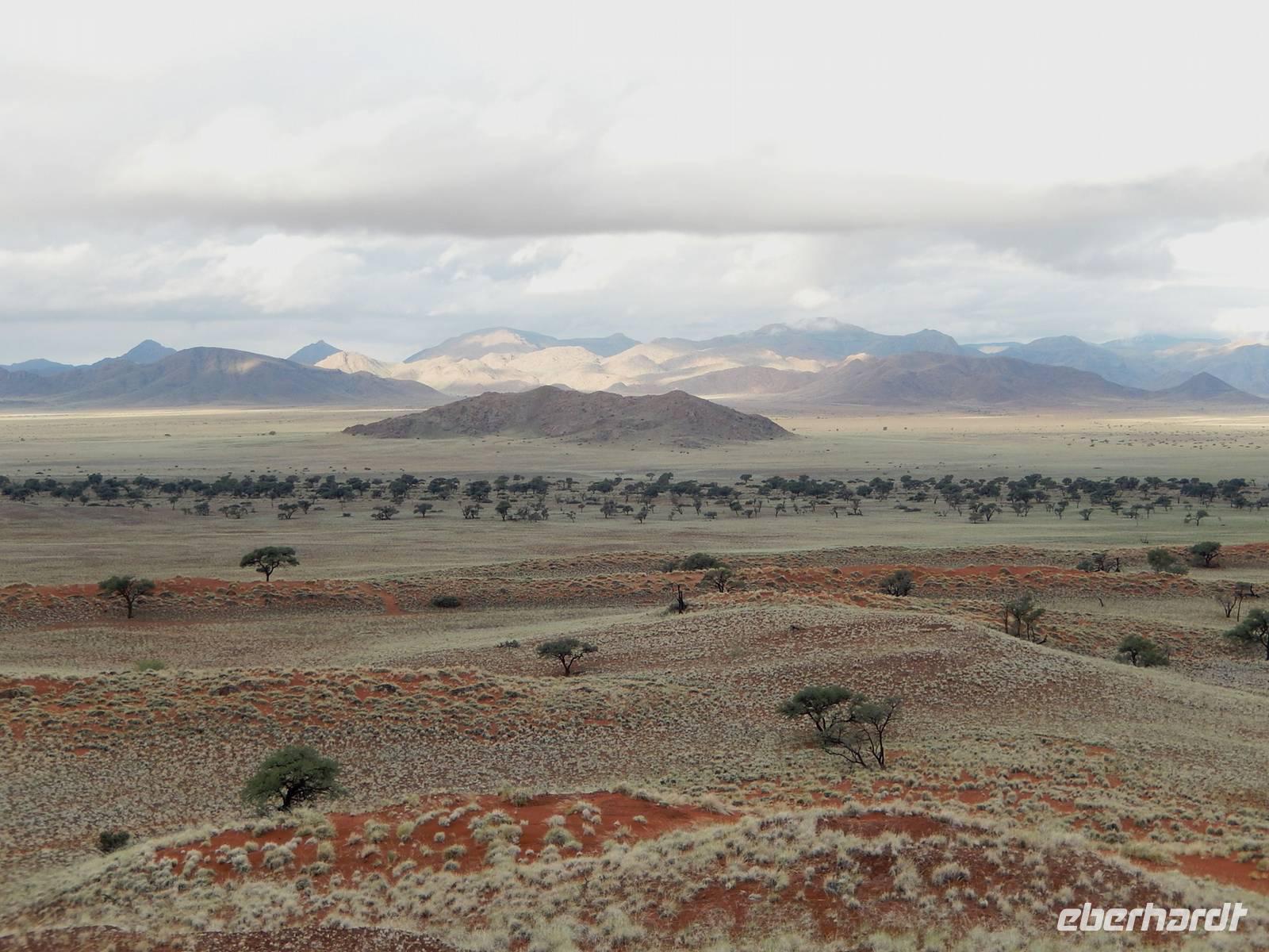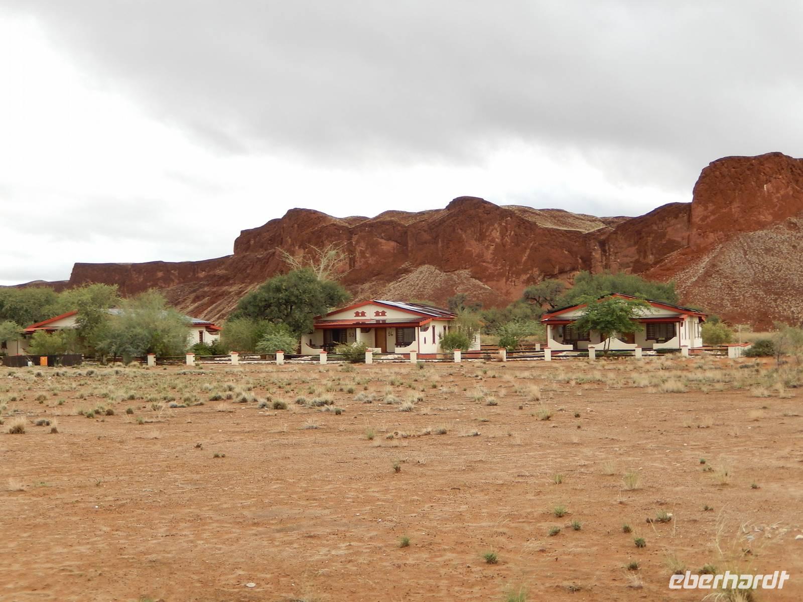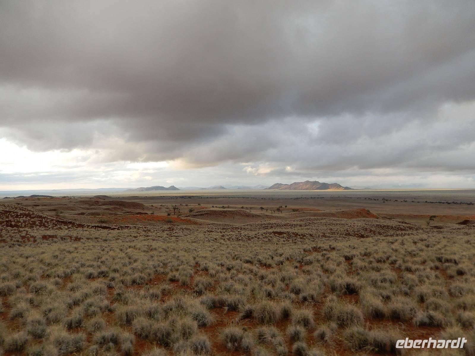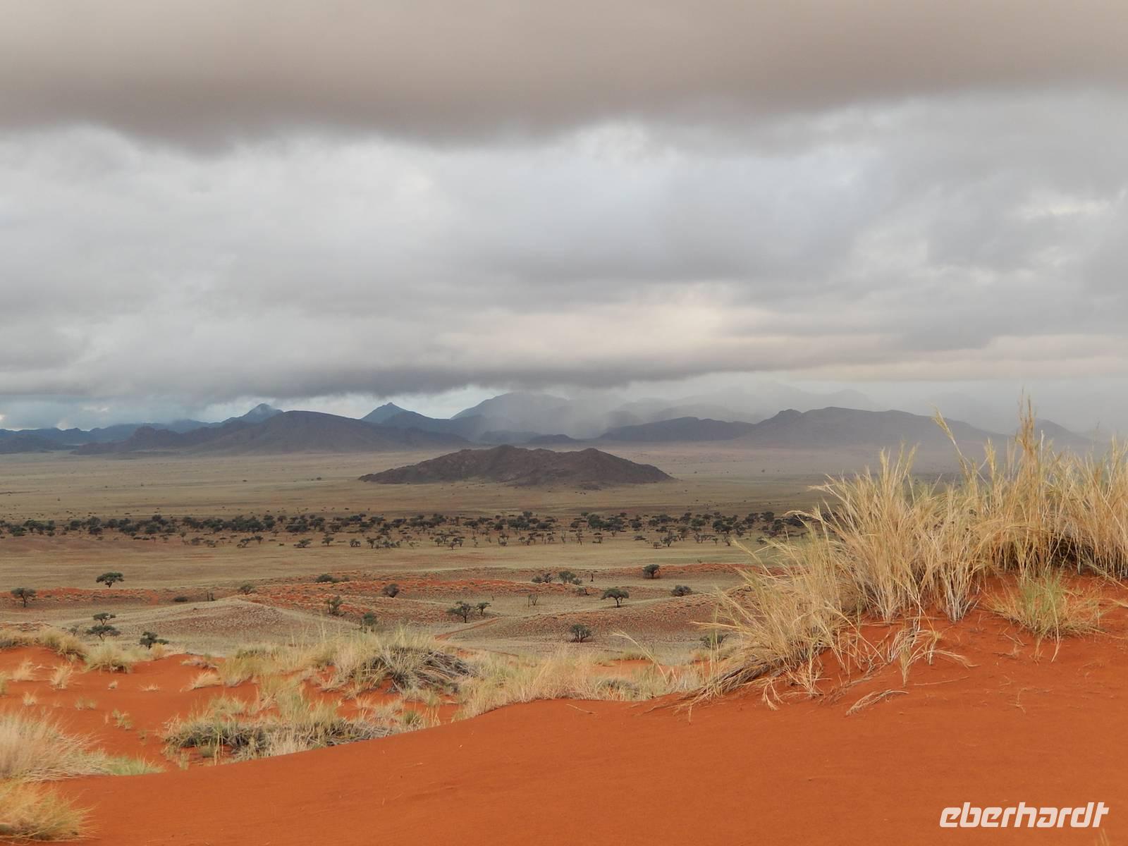 Über Helmeringhausen führt uns die Route weiter nach Norden. Wieder zeigt sich, wie dünn das Land besiedelt ist. Nur vereinzelt passieren wir einsame Farmhöfe. Die sandige Piste wird zusehends abenteuerlich, denn der Regen hat Passagen mit Wasser gefüllt, die wir durchfahren müssen. Glücklicherweise kommen wir trockenen Fußes voran und über überqueren später den 1.650 Meter hohen Tsaris-Pass. Gegen Mittag erreichen wir die Hammerstein Lodge, wo wir im wahrsten Sinne des Wortes einen „Catwalk" machen können. In 3 großen Gehegen werden verwaiste Cracals, eine Leoparden-Dame und ein Geparden-Pärchen gehalten. Zugegeben, mit einem leicht mulmigen Gefühl betreten wir die Gehege. Die beiden Geparden posieren für unsere Kameras und wir können fast auf Tuchfühlung gehen. Die Eleganz und Anmut der Großkatzen hat uns sehr beeindruckt. Danach hat Klaus wohl eine „Autowäsche" bestellt, denn es gießt wie aus Eimern. Die Landschaft ist mit einem zart-grünen Grasteppich überzogen - Wüste bei Sonnenschein kann ja jeder haben. Unser Ziel ist die Namib Desert Lodge, die zur Zeit mehr von grünem Gras als von Wüste umgeben ist. Wir befinden uns am Rande des Namib Naukluft Parks, dem größten Naturschutzgebiet Namibias in der ältesten Wüste der Welt.