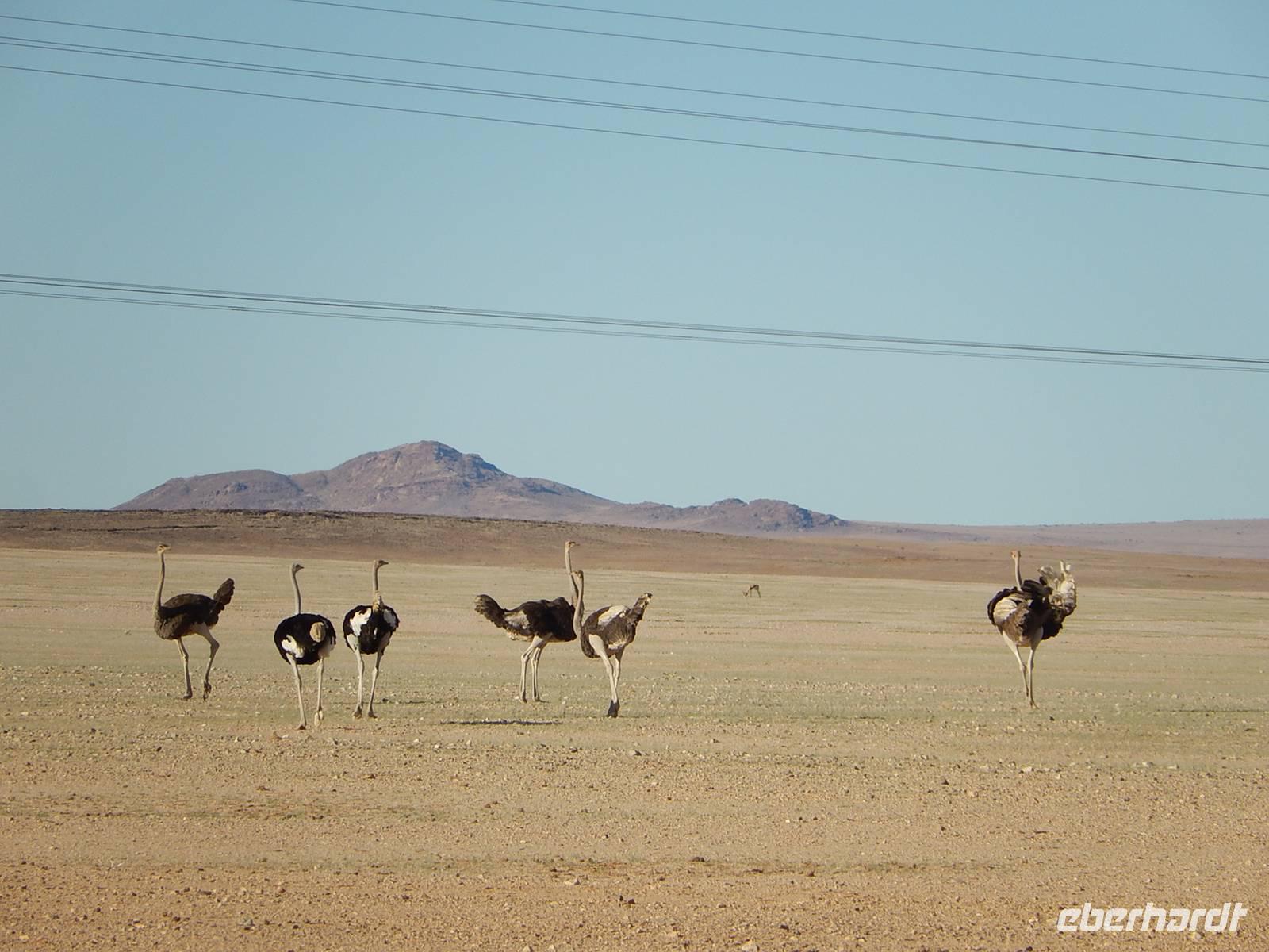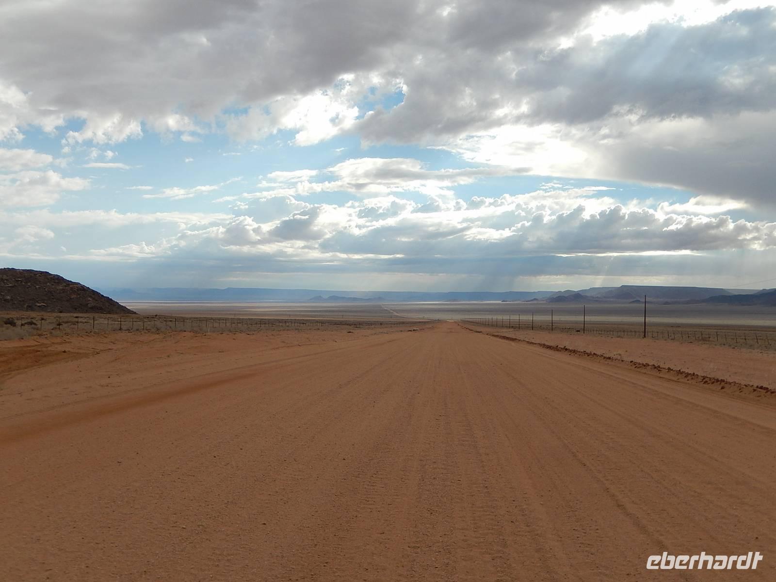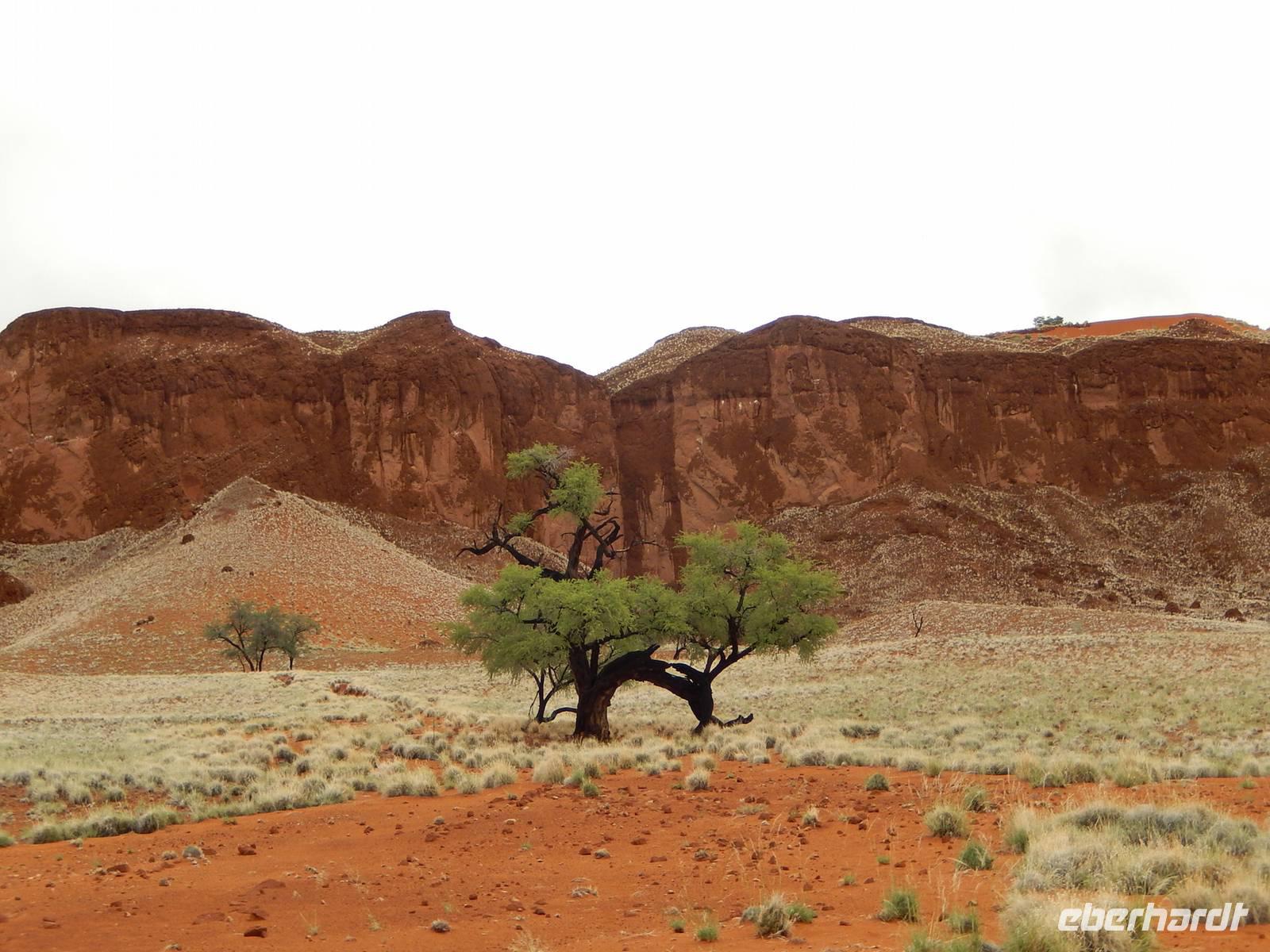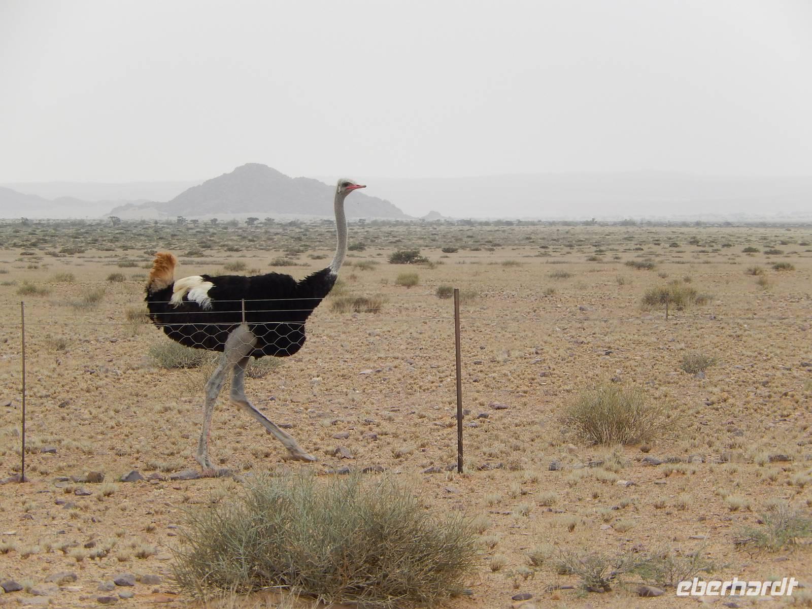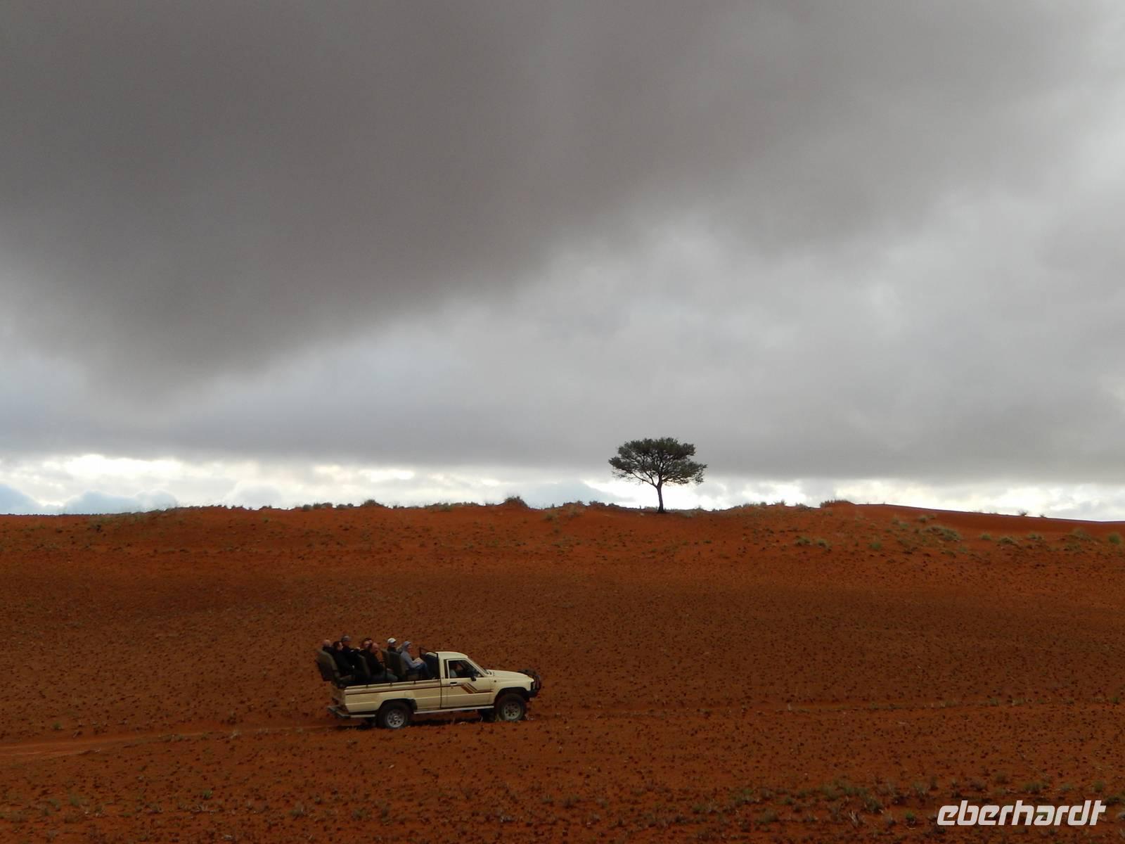 Über Helmeringhausen führt uns die Route weiter nach Norden. Wieder zeigt sich, wie dünn das Land besiedelt ist. Nur vereinzelt passieren wir einsame Farmhöfe. Die sandige Piste wird zusehends abenteuerlich, denn der Regen hat Passagen mit Wasser gefüllt, die wir durchfahren müssen. Glücklicherweise kommen wir trockenen Fußes voran und über überqueren später den 1.650 Meter hohen Tsaris-Pass. Gegen Mittag erreichen wir die Hammerstein Lodge, wo wir im wahrsten Sinne des Wortes einen „Catwalk" machen können. In 3 großen Gehegen werden verwaiste Cracals, eine Leoparden-Dame und ein Geparden-Pärchen gehalten. Zugegeben, mit einem leicht mulmigen Gefühl betreten wir die Gehege. Die beiden Geparden posieren für unsere Kameras und wir können fast auf Tuchfühlung gehen. Die Eleganz und Anmut der Großkatzen hat uns sehr beeindruckt. Danach hat Klaus wohl eine „Autowäsche" bestellt, denn es gießt wie aus Eimern. Die Landschaft ist mit einem zart-grünen Grasteppich überzogen - Wüste bei Sonnenschein kann ja jeder haben. Unser Ziel ist die Namib Desert Lodge, die zur Zeit mehr von grünem Gras als von Wüste umgeben ist. Wir befinden uns am Rande des Namib Naukluft Parks, dem größten Naturschutzgebiet Namibias in der ältesten Wüste der Welt.