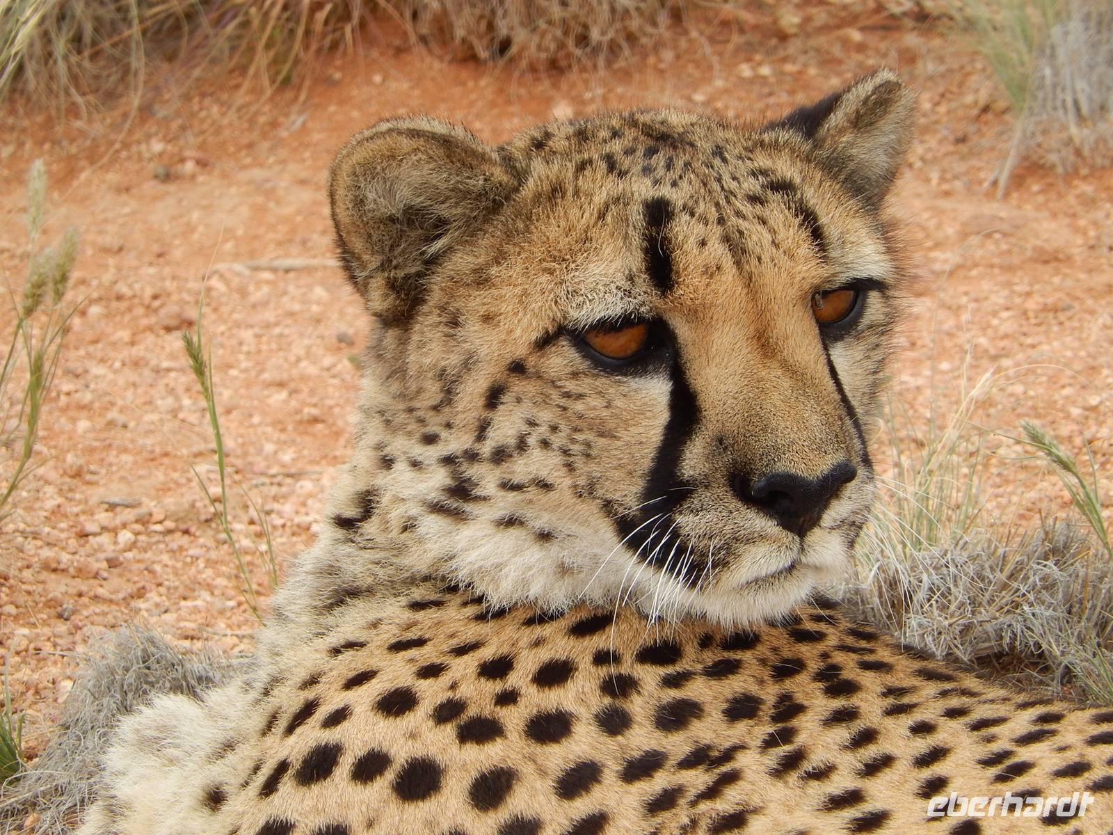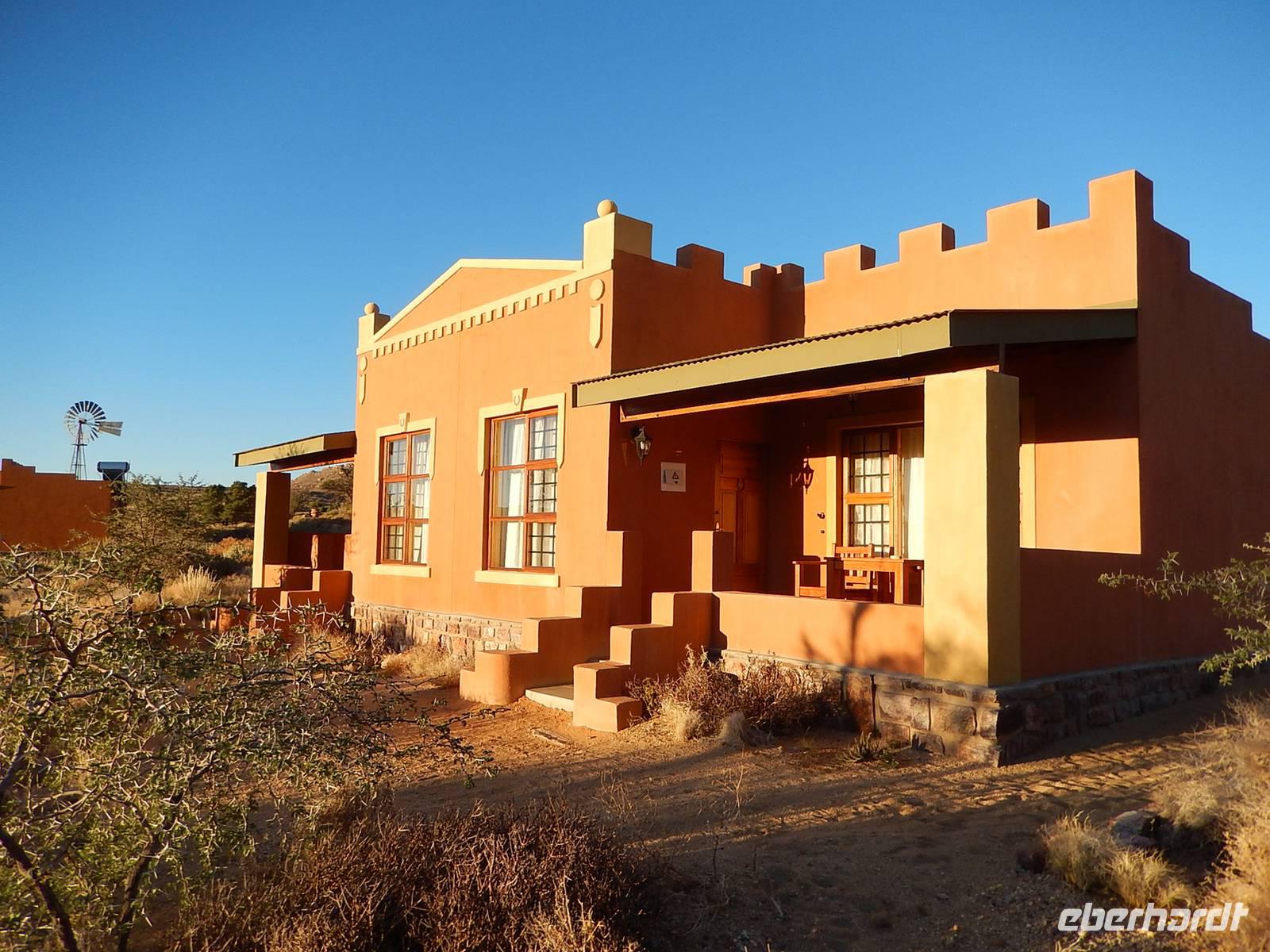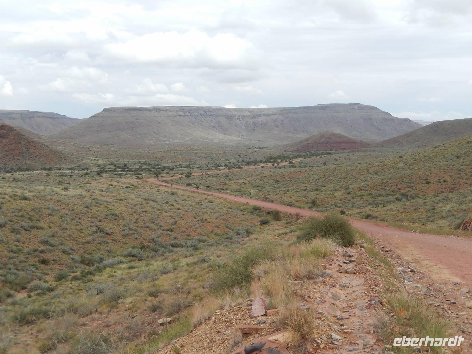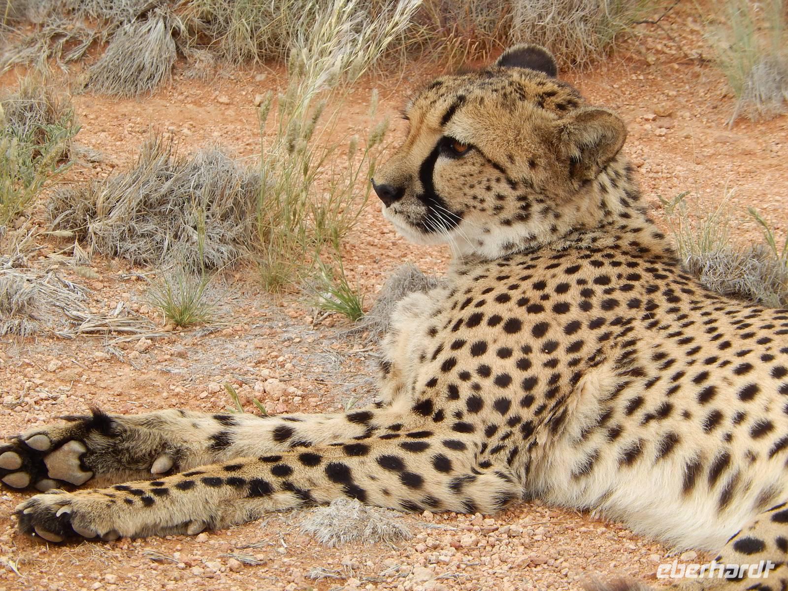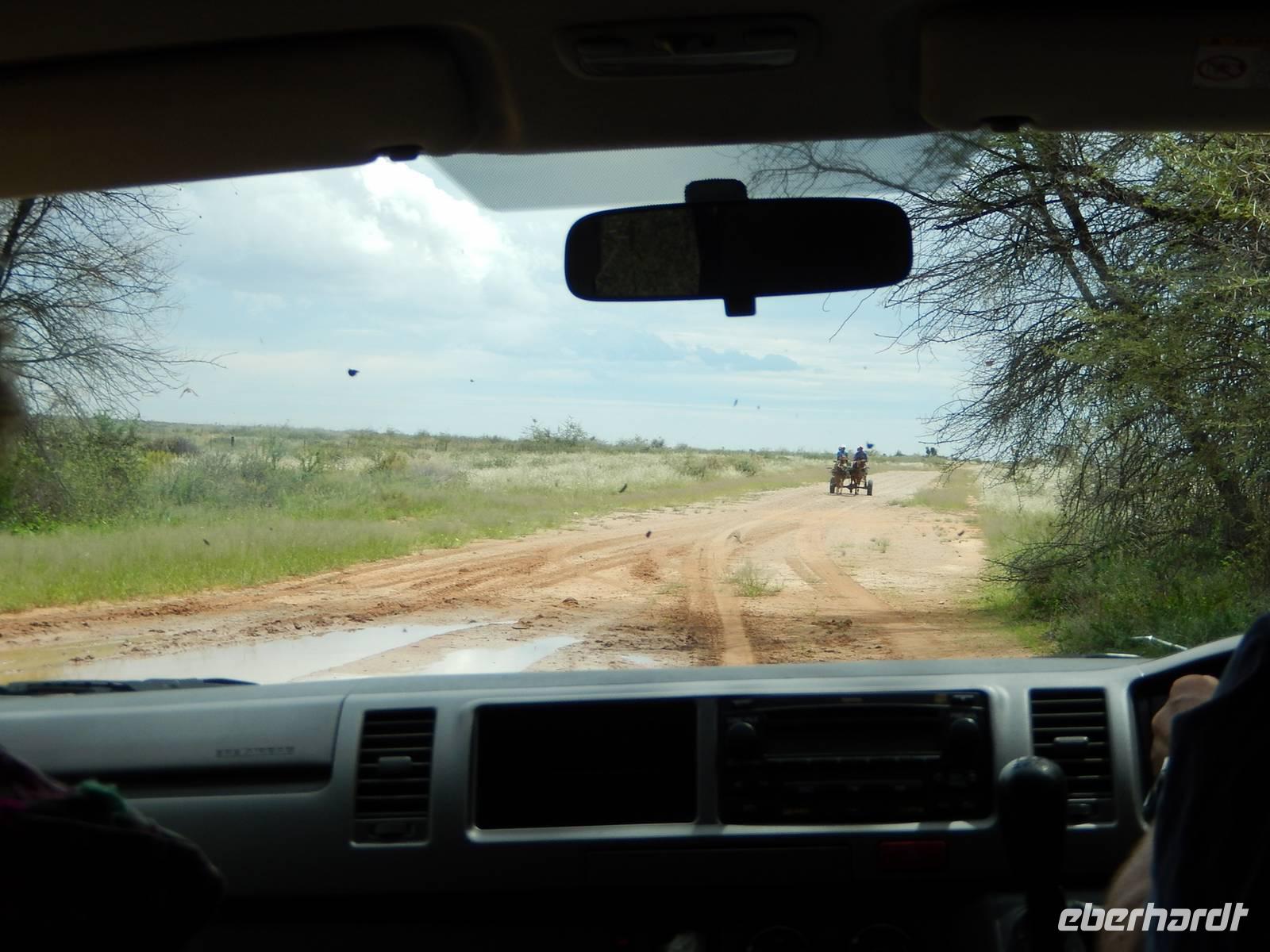 Über Helmeringhausen führt uns die Route weiter nach Norden. Wieder zeigt sich, wie dünn das Land besiedelt ist. Nur vereinzelt passieren wir einsame Farmhöfe. Die sandige Piste wird zusehends abenteuerlich, denn der Regen hat Passagen mit Wasser gefüllt, die wir durchfahren müssen. Glücklicherweise kommen wir trockenen Fußes voran und über überqueren später den 1.650 Meter hohen Tsaris-Pass. Gegen Mittag erreichen wir die Hammerstein Lodge, wo wir im wahrsten Sinne des Wortes einen „Catwalk" machen können. In 3 großen Gehegen werden verwaiste Cracals, eine Leoparden-Dame und ein Geparden-Pärchen gehalten. Zugegeben, mit einem leicht mulmigen Gefühl betreten wir die Gehege. Die beiden Geparden posieren für unsere Kameras und wir können fast auf Tuchfühlung gehen. Die Eleganz und Anmut der Großkatzen hat uns sehr beeindruckt. Danach hat Klaus wohl eine „Autowäsche" bestellt, denn es gießt wie aus Eimern. Die Landschaft ist mit einem zart-grünen Grasteppich überzogen - Wüste bei Sonnenschein kann ja jeder haben. Unser Ziel ist die Namib Desert Lodge, die zur Zeit mehr von grünem Gras als von Wüste umgeben ist. Wir befinden uns am Rande des Namib Naukluft Parks, dem größten Naturschutzgebiet Namibias in der ältesten Wüste der Welt.
