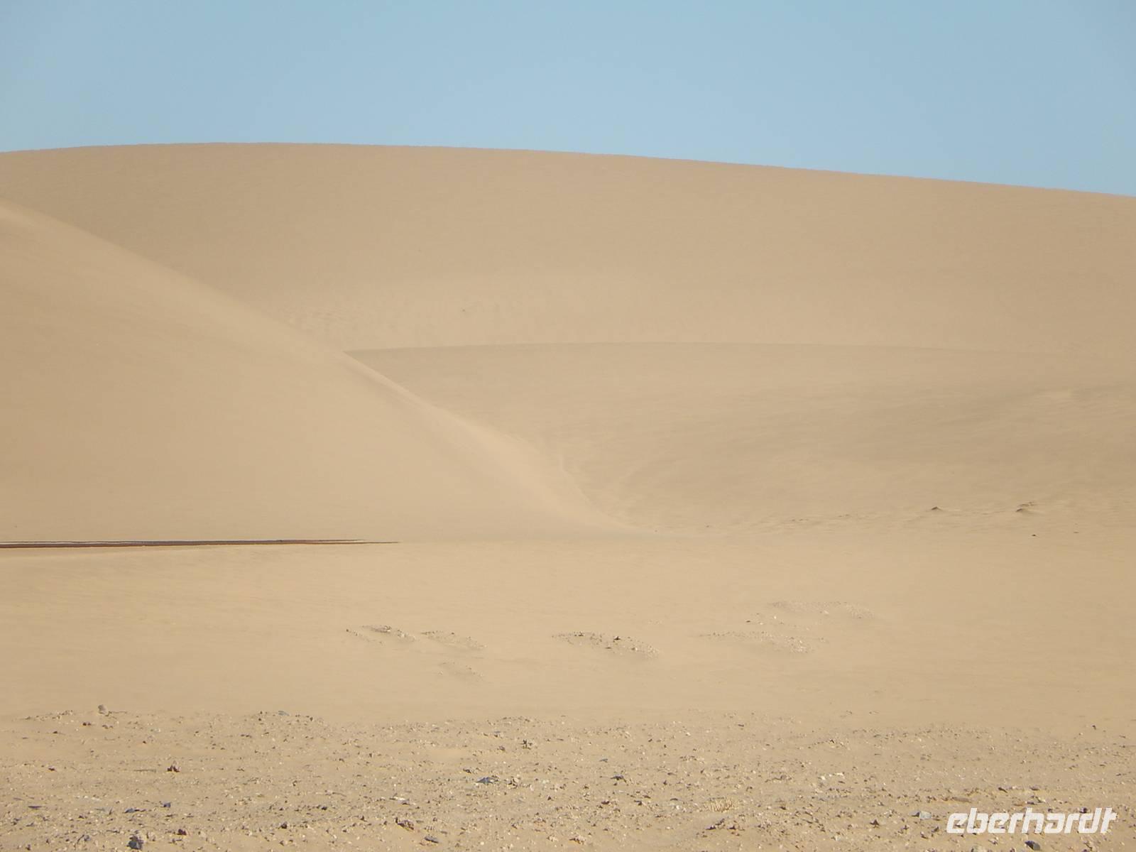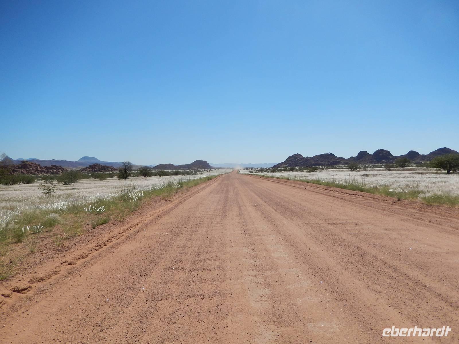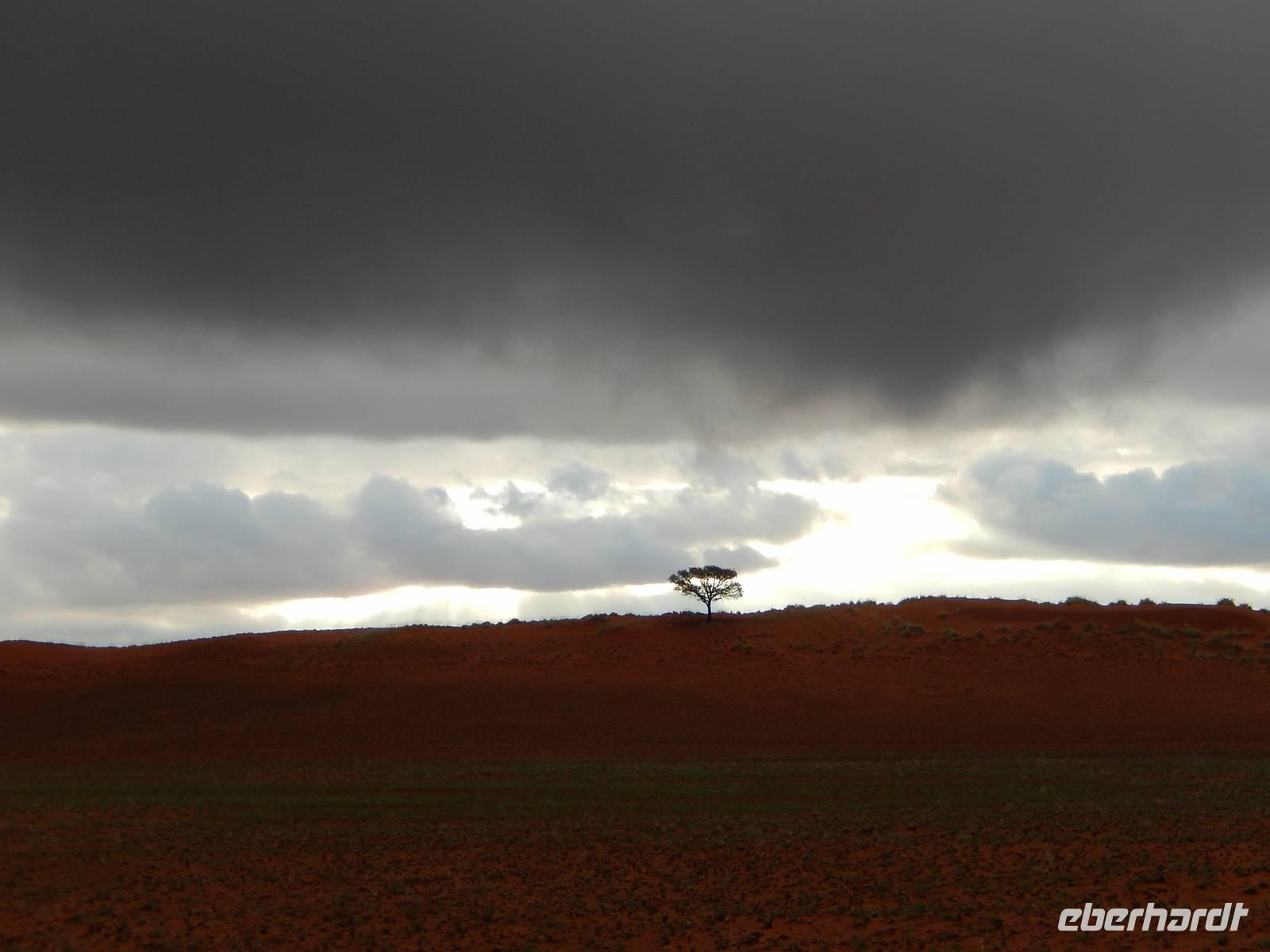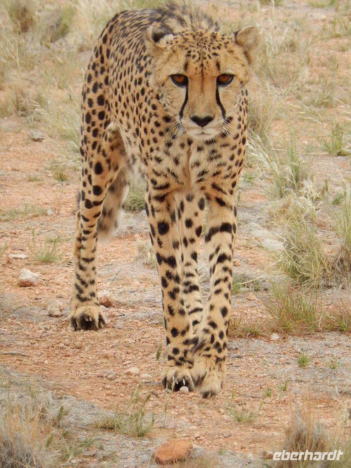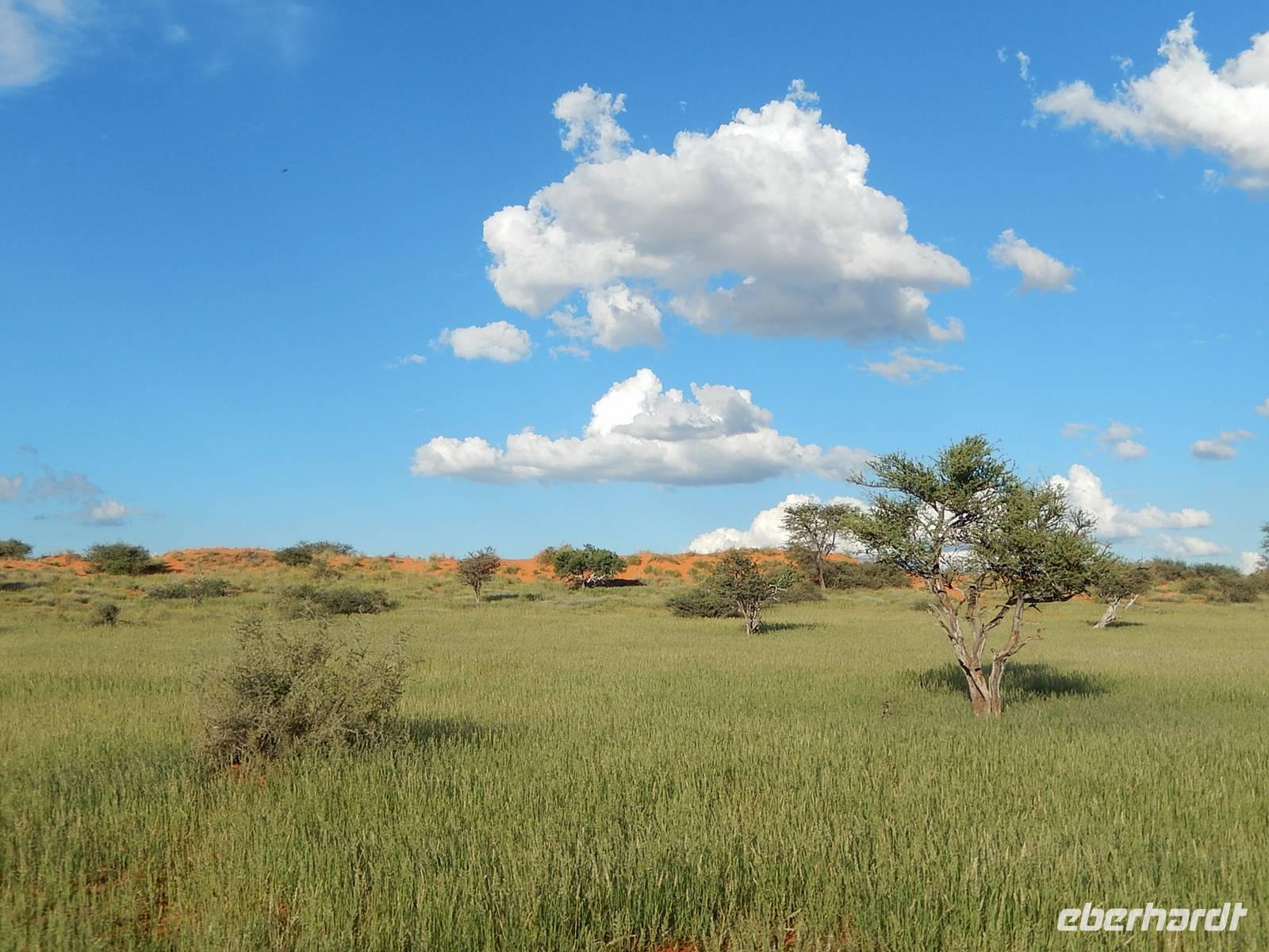 Über Helmeringhausen führt uns die Route weiter nach Norden. Wieder zeigt sich, wie dünn das Land besiedelt ist. Nur vereinzelt passieren wir einsame Farmhöfe. Die sandige Piste wird zusehends abenteuerlich, denn der Regen hat Passagen mit Wasser gefüllt, die wir durchfahren müssen. Glücklicherweise kommen wir trockenen Fußes voran und über überqueren später den 1.650 Meter hohen Tsaris-Pass. Gegen Mittag erreichen wir die Hammerstein Lodge, wo wir im wahrsten Sinne des Wortes einen „Catwalk" machen können. In 3 großen Gehegen werden verwaiste Cracals, eine Leoparden-Dame und ein Geparden-Pärchen gehalten. Zugegeben, mit einem leicht mulmigen Gefühl betreten wir die Gehege. Die beiden Geparden posieren für unsere Kameras und wir können fast auf Tuchfühlung gehen. Die Eleganz und Anmut der Großkatzen hat uns sehr beeindruckt. Danach hat Klaus wohl eine „Autowäsche" bestellt, denn es gießt wie aus Eimern. Die Landschaft ist mit einem zart-grünen Grasteppich überzogen - Wüste bei Sonnenschein kann ja jeder haben. Unser Ziel ist die Namib Desert Lodge, die zur Zeit mehr von grünem Gras als von Wüste umgeben ist. Wir befinden uns am Rande des Namib Naukluft Parks, dem größten Naturschutzgebiet Namibias in der ältesten Wüste der Welt.
