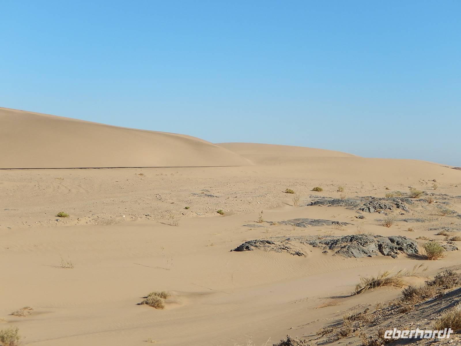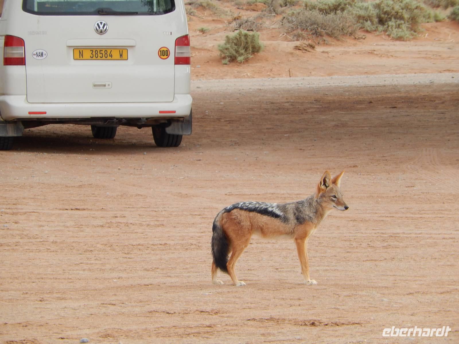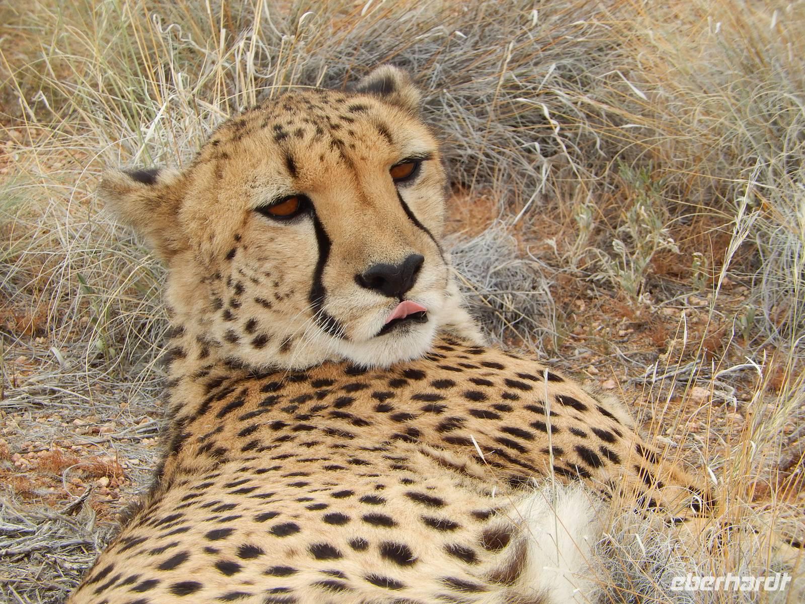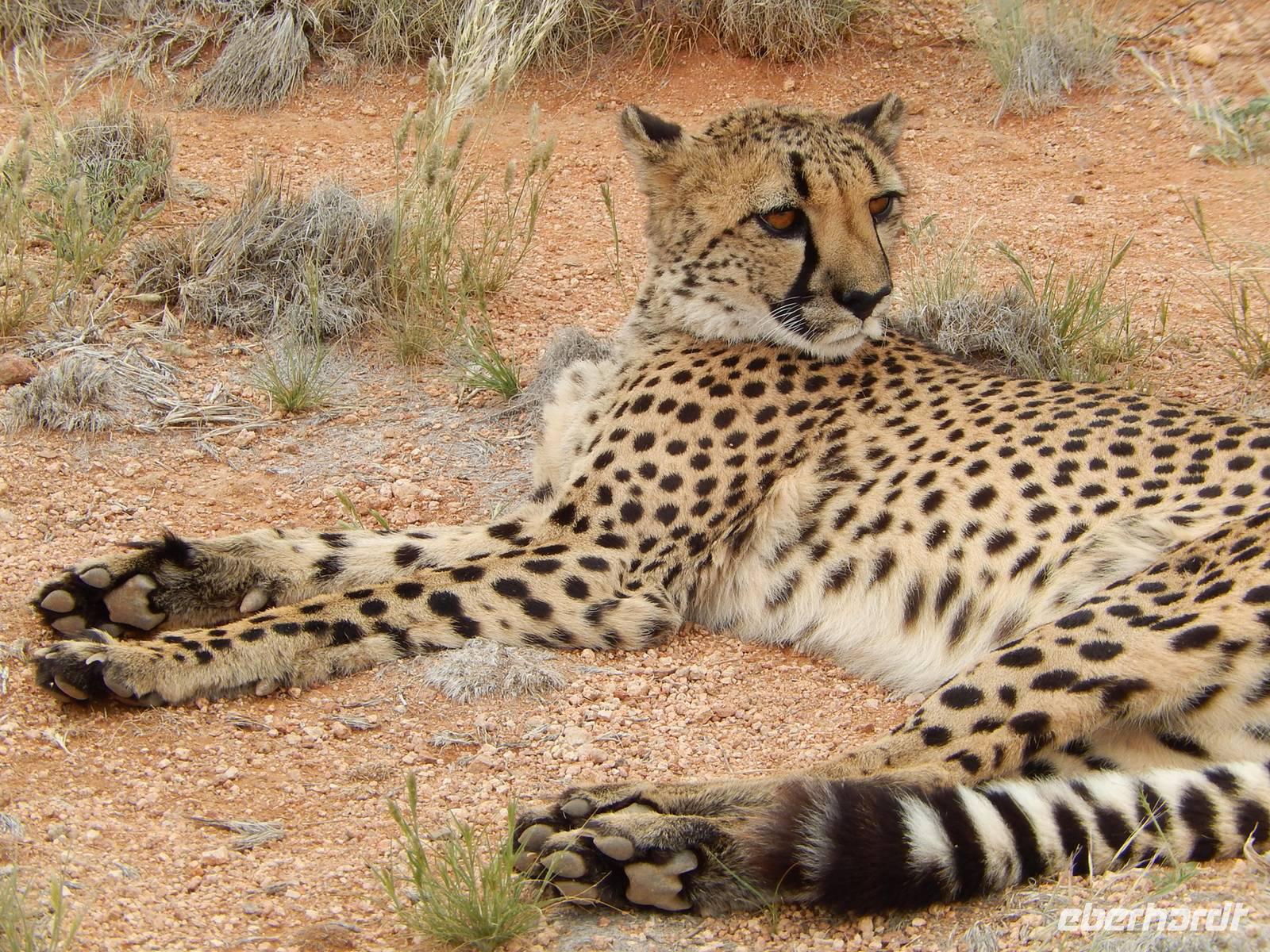 Über Helmeringhausen führt uns die Route weiter nach Norden. Wieder zeigt sich, wie dünn das Land besiedelt ist. Nur vereinzelt passieren wir einsame Farmhöfe. Die sandige Piste wird zusehends abenteuerlich, denn der Regen hat Passagen mit Wasser gefüllt, die wir durchfahren müssen. Glücklicherweise kommen wir trockenen Fußes voran und über überqueren später den 1.650 Meter hohen Tsaris-Pass. Gegen Mittag erreichen wir die Hammerstein Lodge, wo wir im wahrsten Sinne des Wortes einen „Catwalk" machen können. In 3 großen Gehegen werden verwaiste Cracals, eine Leoparden-Dame und ein Geparden-Pärchen gehalten. Zugegeben, mit einem leicht mulmigen Gefühl betreten wir die Gehege. Die beiden Geparden posieren für unsere Kameras und wir können fast auf Tuchfühlung gehen. Die Eleganz und Anmut der Großkatzen hat uns sehr beeindruckt. Danach hat Klaus wohl eine „Autowäsche" bestellt, denn es gießt wie aus Eimern. Die Landschaft ist mit einem zart-grünen Grasteppich überzogen - Wüste bei Sonnenschein kann ja jeder haben. Unser Ziel ist die Namib Desert Lodge, die zur Zeit mehr von grünem Gras als von Wüste umgeben ist. Wir befinden uns am Rande des Namib Naukluft Parks, dem größten Naturschutzgebiet Namibias in der ältesten Wüste der Welt.