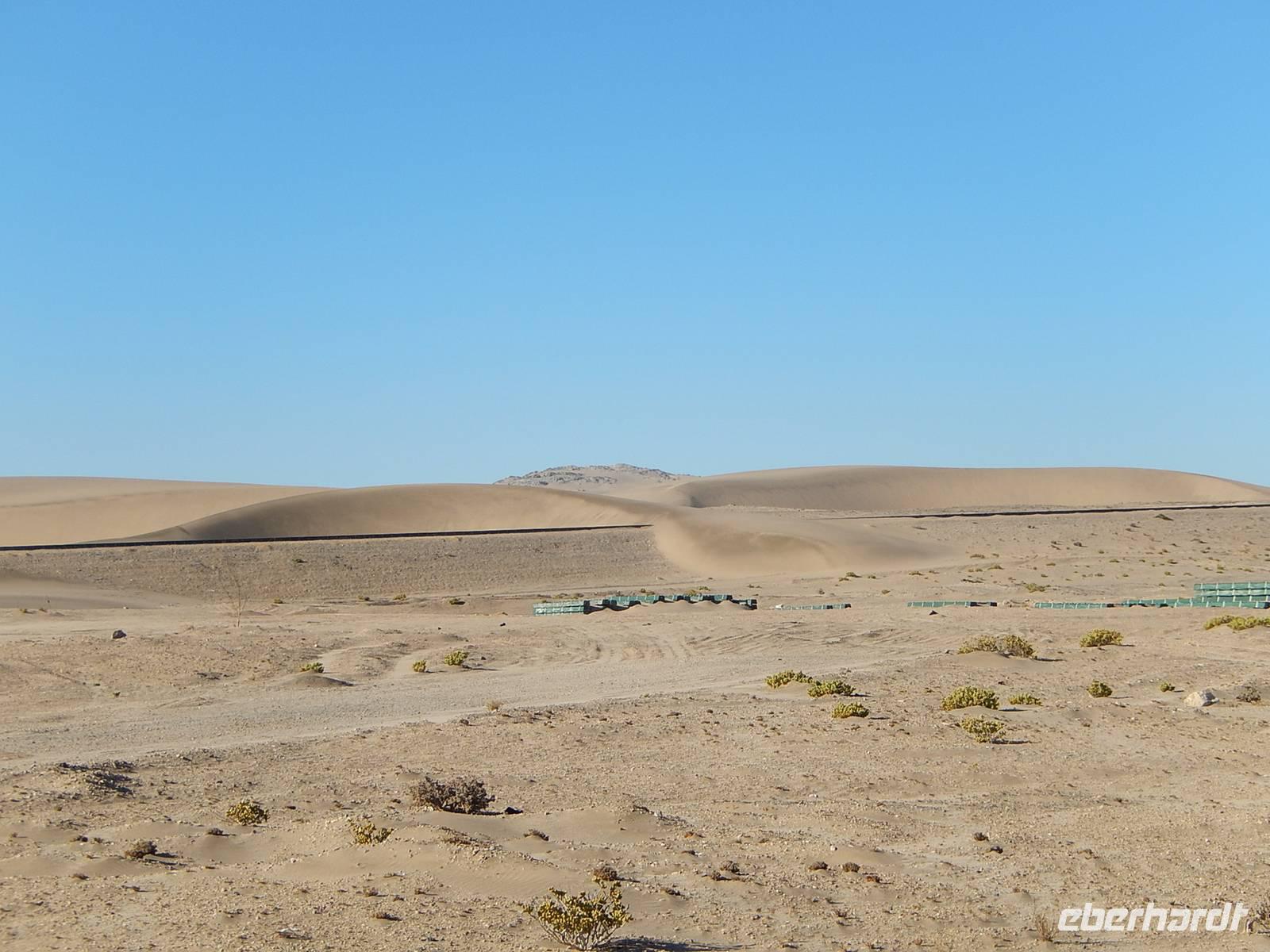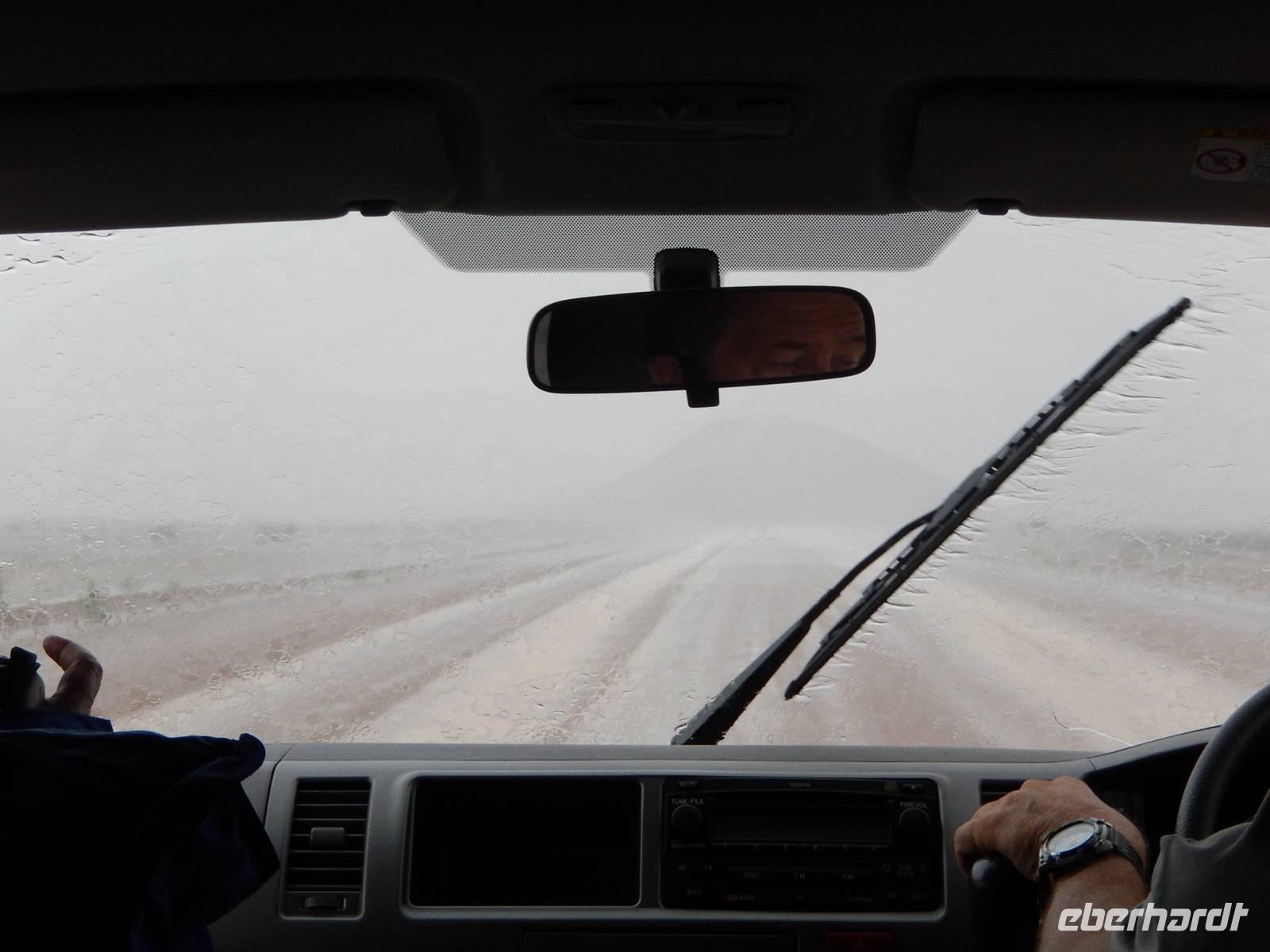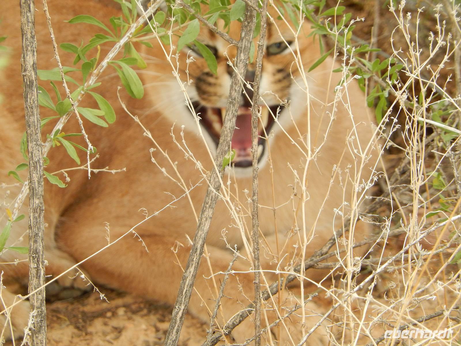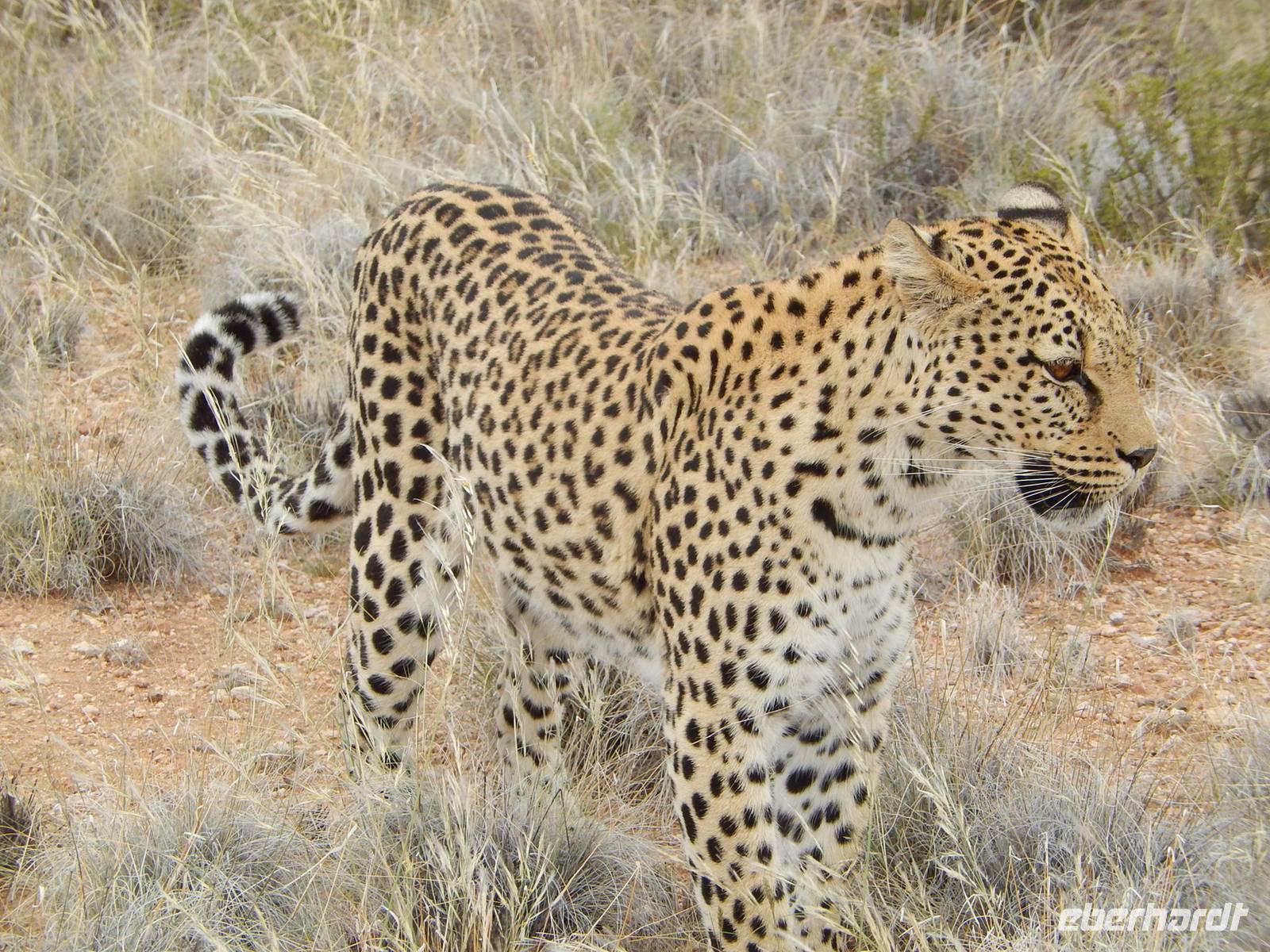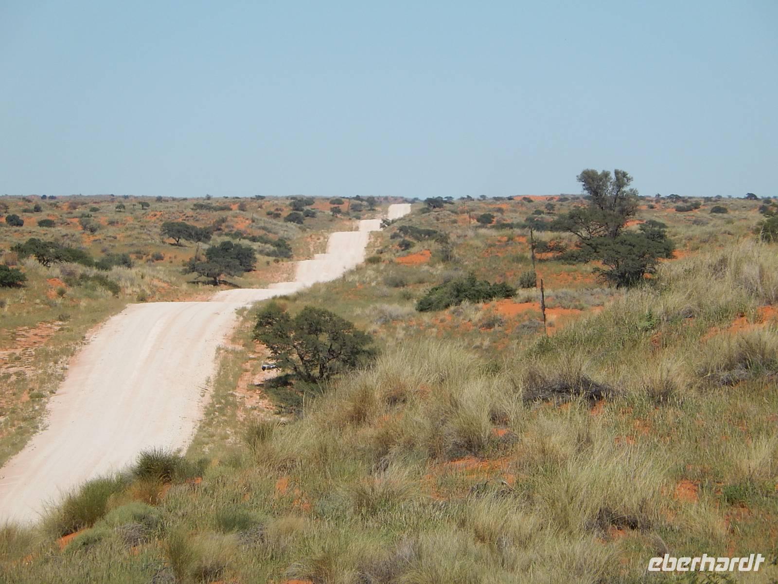 Über Helmeringhausen führt uns die Route weiter nach Norden. Wieder zeigt sich, wie dünn das Land besiedelt ist. Nur vereinzelt passieren wir einsame Farmhöfe. Die sandige Piste wird zusehends abenteuerlich, denn der Regen hat Passagen mit Wasser gefüllt, die wir durchfahren müssen. Glücklicherweise kommen wir trockenen Fußes voran und über überqueren später den 1.650 Meter hohen Tsaris-Pass. Gegen Mittag erreichen wir die Hammerstein Lodge, wo wir im wahrsten Sinne des Wortes einen „Catwalk" machen können. In 3 großen Gehegen werden verwaiste Cracals, eine Leoparden-Dame und ein Geparden-Pärchen gehalten. Zugegeben, mit einem leicht mulmigen Gefühl betreten wir die Gehege. Die beiden Geparden posieren für unsere Kameras und wir können fast auf Tuchfühlung gehen. Die Eleganz und Anmut der Großkatzen hat uns sehr beeindruckt. Danach hat Klaus wohl eine „Autowäsche" bestellt, denn es gießt wie aus Eimern. Die Landschaft ist mit einem zart-grünen Grasteppich überzogen - Wüste bei Sonnenschein kann ja jeder haben. Unser Ziel ist die Namib Desert Lodge, die zur Zeit mehr von grünem Gras als von Wüste umgeben ist. Wir befinden uns am Rande des Namib Naukluft Parks, dem größten Naturschutzgebiet Namibias in der ältesten Wüste der Welt.