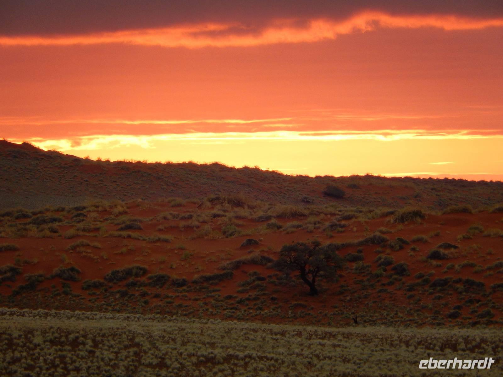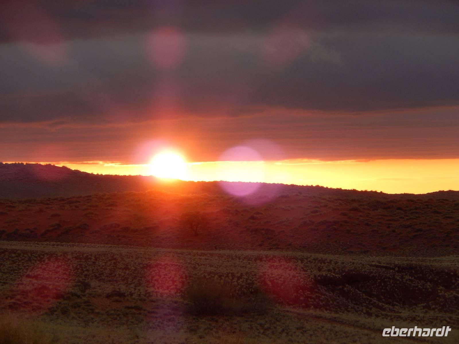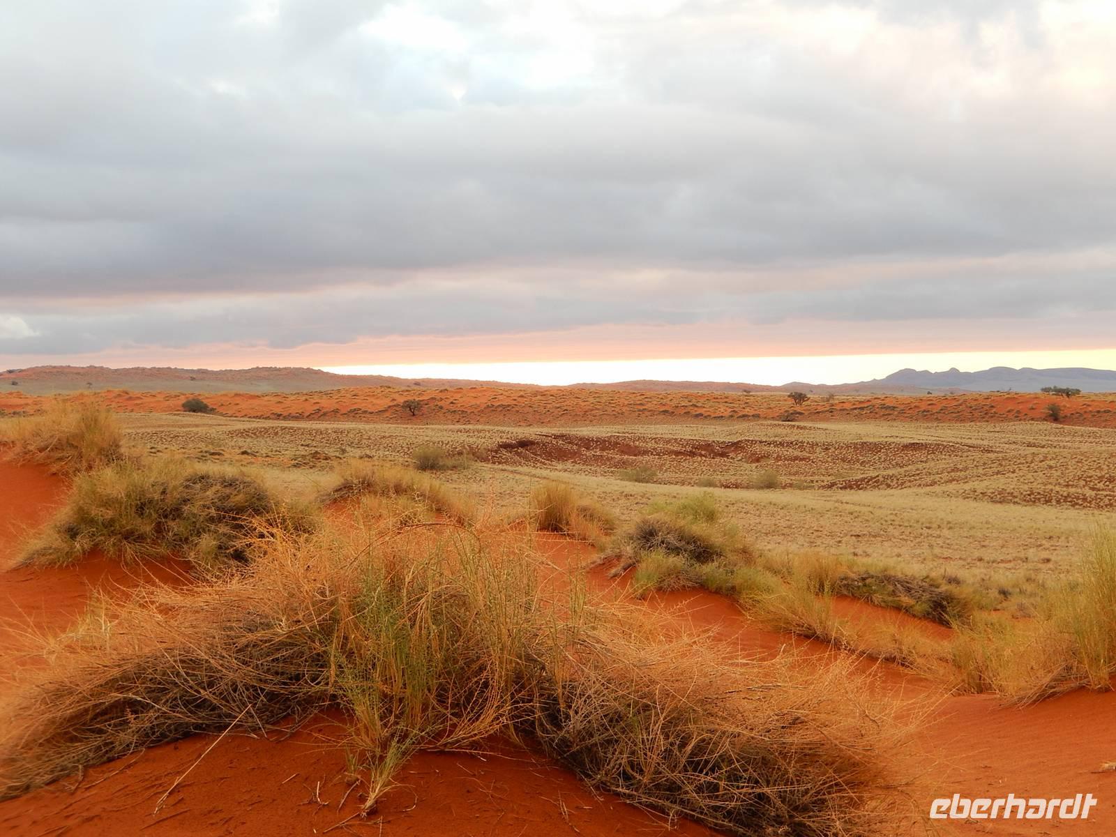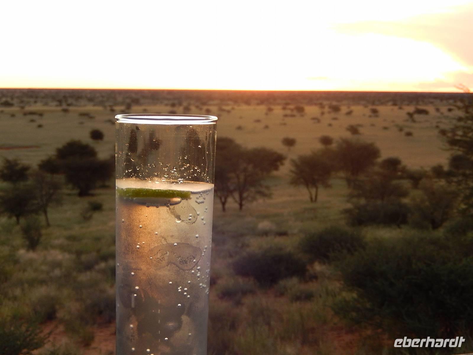 Wir lassen die Hauptstadt Windhoek hinter uns und fahren Richtung Süden. Die Straße führt (fast) schnurgerade durch die Savanne. In Reoboth (ehemals ein Staat im Staat) drehen wir eine Runde durch den Ort, um zu sehen, wie die Menschen hier leben und besonders wie sie aussehen. Wir blicken in farbige Gesichter mit hellen Augen - hier leben die Baster, die Nachfahren der „Hottentotten", der Kinder von Holländern und afrikanischen Khoisan. Beim 23. Breitengrad überqueren wir den südlichen Wendekreis, den „Tropic of Capricorn" - das ist auf jeden Fall ein Foto wert. Fortan bewegen wir uns überwiegend auf Schotterpiste und erreichen am Nachmittag die reizende Auob Lodge - JWD, wie man so schön sagt. Hier fühlt man sich endlich wie in Afrika. Am Nachmittag begeben wir uns per Jeep auf eine Game Drive auf privates Farmgelände - heja Safari! Die Landschaft ist bedeckt mit zartgrünen Gräsern, einigen Bäumen und Sträuchern. Zwischendurch leuchtet der rote Sand der Kalahari im Abendlicht und wir machen Bekanntschaft mit den ersten tierischen Bewohnern Namibias. Wir sehen Springböcke, Löffelhunde, Oryx, Strauße, Kudus und sogar Giraffen. In einem Baum hängt ein besonders schönes und großes Exemplar eines Siedelwebernestes, ein echtes „Mehrfamilienhaus". Pünktlich zum Sonnenuntergang erreichen wir den Aussichtspunkt und genießen einen Gin Tonic mit Blick in die weite Landschaft.