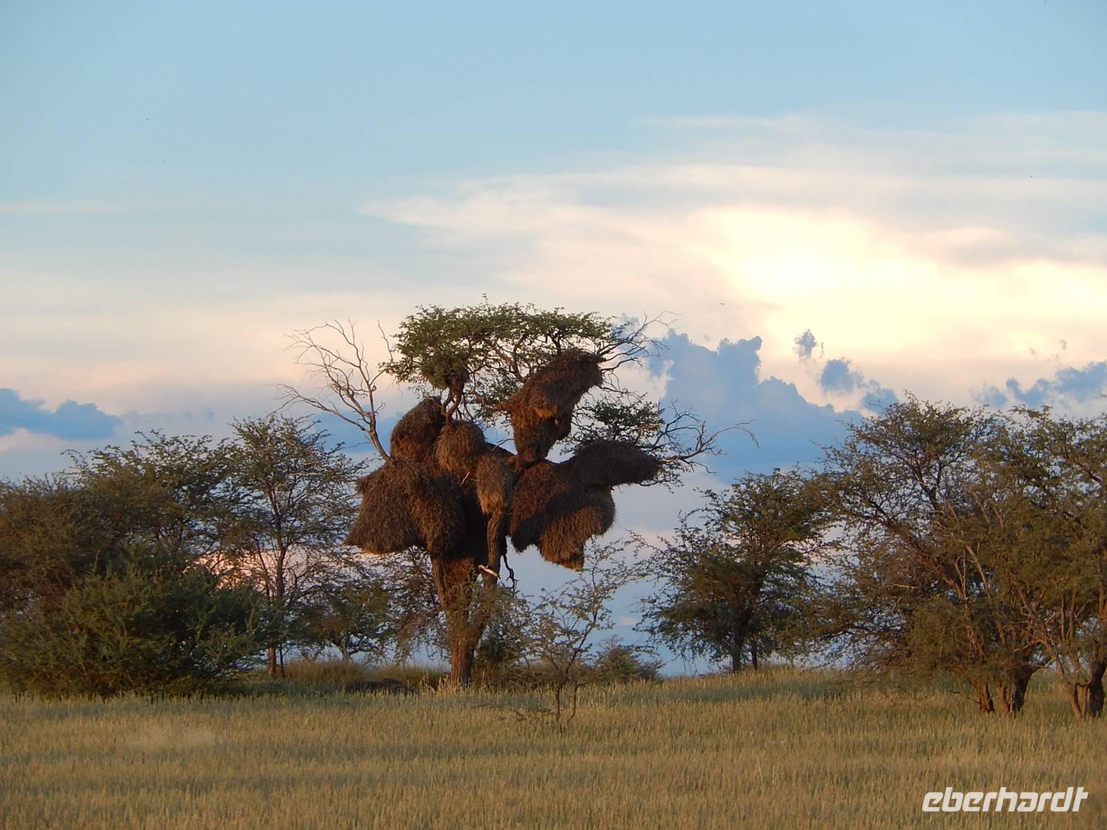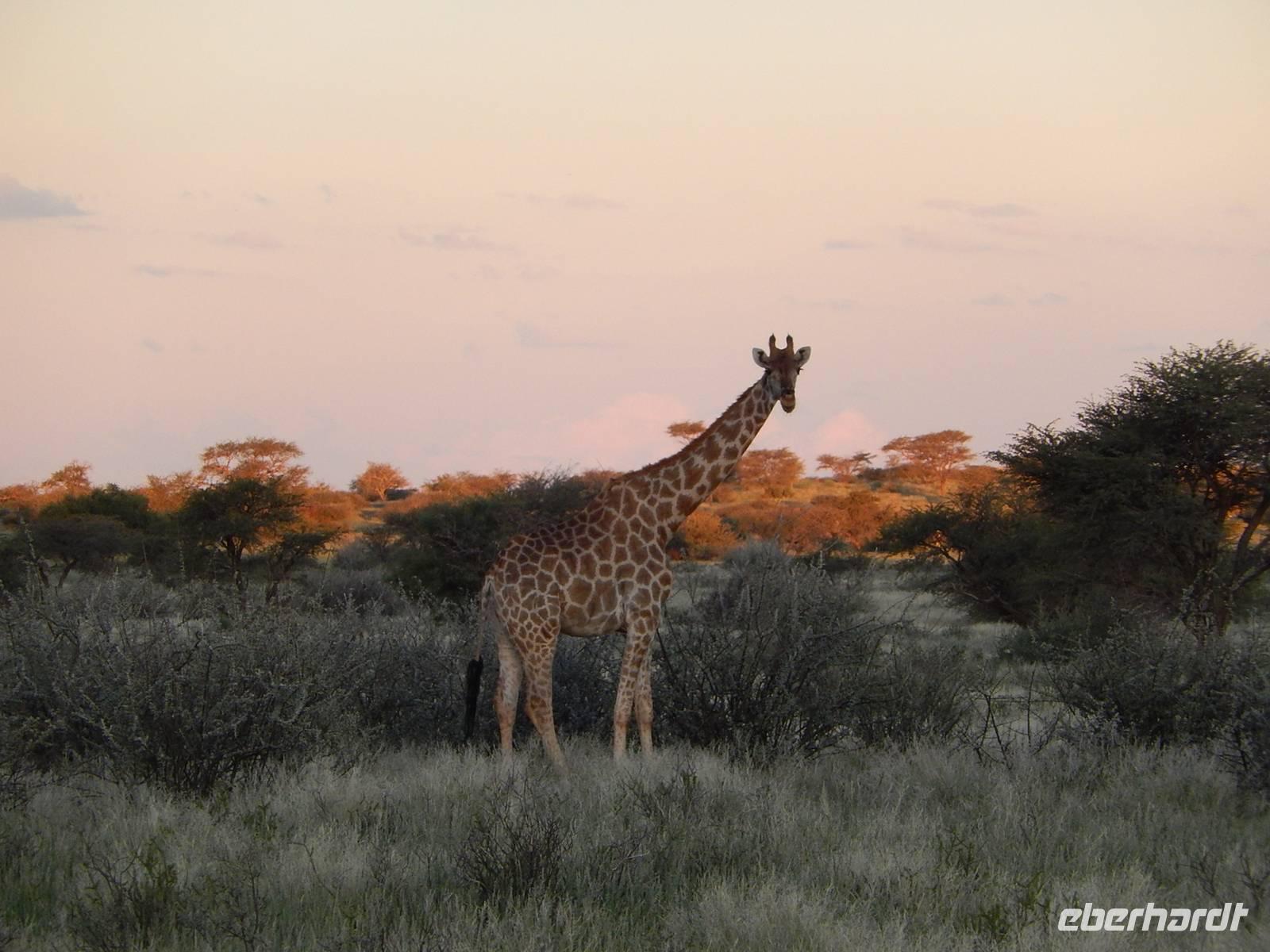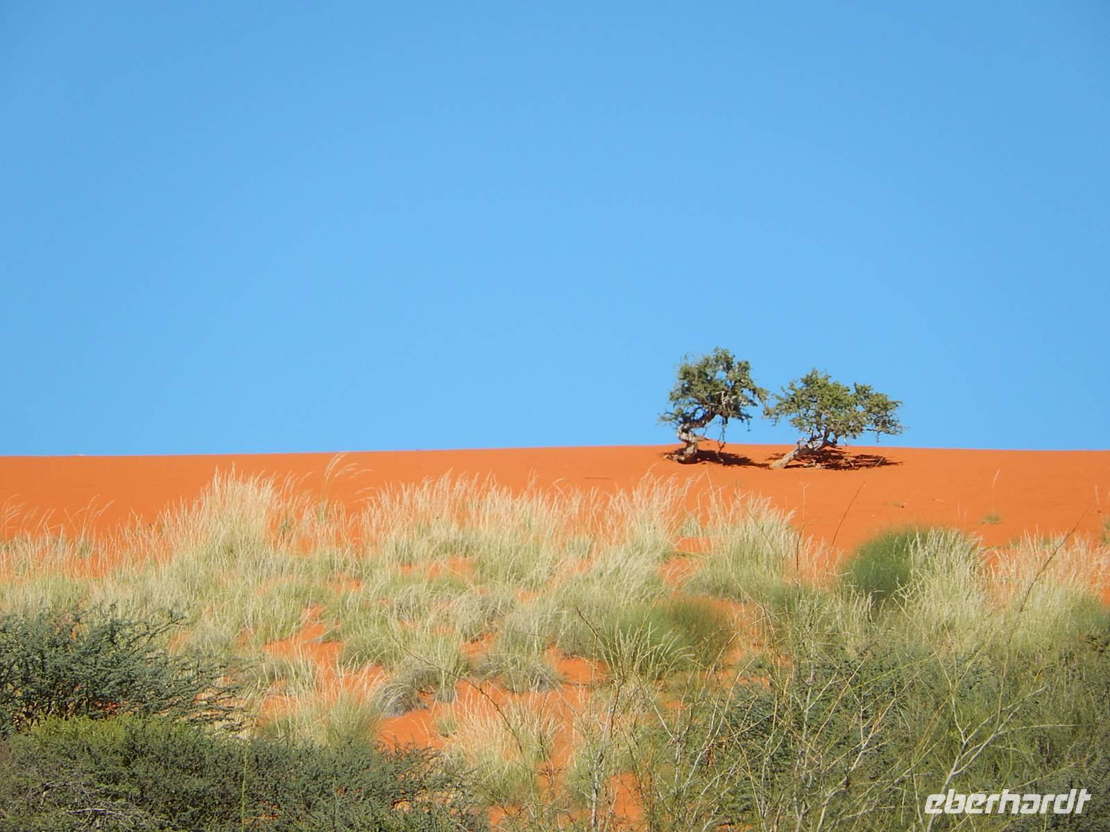 Wir lassen die Hauptstadt Windhoek hinter uns und fahren Richtung Süden. Die Straße führt (fast) schnurgerade durch die Savanne. In Reoboth (ehemals ein Staat im Staat) drehen wir eine Runde durch den Ort, um zu sehen, wie die Menschen hier leben und besonders wie sie aussehen. Wir blicken in farbige Gesichter mit hellen Augen - hier leben die Baster, die Nachfahren der „Hottentotten", der Kinder von Holländern und afrikanischen Khoisan. Beim 23. Breitengrad überqueren wir den südlichen Wendekreis, den „Tropic of Capricorn" - das ist auf jeden Fall ein Foto wert. Fortan bewegen wir uns überwiegend auf Schotterpiste und erreichen am Nachmittag die reizende Auob Lodge - JWD, wie man so schön sagt. Hier fühlt man sich endlich wie in Afrika. Am Nachmittag begeben wir uns per Jeep auf eine Game Drive auf privates Farmgelände - heja Safari! Die Landschaft ist bedeckt mit zartgrünen Gräsern, einigen Bäumen und Sträuchern. Zwischendurch leuchtet der rote Sand der Kalahari im Abendlicht und wir machen Bekanntschaft mit den ersten tierischen Bewohnern Namibias. Wir sehen Springböcke, Löffelhunde, Oryx, Strauße, Kudus und sogar Giraffen. In einem Baum hängt ein besonders schönes und großes Exemplar eines Siedelwebernestes, ein echtes „Mehrfamilienhaus". Pünktlich zum Sonnenuntergang erreichen wir den Aussichtspunkt und genießen einen Gin Tonic mit Blick in die weite Landschaft.