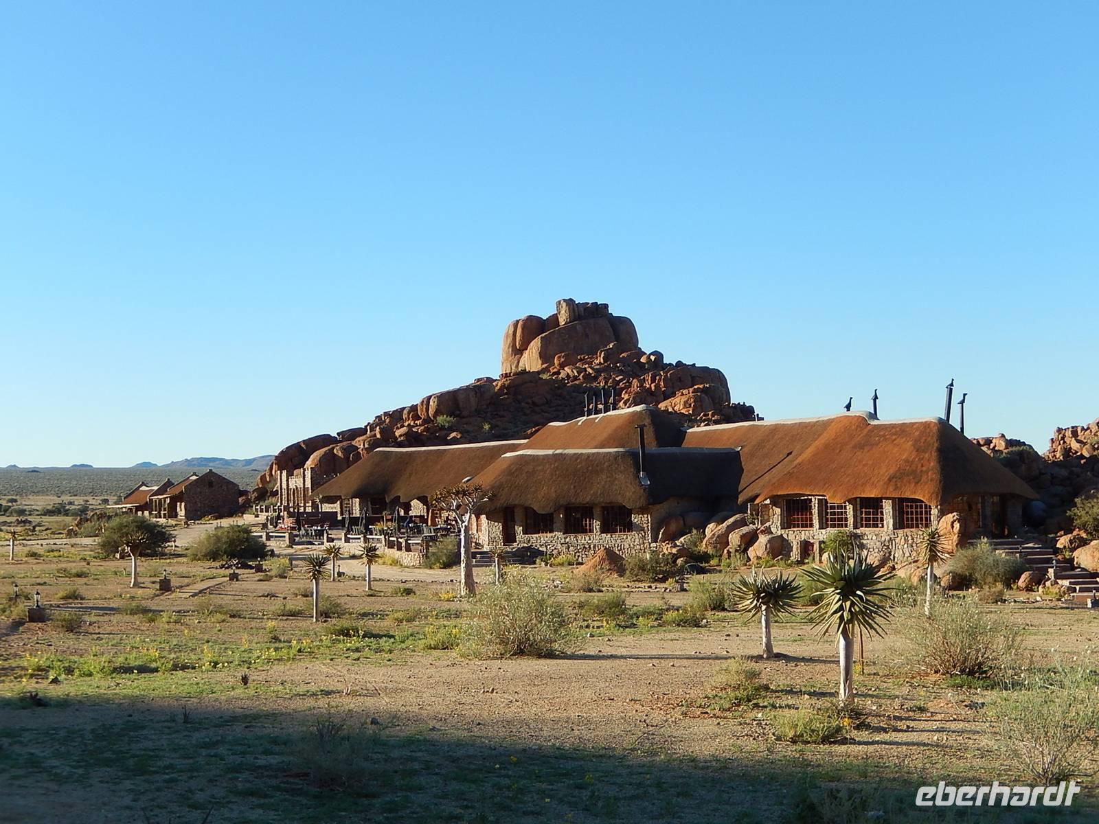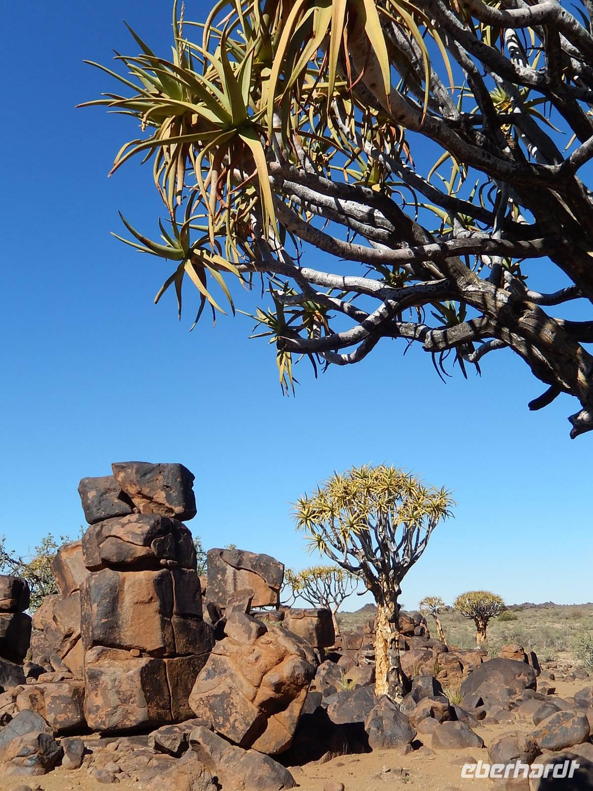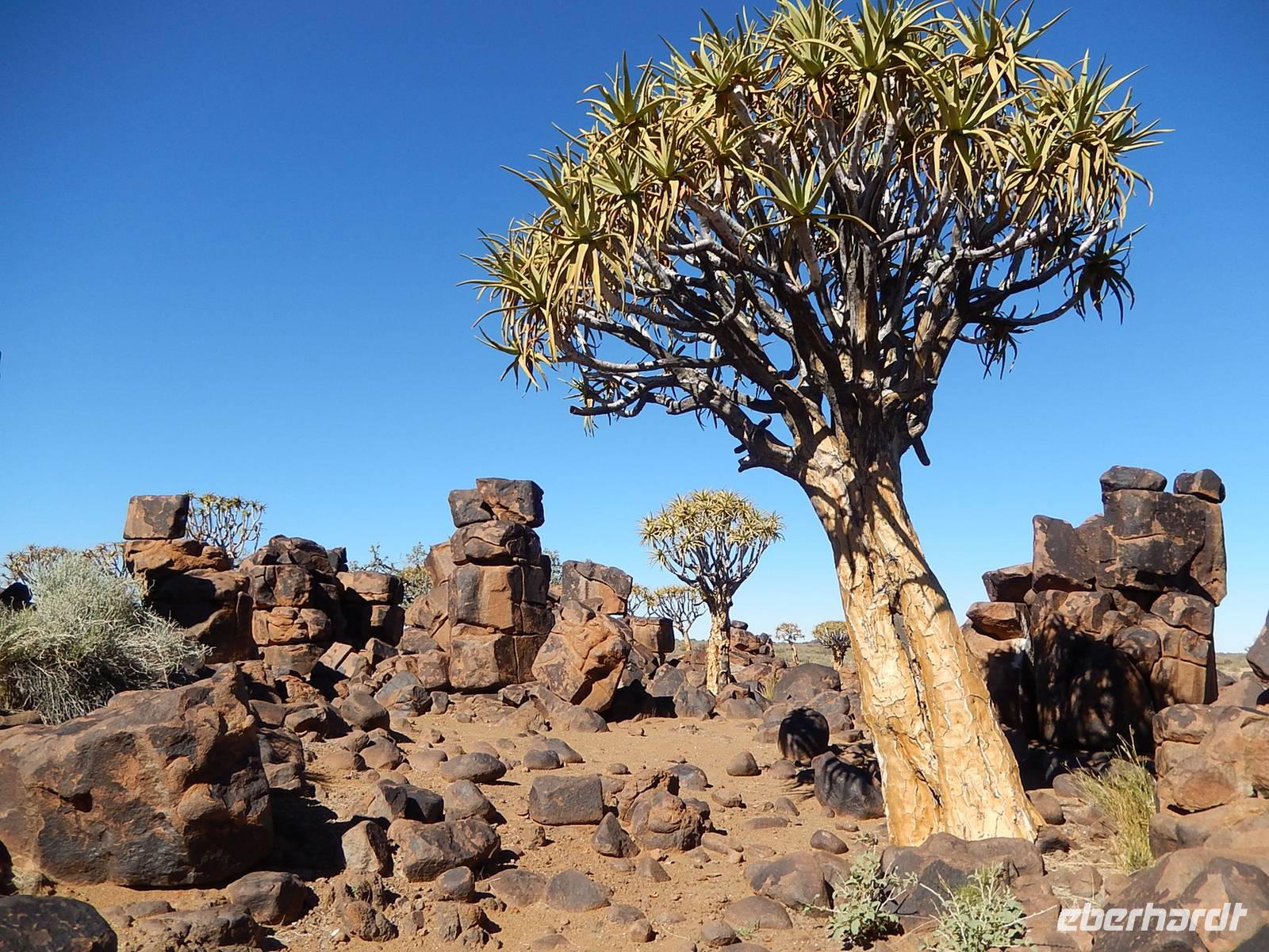 Nach einem heftigen Regenguss in der Nacht ist die Luft wunderbar rein. Wir machen einen kurzen Abstecher zum Soldatenfriedhof in Gochas, anschließend führt uns die Route weiter durch das Auob-Tal. Der typisch rote Kalaharisand leuchtet zwischen den Gräsern. Im Auf und Ab geht es über 86 Dünen durch die Kalahari. Auf der weiteren Fahrt über Koes bekommen wir mehr und mehr ein Gefühl für die Weite des Landes. In charmantem und humorvollem Deutsch-Afrikaans erklärt uns Gil am Nachmittag die Geschichte seiner Farm, dem Mesosaurus-Camp. Es ist ein Sprung in längst vergangene Zeiten - rein zufällig entdeckte sein Sohn die 250-270 Mio. Jahre alten Fossilien, die ausgesprochen gut erhalten sind. Zwischen den schwarz-roten Dolorit-Steinen, die auch Giant's Playground (Spielplatz der Riesen) genannt werden, wachsen über 5.000 Köcherbäume. Sie sind zum Symbol Süd-Namibias geworden, auch wenn es gar kein Baum, sondern vielmehr eine Aloen-Art ist. Am Abend erreichen wir Keetmanshoop zur Übernachtung.