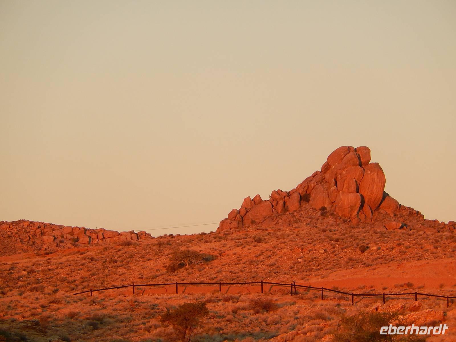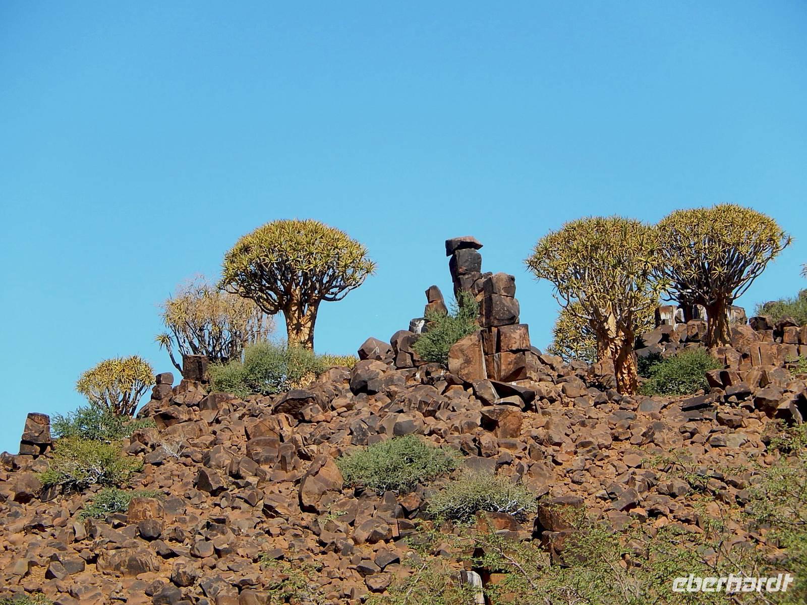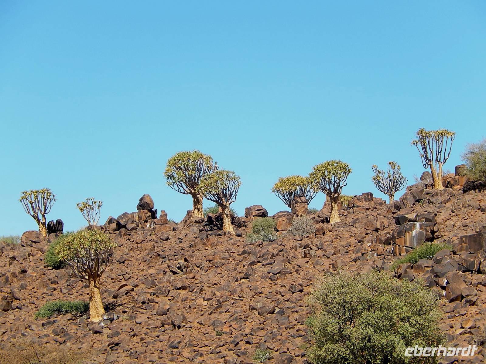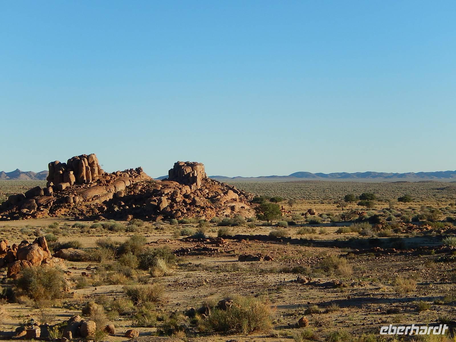 Nach einem heftigen Regenguss in der Nacht ist die Luft wunderbar rein. Wir machen einen kurzen Abstecher zum Soldatenfriedhof in Gochas, anschließend führt uns die Route weiter durch das Auob-Tal. Der typisch rote Kalaharisand leuchtet zwischen den Gräsern. Im Auf und Ab geht es über 86 Dünen durch die Kalahari. Auf der weiteren Fahrt über Koes bekommen wir mehr und mehr ein Gefühl für die Weite des Landes. In charmantem und humorvollem Deutsch-Afrikaans erklärt uns Gil am Nachmittag die Geschichte seiner Farm, dem Mesosaurus-Camp. Es ist ein Sprung in längst vergangene Zeiten - rein zufällig entdeckte sein Sohn die 250-270 Mio. Jahre alten Fossilien, die ausgesprochen gut erhalten sind. Zwischen den schwarz-roten Dolorit-Steinen, die auch Giant's Playground (Spielplatz der Riesen) genannt werden, wachsen über 5.000 Köcherbäume. Sie sind zum Symbol Süd-Namibias geworden, auch wenn es gar kein Baum, sondern vielmehr eine Aloen-Art ist. Am Abend erreichen wir Keetmanshoop zur Übernachtung.