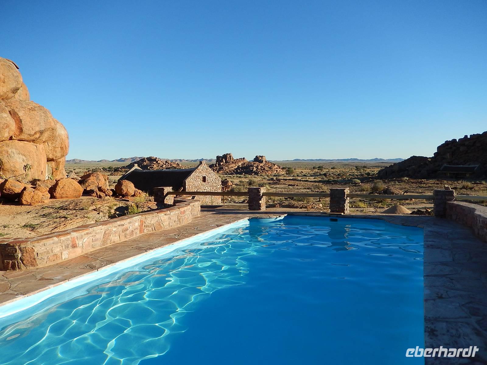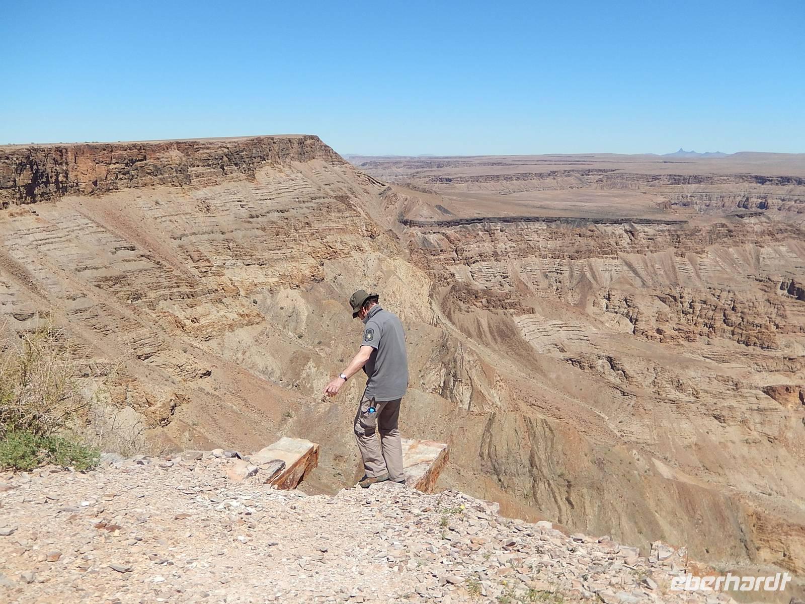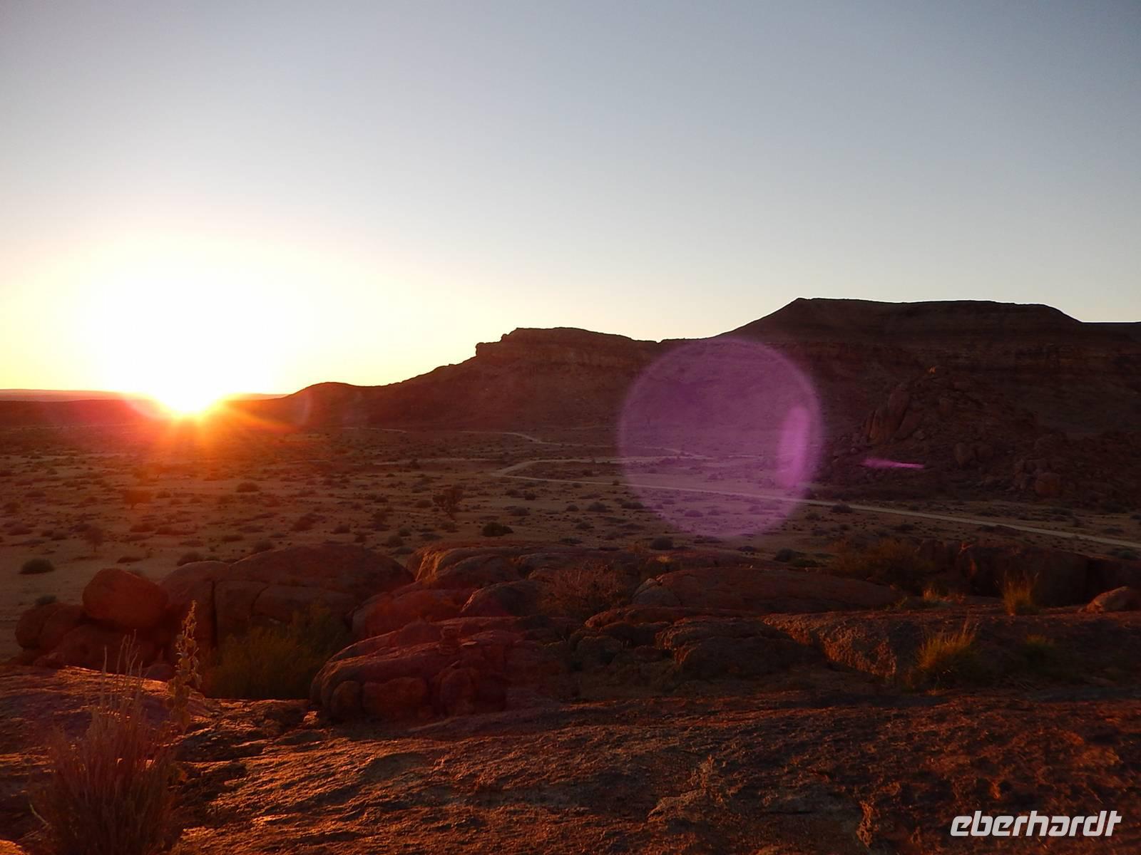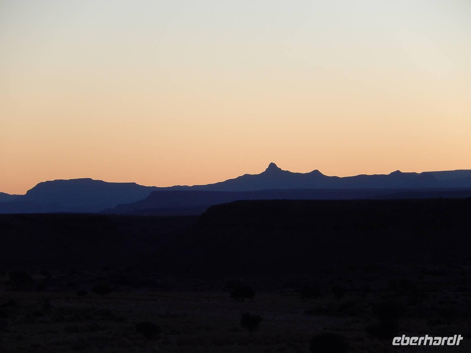 Den ersten Stopp des heutigen Tages legen wir am Naute-Staudamm ein, der große Wasserspeicher für die Region um Keetmanshoop. Ganz in der Nähe gedeihen mitten in der kargen, trockenen Landschaft Tafeltrauben und Datteln. Die weitere Route führt uns parallel der Eisenbahnstrecke und durch die Karoo bis zum Fish River Canyon. Der gigantische Canyon taucht plötzlich als „großes Loch im Boden" auf - eine spektakuläre Aussicht. Der Fish River windet sich durch den 550 Meter tiefen Canyon und bildet damit die zweitgrößte Schluchtenlandschaft der Erde. Bei einem Spaziergang entlang der Kante bieten sich immer wieder neue Perspektiven. Am frühen Nachmittag erreichen wir das Canyon Village - eine herrliche Oase mitten in der Wüste. Durch den frühen Aufbruch am Morgen bleibt uns hier Zeit, um die Annehmlichkeiten der Lodge zu genießen: bei den hochsommerlichen Temperaturen ist eine Abkühlung im Pool willkommen mit dem freien Blick in die weite Landschaft. Später unternehmen wir einen Spaziergang zum Hausberg der Lodge und genießen im Abendrot einen Sundowner inmitten herrlicher Natur. Nach einem fantastischen Abendessen unter freiem Himmel lädt unser Reiseleiter Klaus zur Astronomie-Stunde im Dunkel der Nacht. Der klare Sternenhimmel zeigt uns so manches Bild - selbstverständlich finden wir auch das Kreuz des Südens.