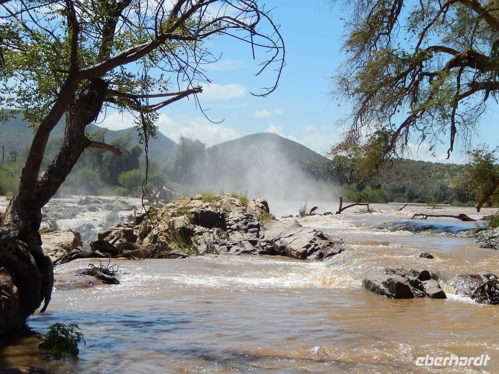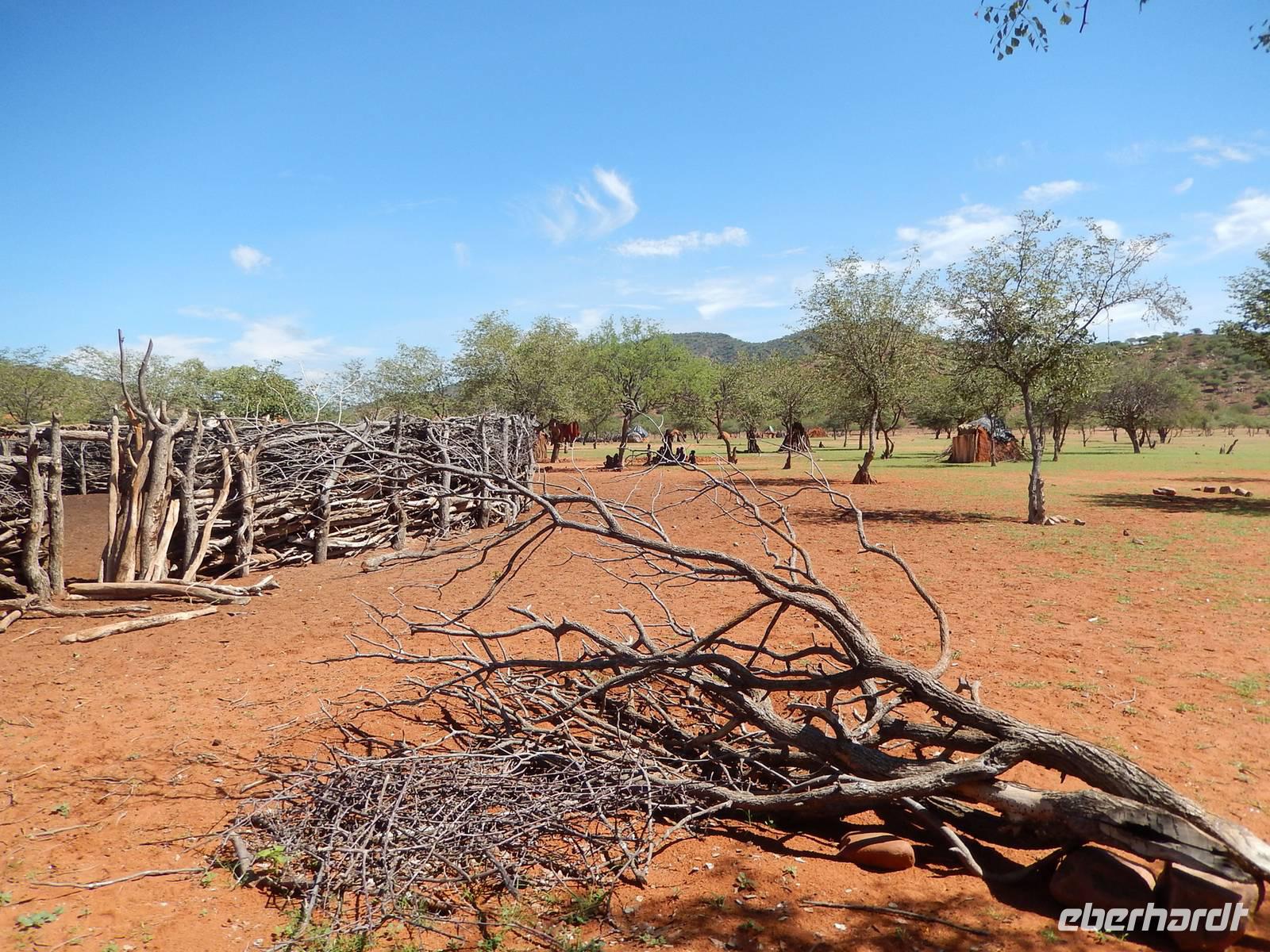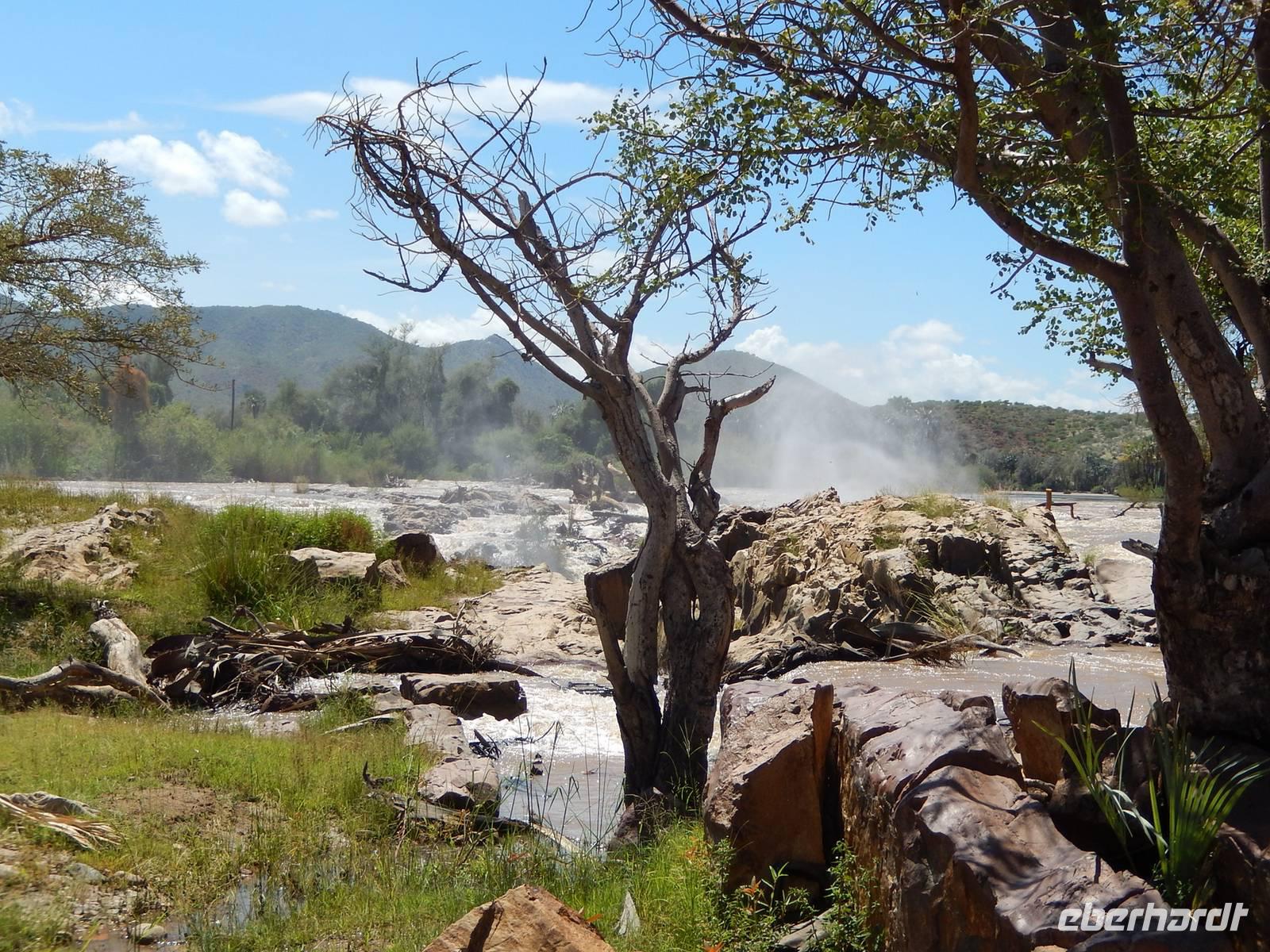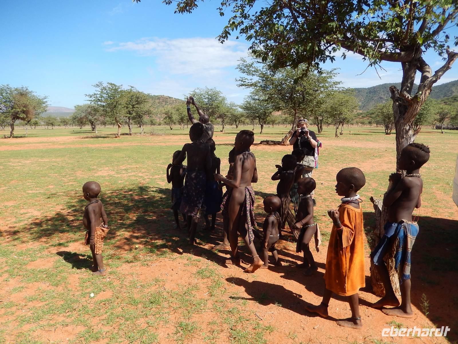 Früh am Morgen starten wir zu unserem Tagesausflug in das Kaokoland, wo vor allem drei Stämme leben: das Nomadenvolk der Himba, die Herero sowie die aus Angola stammenden Zemba. Der Regen der vergangenen Tage hat die Straße stark ausgespült, so kommen wir zeitweise nur langsam voran. Entlang der Straße sehen wir bereits einfache Dörfer und Behausungen und Einheimische der unterschiedlichen Stämme. Unser örtlicher Fahrer und Reiseleiter Titus bringt uns die Traditionen und Kultur der Himba näher. Als wir das Himba-Dorf erreichen, werden wir mit einem freundlichen „Moro moro" begrüßt und die Kinder kommen bereits fröhlich auf uns zu und bestaunen neugierig die Bilder auf unseren Digitalkameras. Im Dorf treffen wir nur auf die Frauen und Kinder, die Jungs und Männer sind traditionell die Rinder hüten. Typisch für die Himbafrauen ist die rote Färbung, die durch das Einreiben mit einem eisenhaltigen Steinmehl und Butterfett entsteht. Die Lebensweise der Himba beeindruckt uns zutiefst und man kann nur hoffen, dass die Traditionen noch lange erhalten bleiben, auch wenn dies in unserer modernen Welt ein schwieriges Unterfangen sein dürfte. Unweit vom Dorf liegen die Epupo-Wasserfälle. Zu dieser Zeit des Jahres führt der Kunene-Fluss besonders viel Wasser und die Fälle sind entsprechend wasserreich. Hier befinden wir uns ganz im Norden Namibias an der Grenze nach Angola - somit haben wir das Land einmal komplett von Süd nach Nord über sagenhafte 11 Breitengarde durchfahren. In einem Camp am Fluss genießen wir unser Mittagessen und fahren anschließend wieder zurück nach Opuwo in unsere Lodge.
