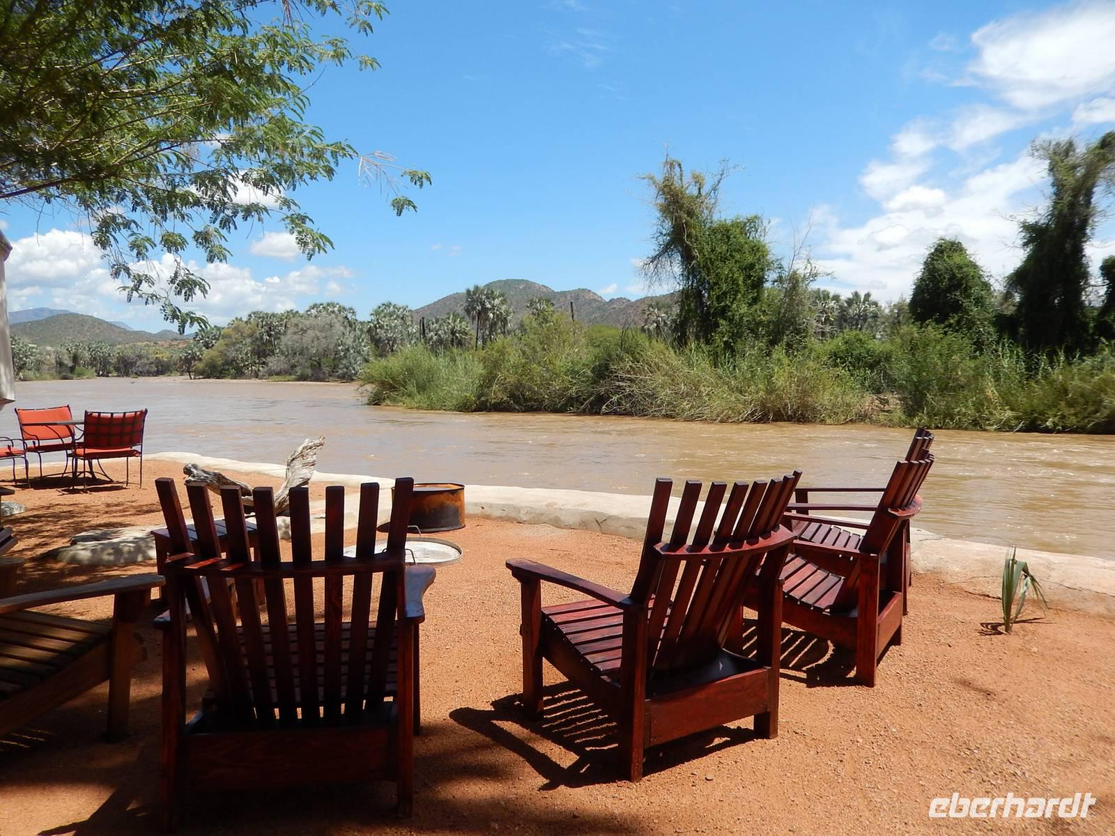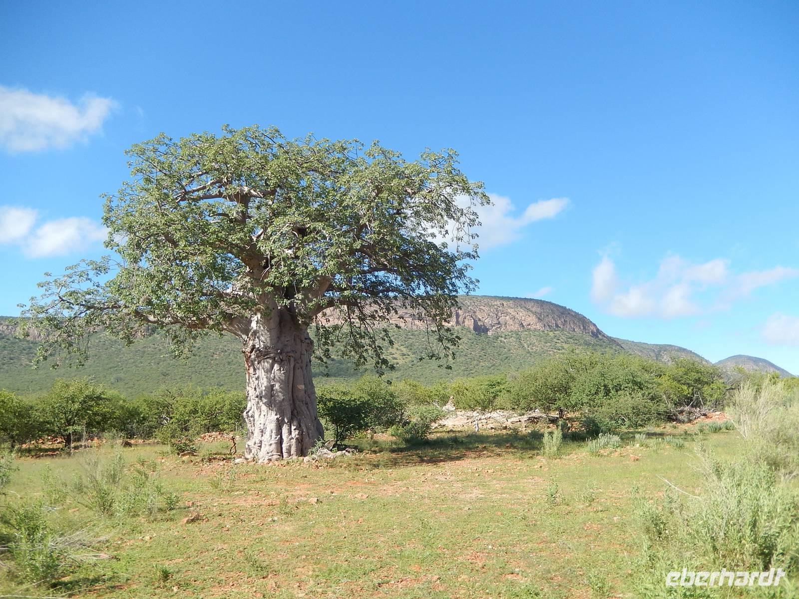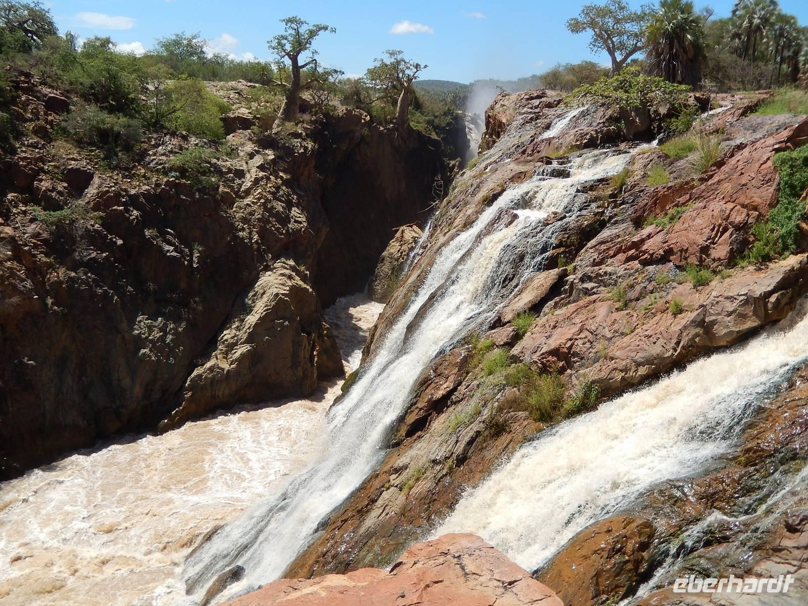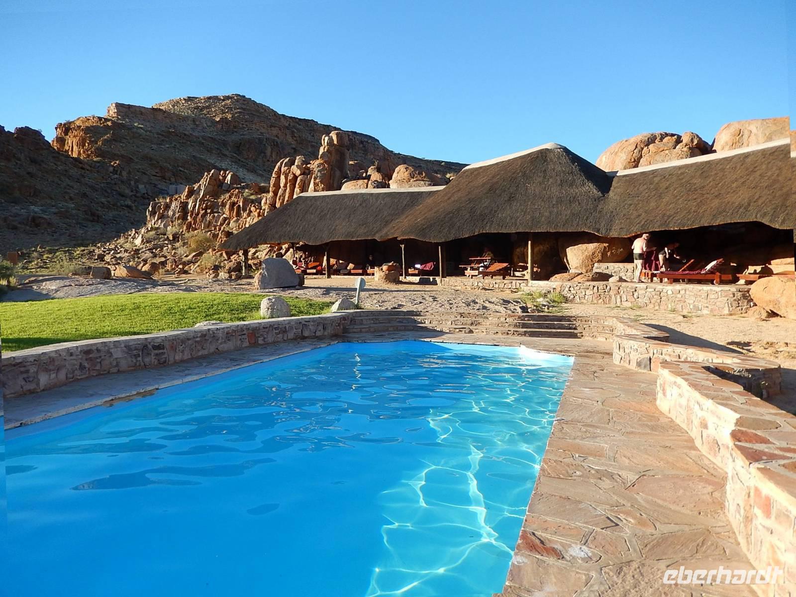 Früh am Morgen starten wir zu unserem Tagesausflug in das Kaokoland, wo vor allem drei Stämme leben: das Nomadenvolk der Himba, die Herero sowie die aus Angola stammenden Zemba. Der Regen der vergangenen Tage hat die Straße stark ausgespült, so kommen wir zeitweise nur langsam voran. Entlang der Straße sehen wir bereits einfache Dörfer und Behausungen und Einheimische der unterschiedlichen Stämme. Unser örtlicher Fahrer und Reiseleiter Titus bringt uns die Traditionen und Kultur der Himba näher. Als wir das Himba-Dorf erreichen, werden wir mit einem freundlichen „Moro moro" begrüßt und die Kinder kommen bereits fröhlich auf uns zu und bestaunen neugierig die Bilder auf unseren Digitalkameras. Im Dorf treffen wir nur auf die Frauen und Kinder, die Jungs und Männer sind traditionell die Rinder hüten. Typisch für die Himbafrauen ist die rote Färbung, die durch das Einreiben mit einem eisenhaltigen Steinmehl und Butterfett entsteht. Die Lebensweise der Himba beeindruckt uns zutiefst und man kann nur hoffen, dass die Traditionen noch lange erhalten bleiben, auch wenn dies in unserer modernen Welt ein schwieriges Unterfangen sein dürfte. Unweit vom Dorf liegen die Epupo-Wasserfälle. Zu dieser Zeit des Jahres führt der Kunene-Fluss besonders viel Wasser und die Fälle sind entsprechend wasserreich. Hier befinden wir uns ganz im Norden Namibias an der Grenze nach Angola - somit haben wir das Land einmal komplett von Süd nach Nord über sagenhafte 11 Breitengarde durchfahren. In einem Camp am Fluss genießen wir unser Mittagessen und fahren anschließend wieder zurück nach Opuwo in unsere Lodge.