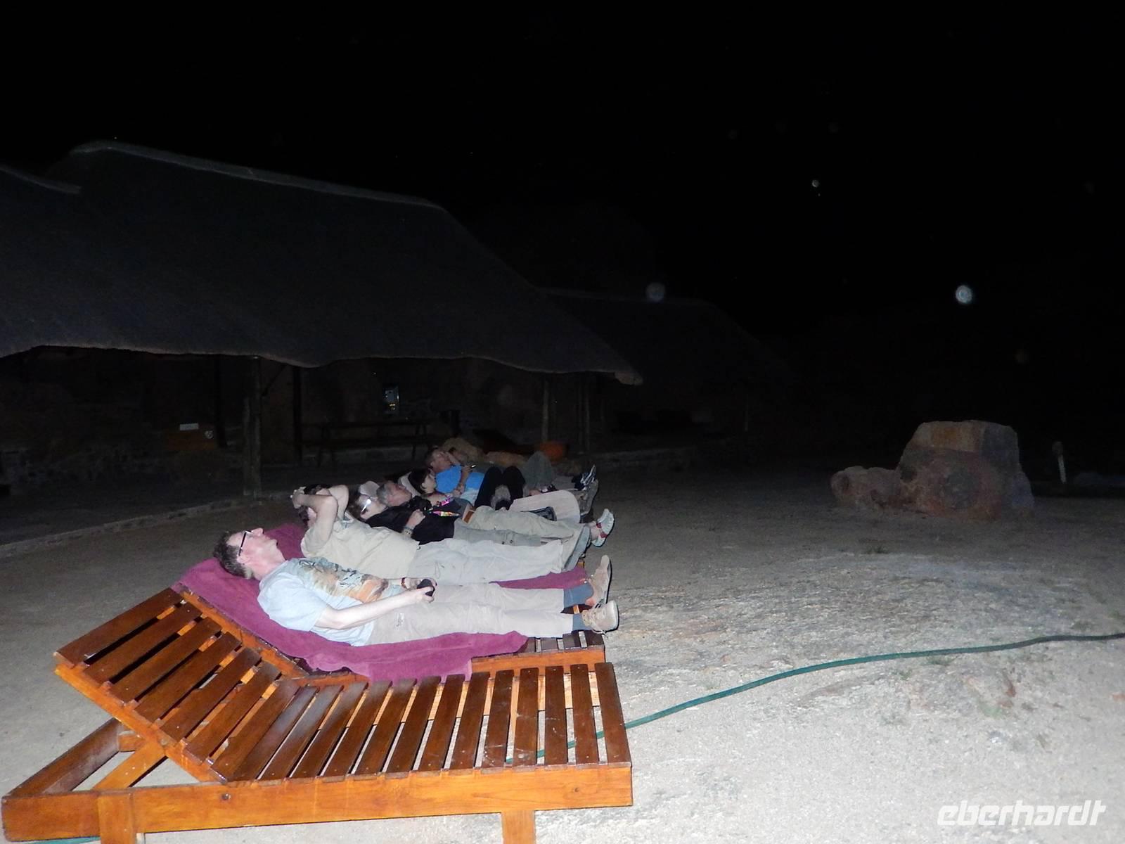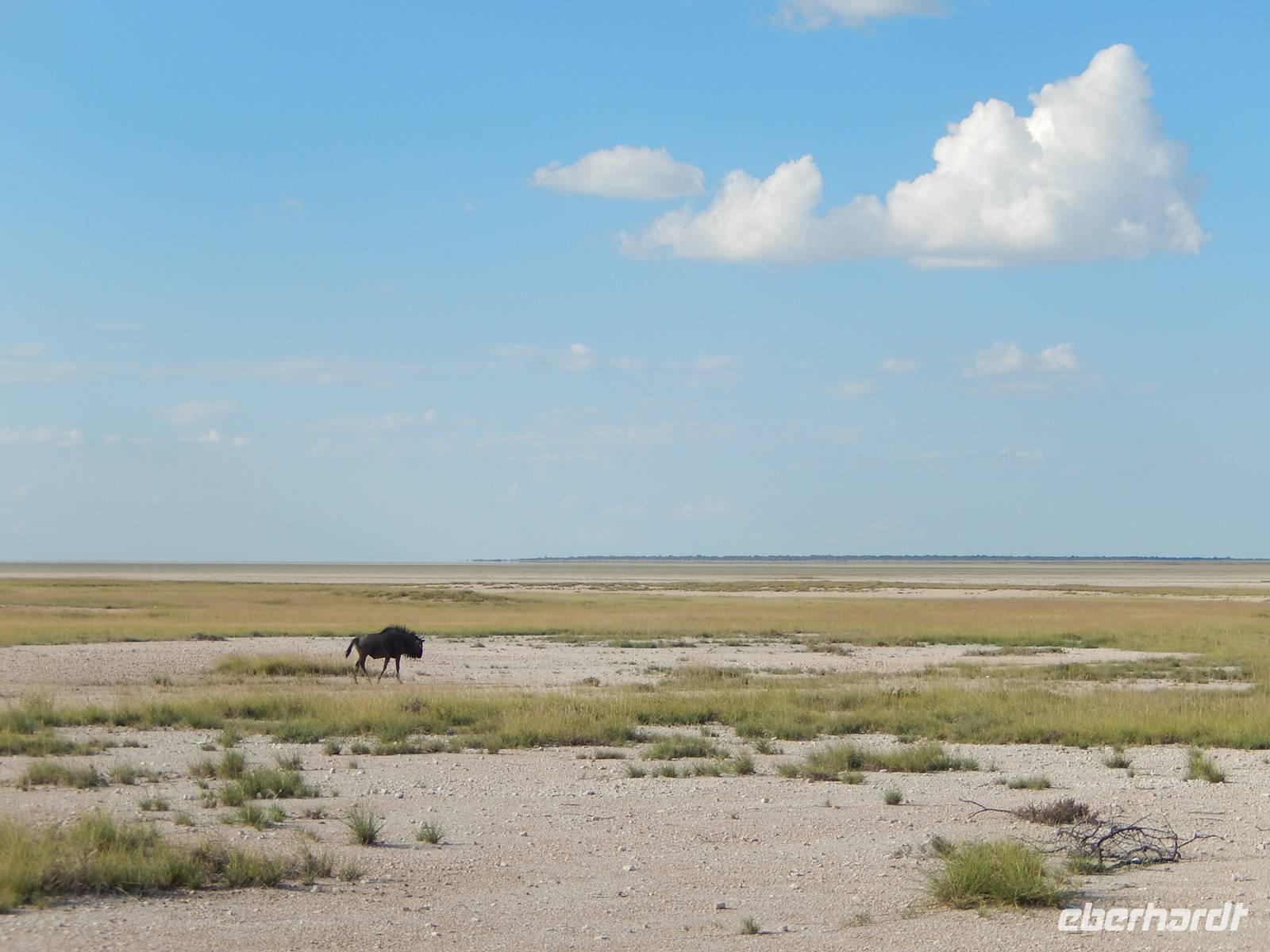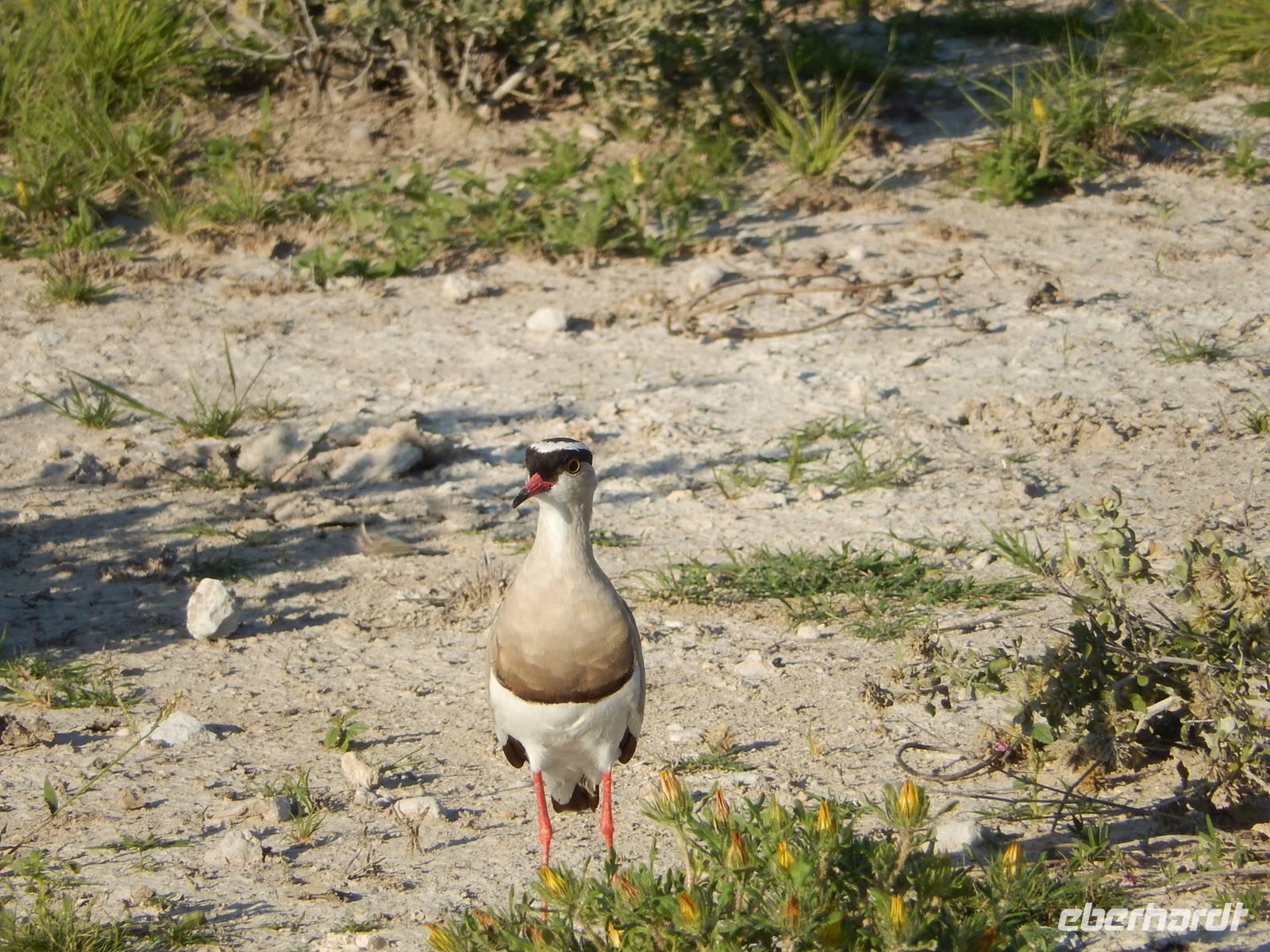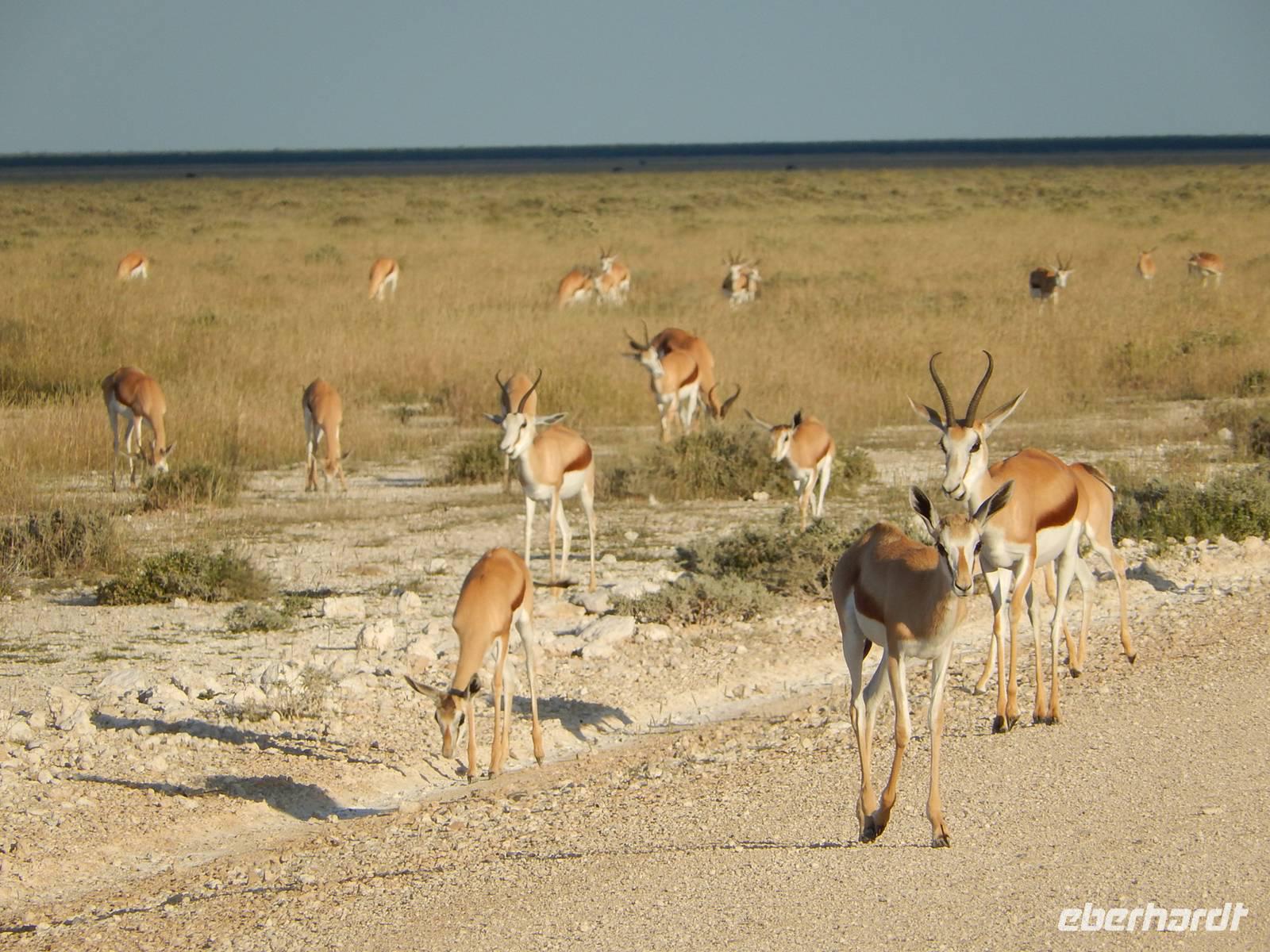 Auch dieser Tag steht im Zeichen der Pirsch im Etosha-Park, jedoch geben wir uns eher mit kleineren Dingen zufrieden: Erdmännchen, Gackeltrappen, Kronenkiebitze, eine Straußen-Familie, Zebras und jede Menge Springböcke, die lustig durch die Landschaft hüpfen. Nach dem Abendessen wollen wir noch einen Blick auf das nächtlich beleuchtete Wasserloch von Okaukuejo werfen, aber weit und breit ist kein Tier zu sehen. Dann träumen wir wenigstens von Simba, Pumpa und seinen tierischen Freunden.