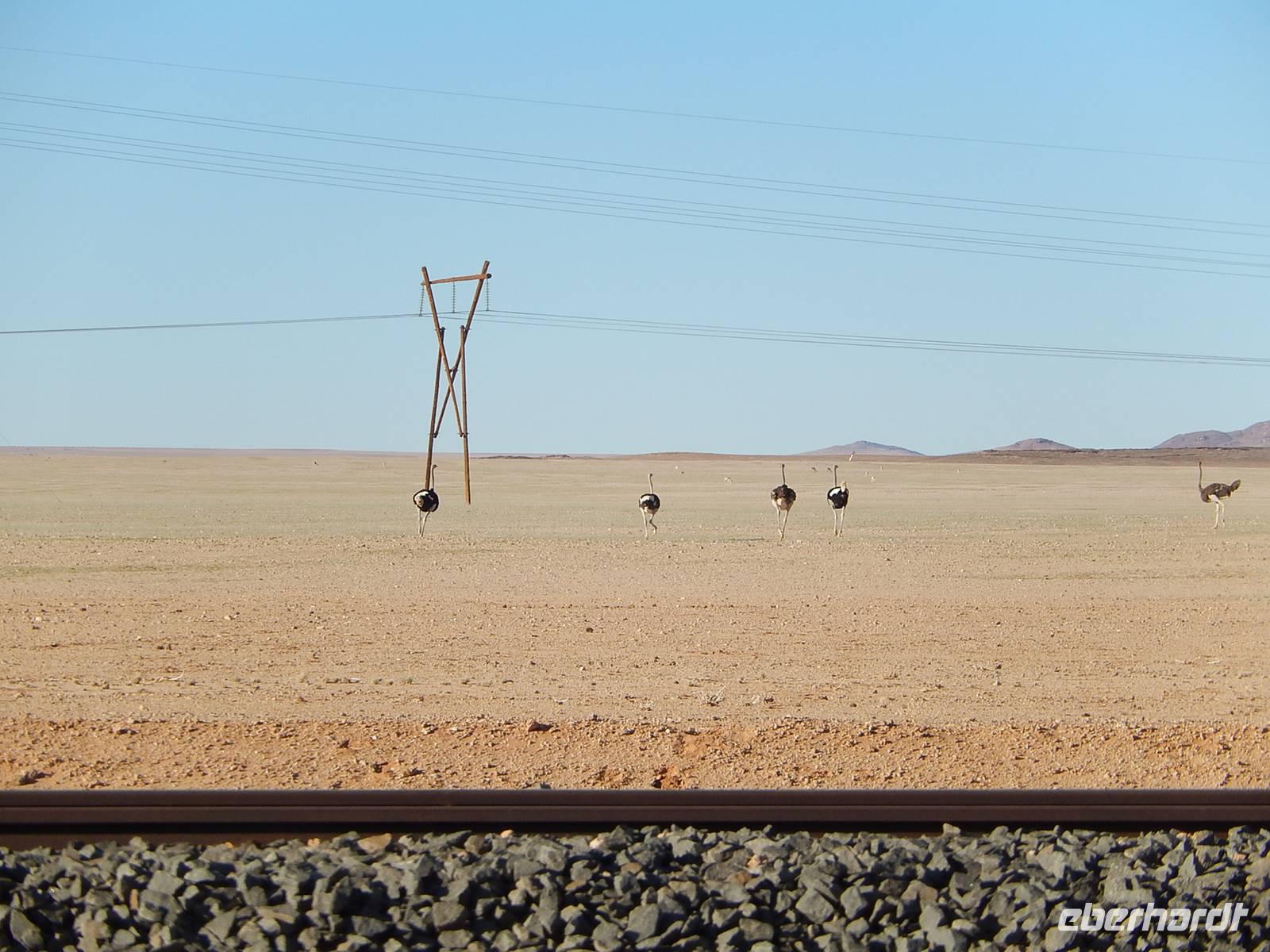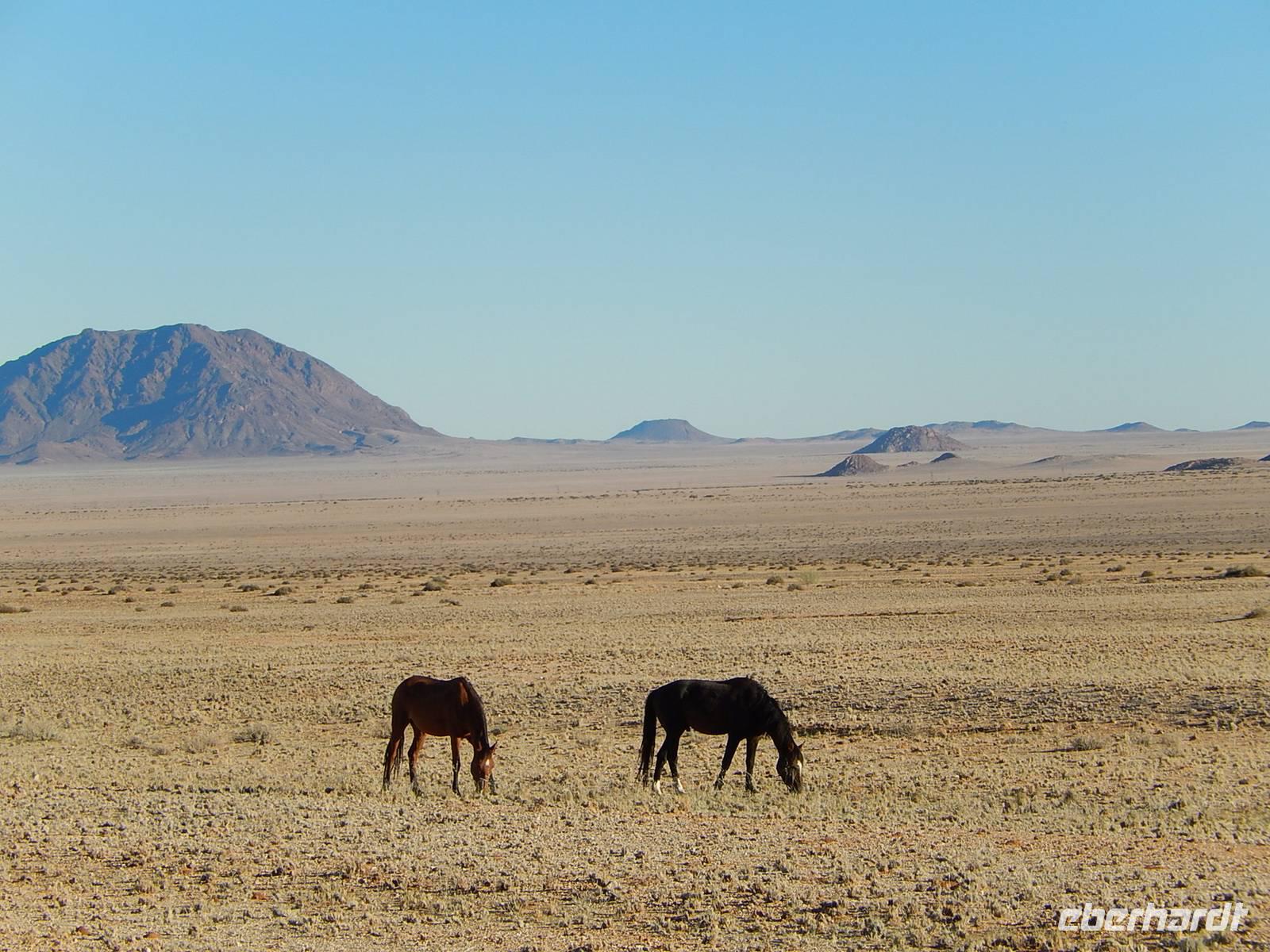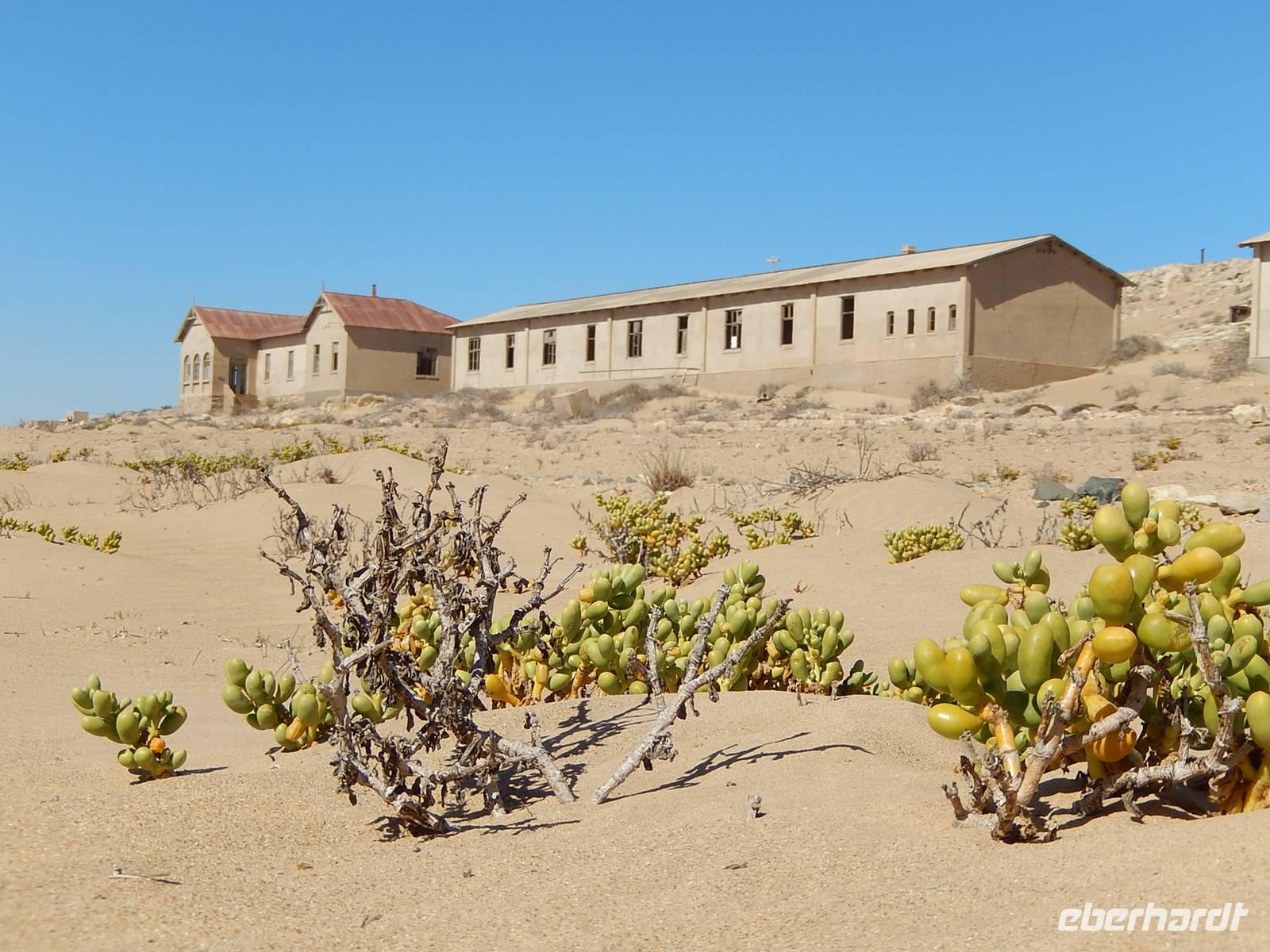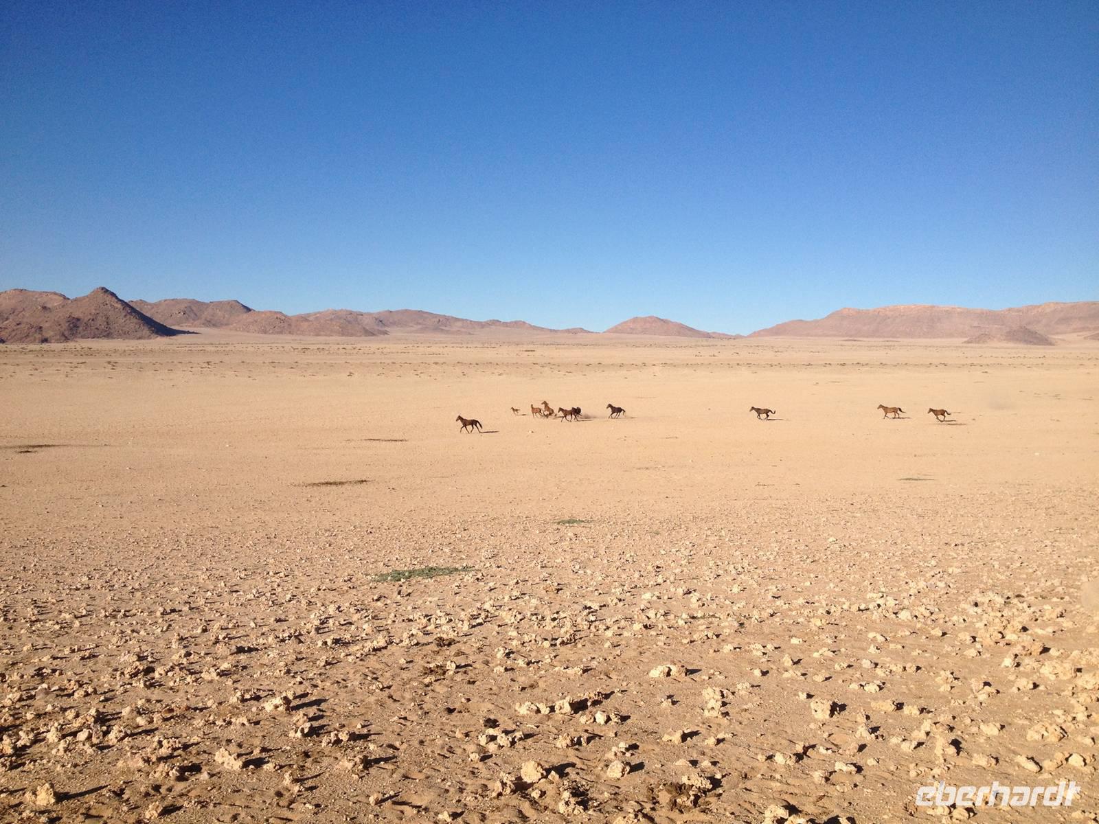 Ein schwarzer Asphaltstreifen bahnt sich fast schnurgerade seinen Weg durch die Namib-Wüste von Aus nach Lüderitz, von Ost nach West. Zu beiden Seiten bietet sich uns eine karge, weite Landschaft, die nur durch ein paar Inselberge durchbrochen wird. Trotz der scheinbar lebensfeindlichen Bedingungen sehen wir wieder einige Löffelhunde, Strauße und Oryx-Antilopen. Unsere Route führt parallel zur Eisenbahnlinie, die uns kurz vor Lüderitz nach Kolmannkuppe bringt. Es ist schon ein schwieriges Unterfangen, eine Eisenbahnlinie in der Wüste zu betreiben, denn der Wind trägt die Wanderdünen von Süd nach Nord - ohne Rücksicht auf Hindernisse (wie z. B. Bahnschienen). Jedoch führten genau diese Bemühungen zu den ersten Diamantenfunden in der Gegend. Schnell brach der Diamantenrausch aus und in Kolmannskuppe lebten im Jahr 1908 bis zu 1.200 Menschen. Bei einem Rundgang erfahren wir, wie sich die deutsche Siedlung weitgehend autark versorgte: Wohnungen, Läden, Schlachterei, Wurstfabrik, Eisfabrik, Krankenhaus etc.. Heute ist es nur noch eine Geistersiedlung, die langsam von der Wüste genommen wird. Am Strand der Lüderitz-Bucht genießen wir nach der Hitze der Wüste endlich die angenehm kühle Meeresluft und sammeln Muscheln am Strand. Auf Halifax Island können wir in der Ferne Pinguine entdecken. Nach einem Stopp am Dias-Kreuz fahren wir schließlich in die Innenstadt von Lüderitz, die sich mit farbenfrohen Fassaden und deutscher Architektur präsentiert. Auf dem Rückweg nach Aus bestaunen wir das Dünen-Meer der Namib und hoffen am Garub-Wasserloch auf Wildpferde - jedoch sind keine Pferde zu sehen. Also begnügen wir uns vorerst mit einer Kolonie von Harnest Ants (Termiten), bis kurz darauf schließlich eine Herde Wildpferde galoppierend zur Wasserstelle kommt. Das Timing war wieder einmal perfekt. Der Tag verabschiedet sich wieder mit einem goldenen Sonnenuntergang und wir genießen unser vorzügliches Dinner in der Klein Aus Vista Lodge.
