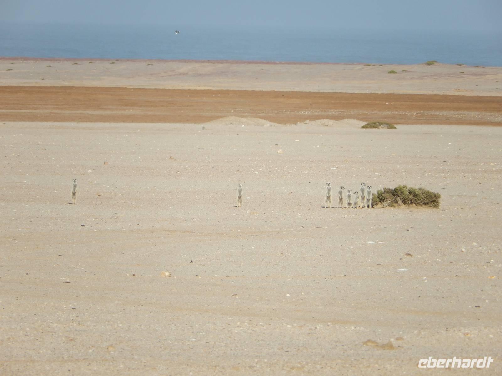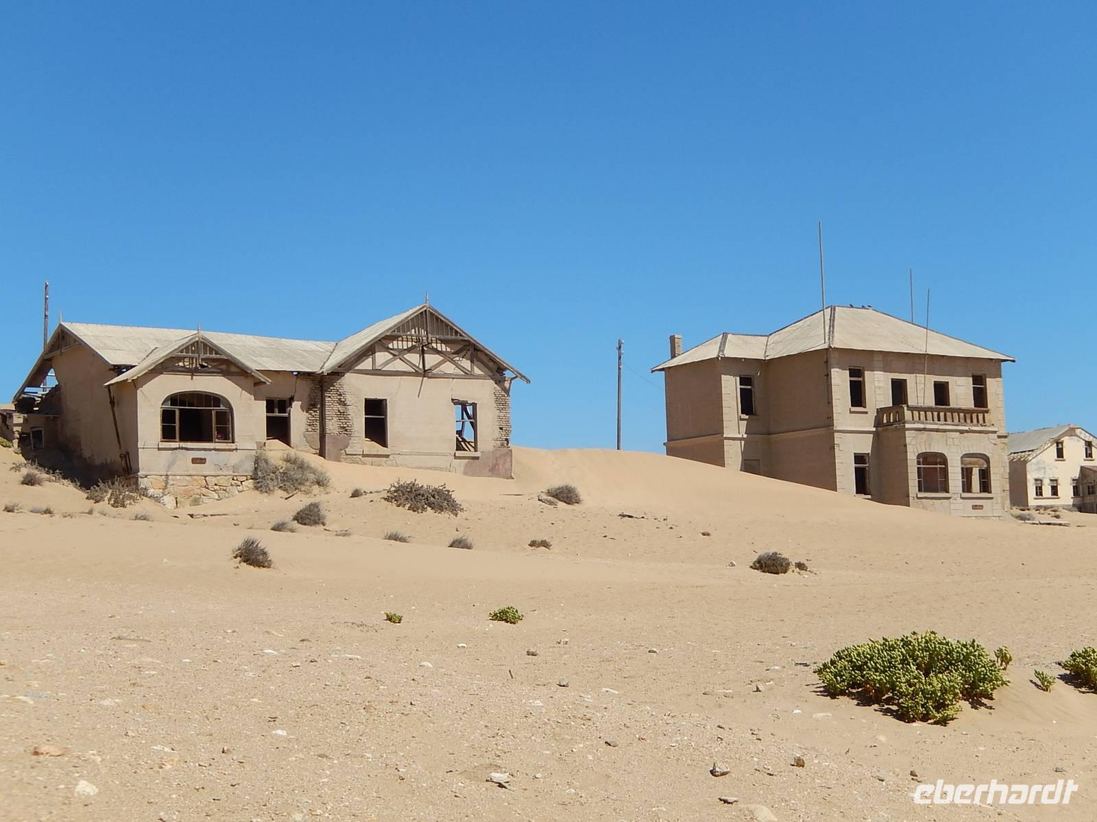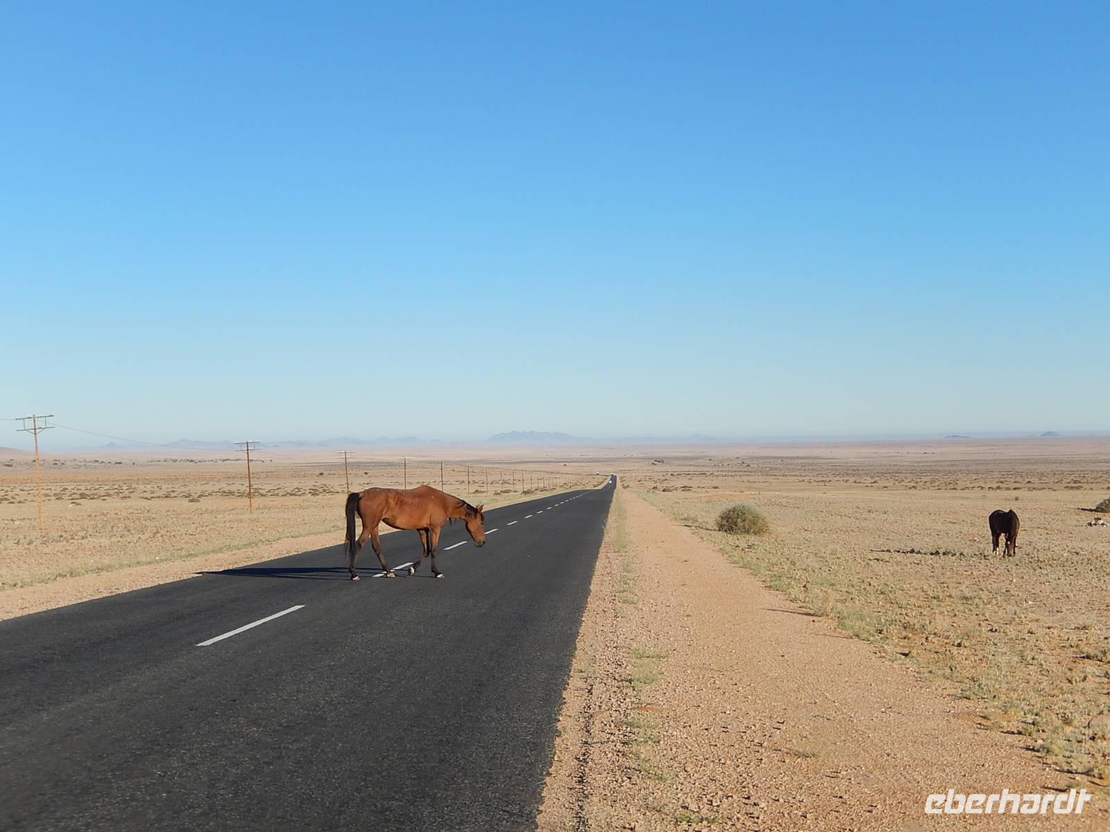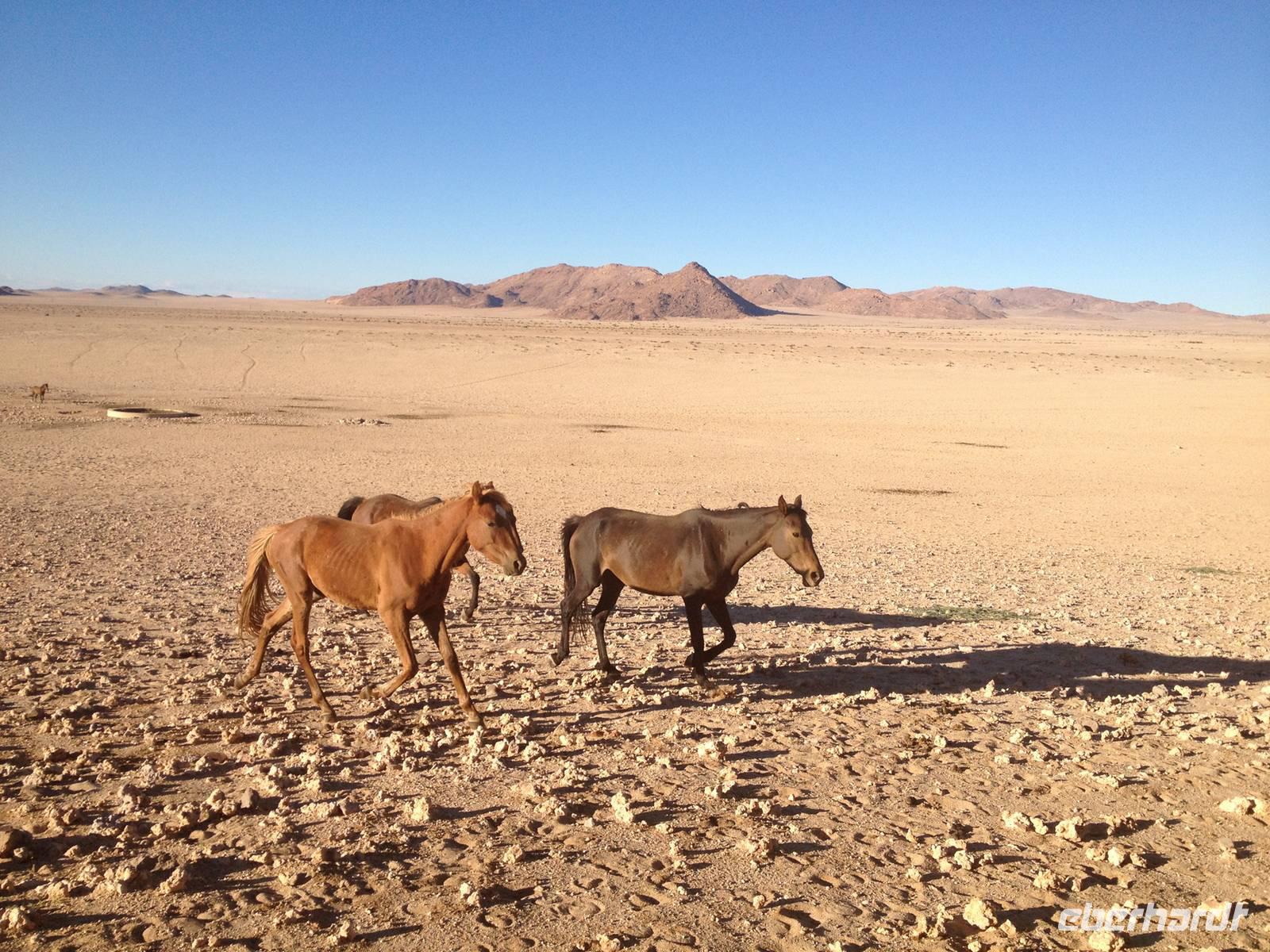 Ein schwarzer Asphaltstreifen bahnt sich fast schnurgerade seinen Weg durch die Namib-Wüste von Aus nach Lüderitz, von Ost nach West. Zu beiden Seiten bietet sich uns eine karge, weite Landschaft, die nur durch ein paar Inselberge durchbrochen wird. Trotz der scheinbar lebensfeindlichen Bedingungen sehen wir wieder einige Löffelhunde, Strauße und Oryx-Antilopen. Unsere Route führt parallel zur Eisenbahnlinie, die uns kurz vor Lüderitz nach Kolmannkuppe bringt. Es ist schon ein schwieriges Unterfangen, eine Eisenbahnlinie in der Wüste zu betreiben, denn der Wind trägt die Wanderdünen von Süd nach Nord - ohne Rücksicht auf Hindernisse (wie z. B. Bahnschienen). Jedoch führten genau diese Bemühungen zu den ersten Diamantenfunden in der Gegend. Schnell brach der Diamantenrausch aus und in Kolmannskuppe lebten im Jahr 1908 bis zu 1.200 Menschen. Bei einem Rundgang erfahren wir, wie sich die deutsche Siedlung weitgehend autark versorgte: Wohnungen, Läden, Schlachterei, Wurstfabrik, Eisfabrik, Krankenhaus etc.. Heute ist es nur noch eine Geistersiedlung, die langsam von der Wüste genommen wird. Am Strand der Lüderitz-Bucht genießen wir nach der Hitze der Wüste endlich die angenehm kühle Meeresluft und sammeln Muscheln am Strand. Auf Halifax Island können wir in der Ferne Pinguine entdecken. Nach einem Stopp am Dias-Kreuz fahren wir schließlich in die Innenstadt von Lüderitz, die sich mit farbenfrohen Fassaden und deutscher Architektur präsentiert. Auf dem Rückweg nach Aus bestaunen wir das Dünen-Meer der Namib und hoffen am Garub-Wasserloch auf Wildpferde - jedoch sind keine Pferde zu sehen. Also begnügen wir uns vorerst mit einer Kolonie von Harnest Ants (Termiten), bis kurz darauf schließlich eine Herde Wildpferde galoppierend zur Wasserstelle kommt. Das Timing war wieder einmal perfekt. Der Tag verabschiedet sich wieder mit einem goldenen Sonnenuntergang und wir genießen unser vorzügliches Dinner in der Klein Aus Vista Lodge.