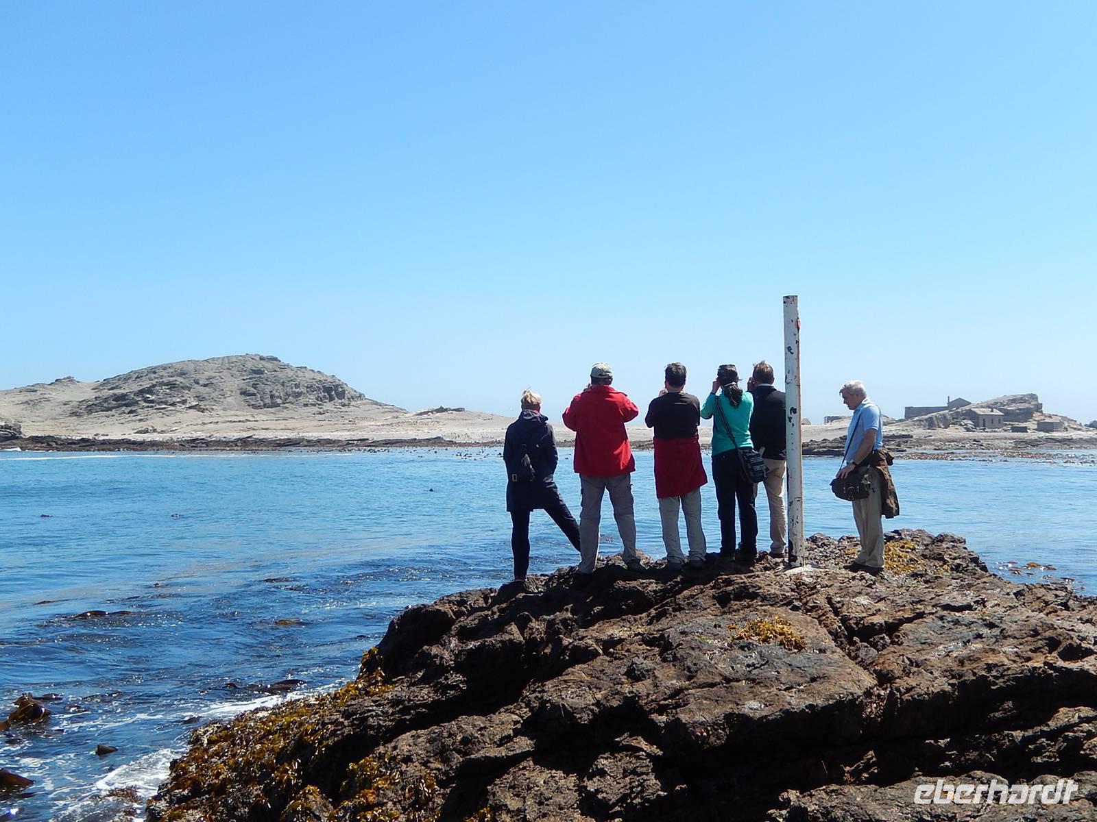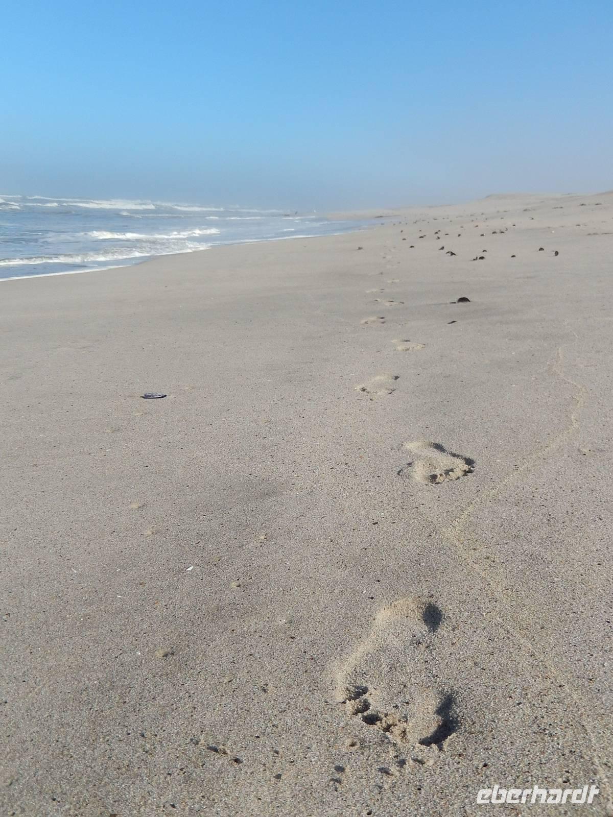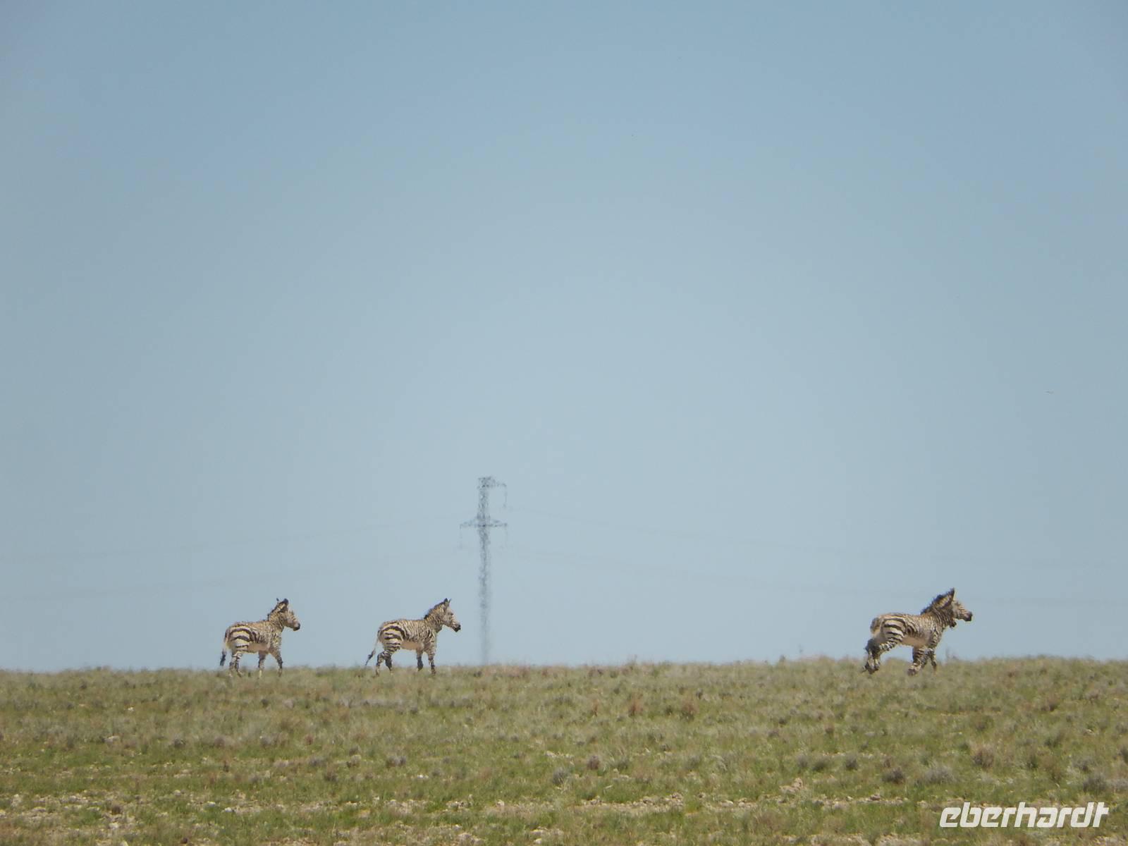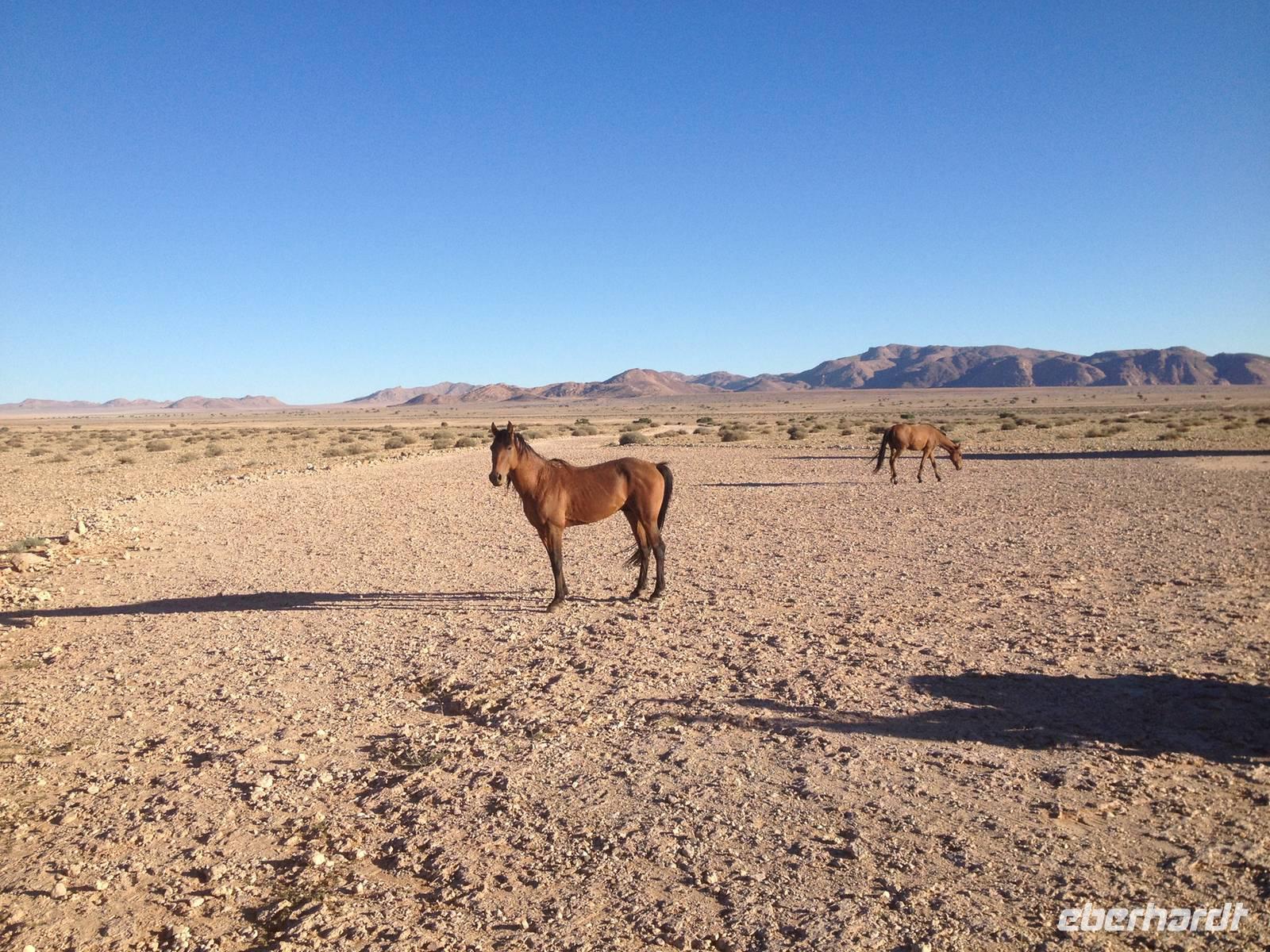 Ein schwarzer Asphaltstreifen bahnt sich fast schnurgerade seinen Weg durch die Namib-Wüste von Aus nach Lüderitz, von Ost nach West. Zu beiden Seiten bietet sich uns eine karge, weite Landschaft, die nur durch ein paar Inselberge durchbrochen wird. Trotz der scheinbar lebensfeindlichen Bedingungen sehen wir wieder einige Löffelhunde, Strauße und Oryx-Antilopen. Unsere Route führt parallel zur Eisenbahnlinie, die uns kurz vor Lüderitz nach Kolmannkuppe bringt. Es ist schon ein schwieriges Unterfangen, eine Eisenbahnlinie in der Wüste zu betreiben, denn der Wind trägt die Wanderdünen von Süd nach Nord - ohne Rücksicht auf Hindernisse (wie z. B. Bahnschienen). Jedoch führten genau diese Bemühungen zu den ersten Diamantenfunden in der Gegend. Schnell brach der Diamantenrausch aus und in Kolmannskuppe lebten im Jahr 1908 bis zu 1.200 Menschen. Bei einem Rundgang erfahren wir, wie sich die deutsche Siedlung weitgehend autark versorgte: Wohnungen, Läden, Schlachterei, Wurstfabrik, Eisfabrik, Krankenhaus etc.. Heute ist es nur noch eine Geistersiedlung, die langsam von der Wüste genommen wird. Am Strand der Lüderitz-Bucht genießen wir nach der Hitze der Wüste endlich die angenehm kühle Meeresluft und sammeln Muscheln am Strand. Auf Halifax Island können wir in der Ferne Pinguine entdecken. Nach einem Stopp am Dias-Kreuz fahren wir schließlich in die Innenstadt von Lüderitz, die sich mit farbenfrohen Fassaden und deutscher Architektur präsentiert. Auf dem Rückweg nach Aus bestaunen wir das Dünen-Meer der Namib und hoffen am Garub-Wasserloch auf Wildpferde - jedoch sind keine Pferde zu sehen. Also begnügen wir uns vorerst mit einer Kolonie von Harnest Ants (Termiten), bis kurz darauf schließlich eine Herde Wildpferde galoppierend zur Wasserstelle kommt. Das Timing war wieder einmal perfekt. Der Tag verabschiedet sich wieder mit einem goldenen Sonnenuntergang und wir genießen unser vorzügliches Dinner in der Klein Aus Vista Lodge.