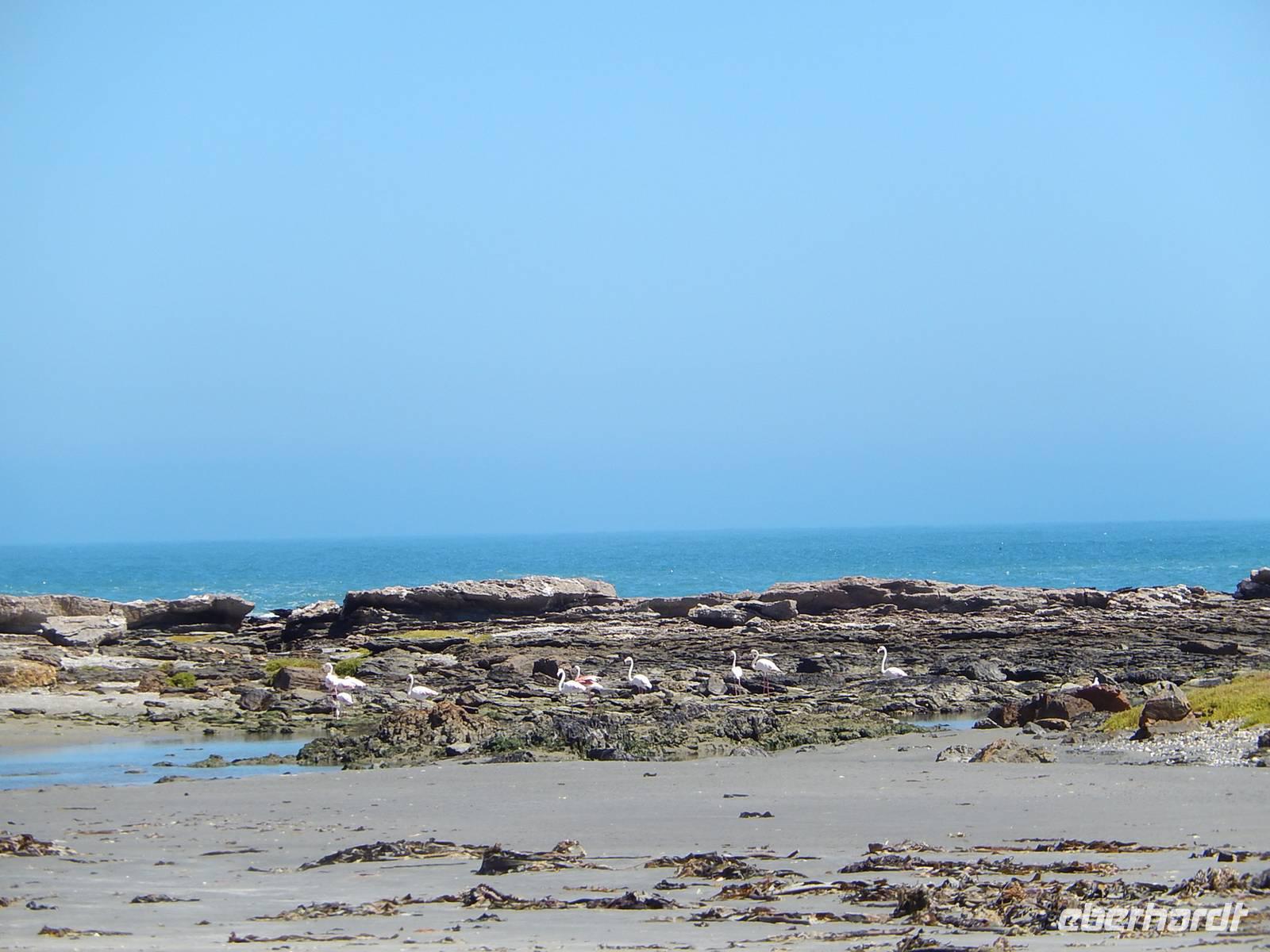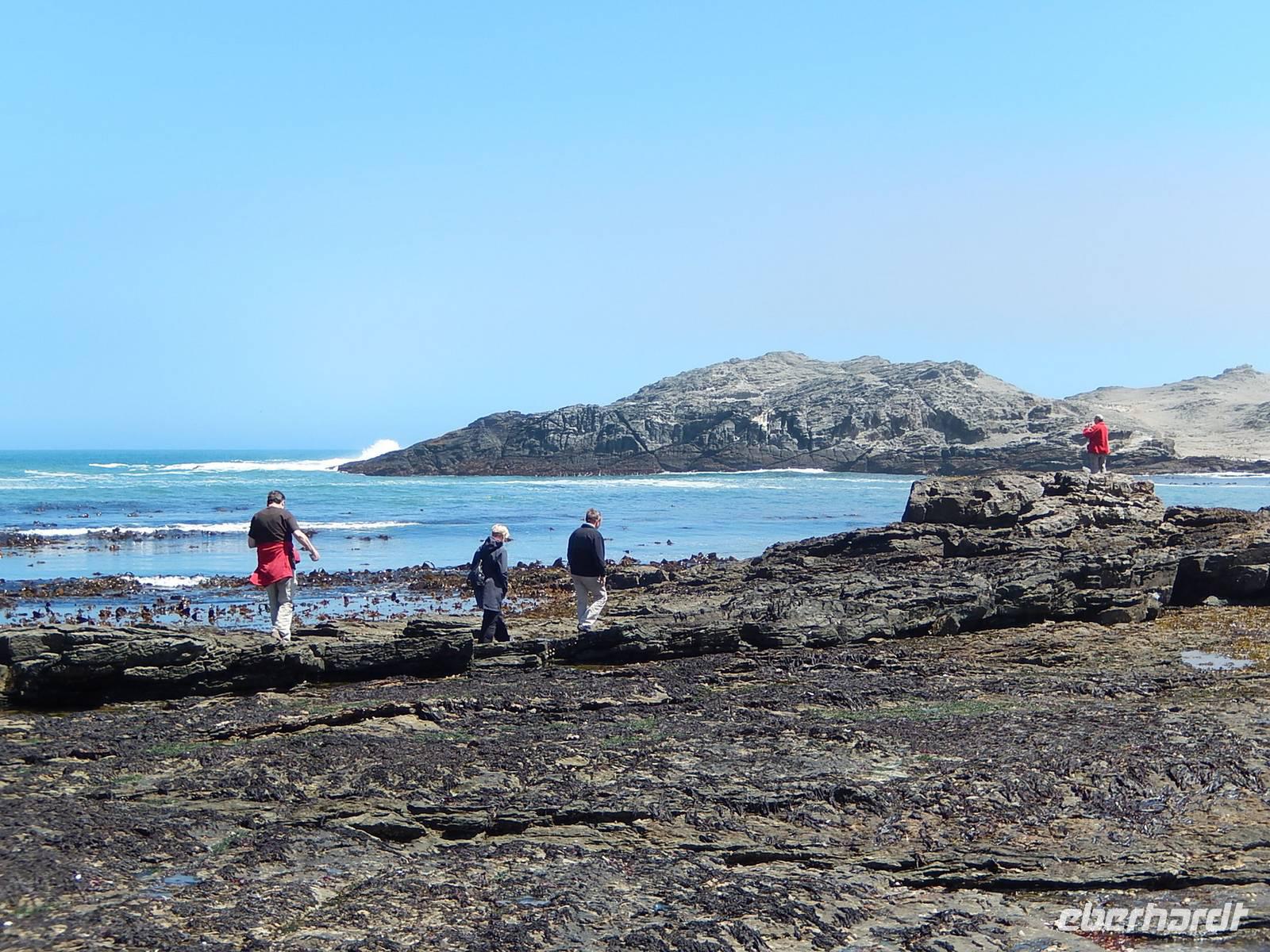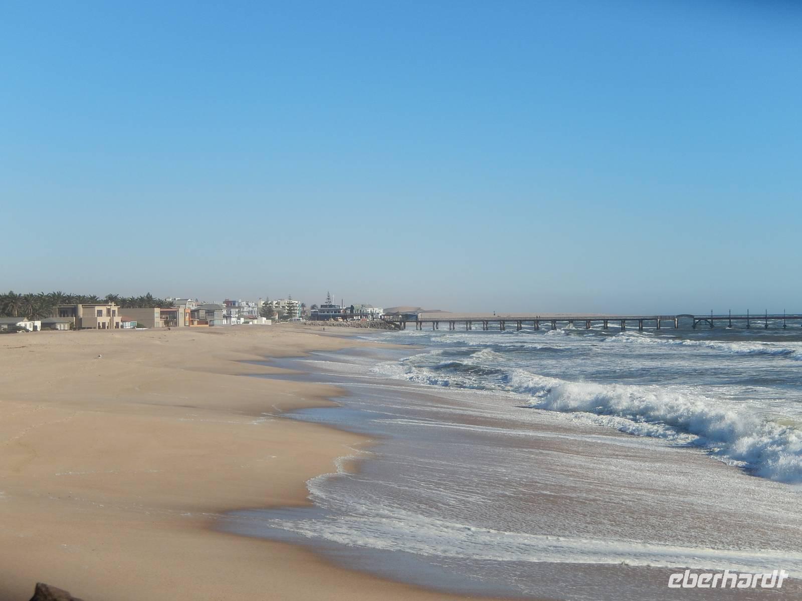 Eine abwechslungsreiche Fahrt nach Swakopmund steht uns heute bevor. Unseren ersten Stopp legen wir in Solitaire ein, wo rostige Autos, Motorräder eine Zapfsäule und andere ausrangierte Gebrauchsgegenstände fotogen arrangiert wurden. Bald darauf überqueren wir zum zweiten Mal den südlichen Wendekreis und kommen in die Täler des Gaub- und Kuiseb-Flusses, die zur Zeit sogar reichlich Wasser führen - das soll nur an ca. 30 Tagen im Jahr der Fall sein. Gleichzeitig hat der Regen das dunkelbraune, metamorphe Gestein mit einem lindgrünen Teppich überzogen. Danach wechselt das Landschaftsbild zu einer trockenen Steinwüste. Im Park sehen wir zart rosa blühende Hoodia-Pflanzen (ein afrikanisches Rezept für die schlanke Linie). Nach der Picknick-Pause unter einem Schatten spendenden Baum im Ganab-Camp erblicken wir in der Ferne sogar Berg-Zebras. Toll! Vorbei an der Bergkette Langer Heinrich, wo Uran abgebaut wird, befahren wir bald den Welwitscha Drive. Hier sehen wir die uralten Welwitscha-Pflanzen. Bis zum Horizont blicken wir nur auf eine trockene, hellsandige Wüste bis sich plötzlich die bizarre Mondlandschaft auftut. Mit vielen eindrucksvollen Bildern erreichen wir am späten Nachmittag die Küstenstadt Swakopmund.