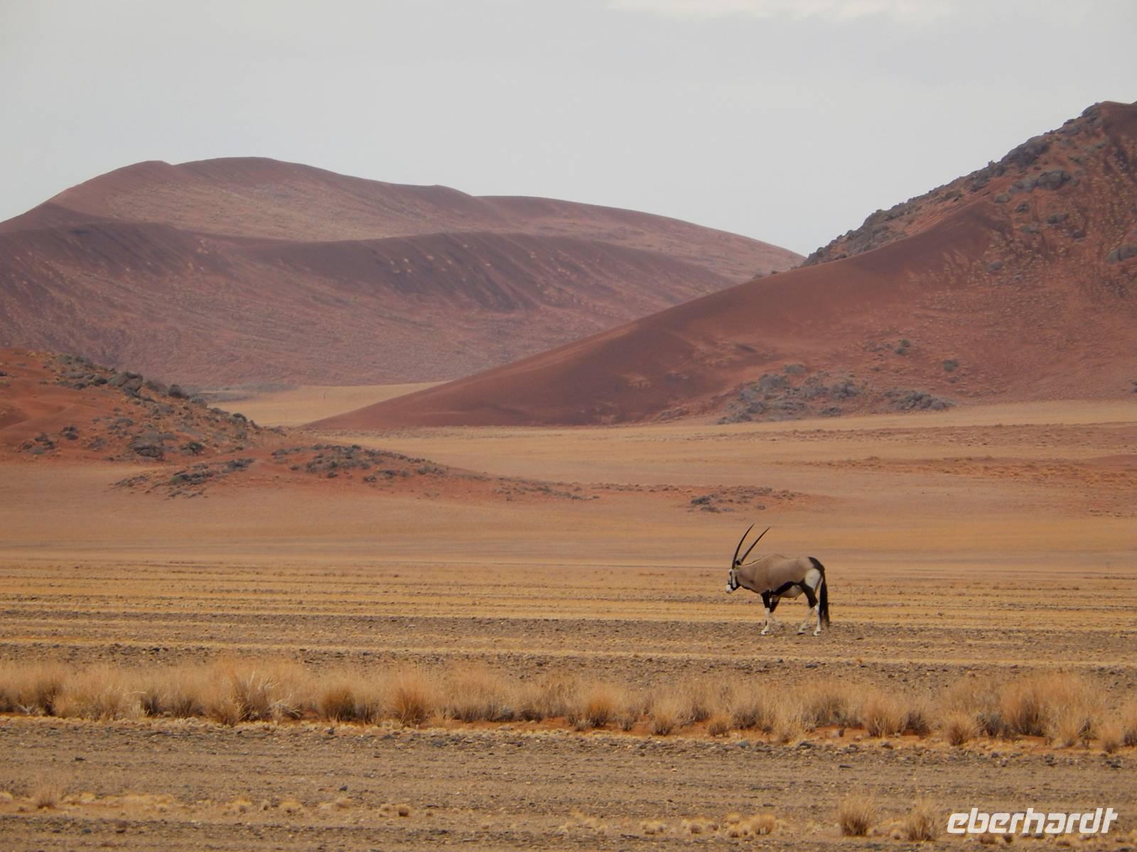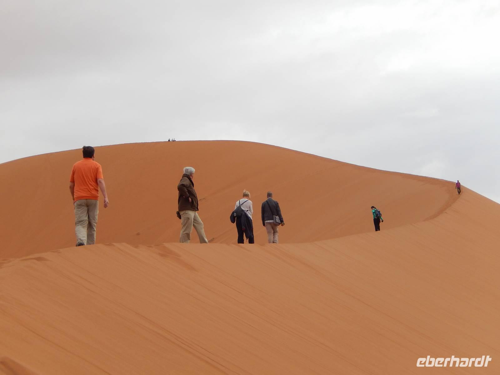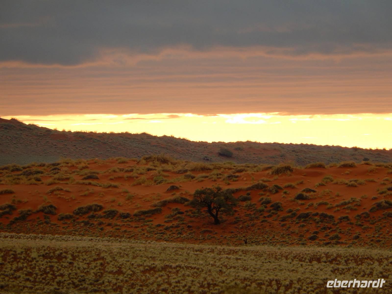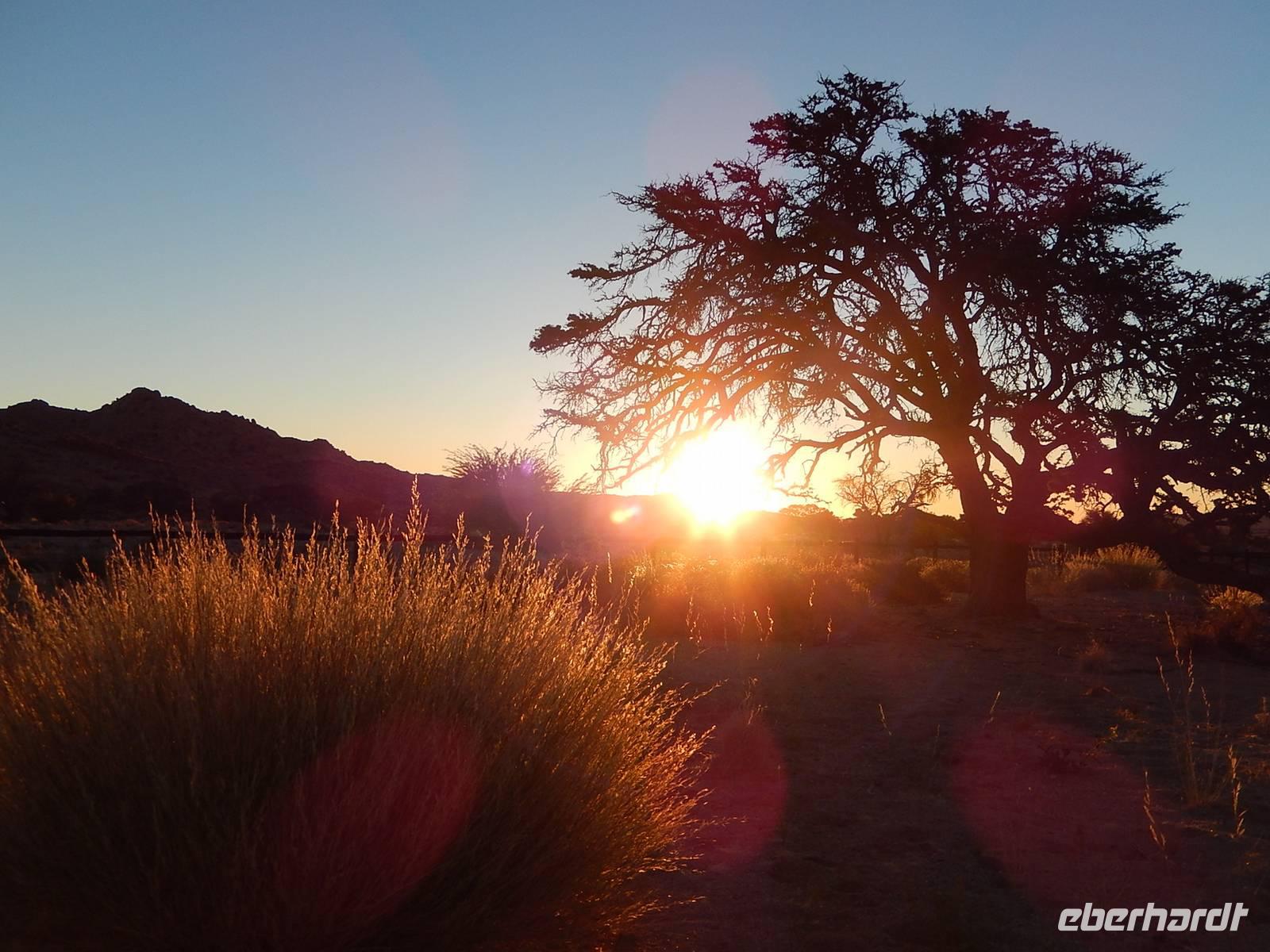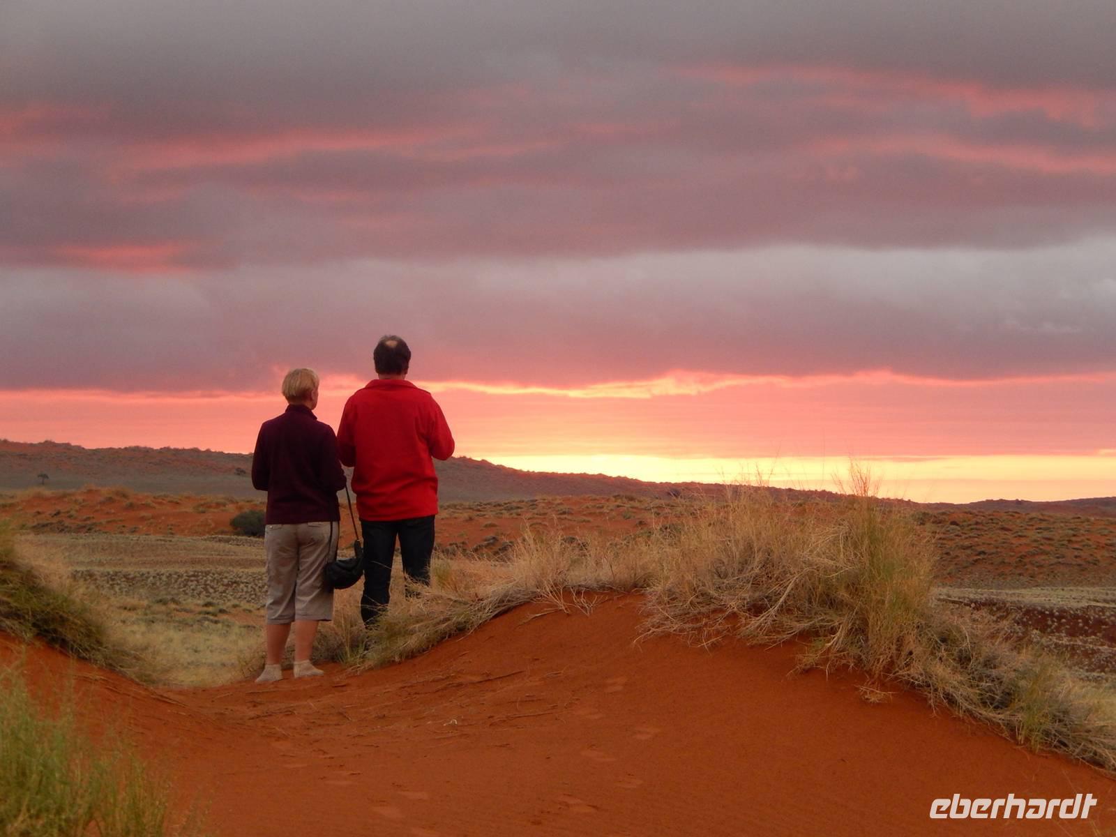 Wer hat eigentlich behauptet, dass es in der Wüste immer trocken ist? Vom Gegenteil überzeugen wir uns erneut am heutigen Tag. Bei strömendem Regen starten wir am frühen Morgen zum Sossusvlei. Die Tore des Parks öffnen mit Sonnenaufgang, also kurz vor sieben Uhr, und dann stoppt zum Glück auch der Regen und unser Abenteuer Wüste kann beginnen. Kurz hinter dem Eingang beobachten wir eine Herde Springböcke beim spielerischen Duellieren, bald darauf sehen wir zunächst einzelne Oryx und später sogar eine ganze Herde. Auch der eine oder andere Schabracken-Schakal kreuzt unseren Weg. Je weiter wir in das Sossusvlei hinein fahren, umso enger wird das Tal. Alte, knorrige Bäume vor den rot-orange leuchtenden Dünen bieten einzigartige Fotomotive. Die Berge der Wüste, die markanten Dünen, sind wohl DAS Symbol Namibias. Nach einem Stopp an der Düne 45, erreichen wir bald den Parkplatz, wo wir in den geländegängigen Jeep umsteigen. Über die Sandpiste gelangen wir zu Big Mama, wo wir uns vor dem Aufstieg erst einmal mit dem mitgebrachten Frühstück stärken. Der Aufstieg auf die Düne erfolgt nach dem Prinzip „drei Schritte vor, einer zurück", aber der Mühe Lohn ist der weite Blick über das endlos scheinende Dünenmeer - das Farbspiel ist unbeschreiblich schön. Der Abstieg erfolgt weitaus rasanter und hat etwas von Sommerski. Auf der Rückfahrt zeigt uns unser Fahrer noch einen Flecken-Uhu und bald darauf verwandelt sich die Wüste zu einer Badewanne. Das Wetter erlaubt uns gerade noch so einen Abstecher zum Sesriem Canyon und dann heißt es tatsächlich „Land unter". Bei unserer Rückkehr zur Lodge ist an eine Sundowner-Fahrt kaum zu denken, aber da sich das Wetter schlagartig ändern kann, versuchen wir es doch. Mit Geländewagen fahren wir über die (ergrünten) Dünen zu verschiedenen Aussichtspunkten und tatsächlich erleben wir bei Gin Tonic und kleinen Snacks einen herrlichen Sonnenuntergang!